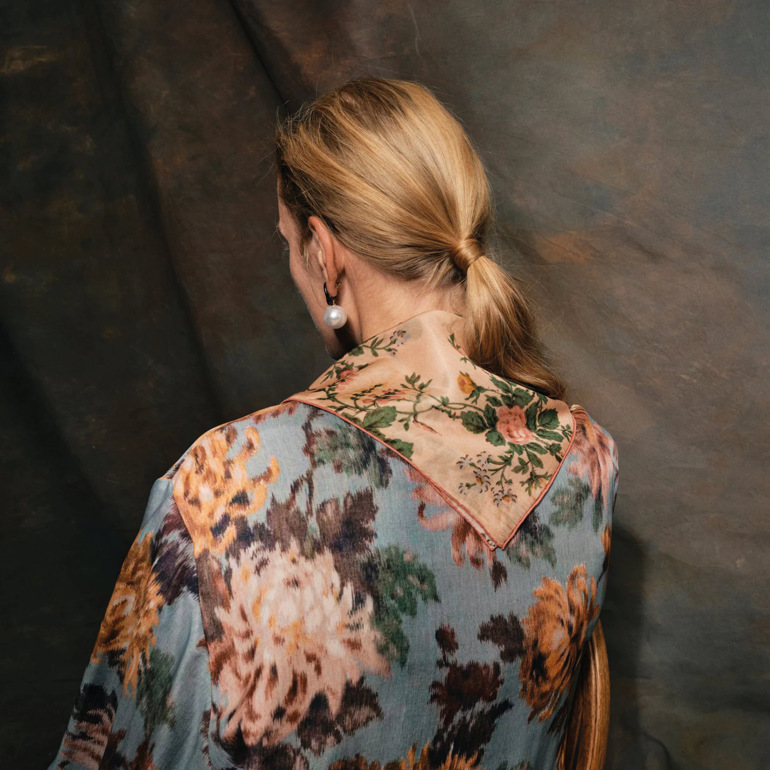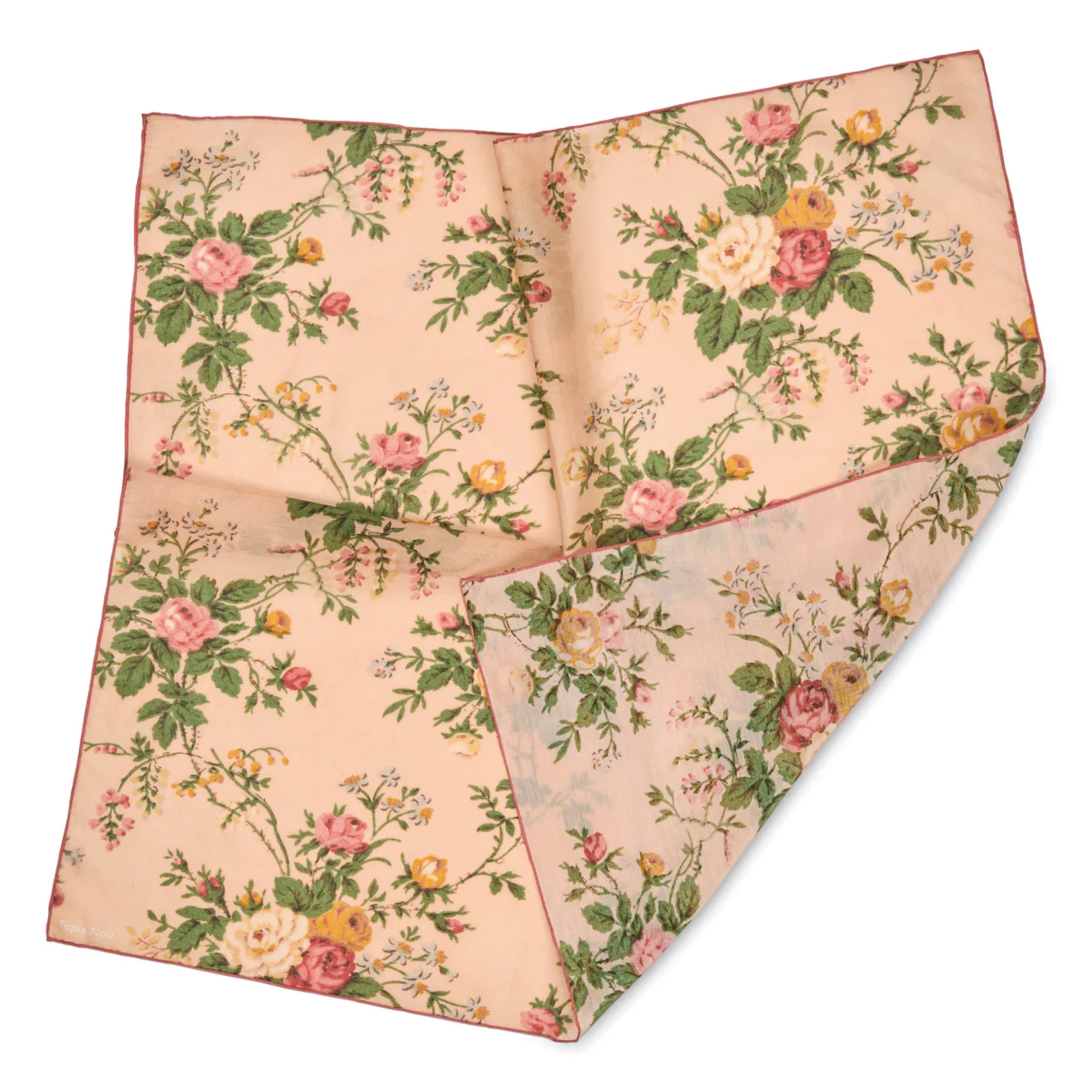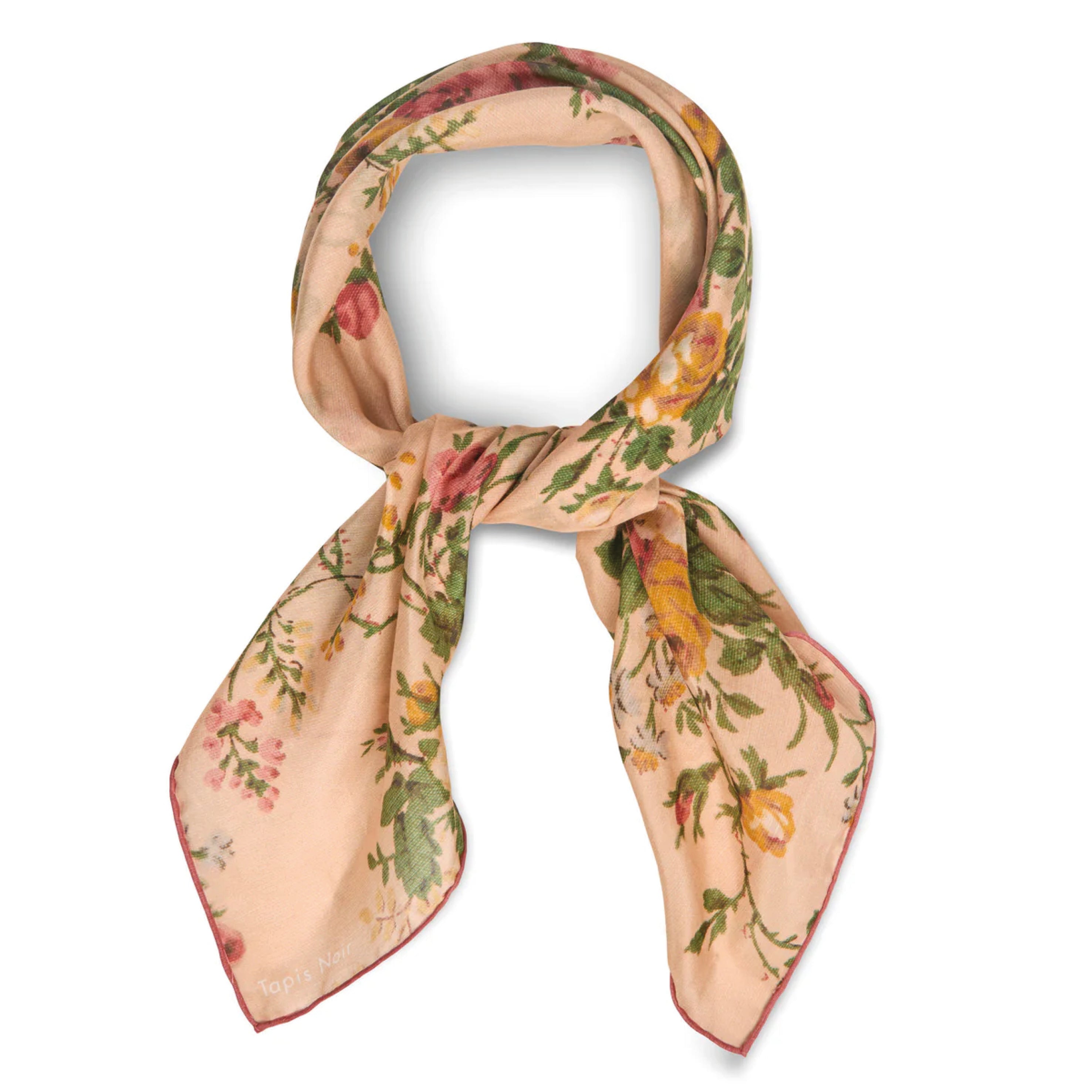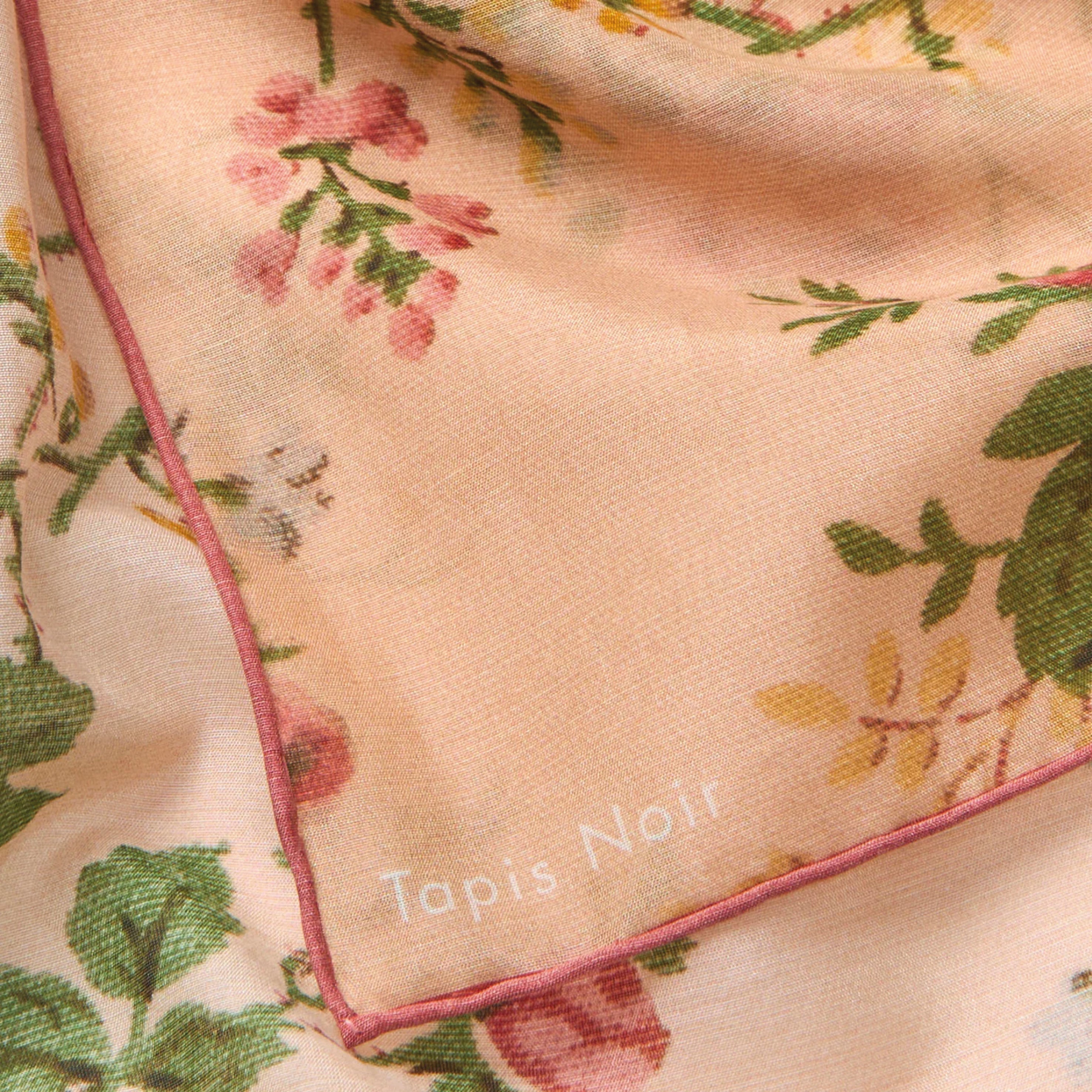 The Tapis Noir Light Dawn Soft Pink Scarf is made in a soft mix of cotton and silk. The print comes from an early 1800 hundreds fabric from Tapis Noir's own archive of antique textiles. The edges are rolled and sewn by hand – a time-intensive process that gives the scarf a very handsome hem.