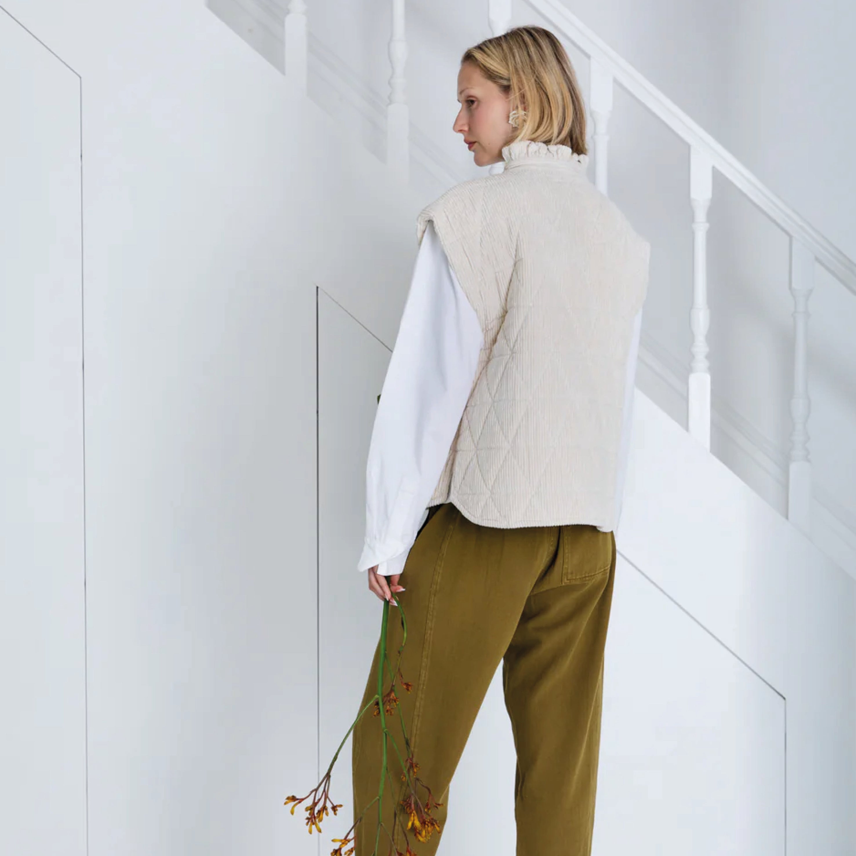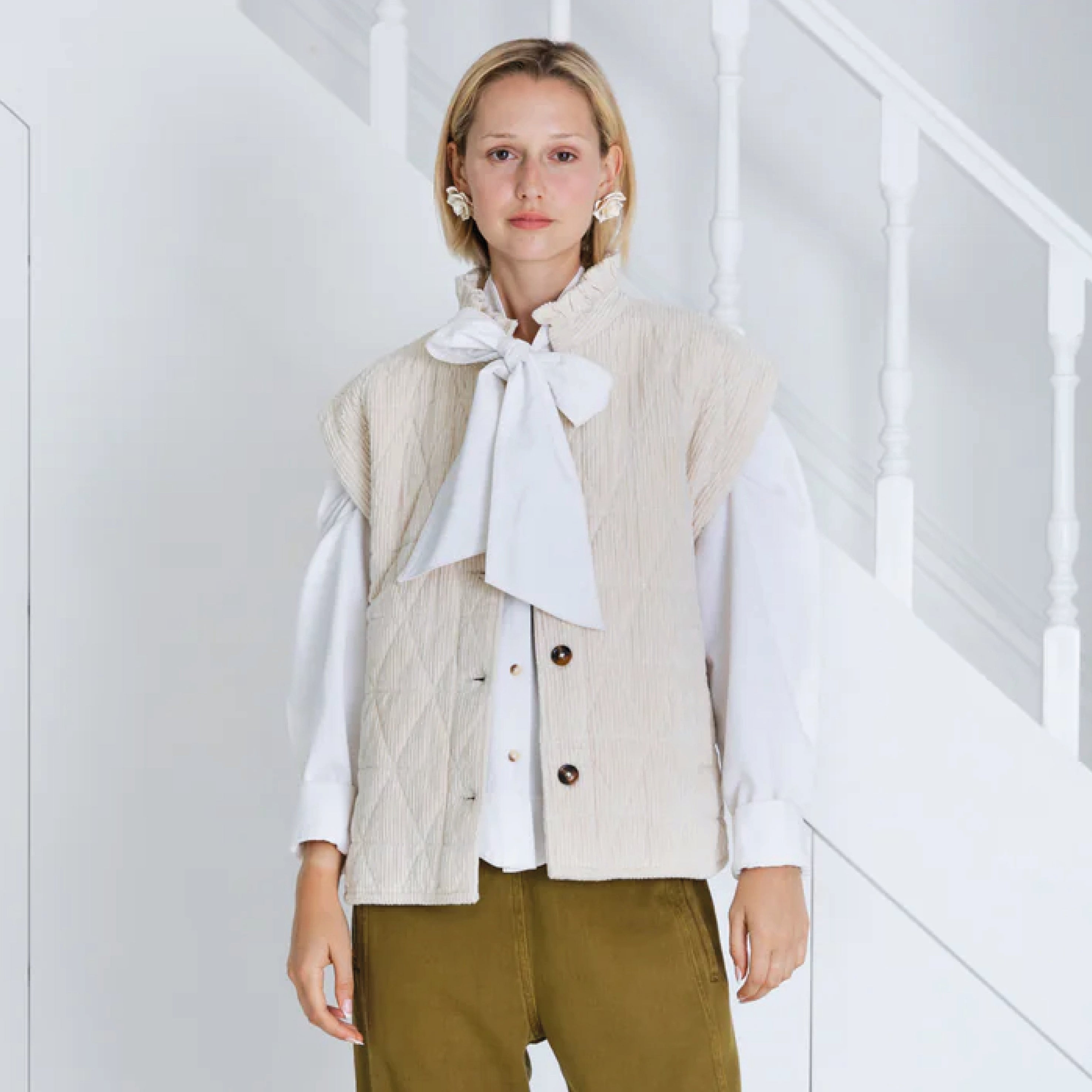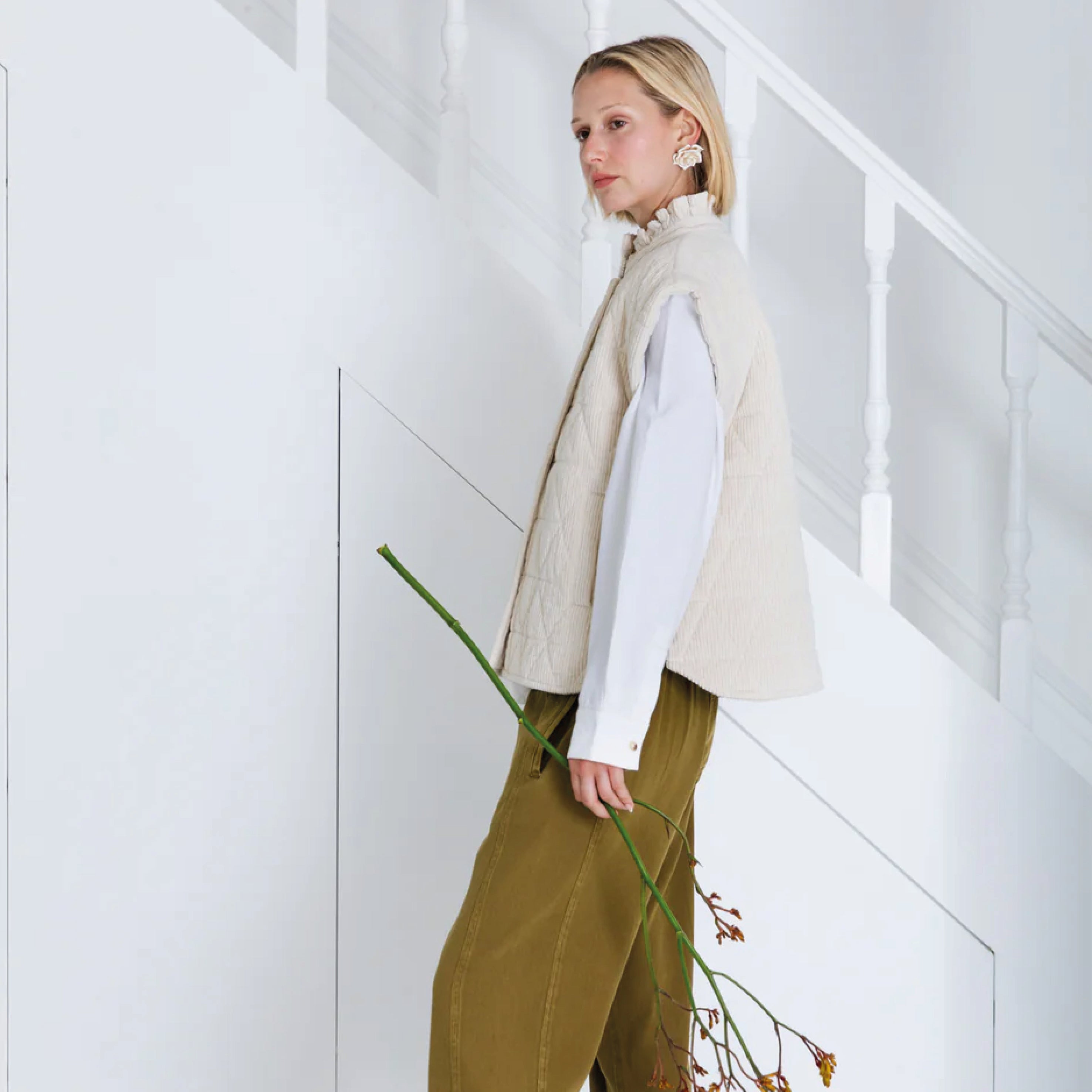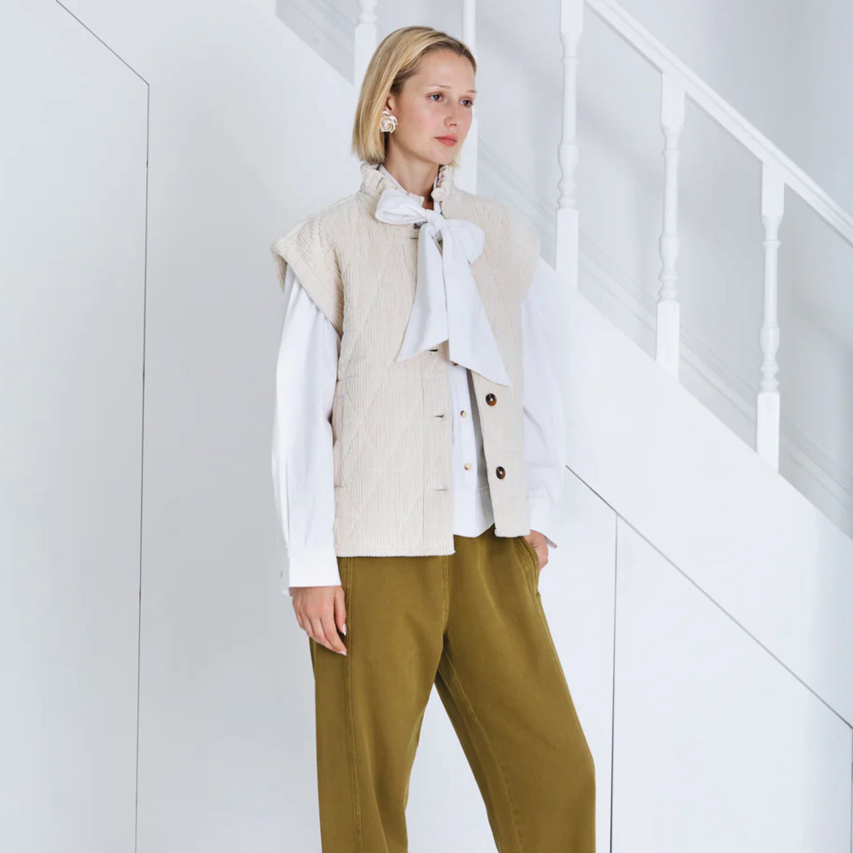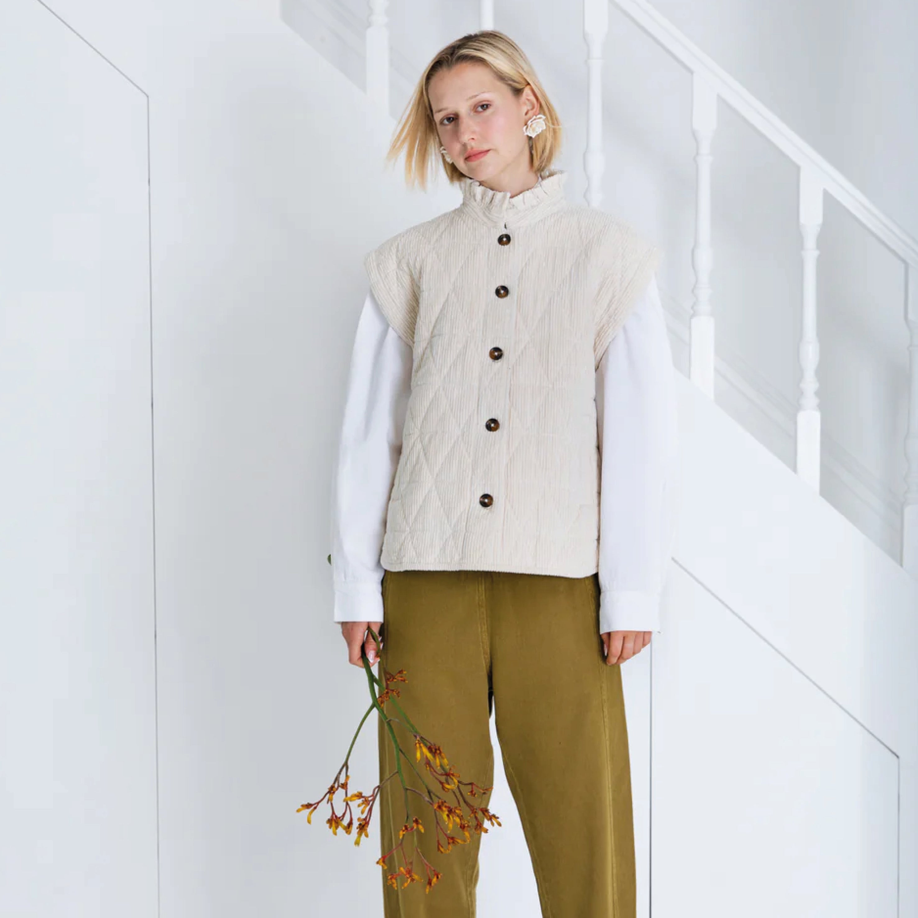 The longer line, quilted Bonté Ecru Stina Gilet features a grown on shoulder, in a mid-wash organic cotton ecru cord. The neckline has a frill detail on a collar-stand and there are mock horn button at the front with welt pockets with a curved hem at the side seams. The style is cut to look a little oversized.