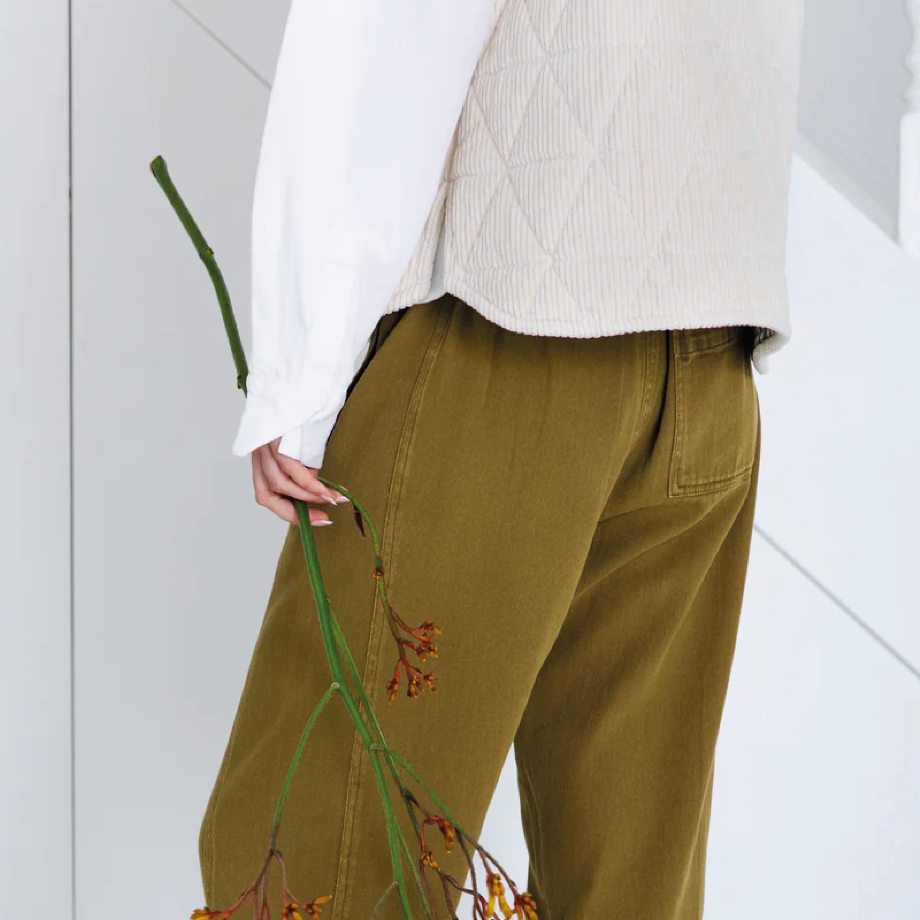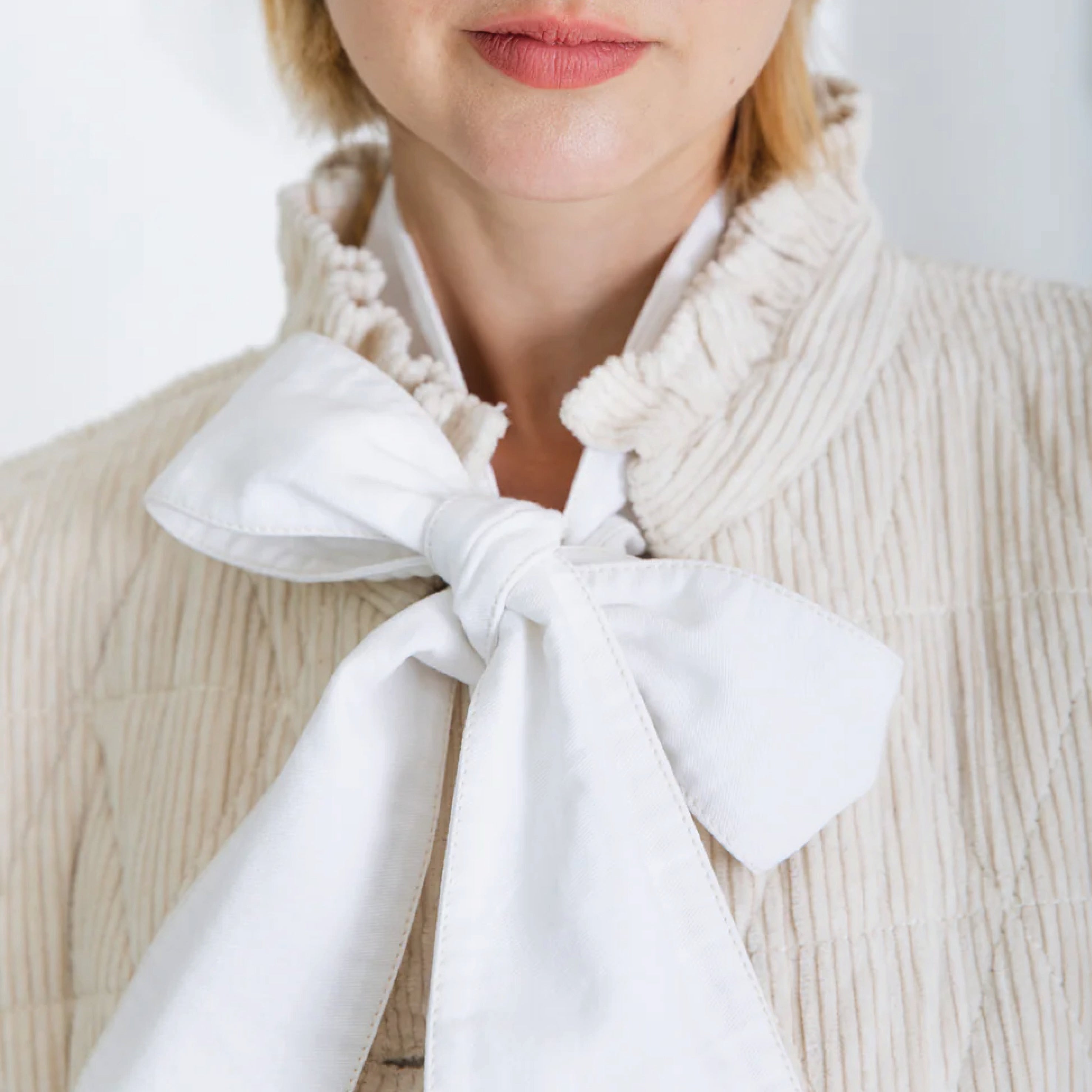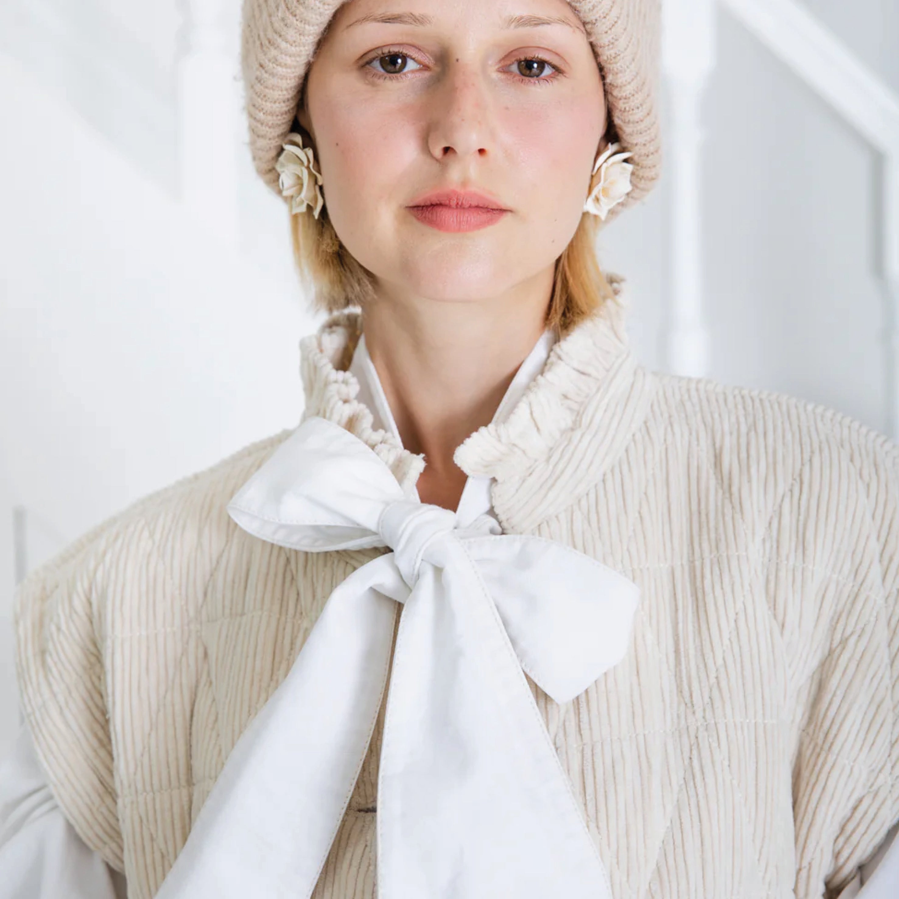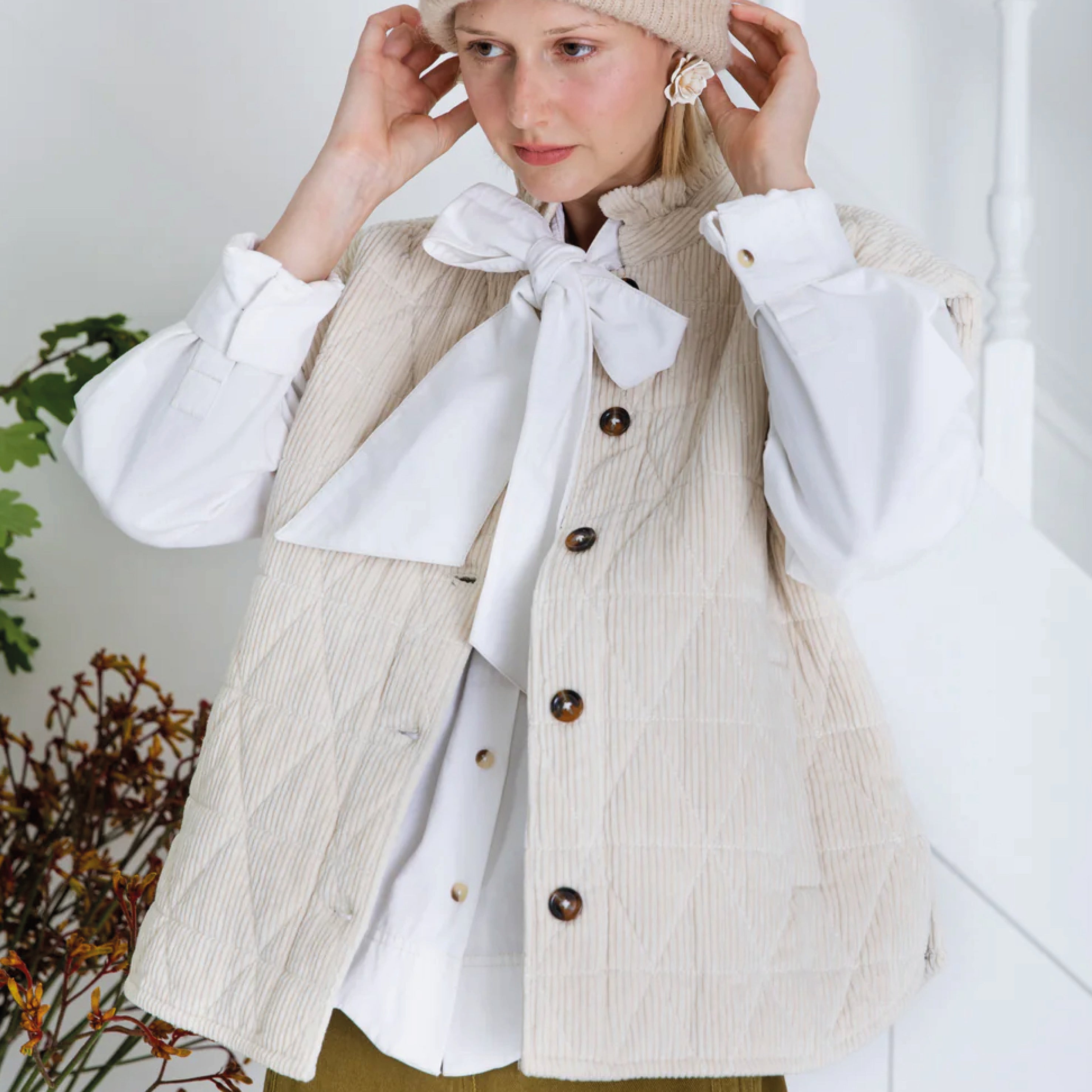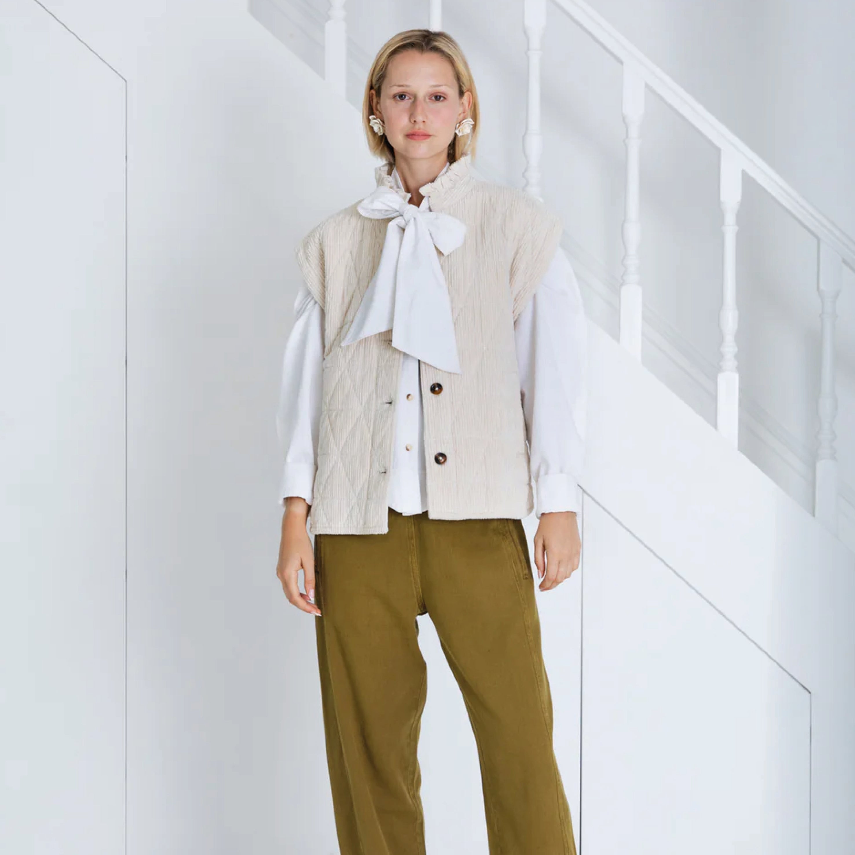 The longer line, quilted Bonté Ecru Stina Gilet features a grown on shoulder, in a mid-wash organic cotton ecru cord. The neckline has a frill detail on a collar-stand and there are mock horn button at the front with welt pockets with a curved hem at the side seams. The style is cut to look a little oversized.