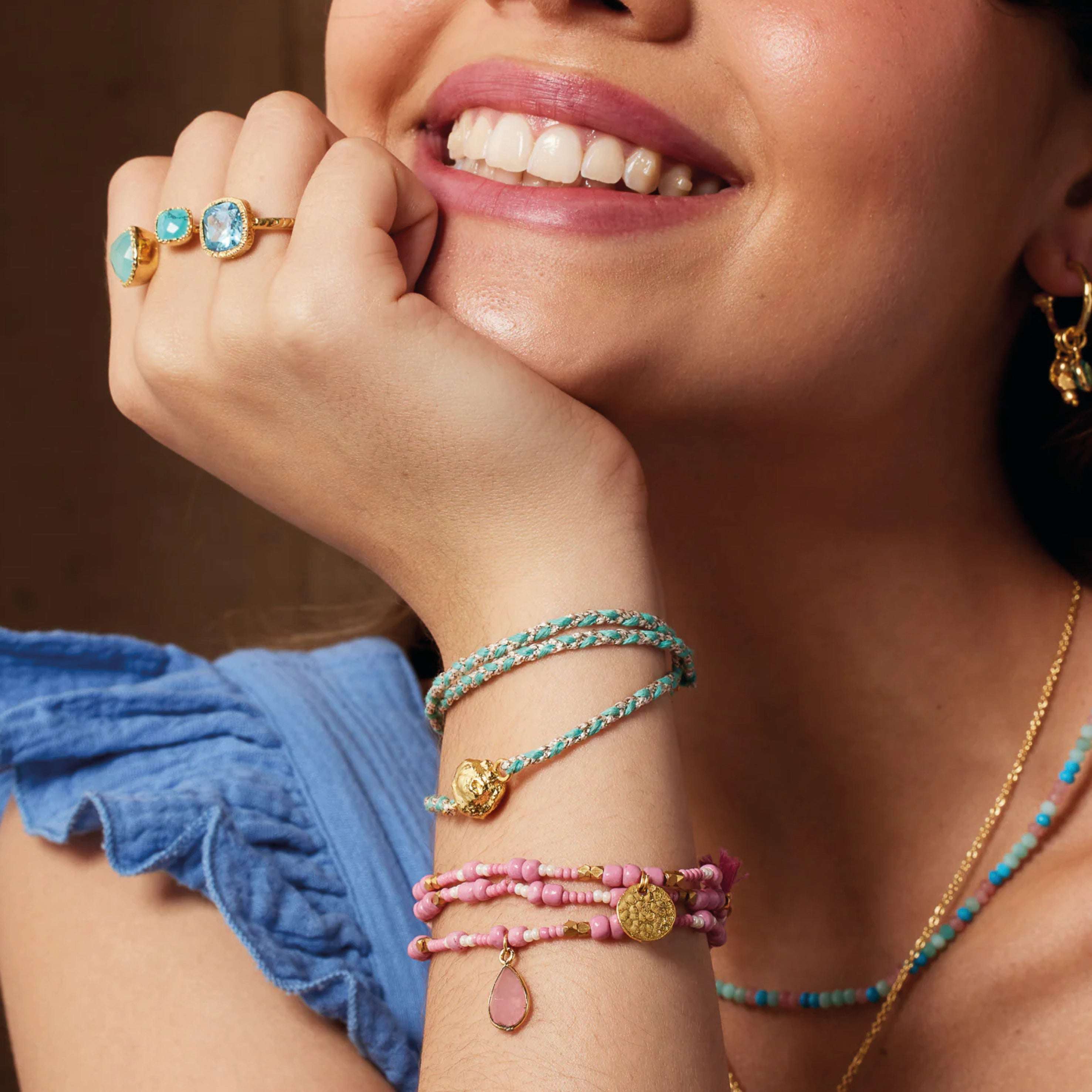 Add a touch of charm to your wardrobe with the Ashiana London Pink Luana Bracelet. This lovely set of three bracelets dazzles with its 22 carat gold plated brass, ensuring a luxurious shimmer. Each piece beautifully incorporates a semi-precious pink jade drop stone, merging ancient elegance with modern style.