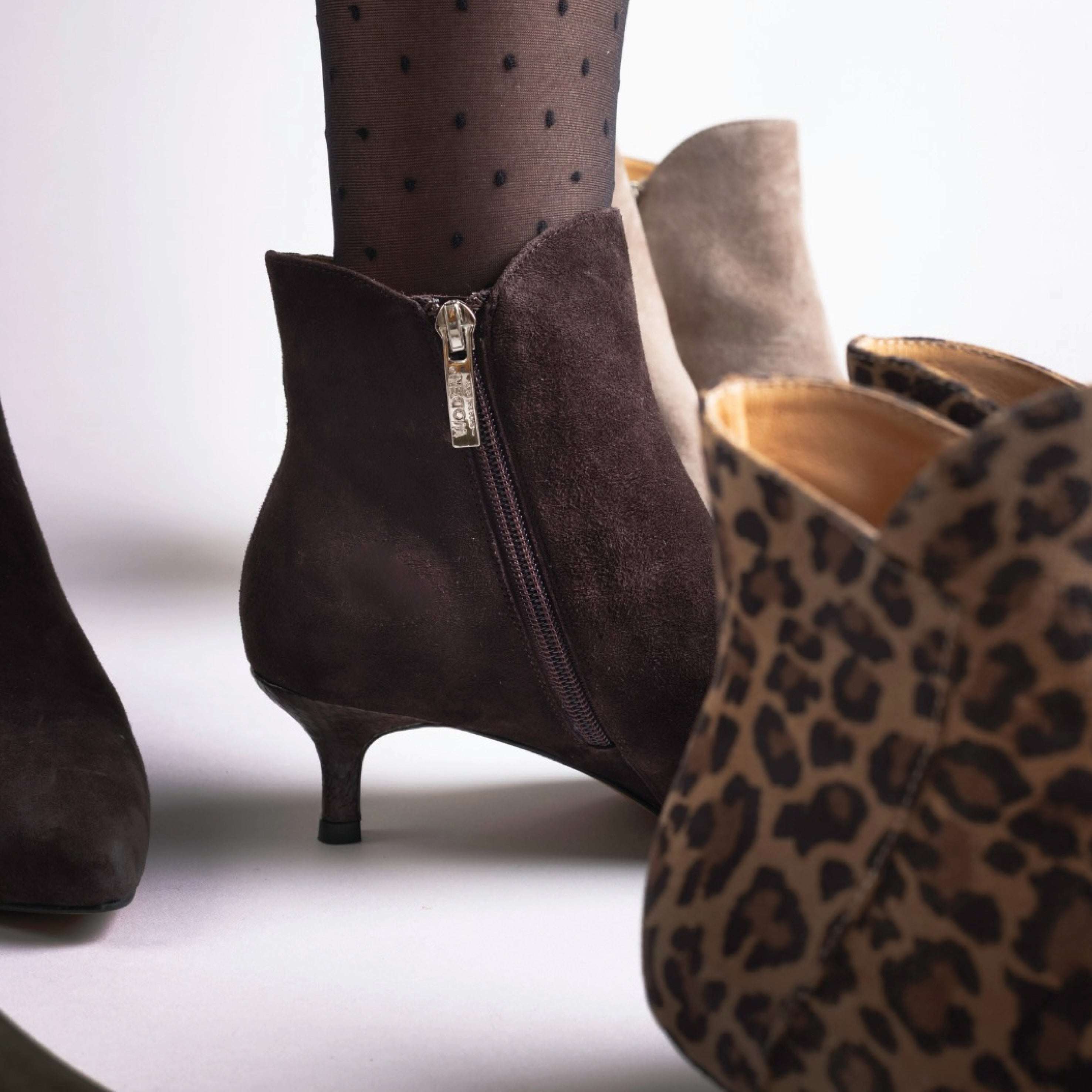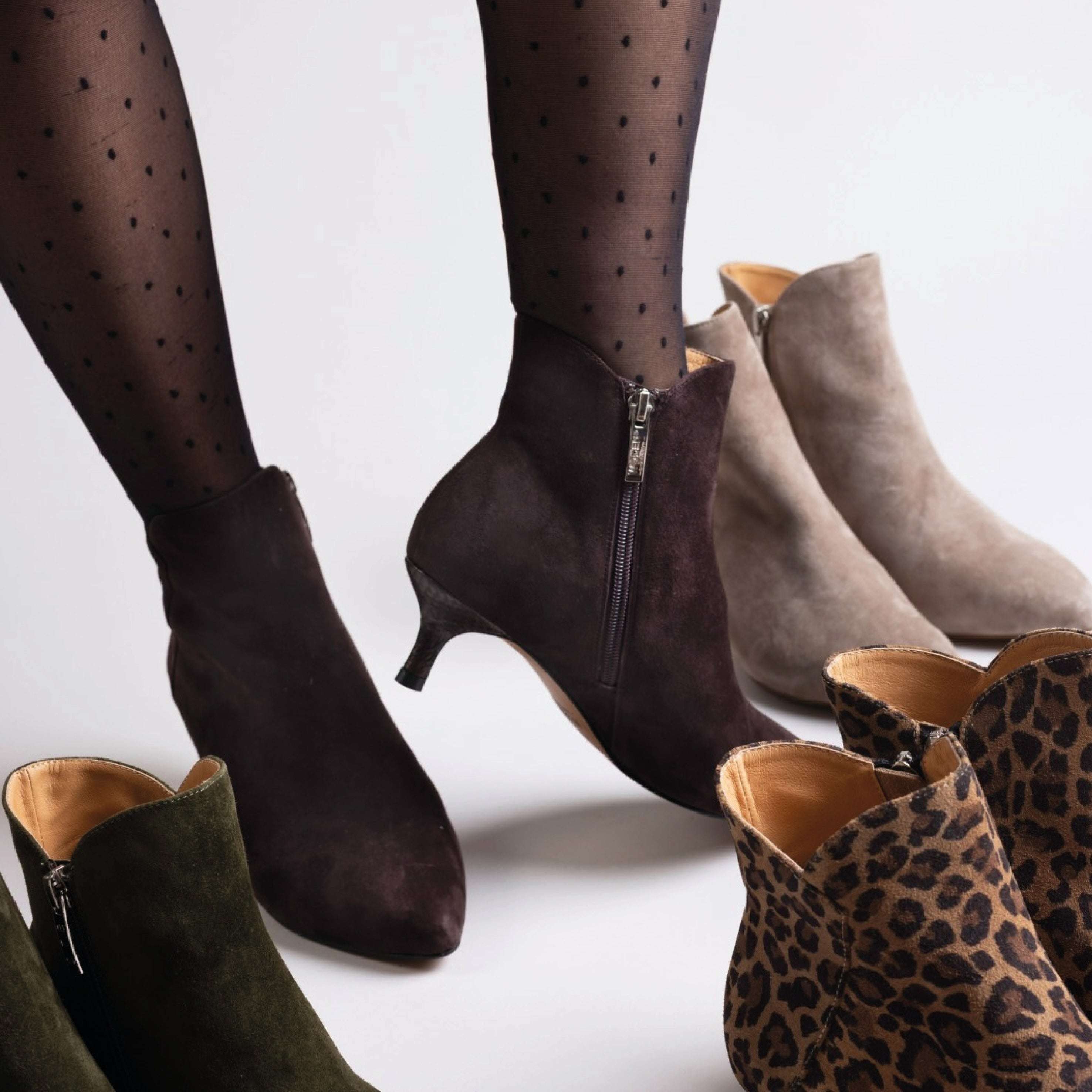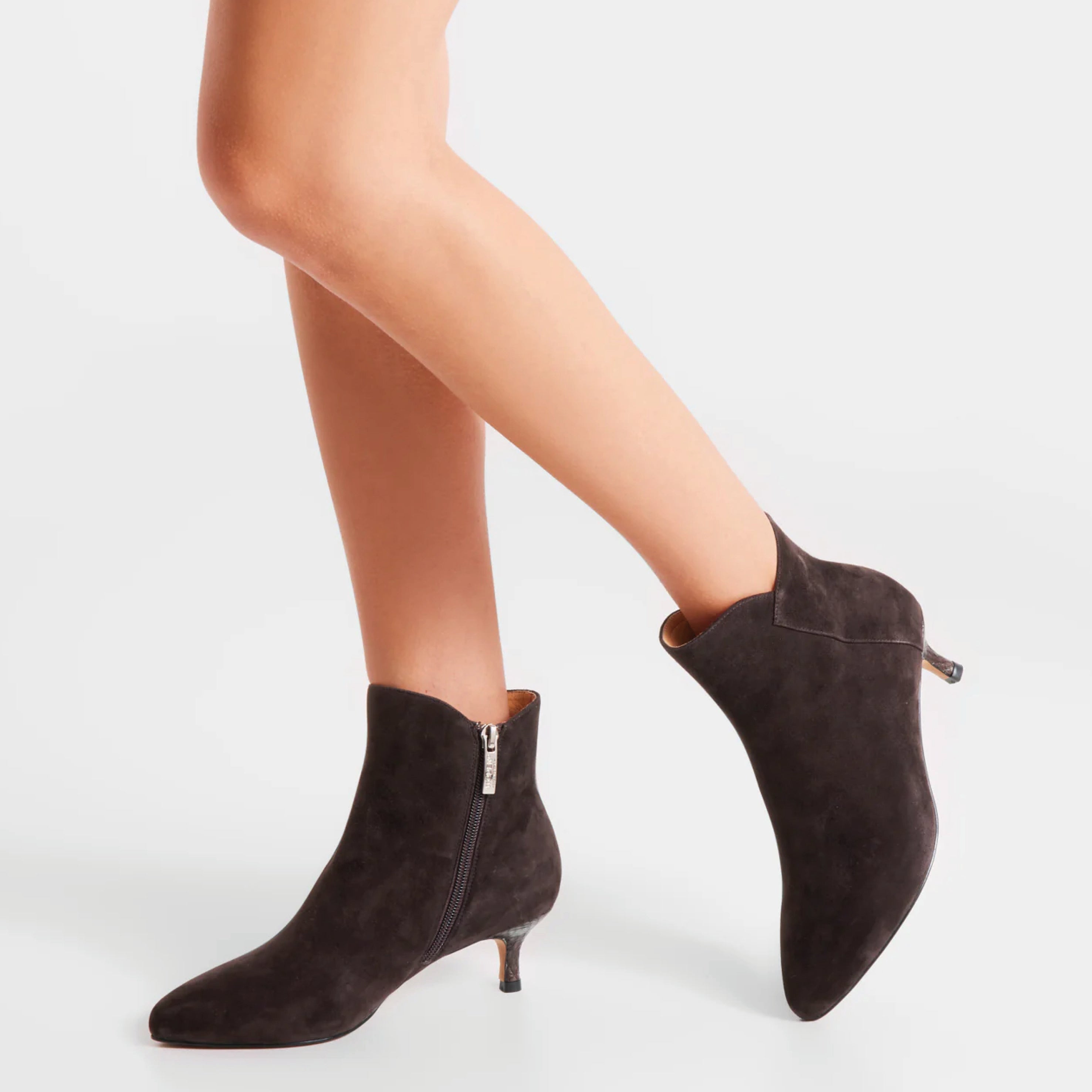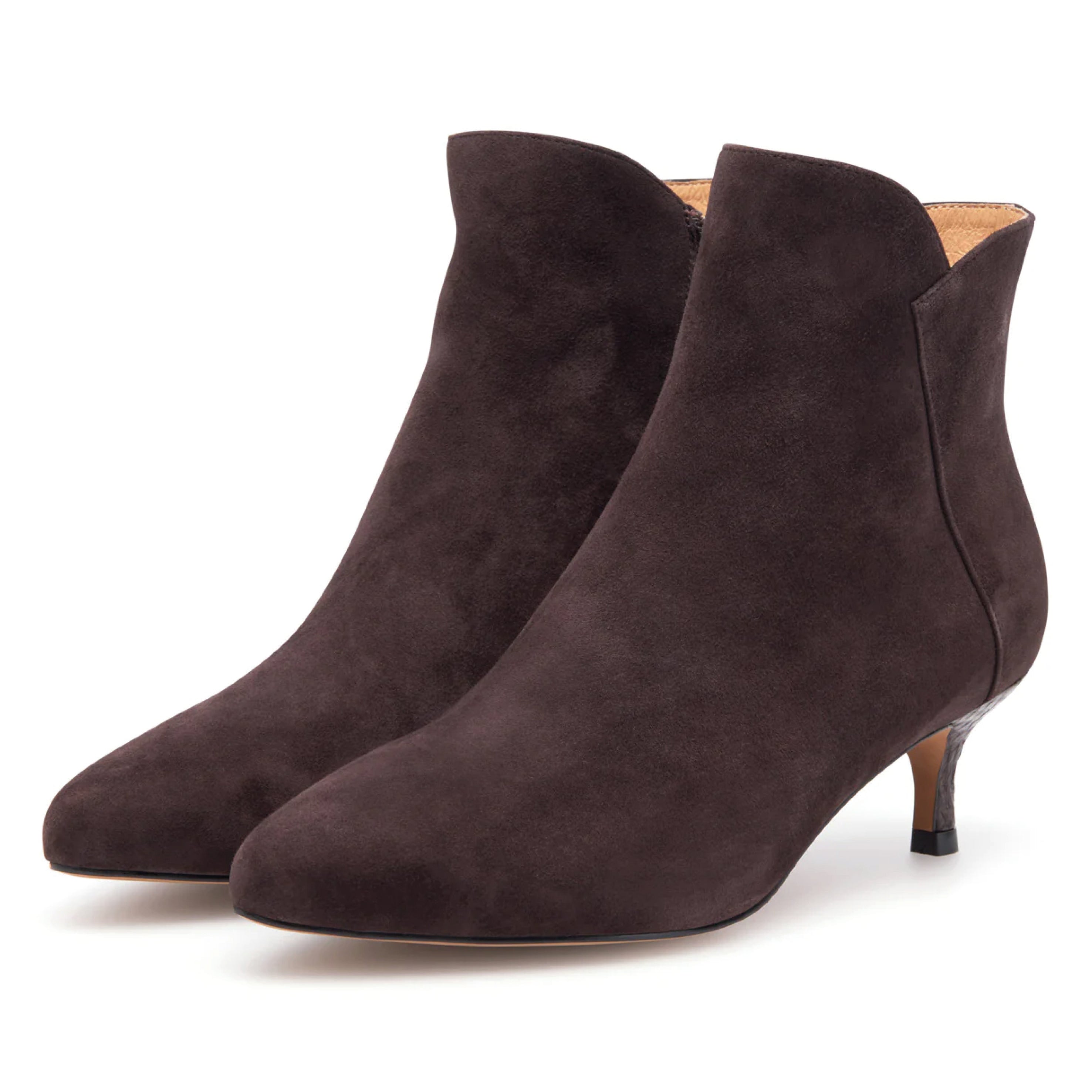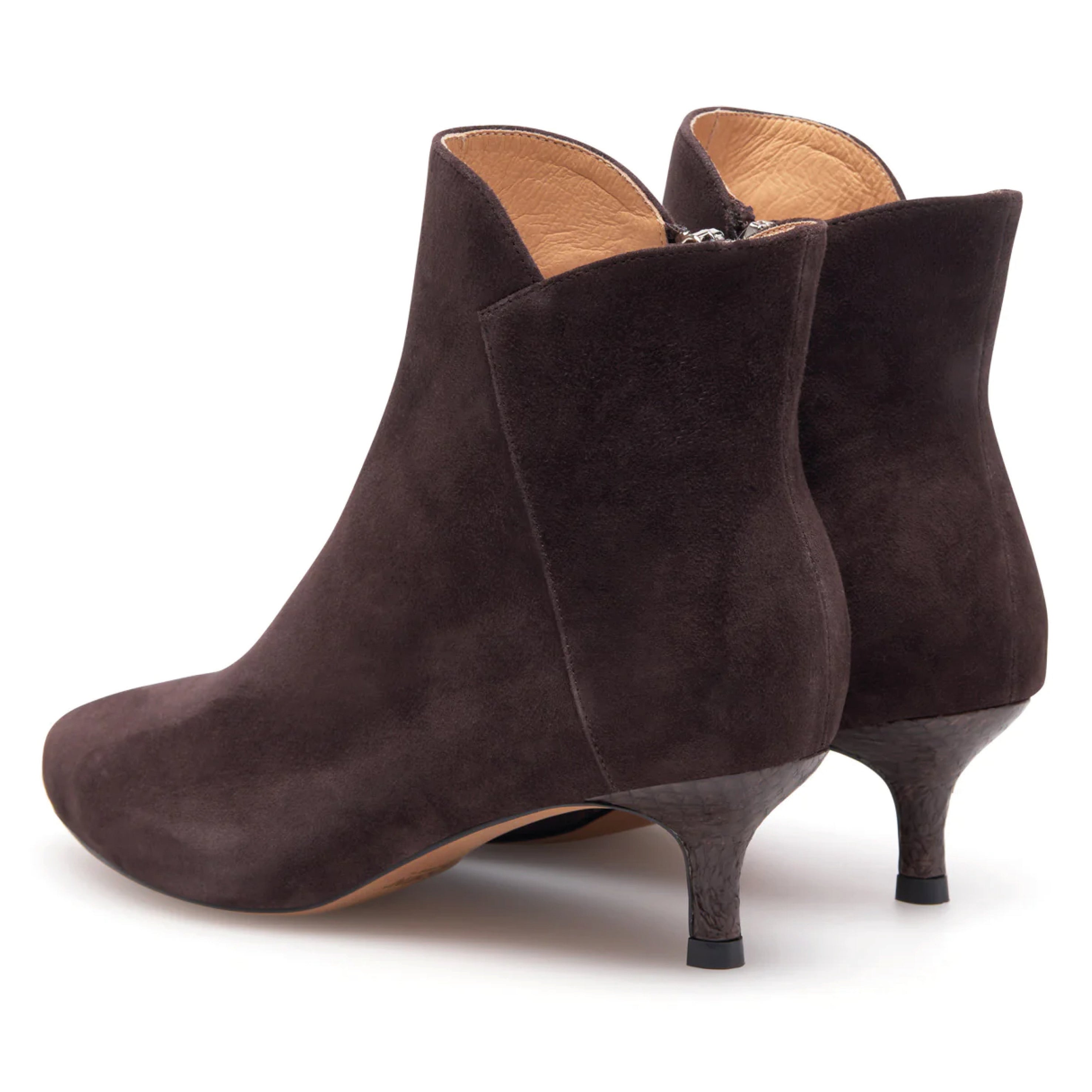 The Woden Chocolate Saga Zip Ankle Boot is a feminine ankle bootie crafted from 100% LWG certified suede with ASC-certified fish leather details and practical zip design. Designed with a modern heel and a refined silhouette, this style features WODEN's Natural Soft Technology™ for added comfort, making it versatile for both day and evening wear.
