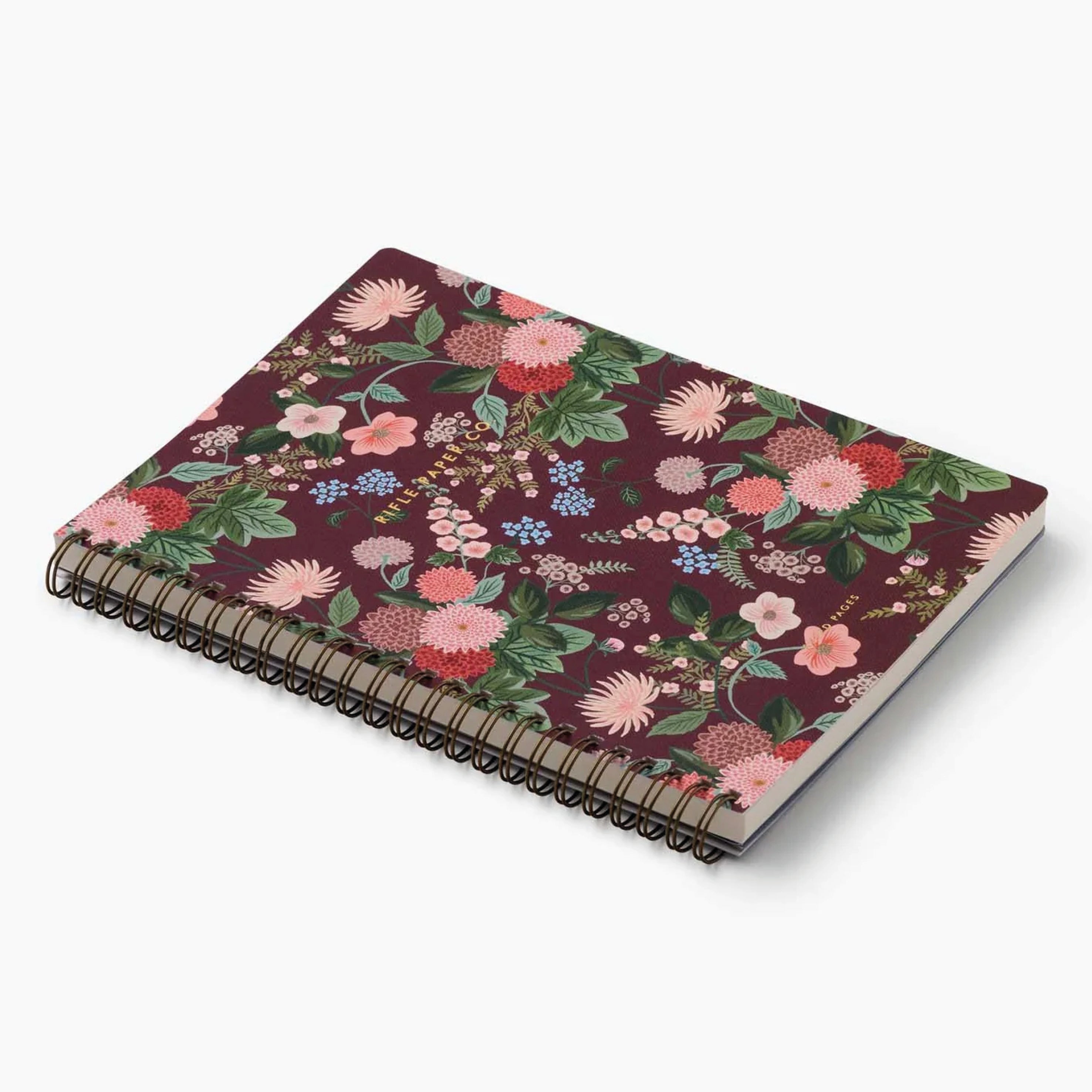 The Dahlia Spiral Notebook is printed on heavy-weight textured paper, this softcover spiral notebook features an illustrated cover with gold foil accents. The notebook has 150 ruled, perforated pages, a sturdy double-spiral binding, and pockets for extra storage.
