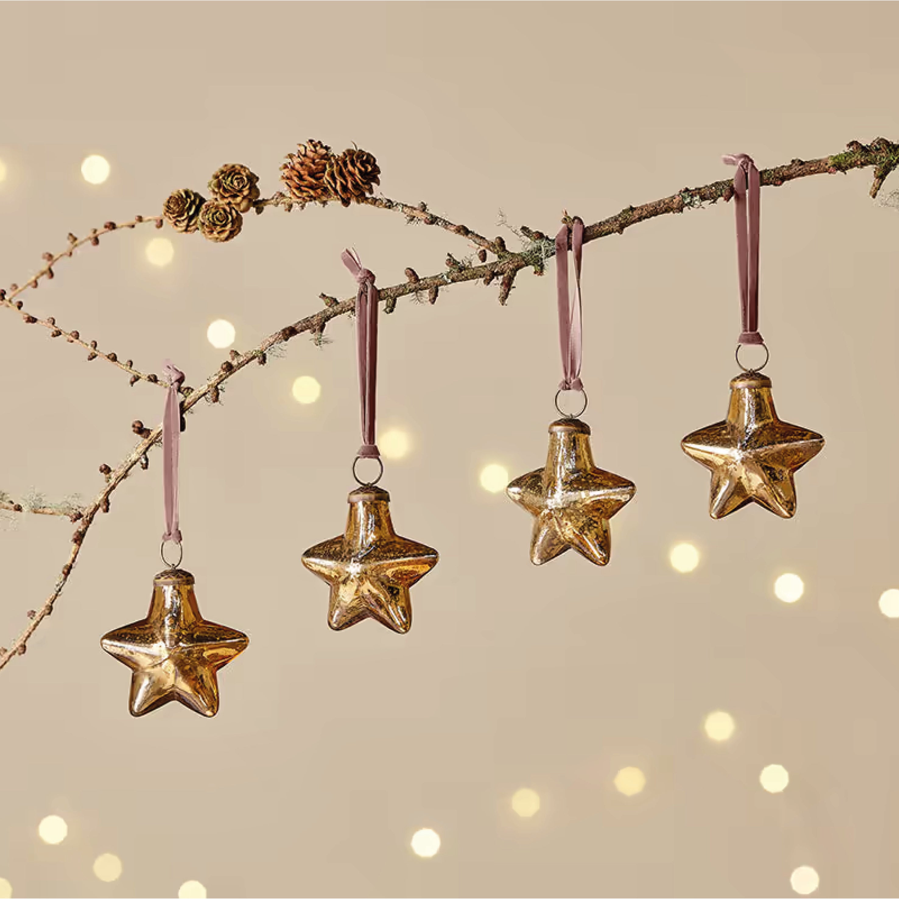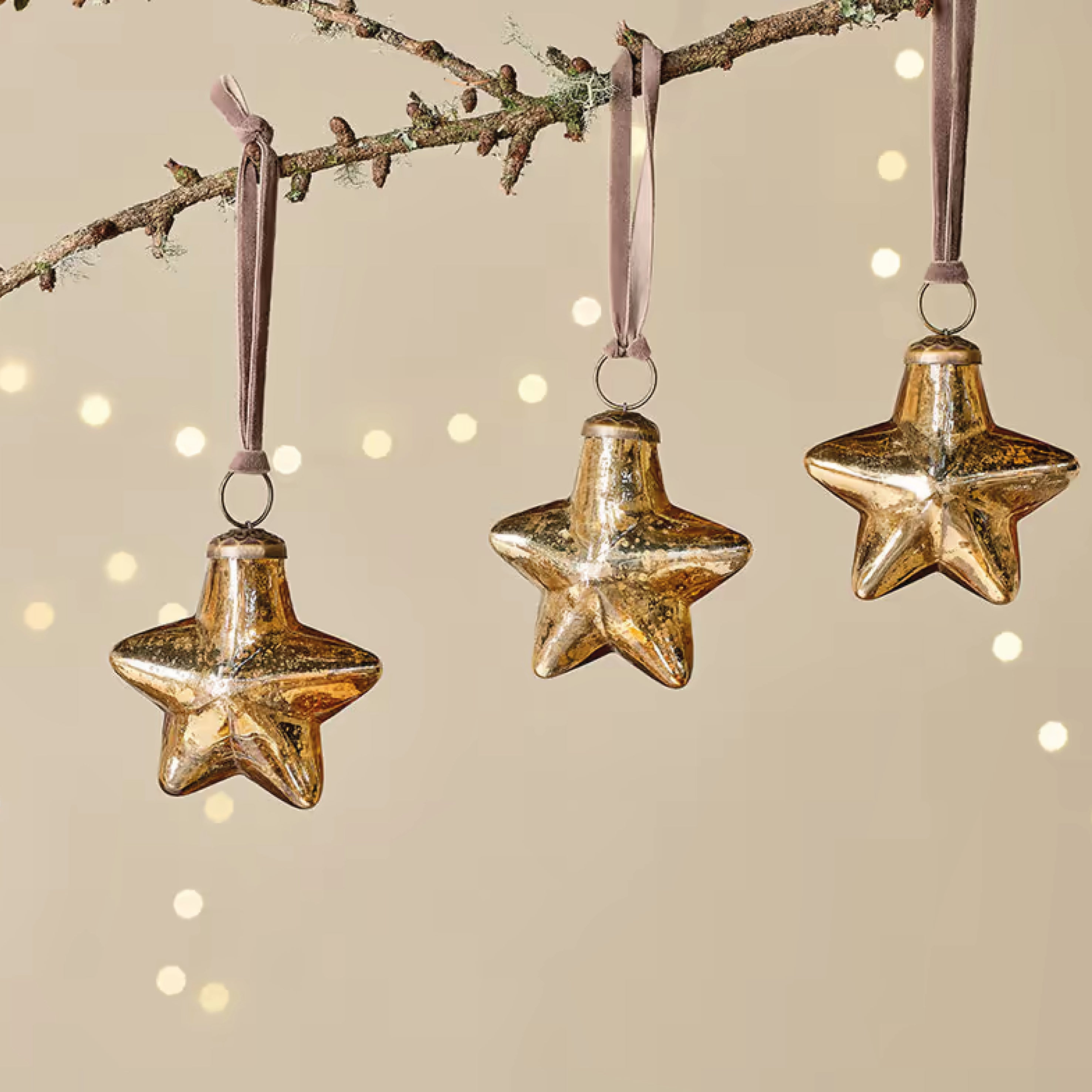 These Gold Sardi Star Bauble are the perfect adornment to any festive scene, sprinkling a little magic on your Yuletide revelries. Magnificent hung on a bare branch or twinkling among foliage. Finished with an antique-style clasp and elegant velvet ribbon.