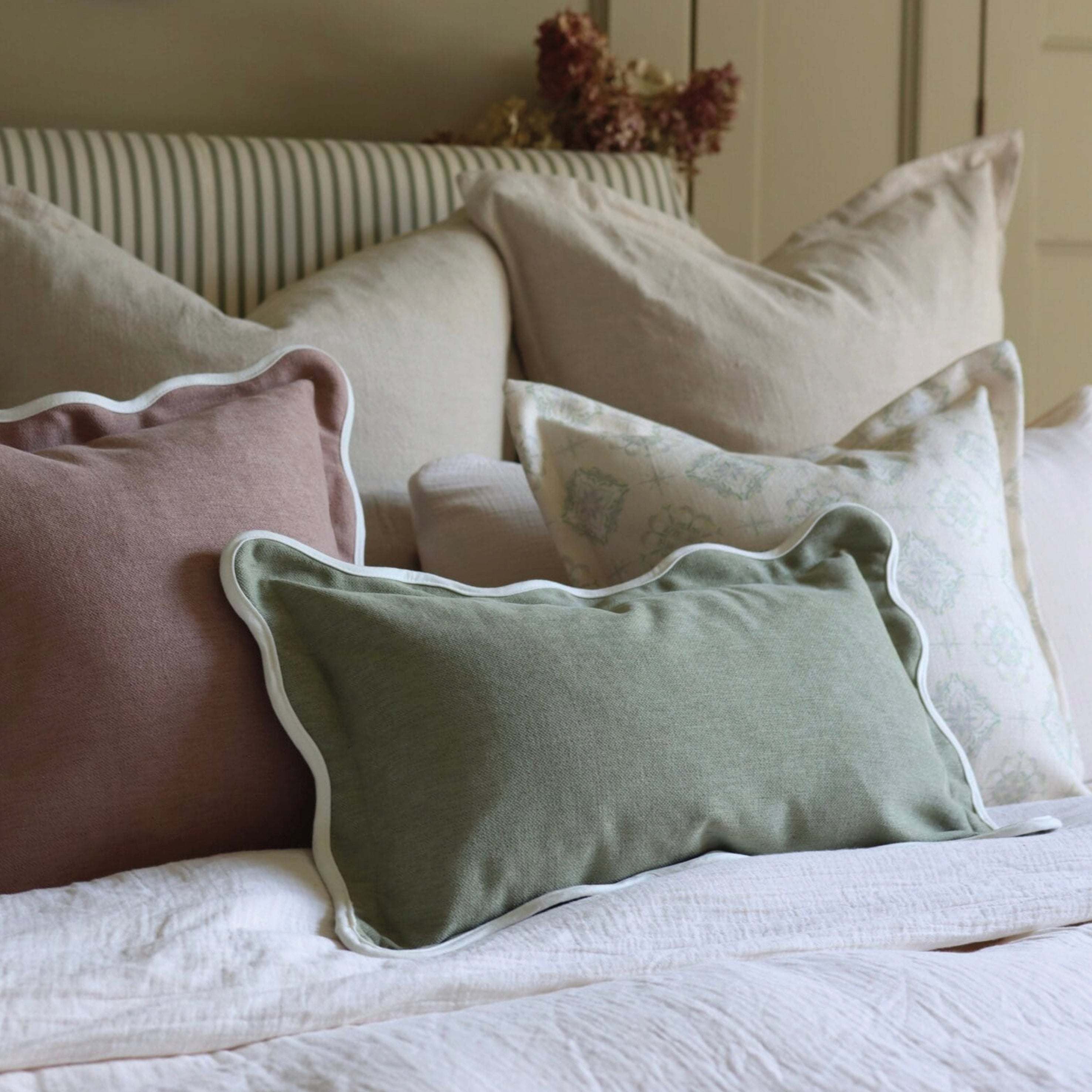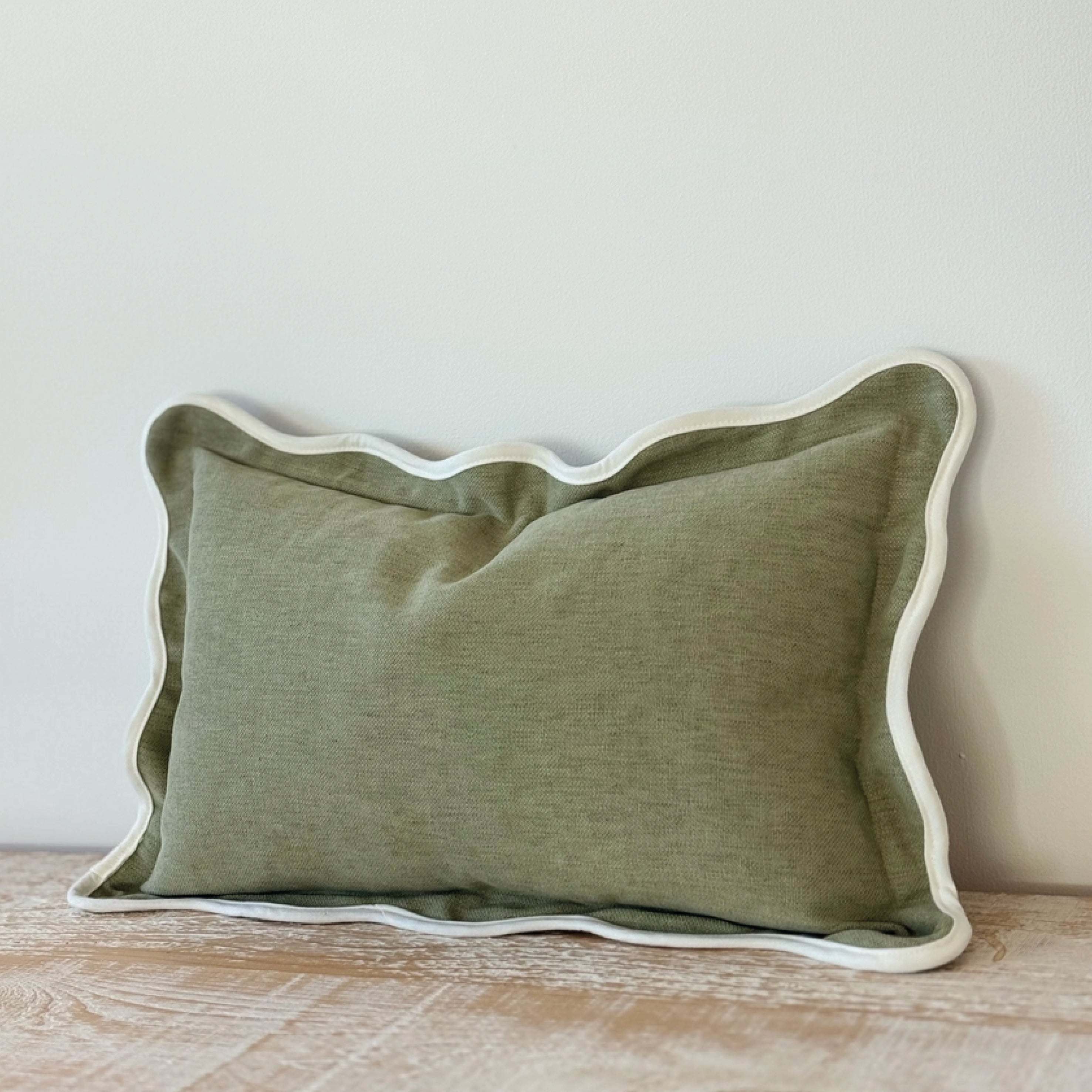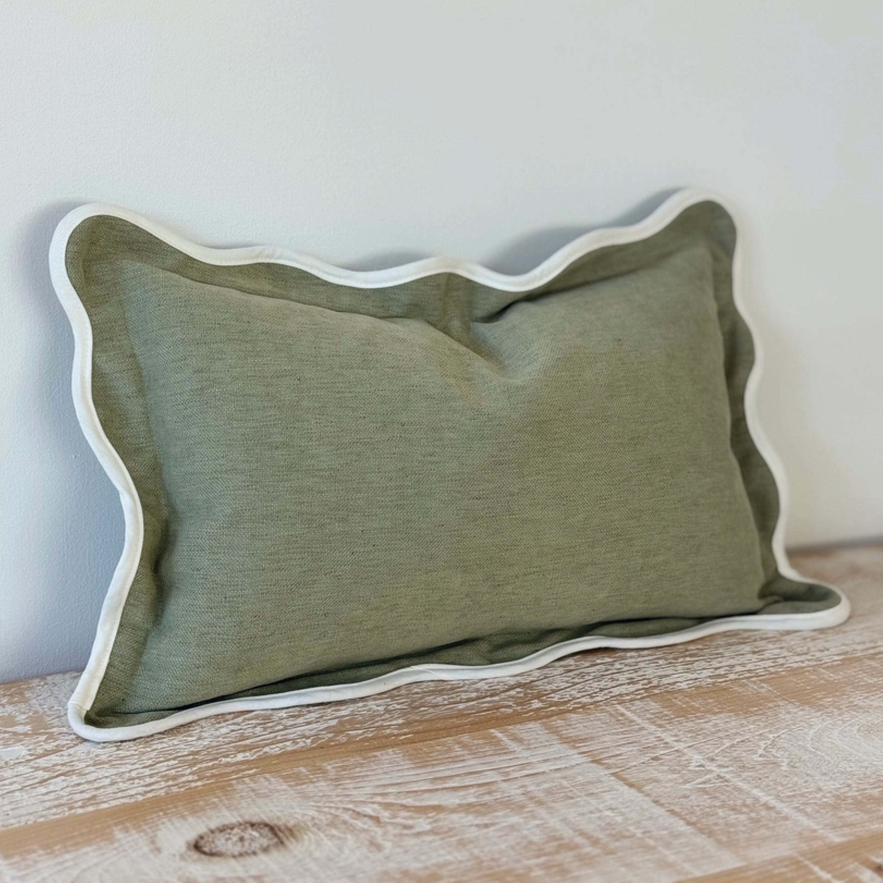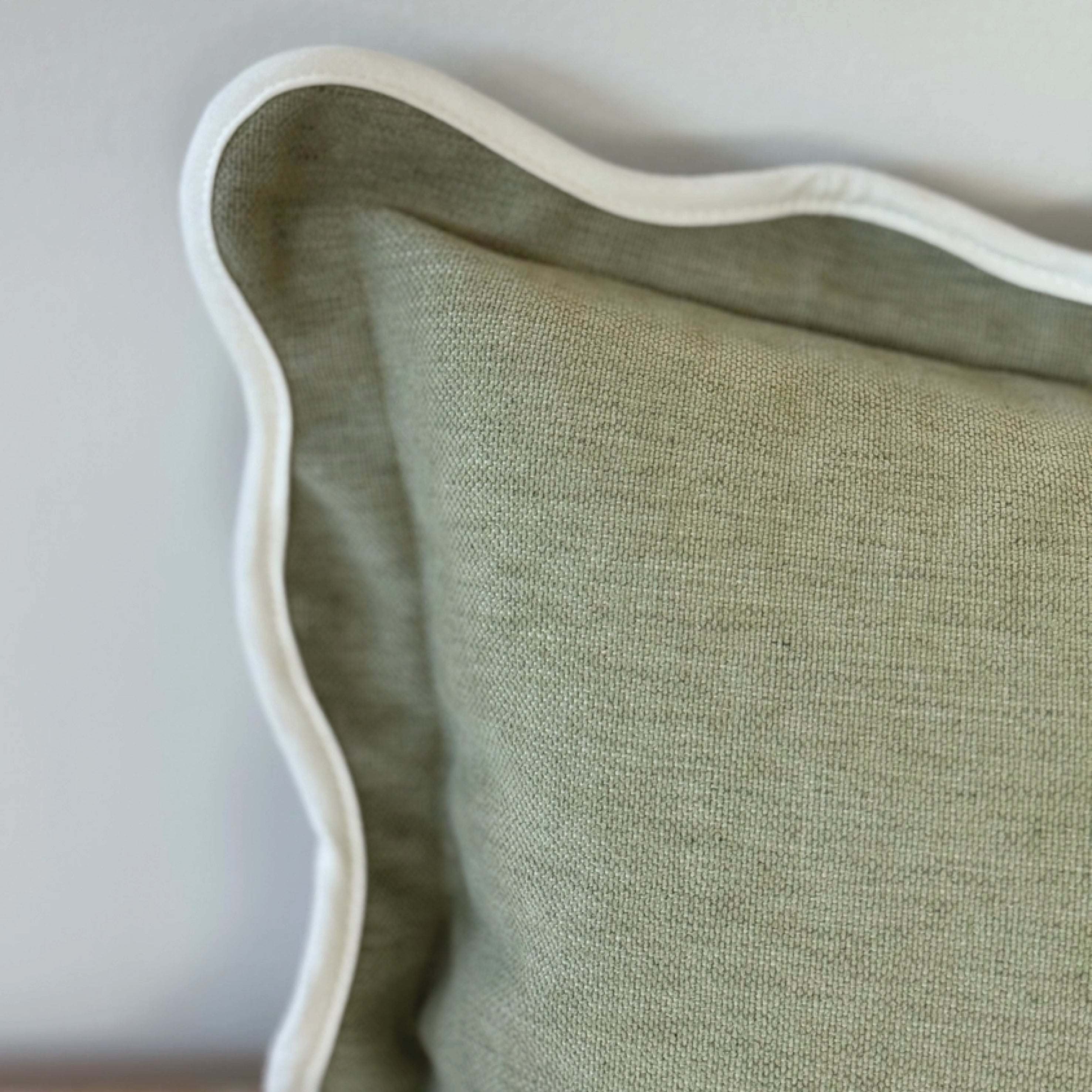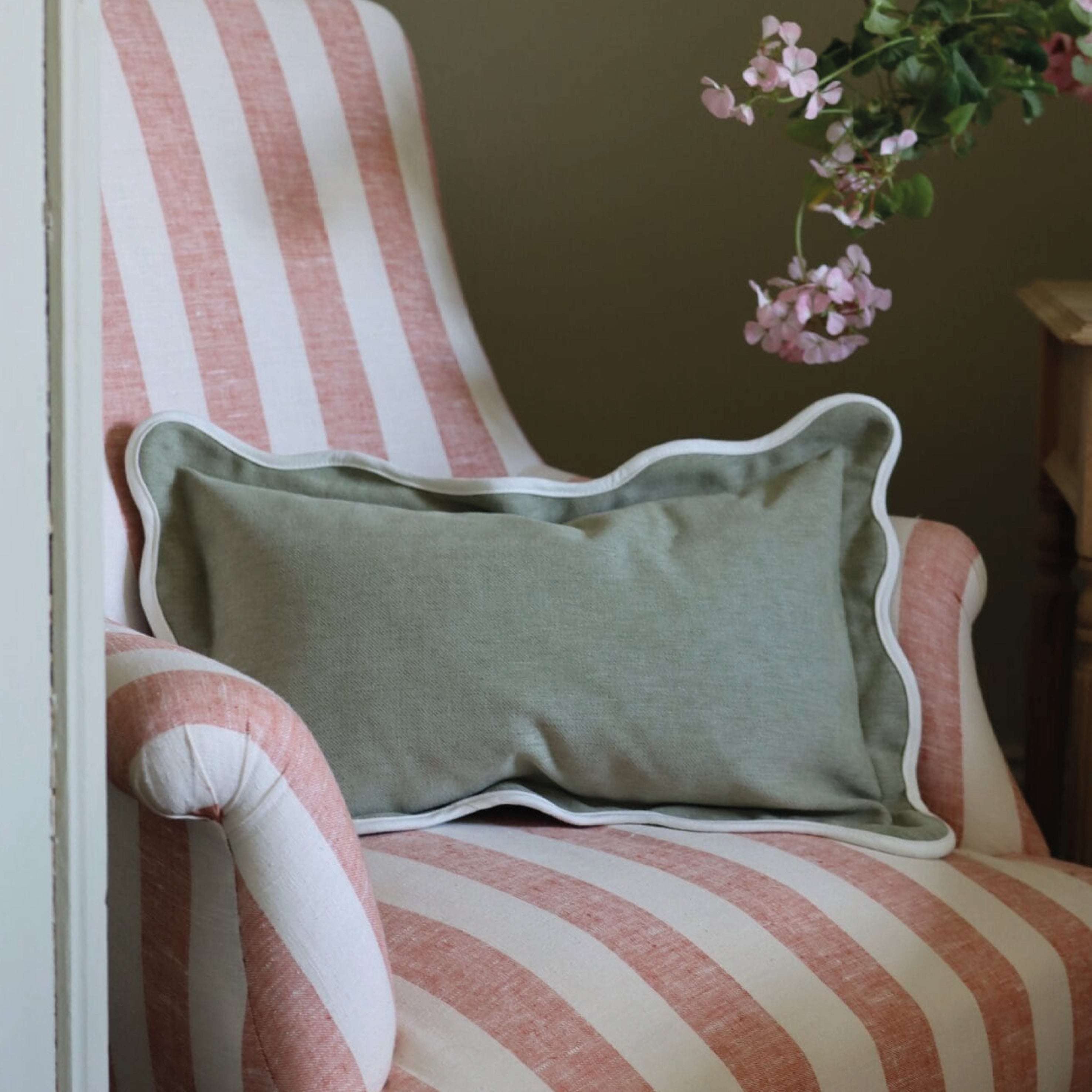 Introducing the Sage Rectangular Scalloped Chloe Cushion, a delightful sage green cushion to add to your living space that seamlessly blends elegance with comfort. This scalloped edge cushion is the perfect finishing touch to any space.