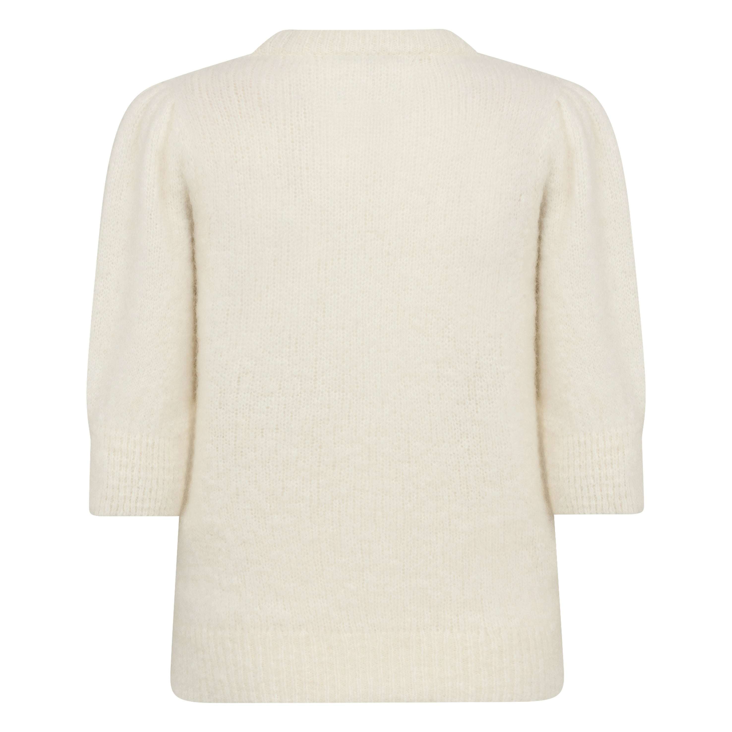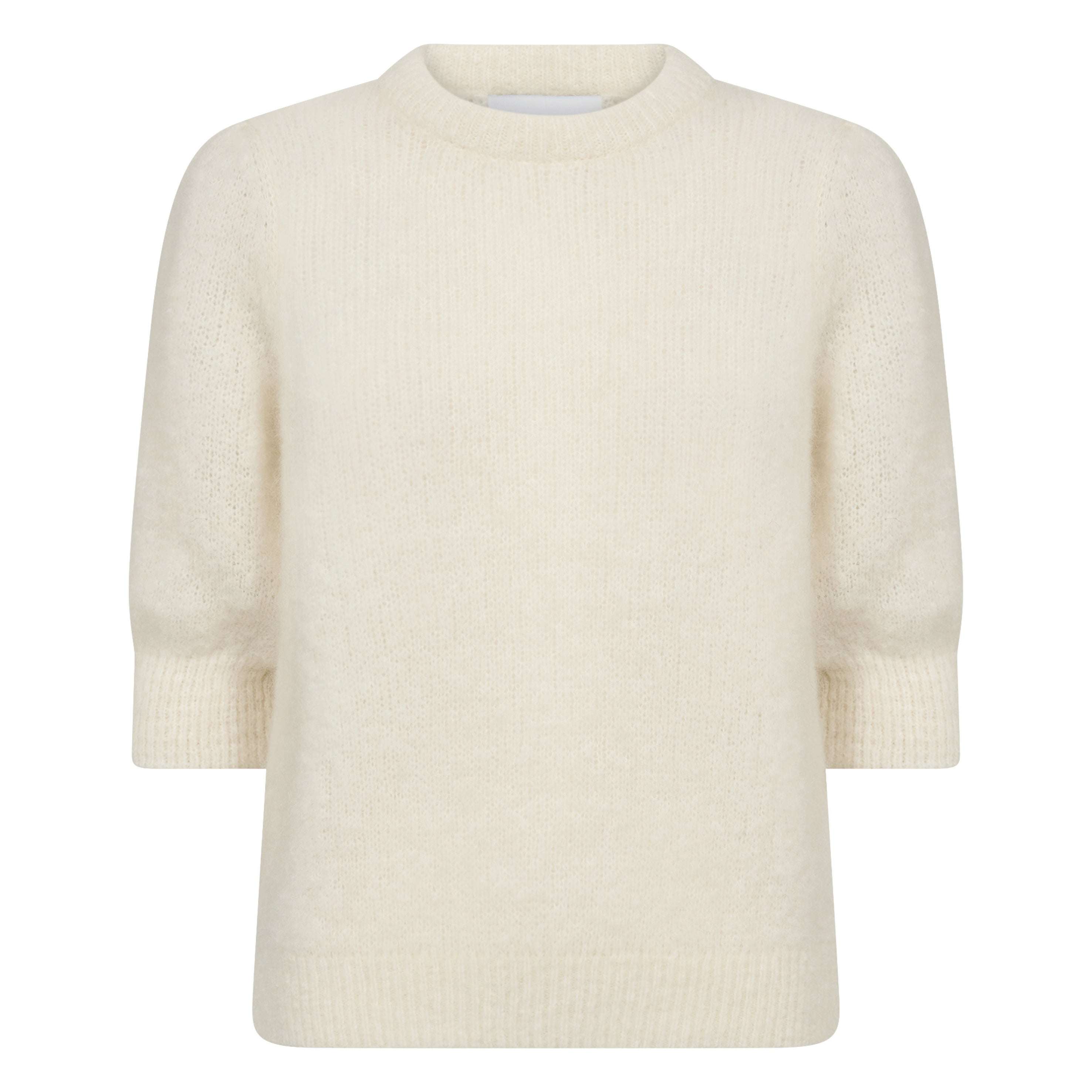 The Leveté Room Star White Noreen Knit is a blouse crafted with 53% Mohair, 45% Polyamide, 2% Elastane. It features a round neckline, three-quarter sleeves, and a ribbed texture throughout. Pair it with tailored trousers or a fitted skirt for a stylish look.