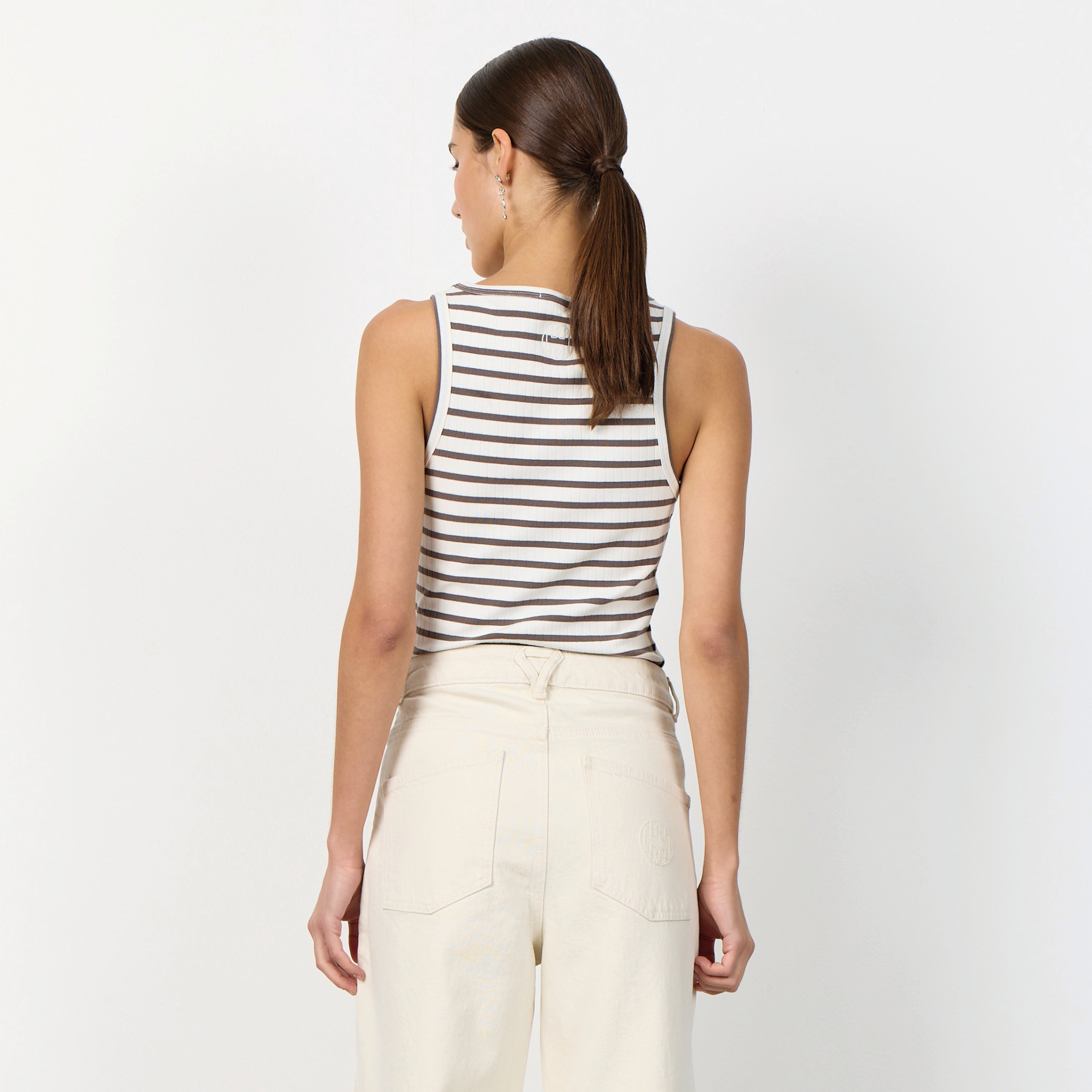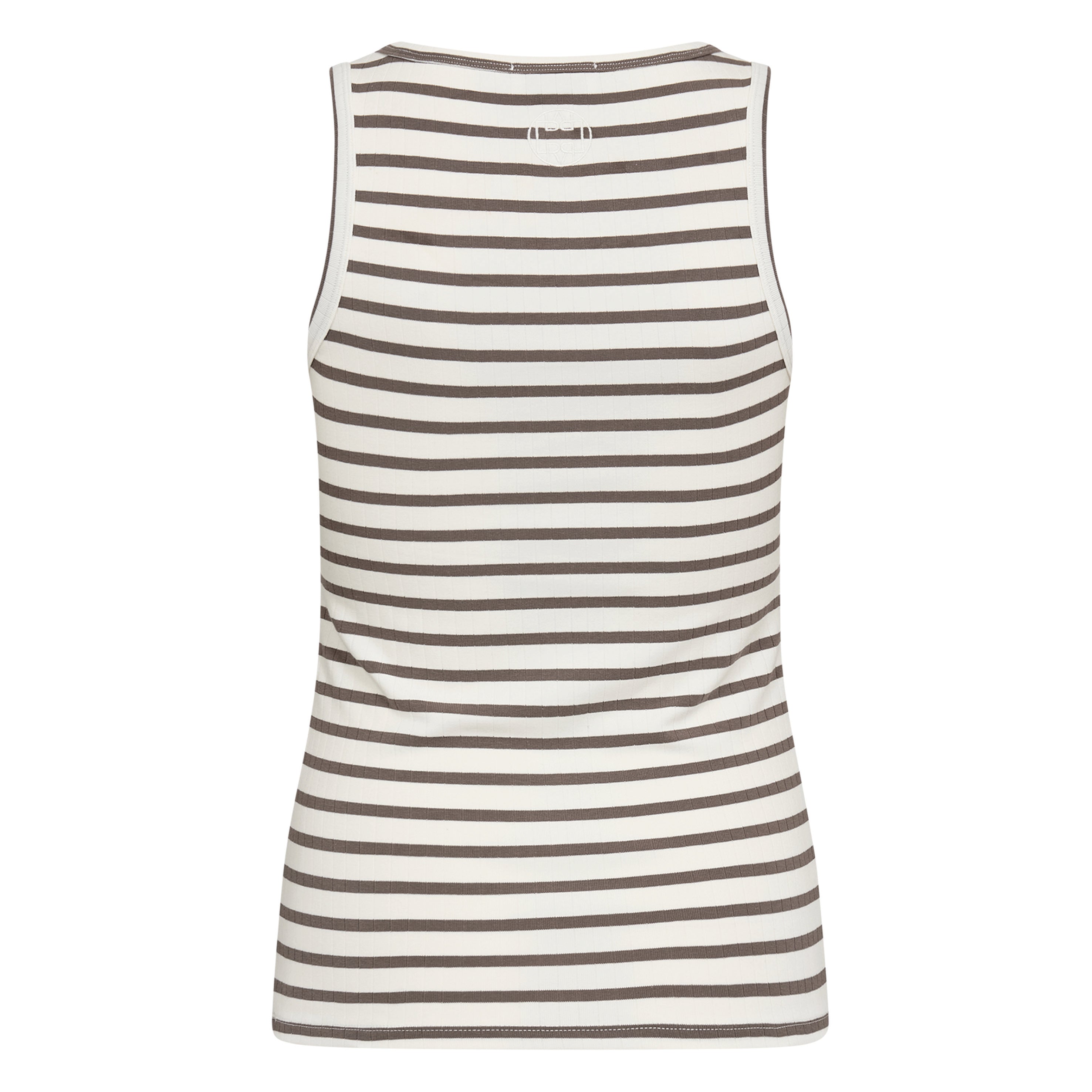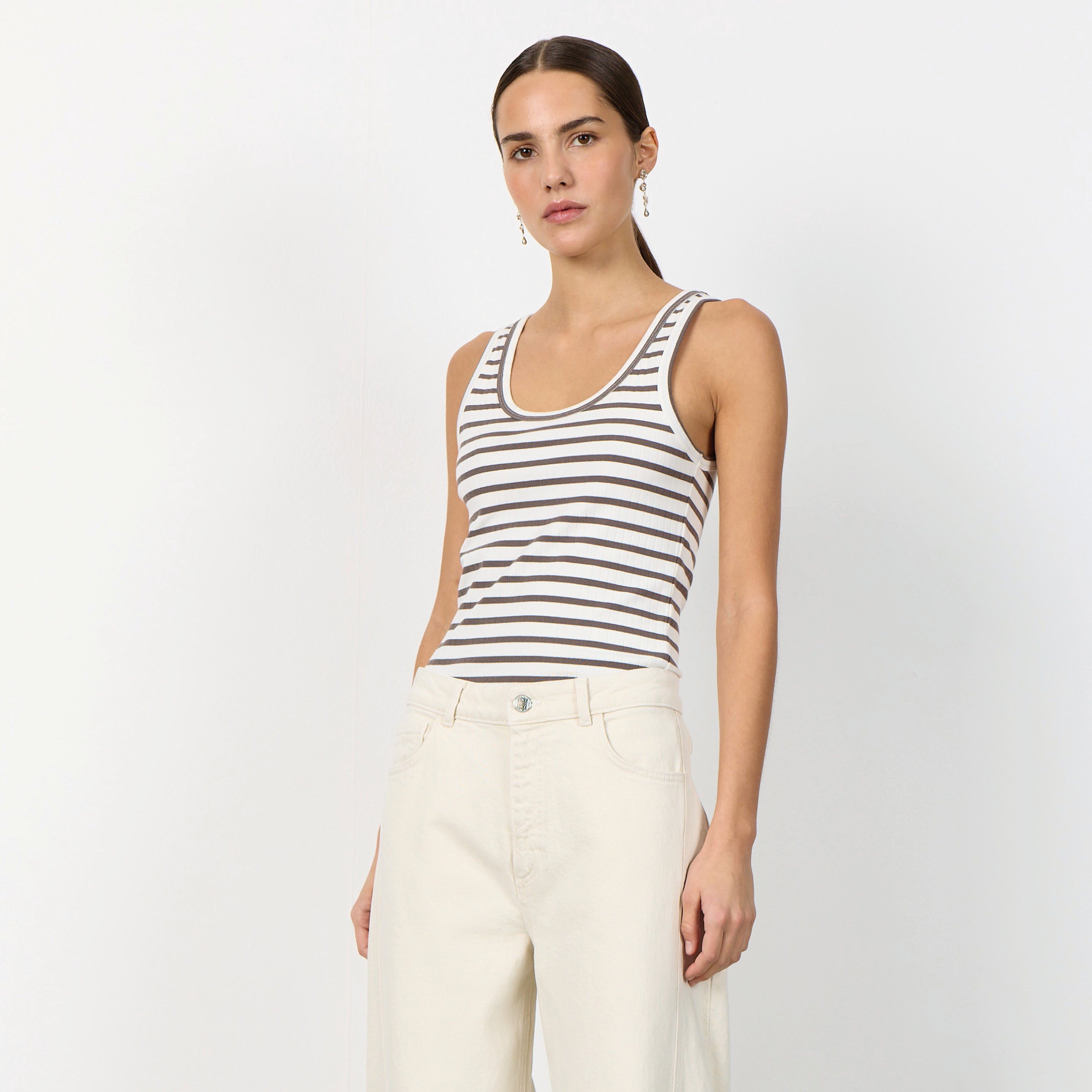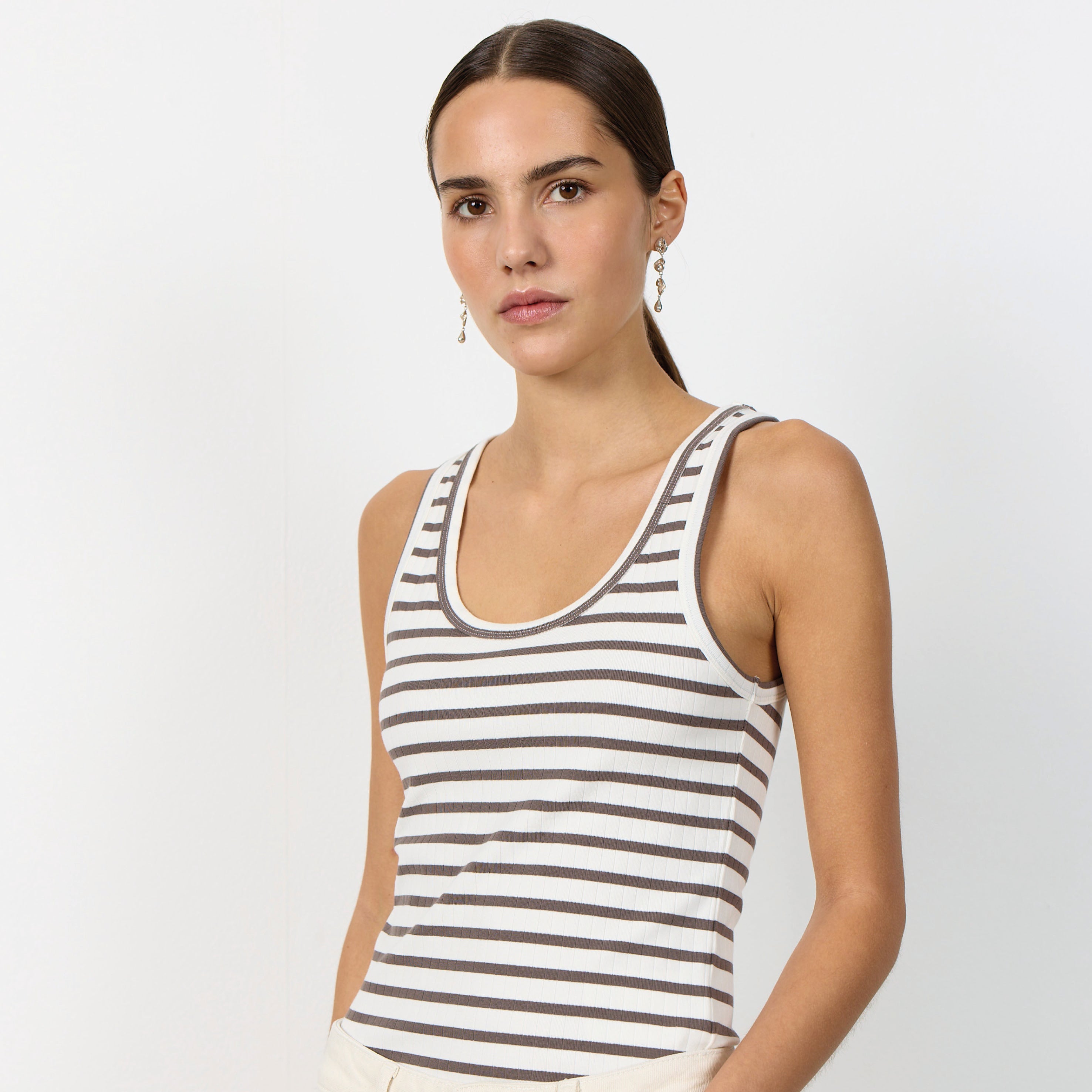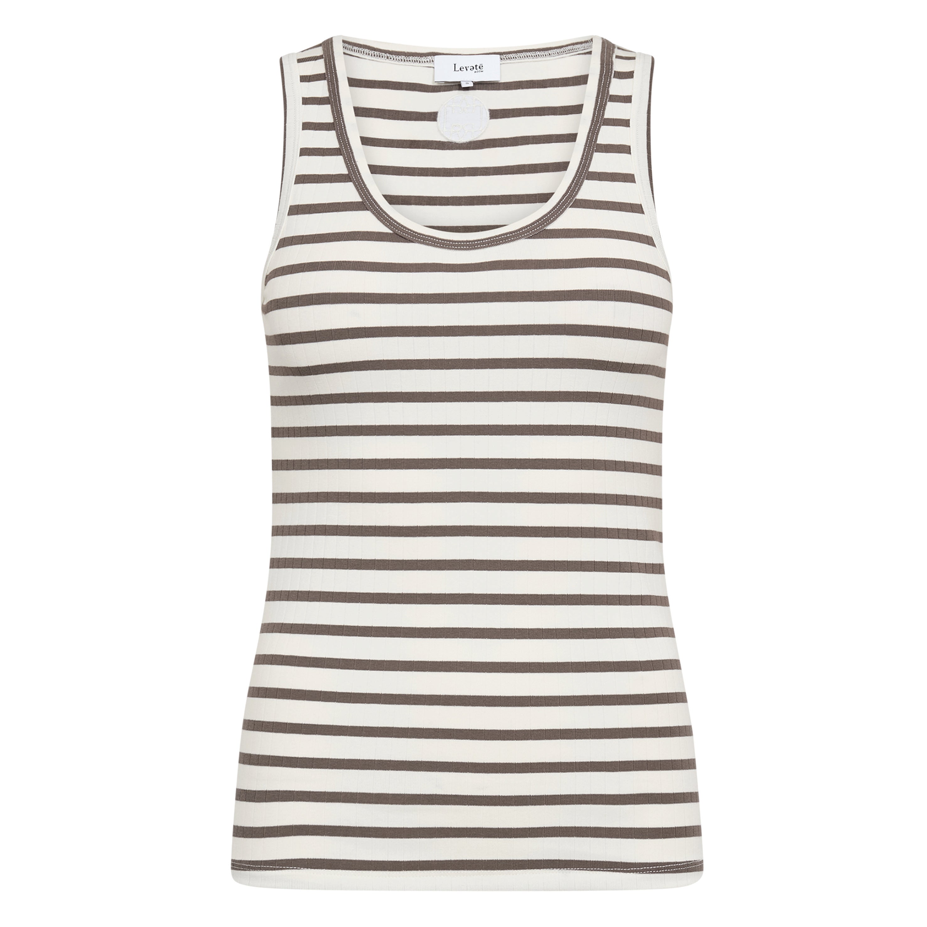 The Leveté Room Camel Stripe Neddie Vest features a classic round neckline and an elegant striped pattern throughout. Pair it with tailored trousers for a sophisticated look or with jeans for a relaxed style.