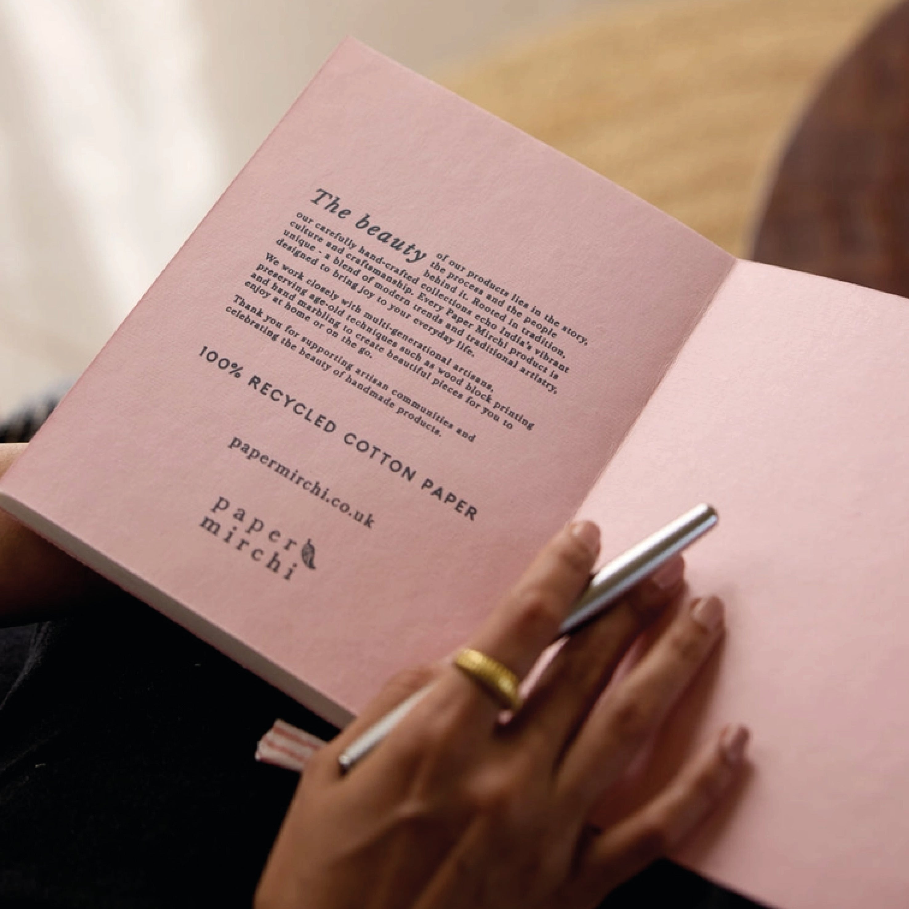 The inside pages are crafted from recycled cotton rag paper – soft, durable and beautifully textured. Whether you are journalling your thoughts, sketching ideas or making notes, every page offers a tactile reminder of mindful creation.