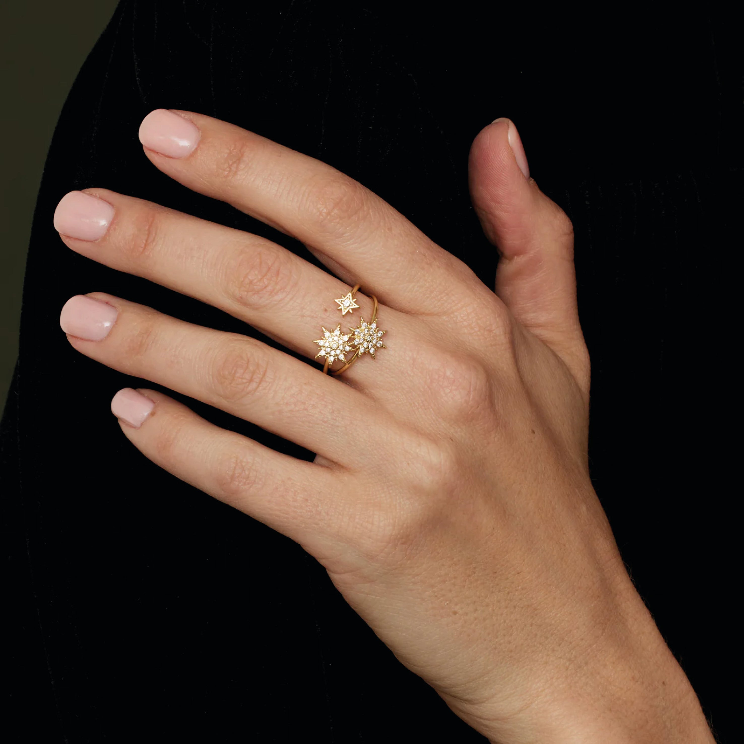 This adjustable open-end Ashiana London Brie Star Ring is adorned with two delicate sparkling stars. Designed to be worn on any finger.