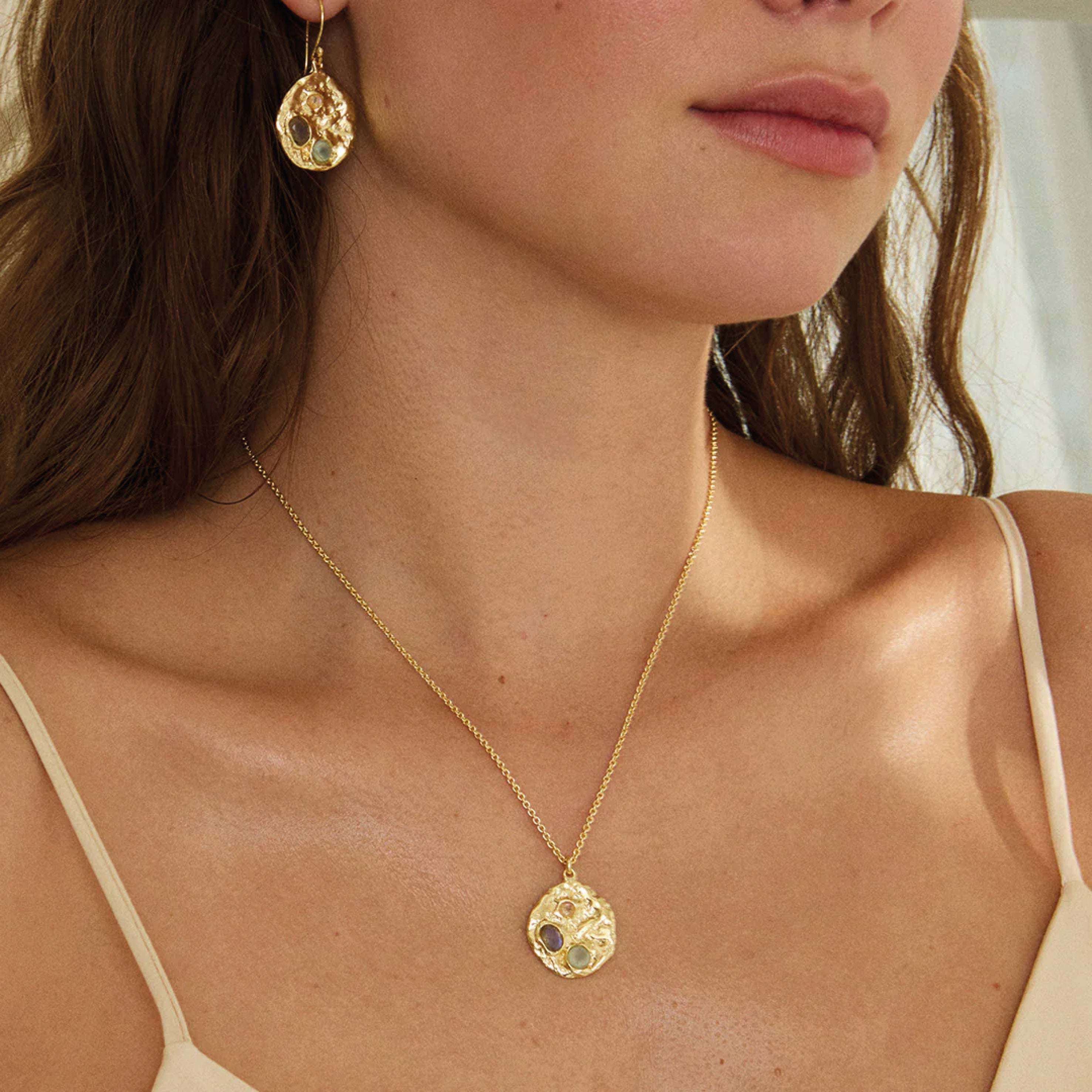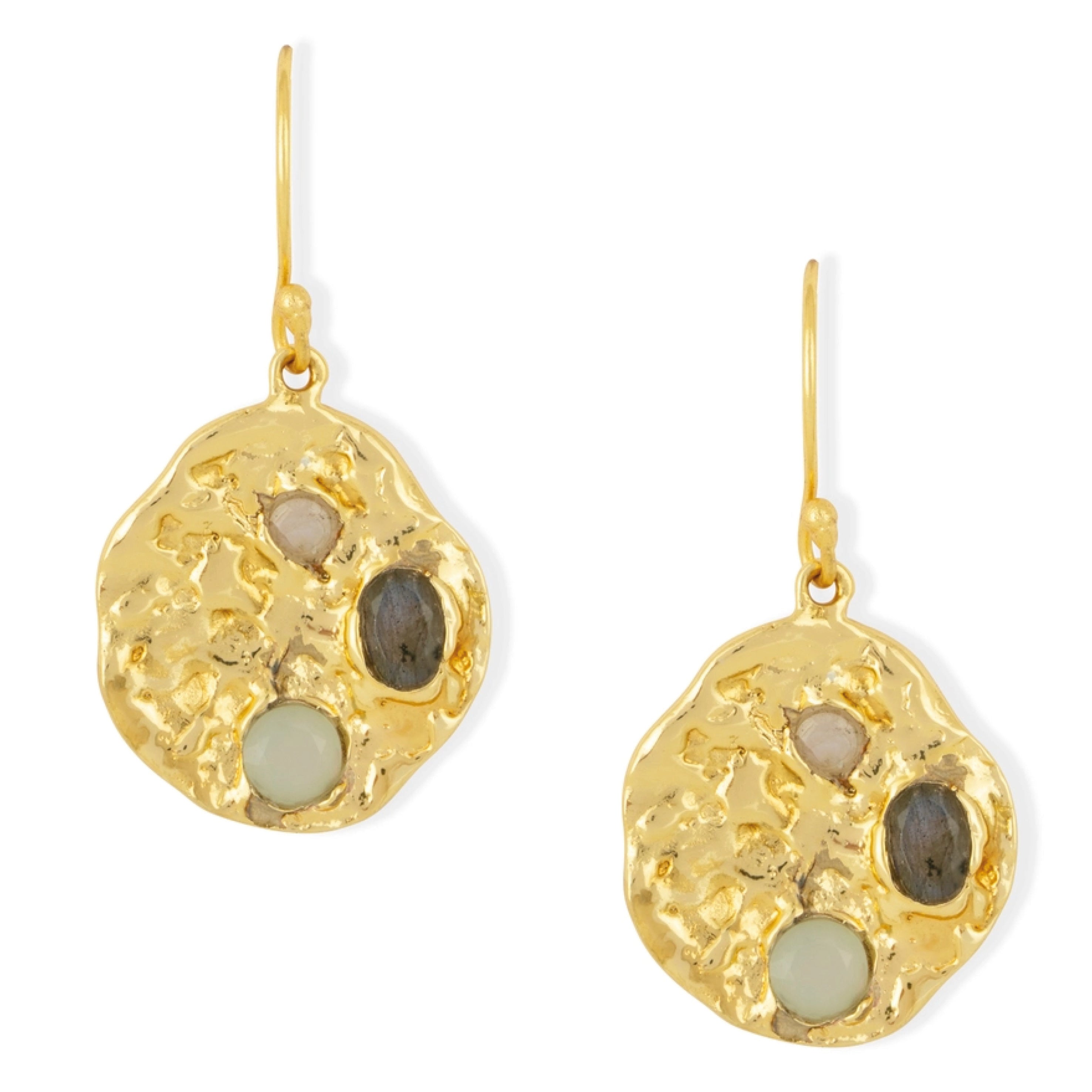 Elevate your elegance with the Ashiana London Rhode Gemstone Coin Earrings, featuring molten gold coins delicately crafted to capture a timeless allure. Each earring is adorned with three carefully inset gemstones of aqua chalcedony, rainbow moonstone and labradorite that shimmer with subtle iridescence, adding depth and sophistication to your look.