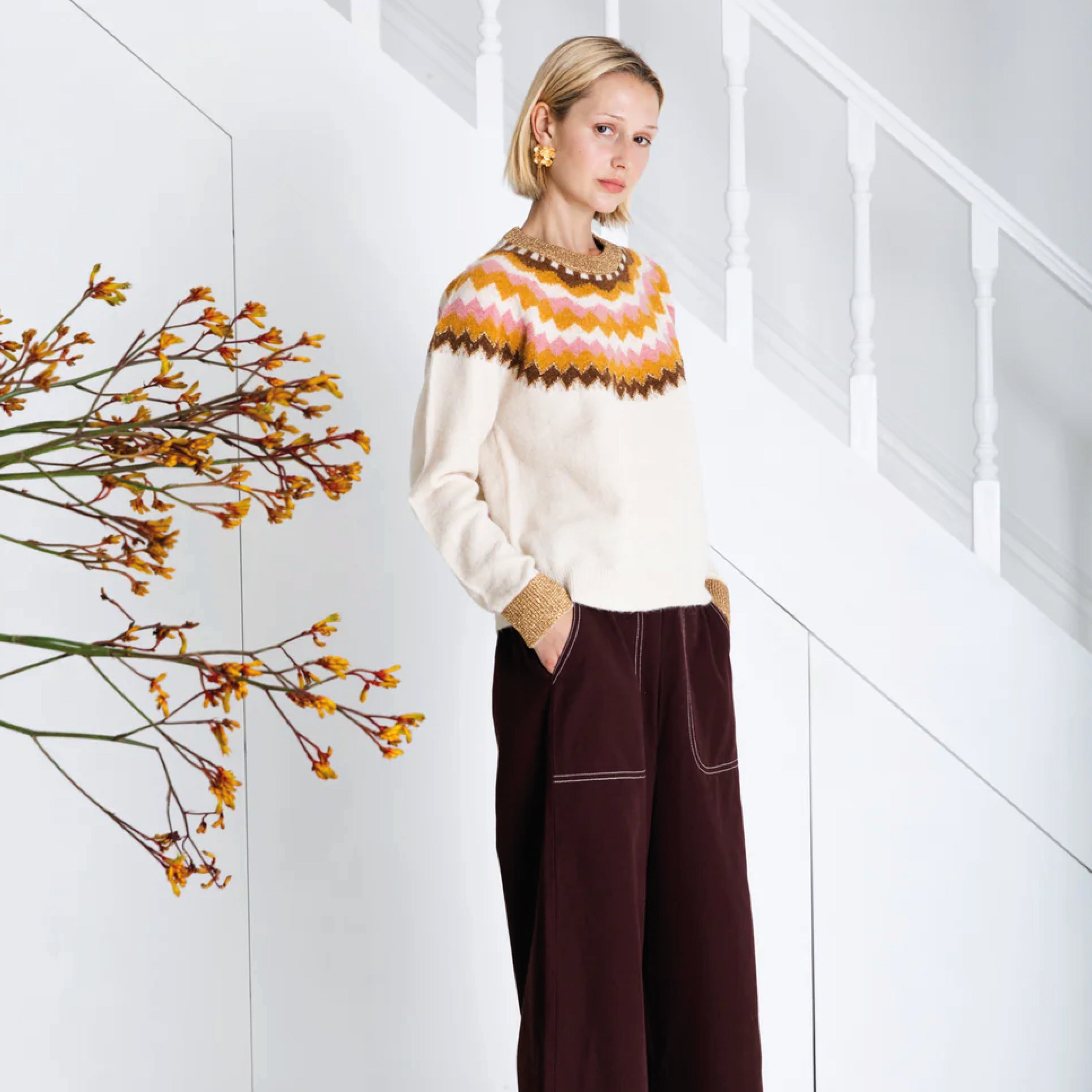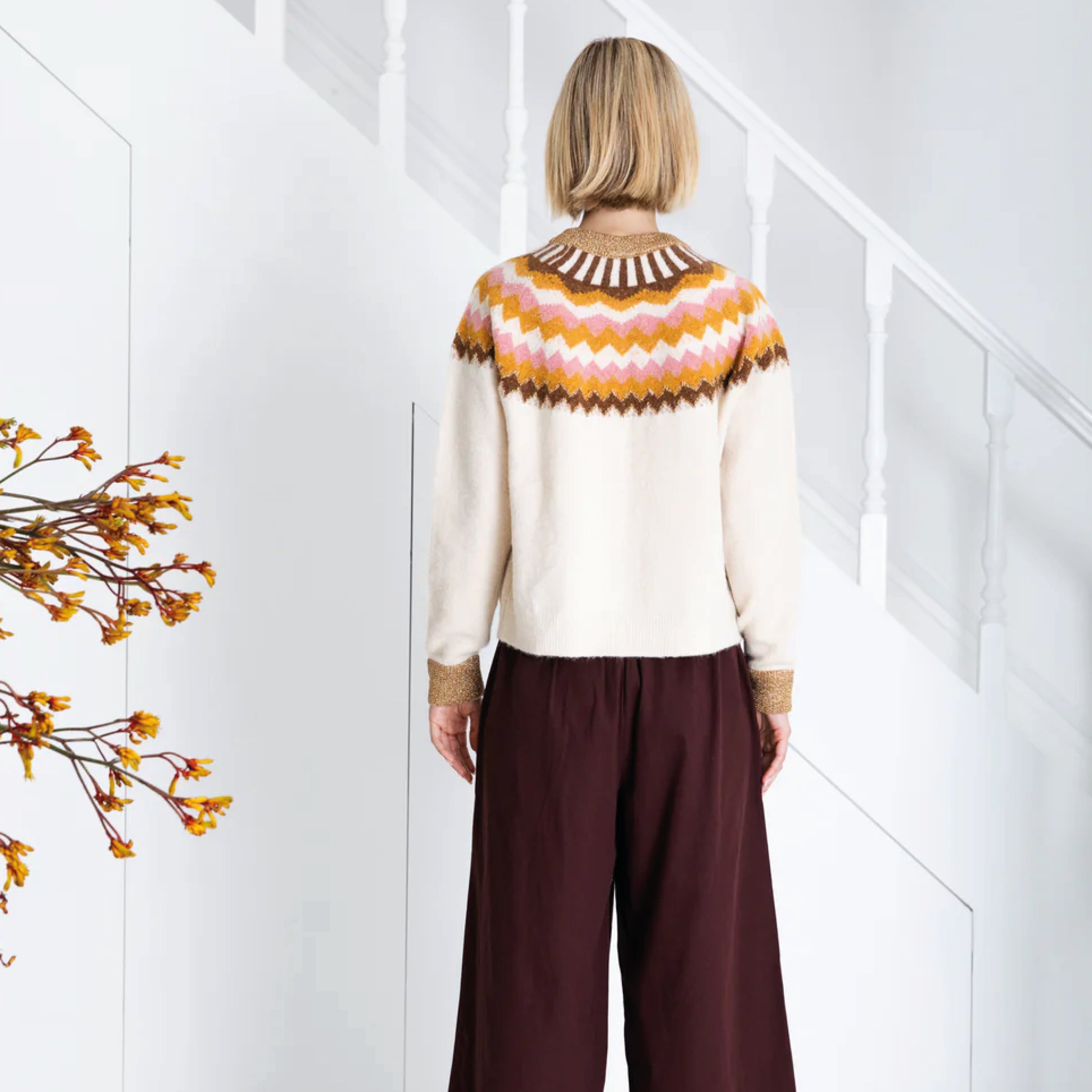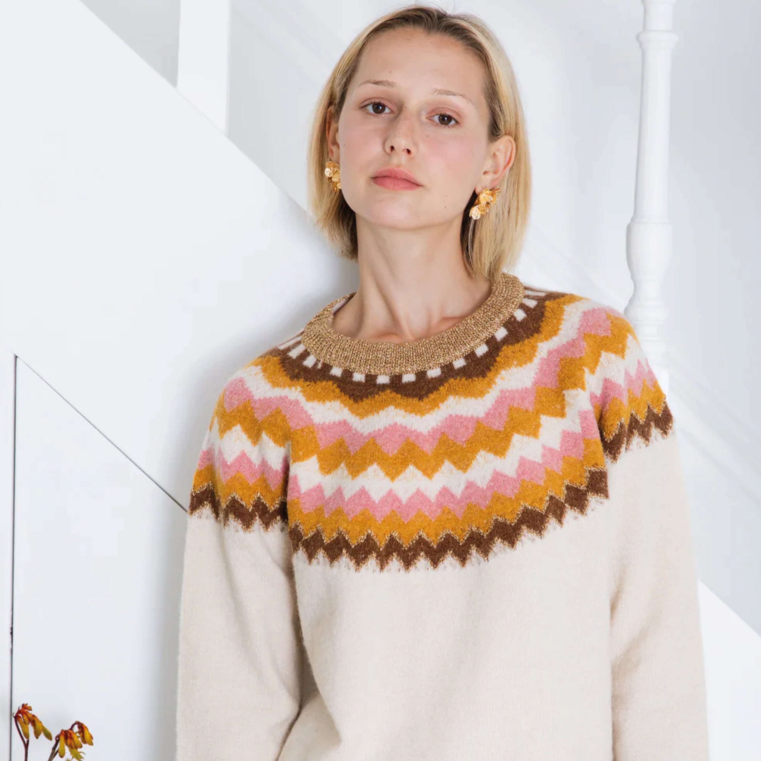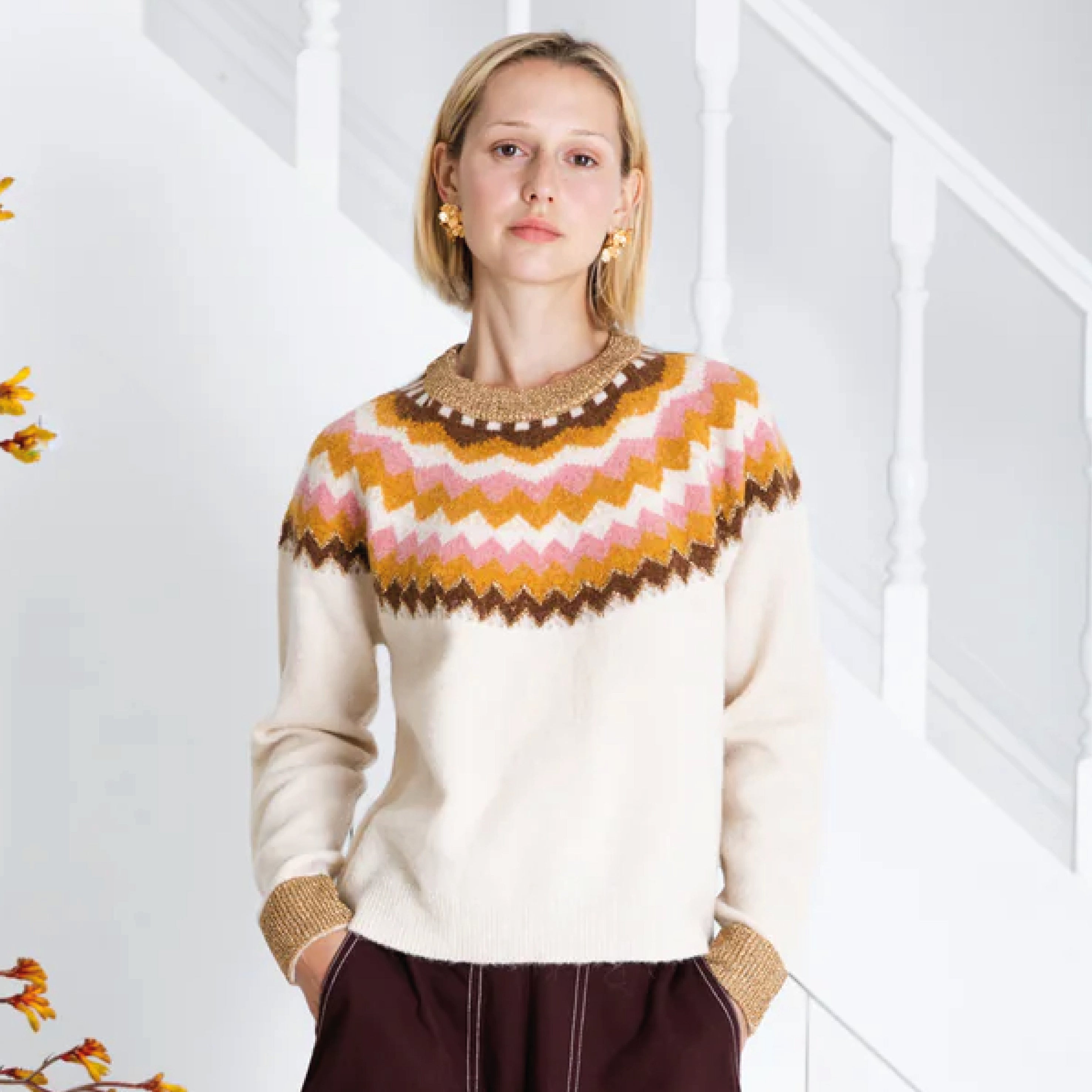 The Bonté Winter White Gigi Jumper is a retro style jumper with a modern, feminine twist. Featuring a striking Fair Isle-inspired yoke in warm shades of rose, caramel and ochre with a chunky gold lurex rib at the neck and cuff. The relaxed silhouette makes it perfect for layering over blouses or styling with casual trousers and jeans.