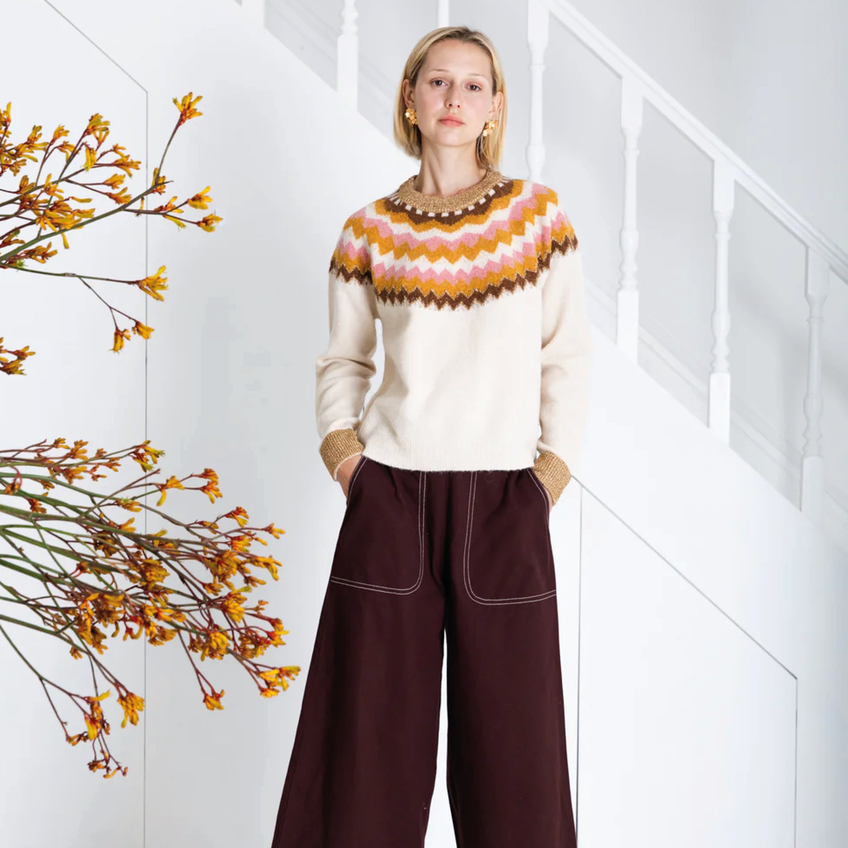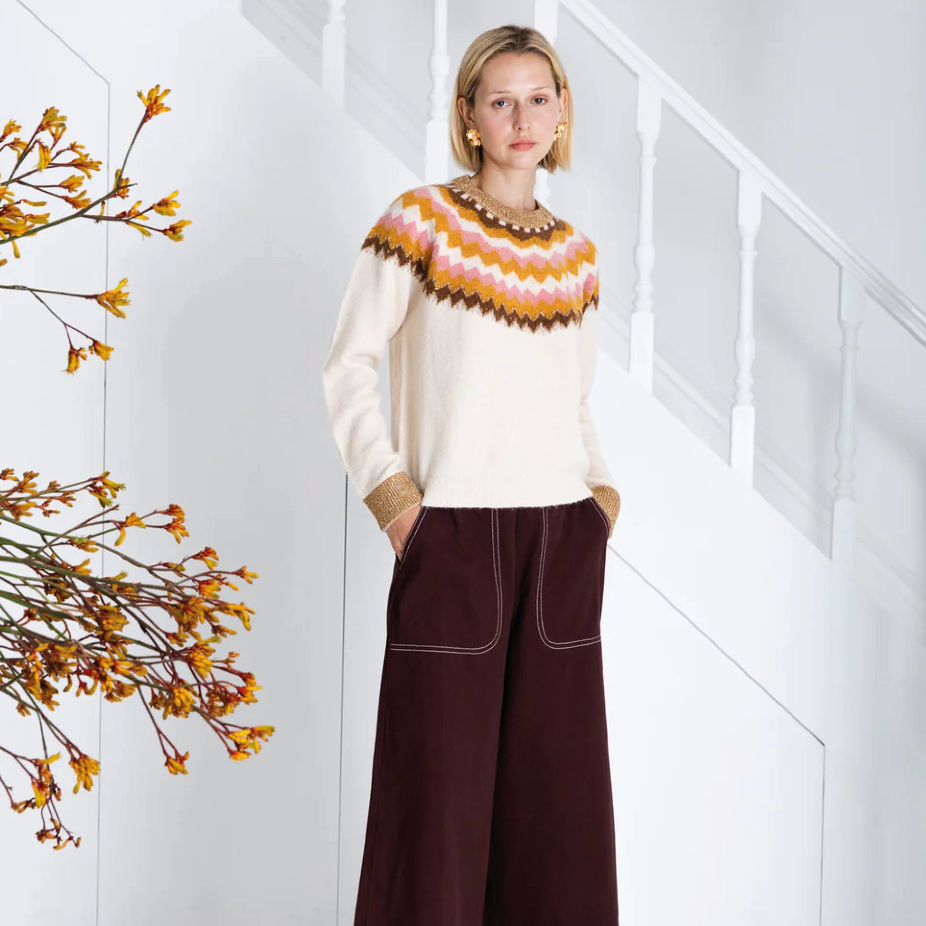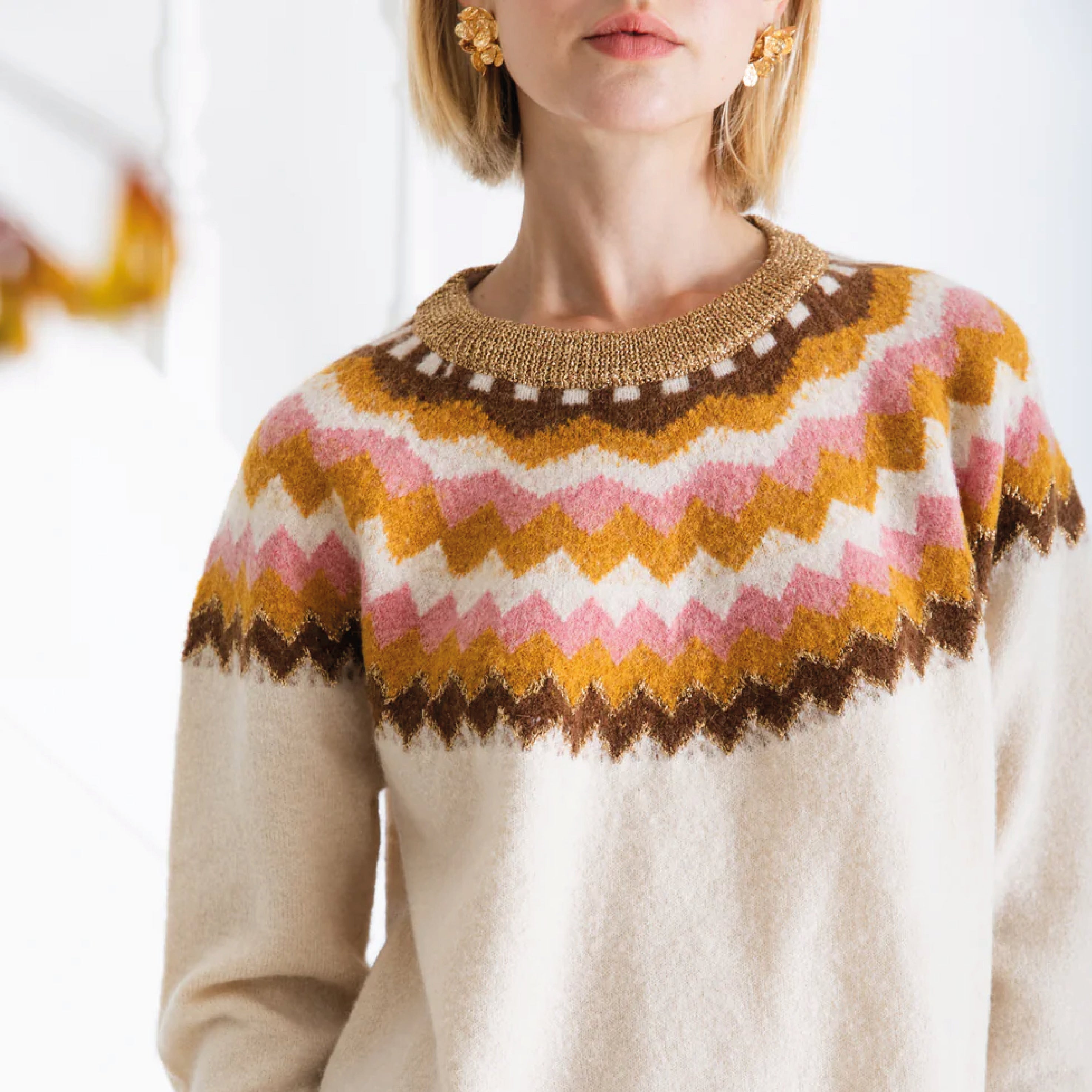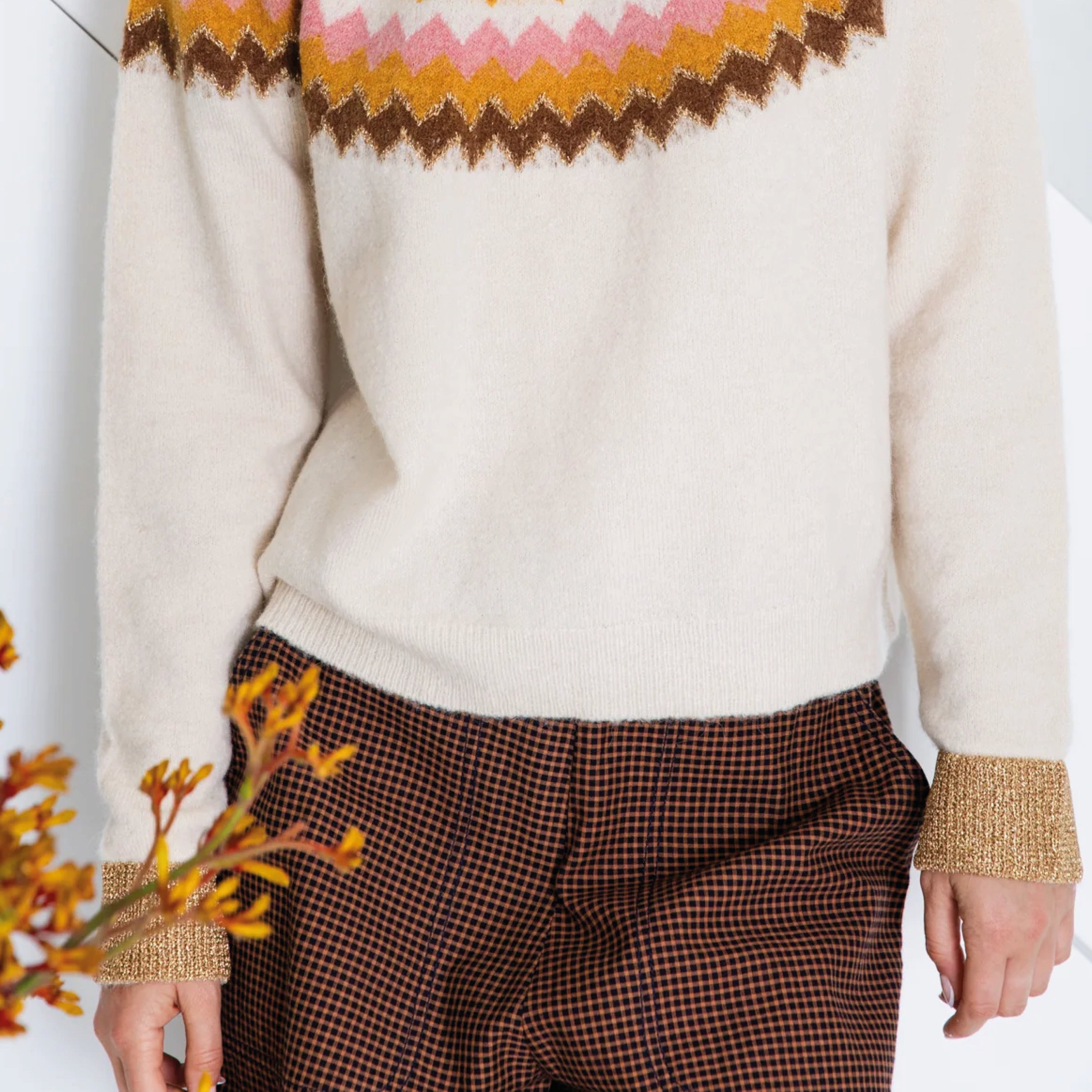 The Bonté Winter White Gigi Jumper is a retro style jumper with a modern, feminine twist. Featuring a striking Fair Isle-inspired yoke in warm shades of rose, caramel and ochre with a chunky gold lurex rib at the neck and cuff. The relaxed silhouette makes it perfect for layering over blouses or styling with casual trousers and jeans.
