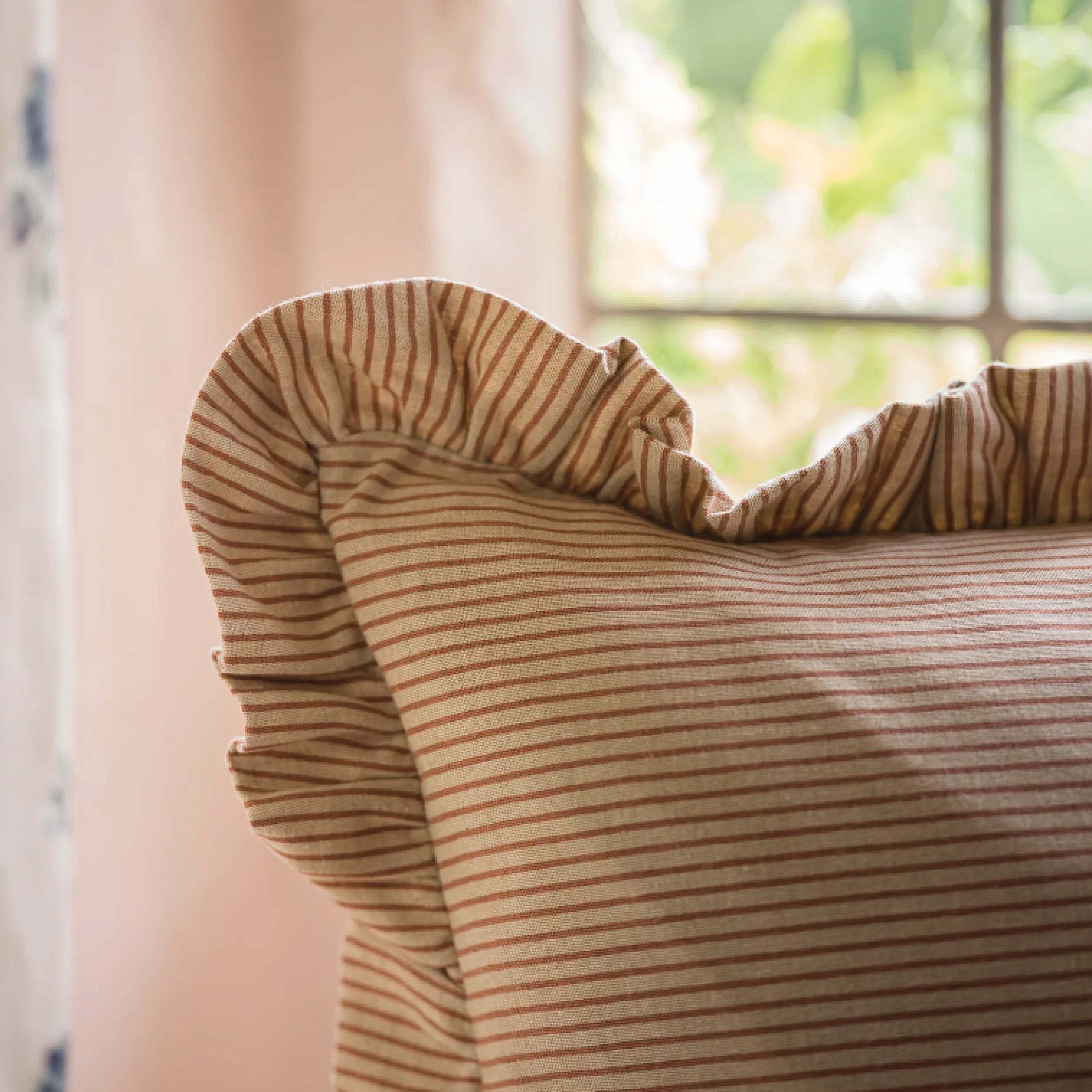 This understated Brick Stripe Frill Cushion is the perfect to layer effortlessly for a curated, collected look. For a more pared-back aesthetic for living or bedrooms, pair with velvet cushions to introduce rich texture and subtle depth of colour.
