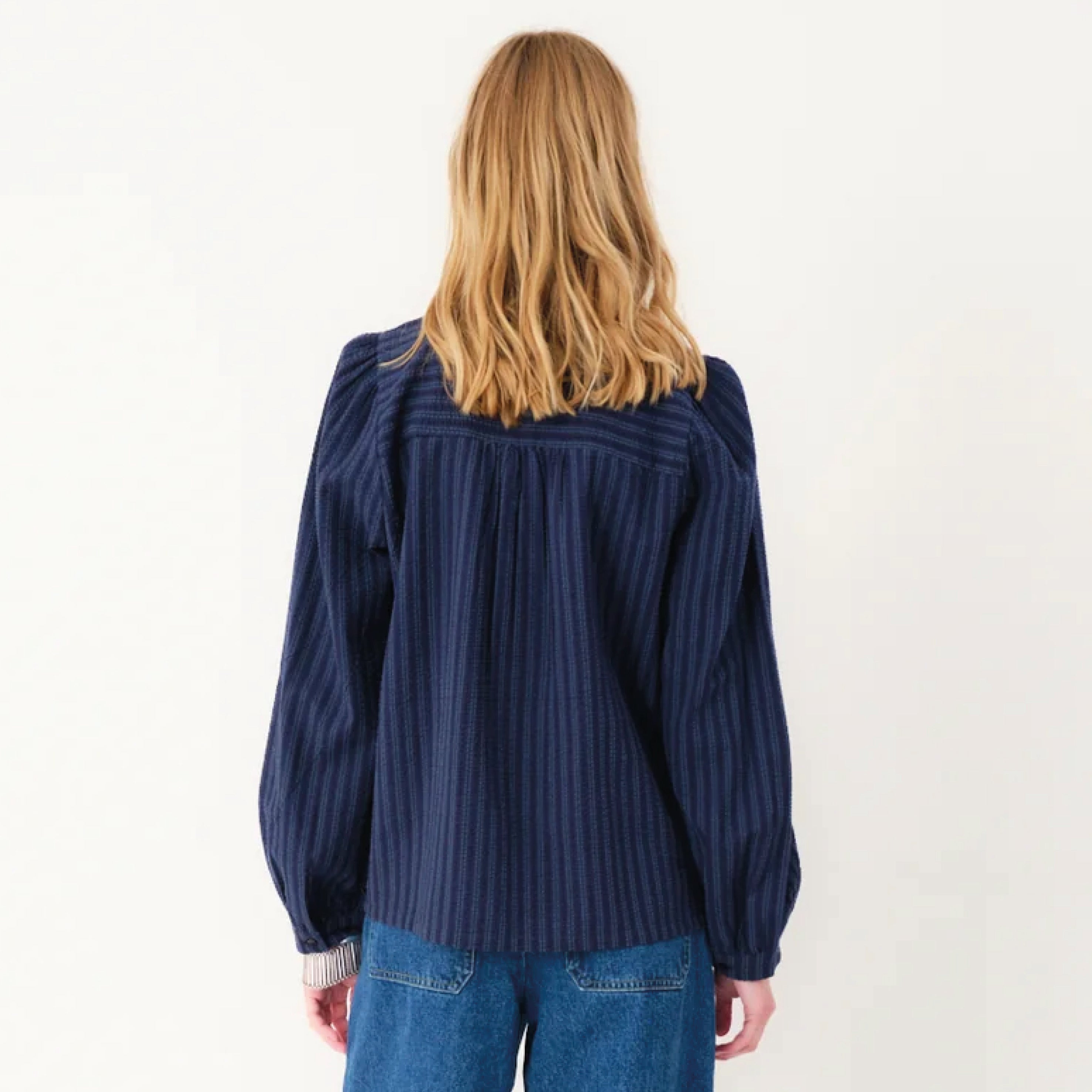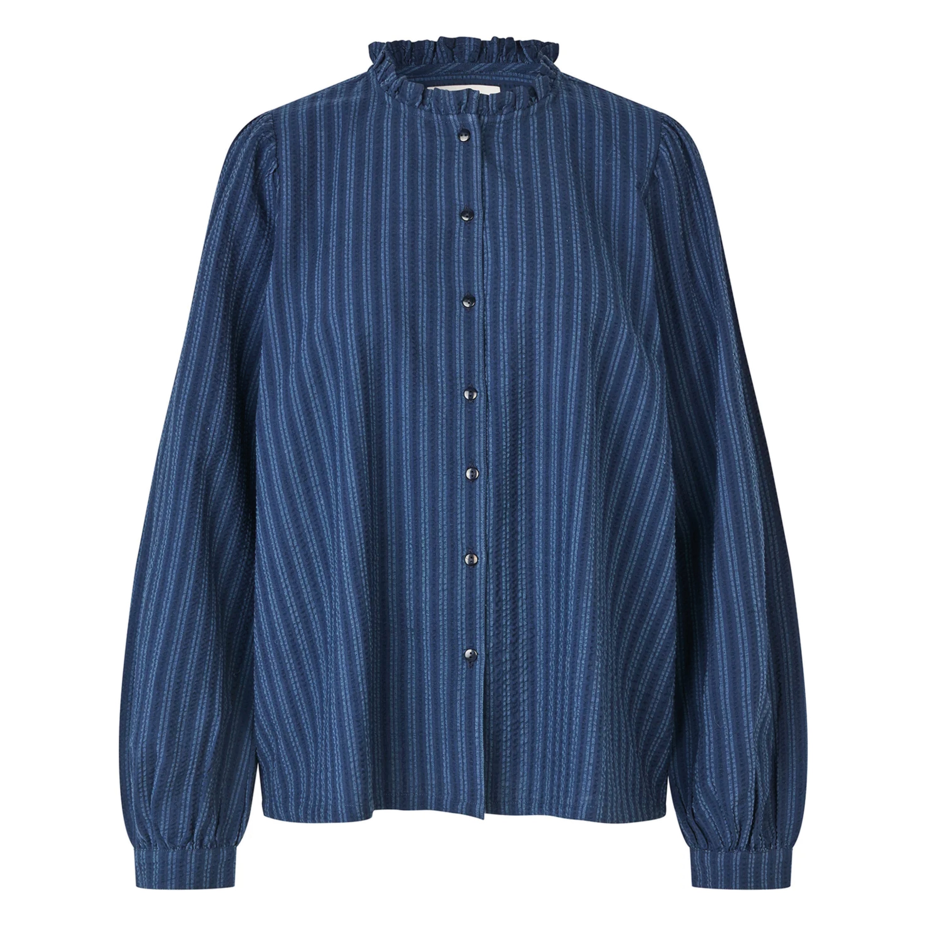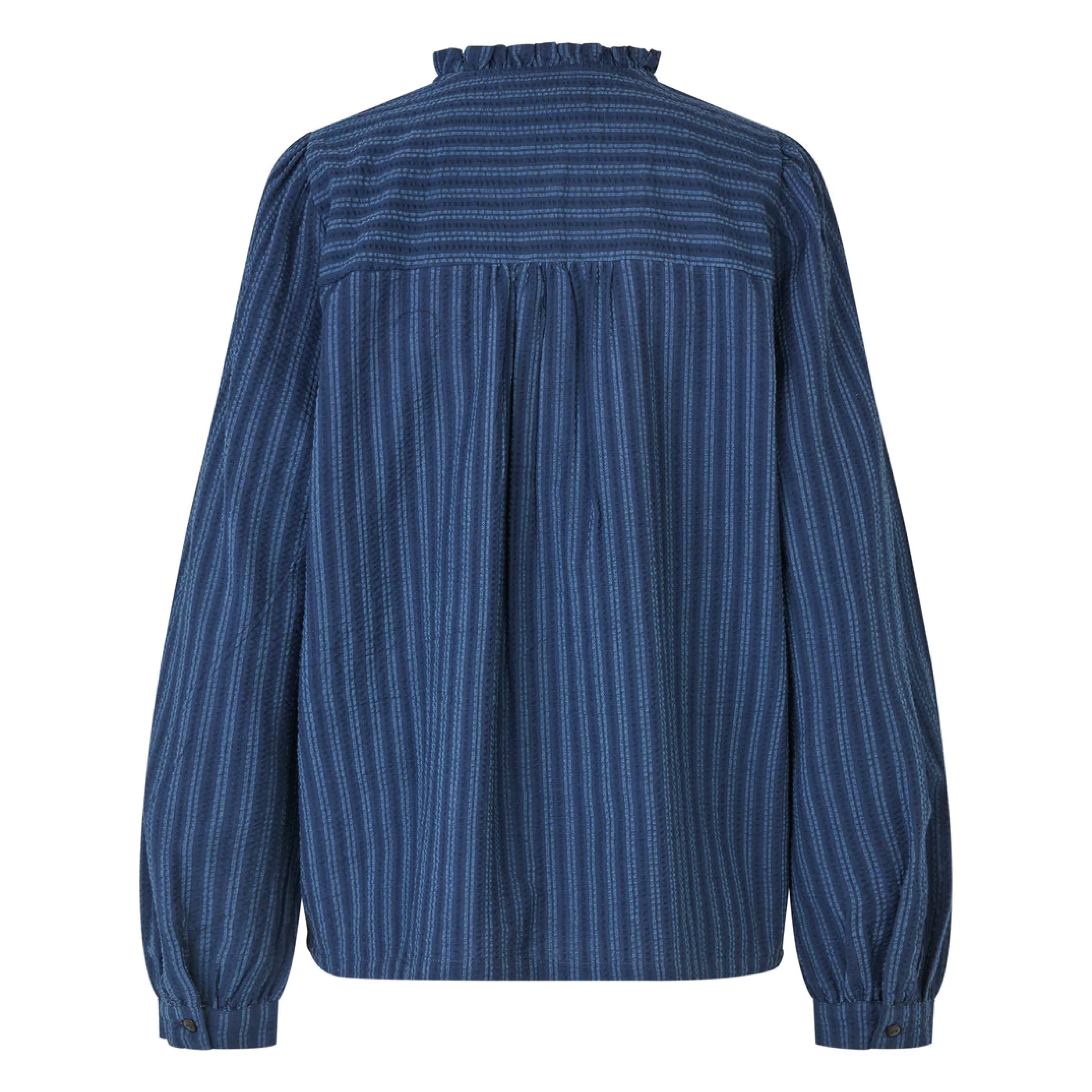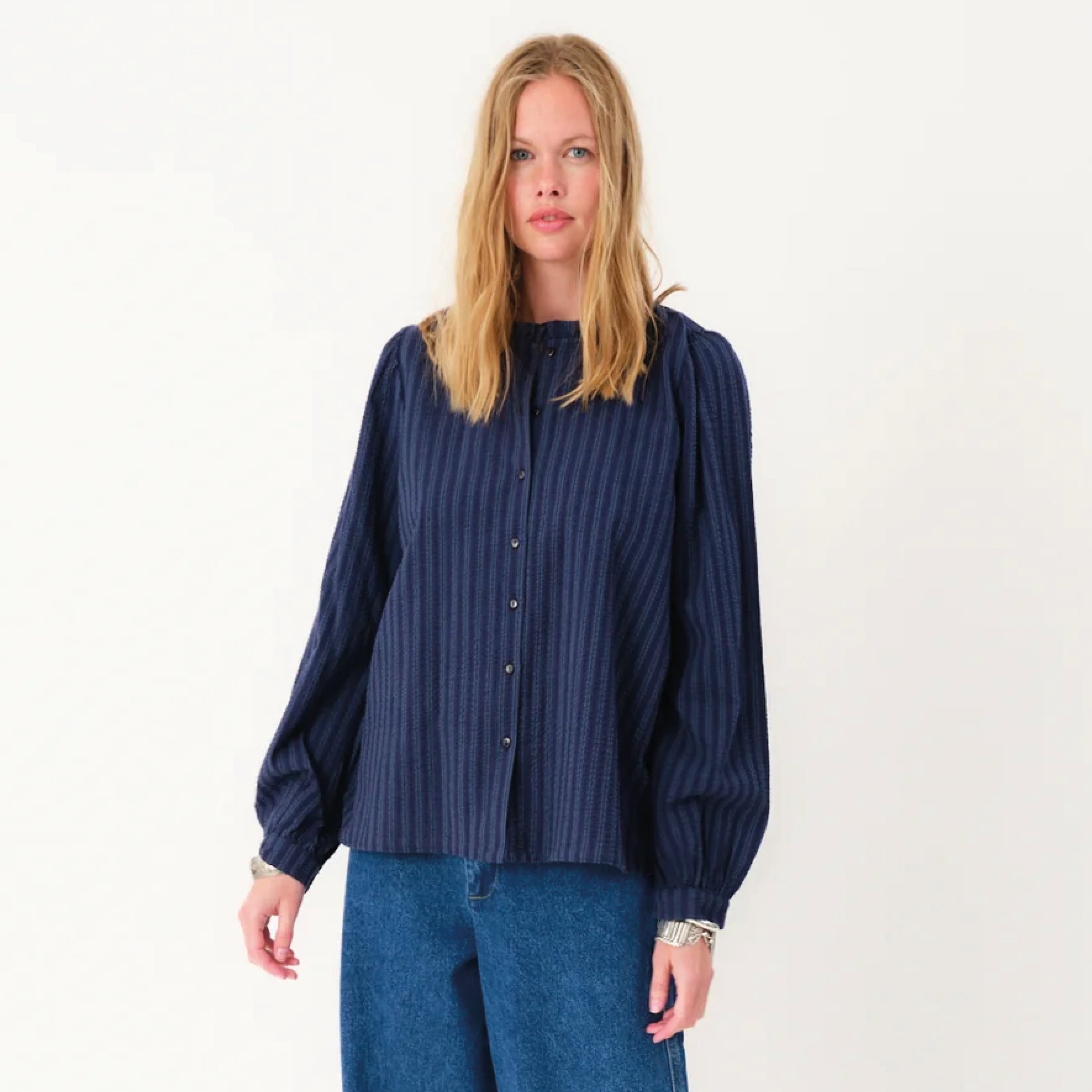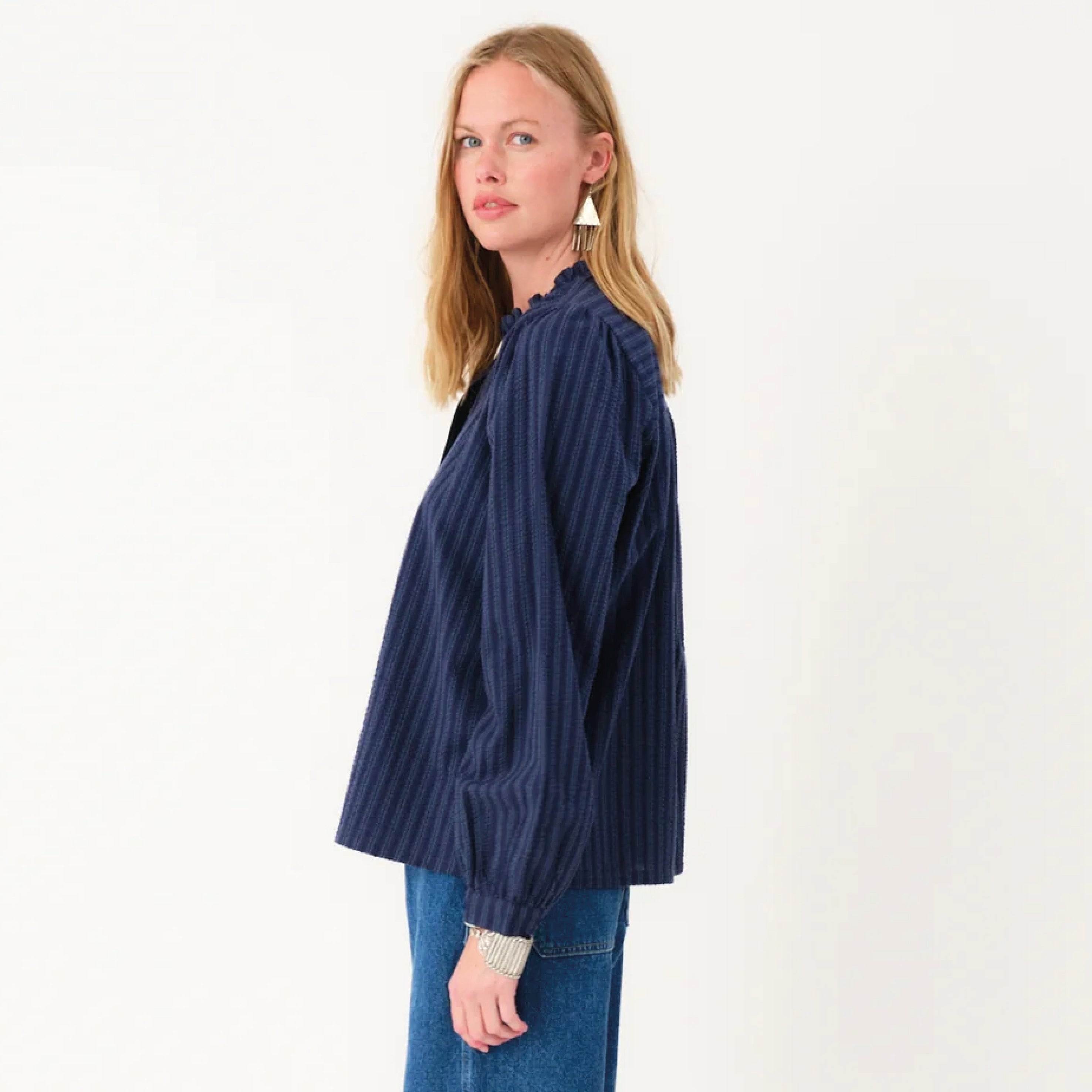 The Lollys Laundry Stripe River Shirt is a classic and feminine piece. It’s made from 100% textured cotton with a slightly waffle-like finish and a woven stripe pattern that adds depth and character. The shirt features a relaxed fit and beautiful details like small pleats on the back and a delicate ruffle collar, making it easy to style for both everyday looks and special occasions.