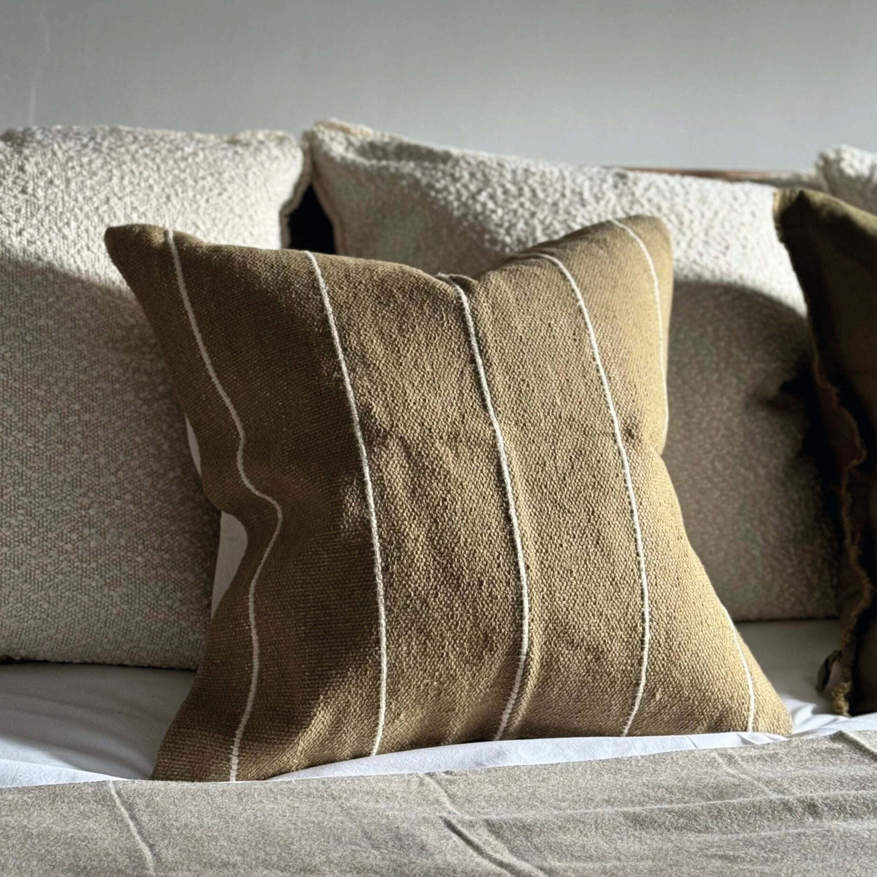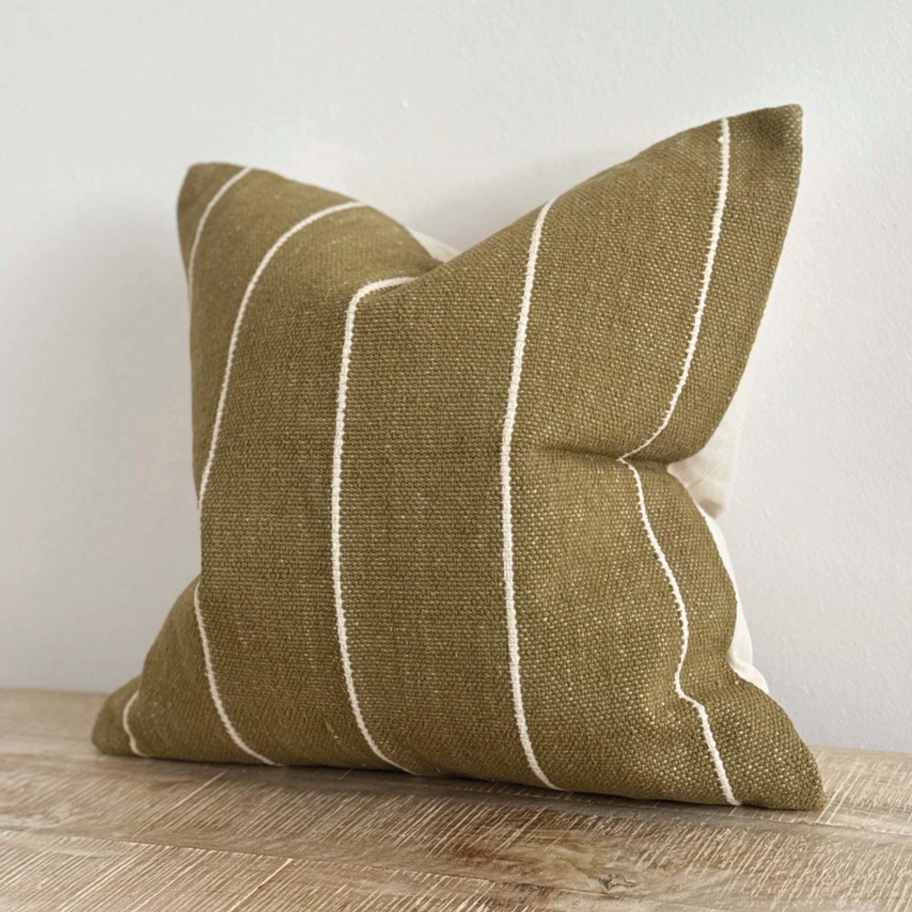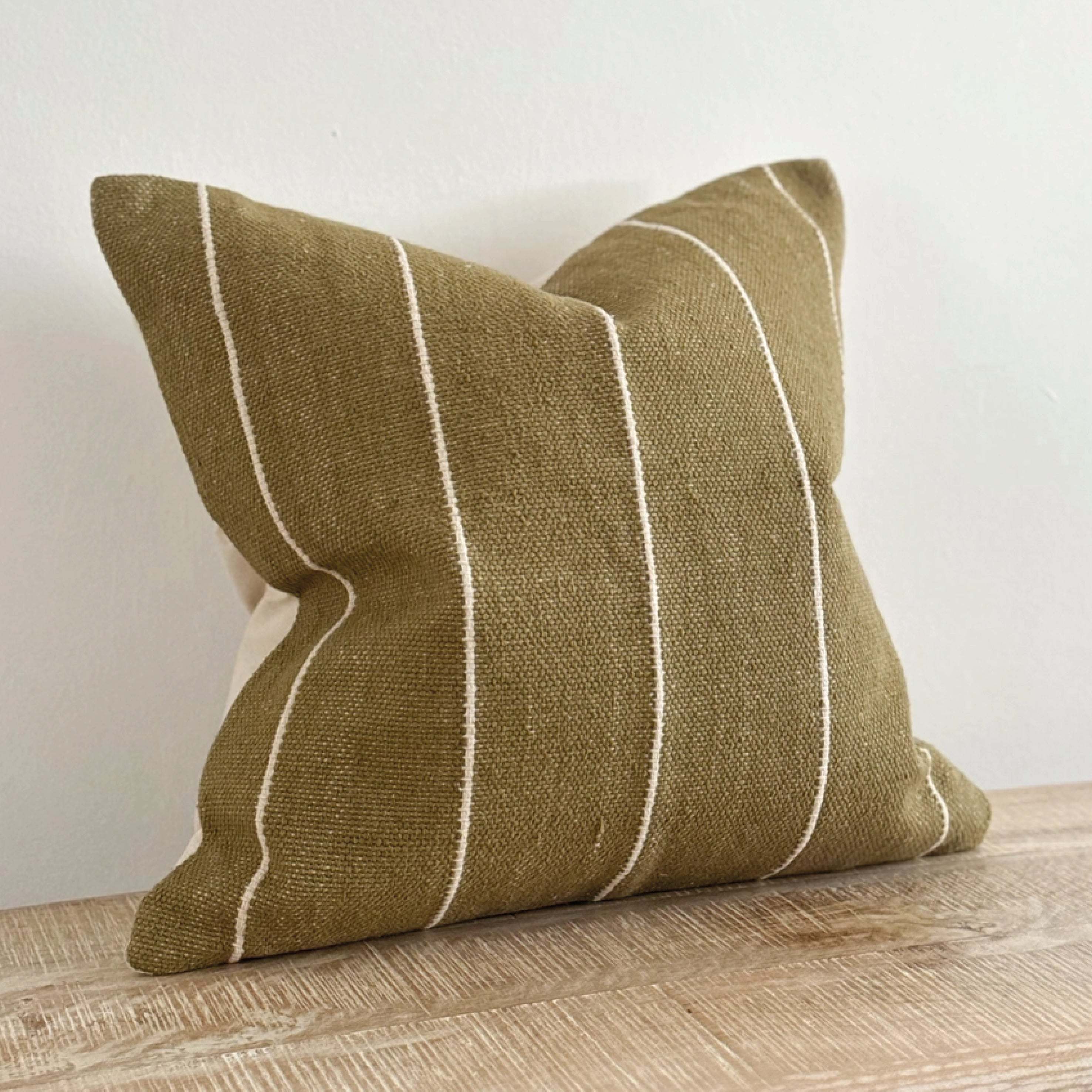 Introducing the Olive Stripe Luxe India Cushion. Handcrafted from high quality cotton, this olive green cushion embodies the perfect balance of durability and softness. Ensuring a luxurious tactile experience with every touch. The soothing olive green hue of the fabric serves as a canvas for this rustic cushion.