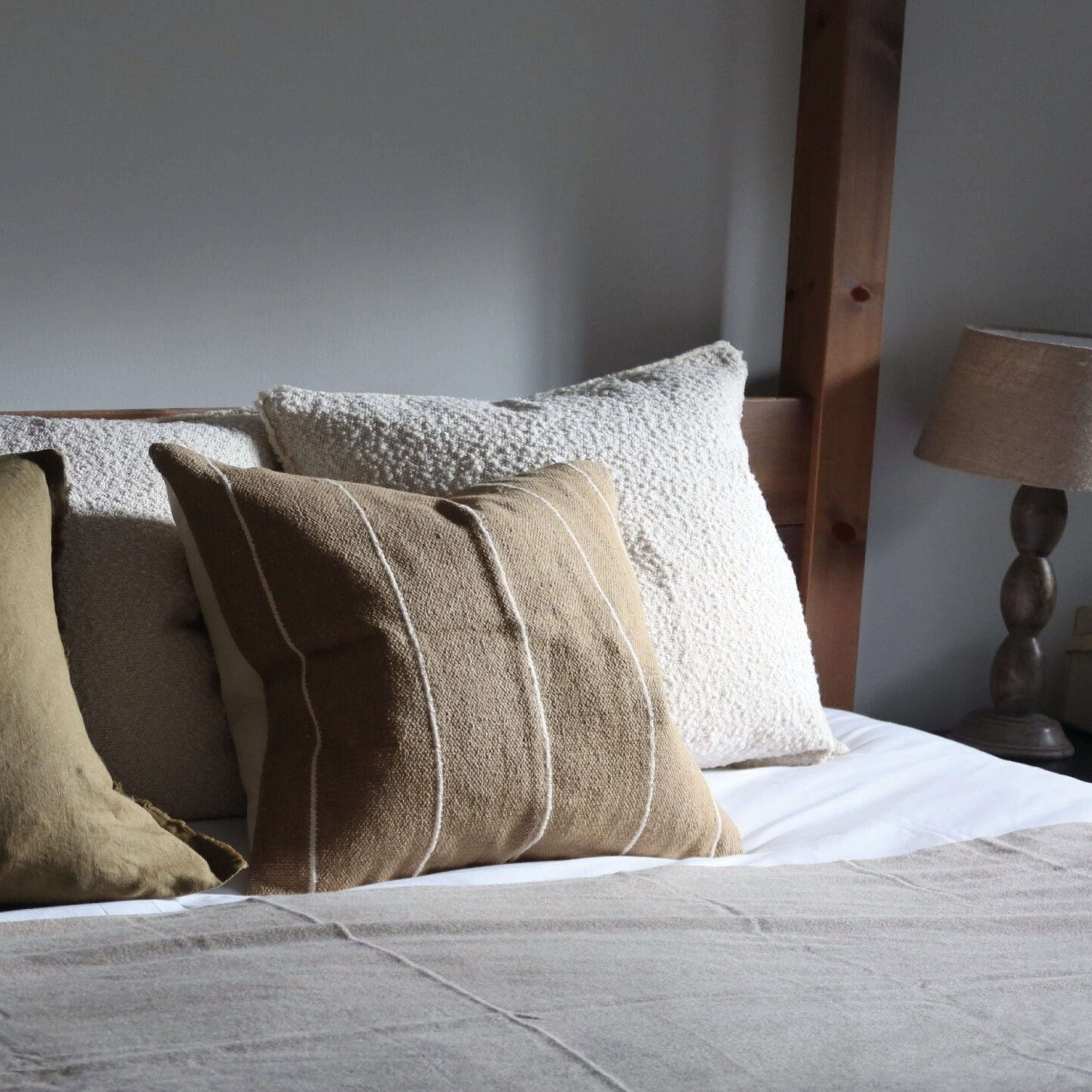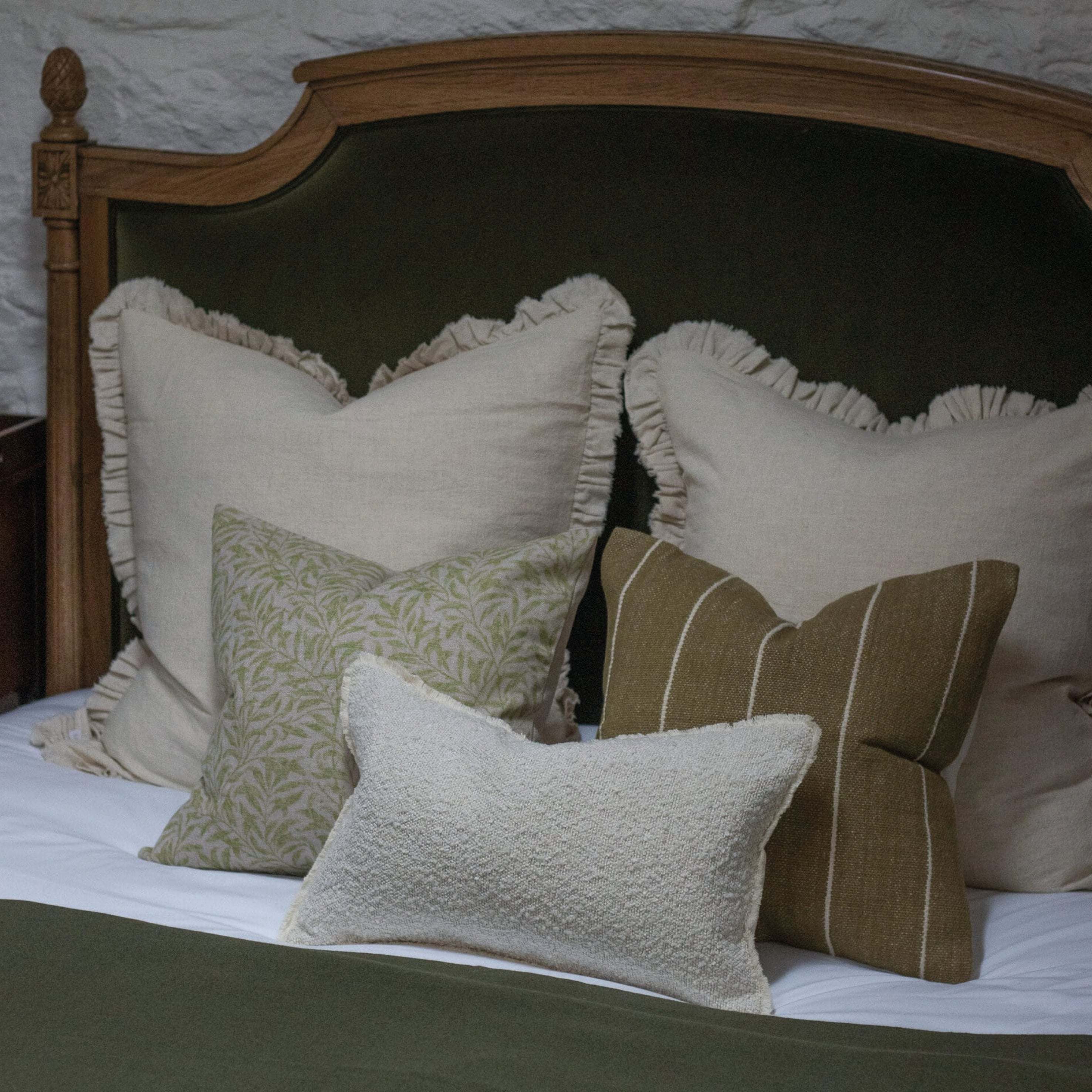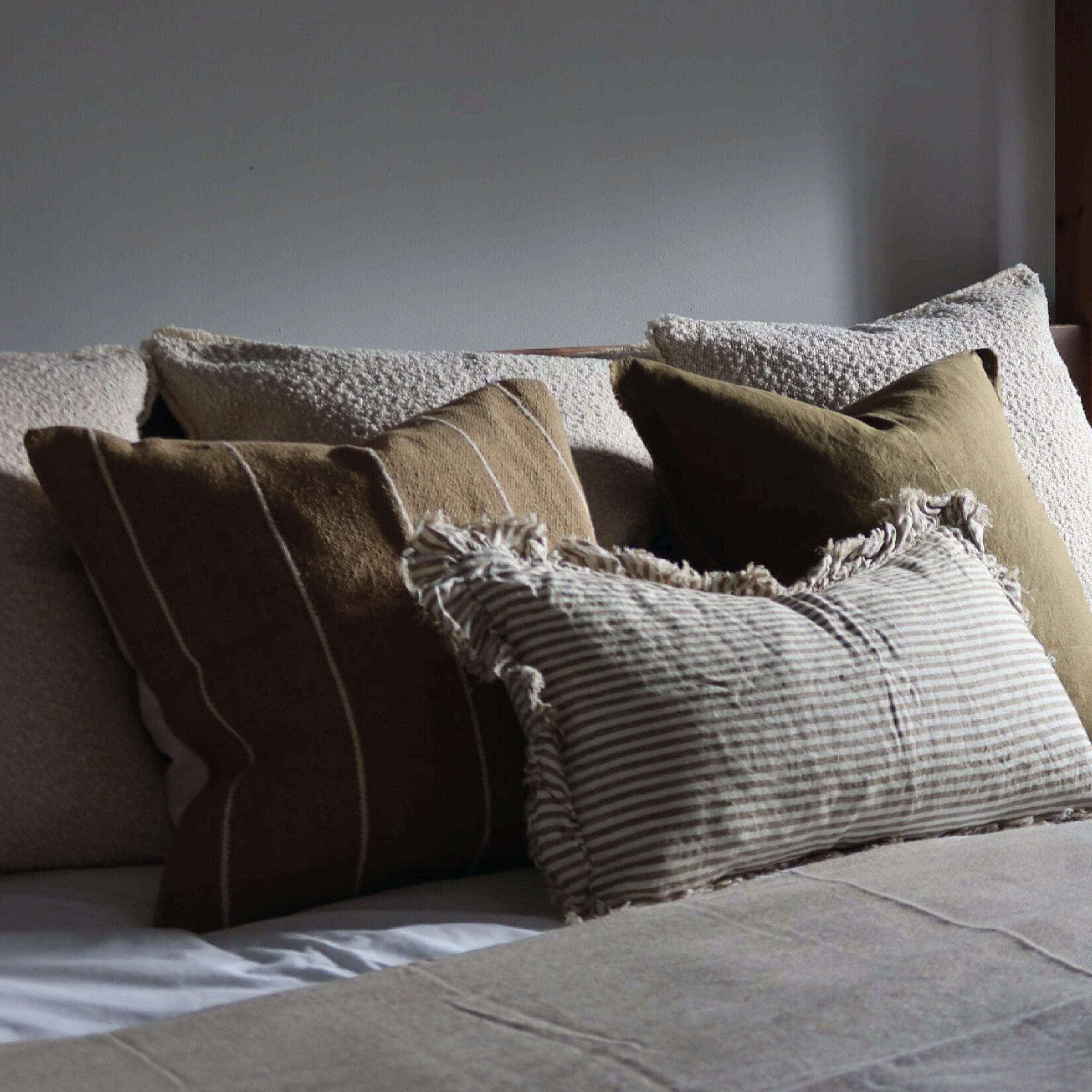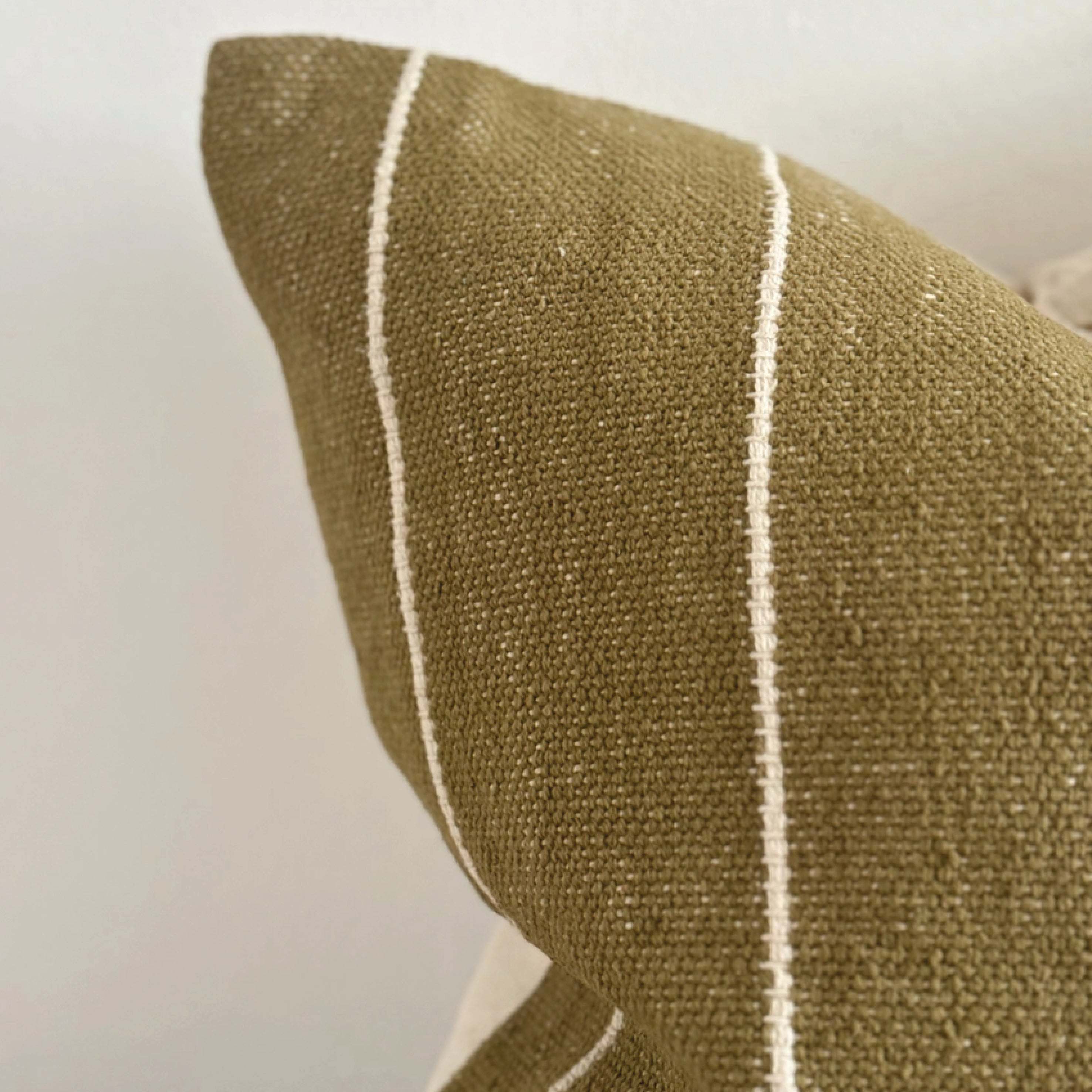 Introducing the Olive Stripe Luxe India Cushion. Handcrafted from high quality cotton, this olive green cushion embodies the perfect balance of durability and softness. Ensuring a luxurious tactile experience with every touch. The soothing olive green hue of the fabric serves as a canvas for this rustic cushion.