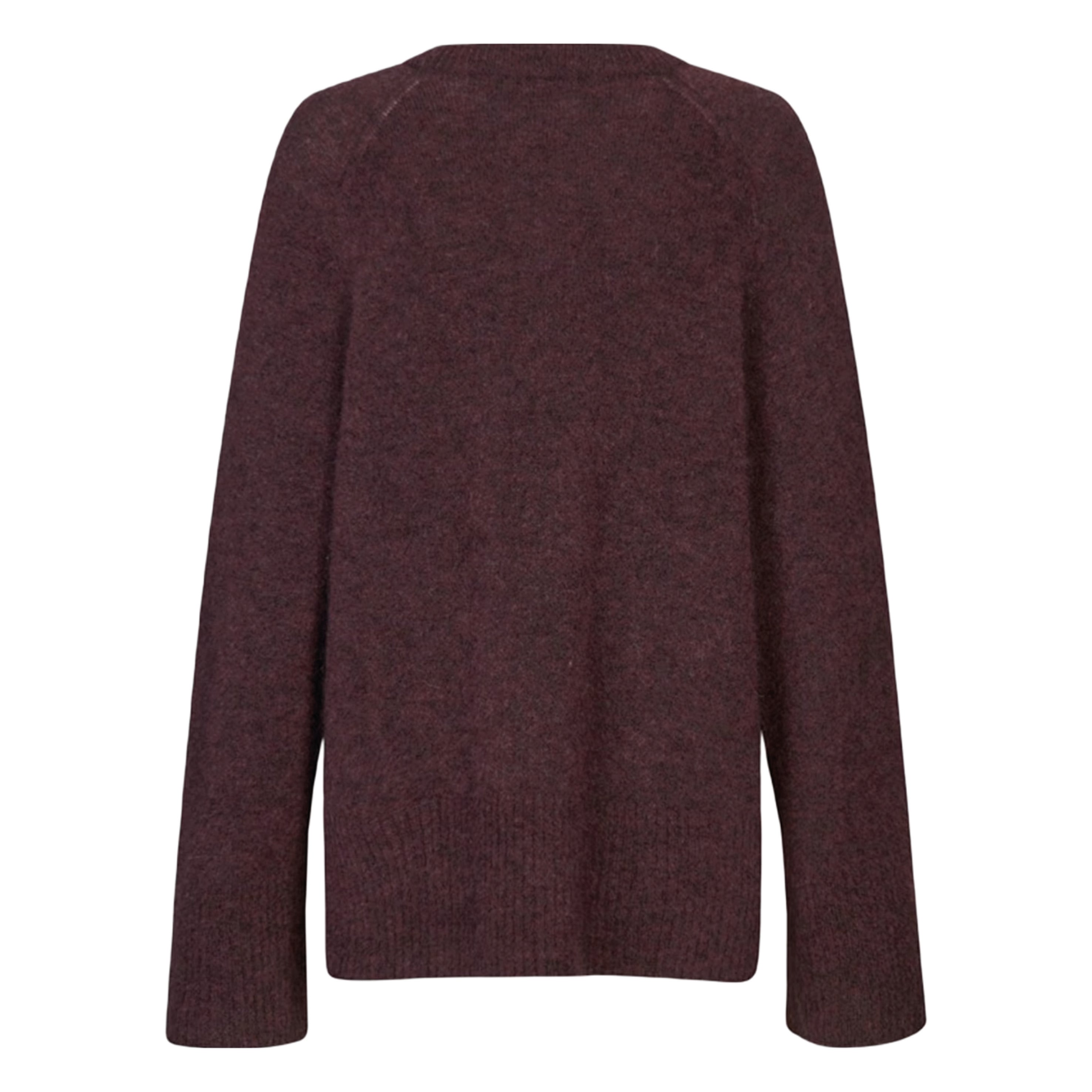 The Second Female Sassafras Raglan Brookline Knit is made in a soft mohair-wool blend with fluffy texture. Featuring a round neckline and raglan sleeves. Wide sleeves and cuffs. Ribbed neck, cuffs and bottom hem. Slits at sides. Oversized, slouchy fit.