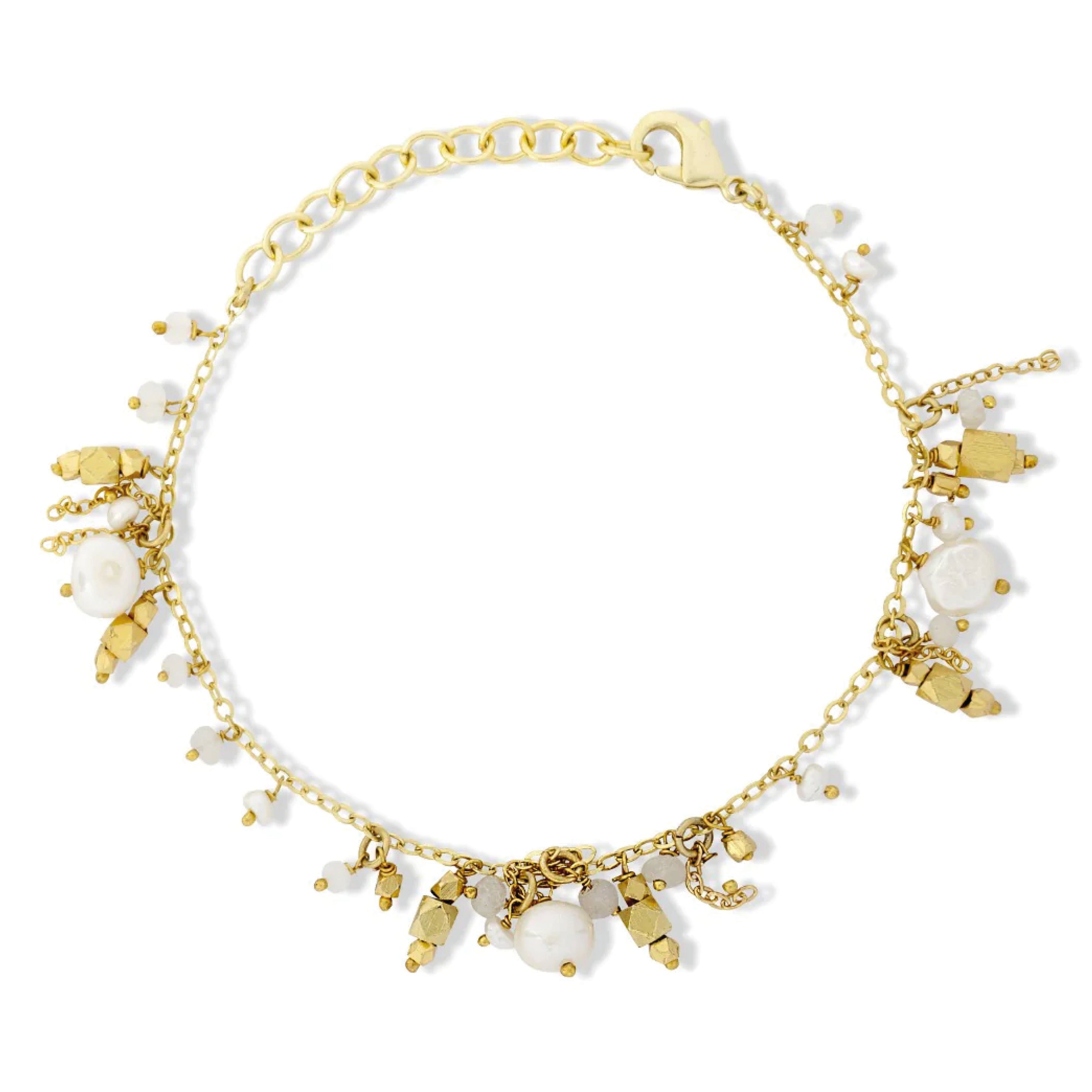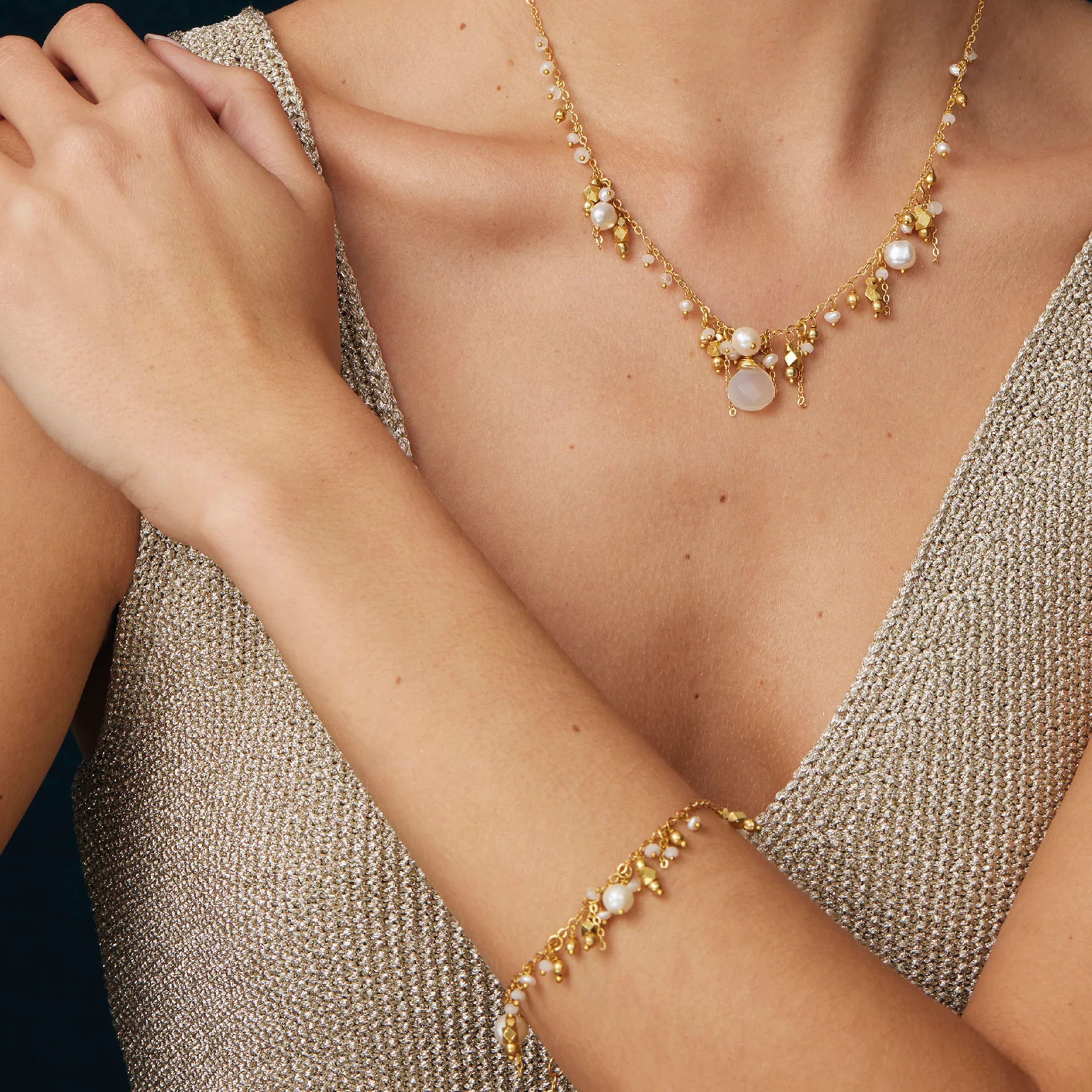 The Ashiana London Olive White Bracelet features delicate gemstones and faceted gold beads along a delicate chain. An elegant and sophisticated piece, the delicate gemstone hues are true classics and will make a unique piece in your jewellery box for years to come.