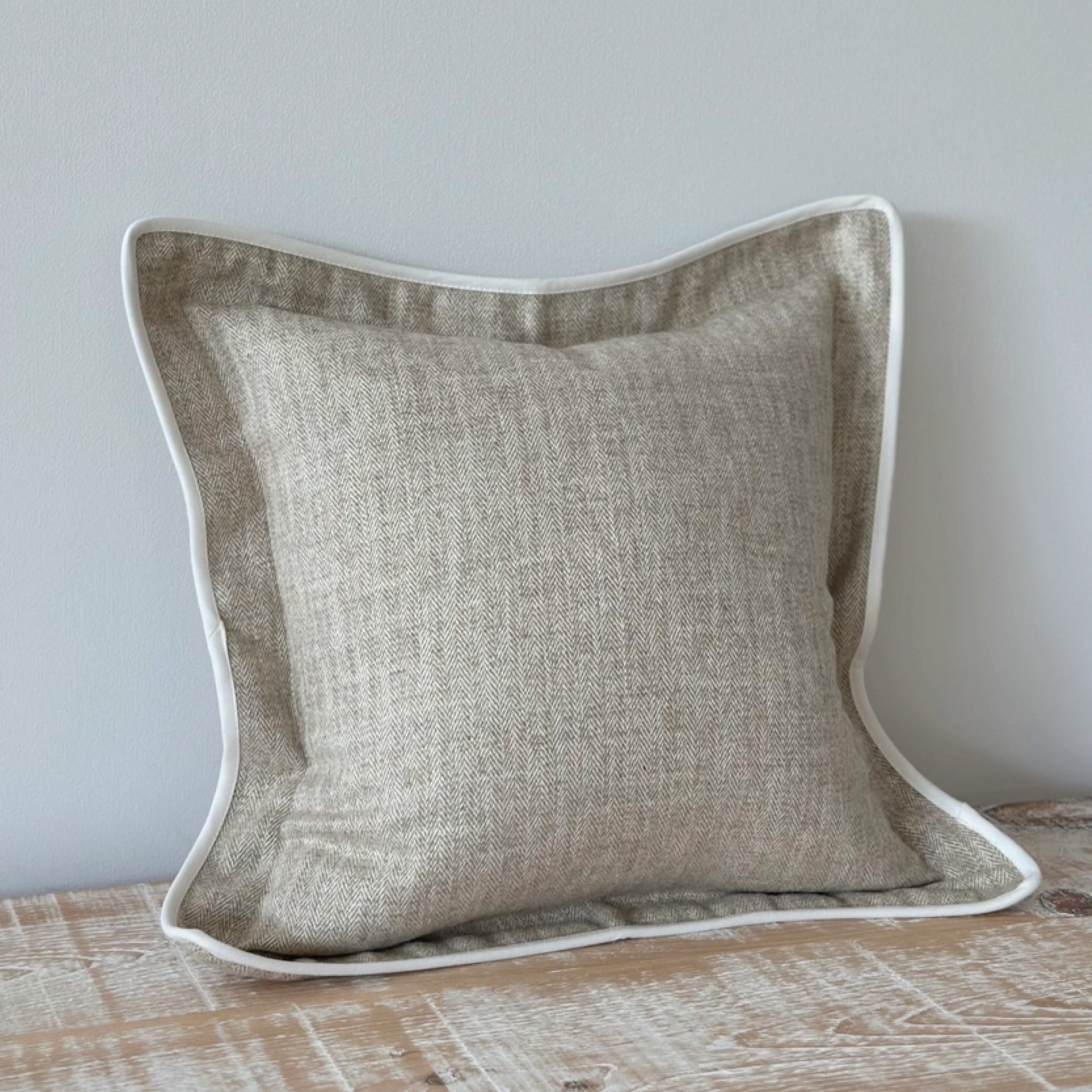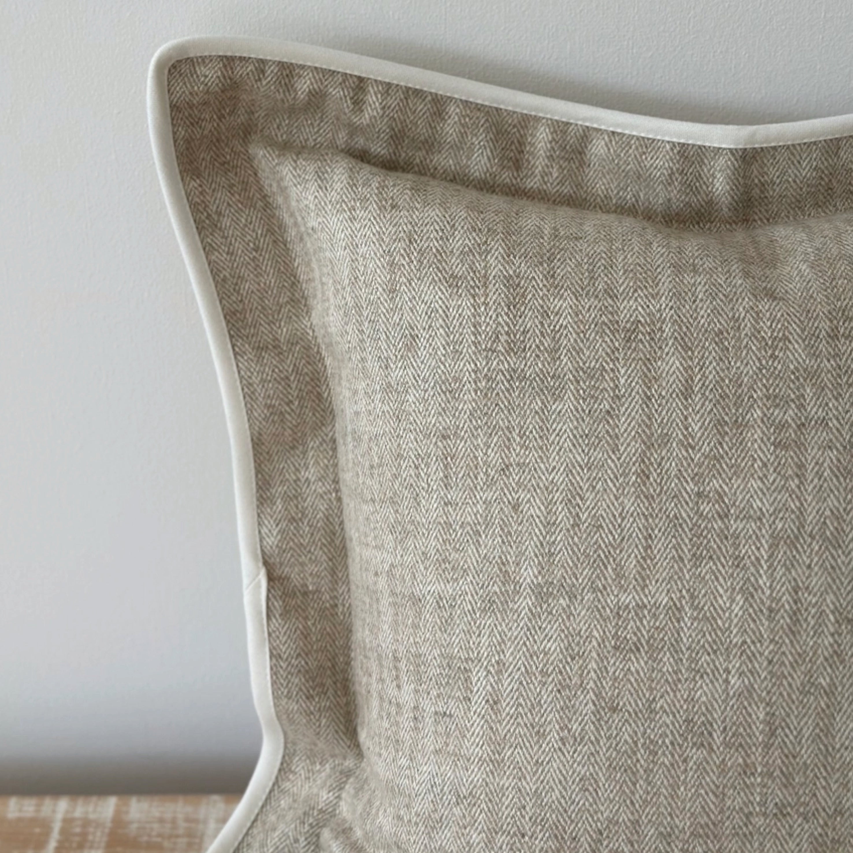 Elevate your home decor with this Beige Herringbone Tia Cushion, carefully crafted with a flanged edge detail and herringbone design. Embrace the timeless allure of its design, boasting captivating herringbone in a harmonious blend of beige and cream hues. Pair it with neutral tones for a serene ambiance, or mix and match with bold patterns for a playful twist.