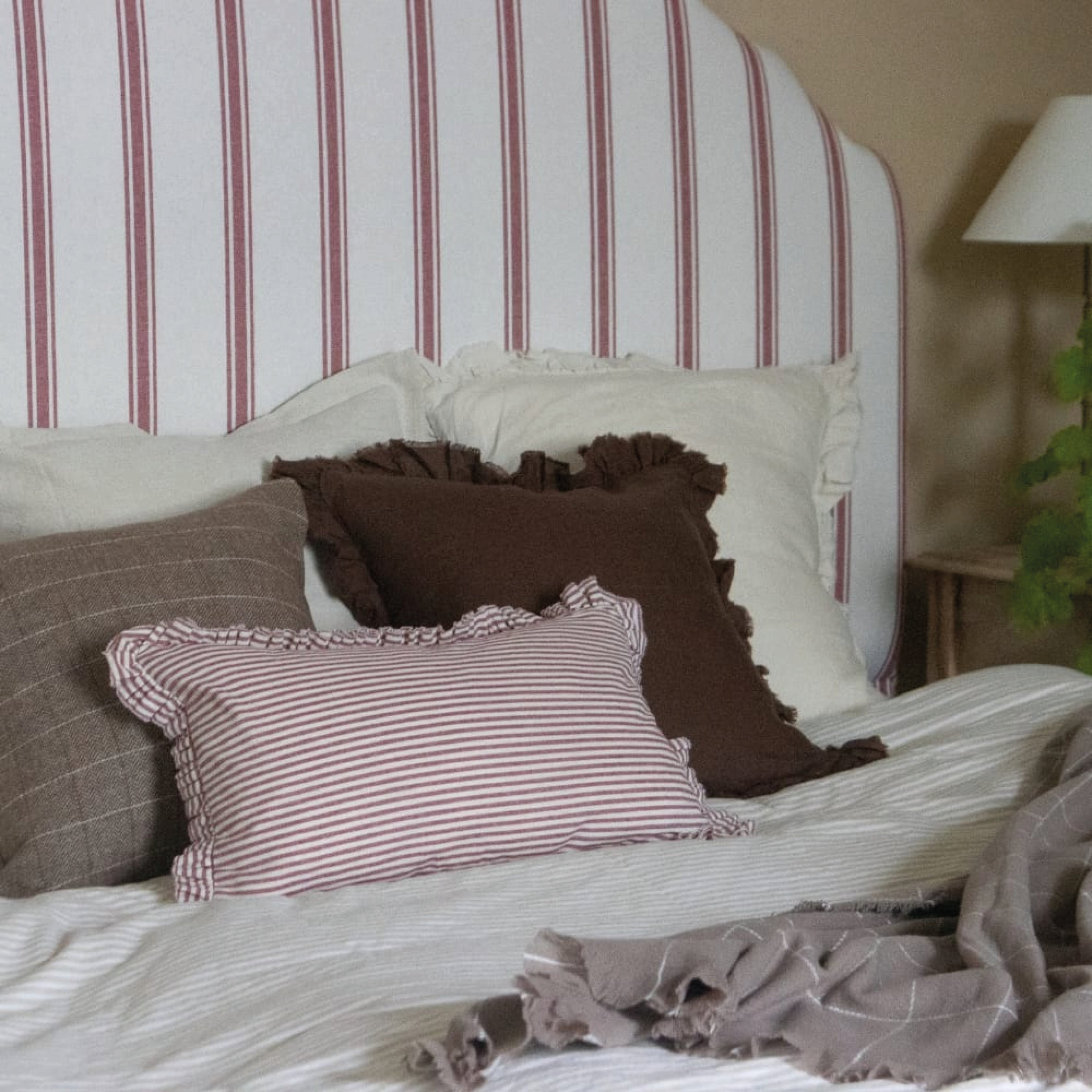 Introducing the Burgundy Stripe Ruffle Darcy Cushion. This charming rectangle cushion features a stylish stripe design and a ruffle edge detail.