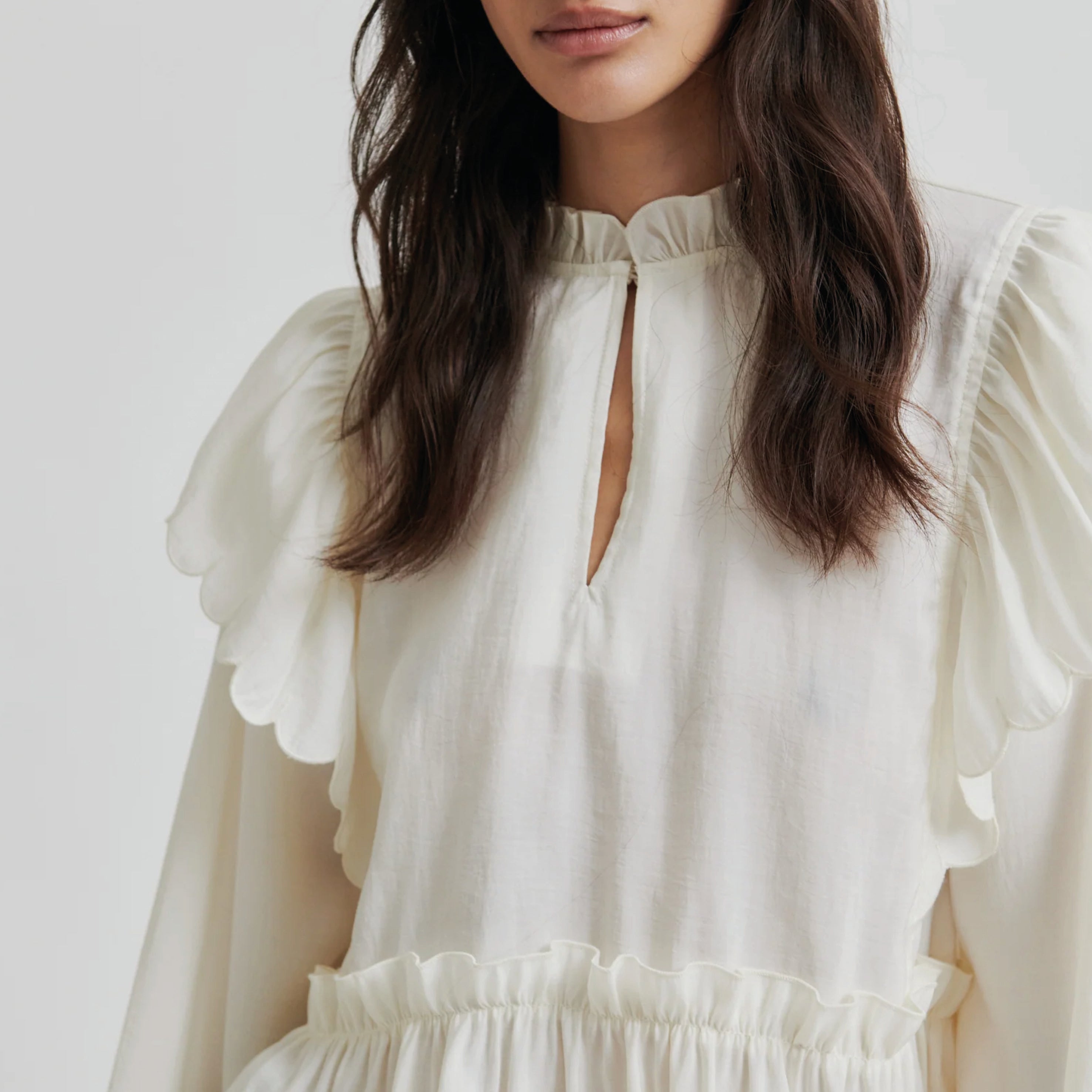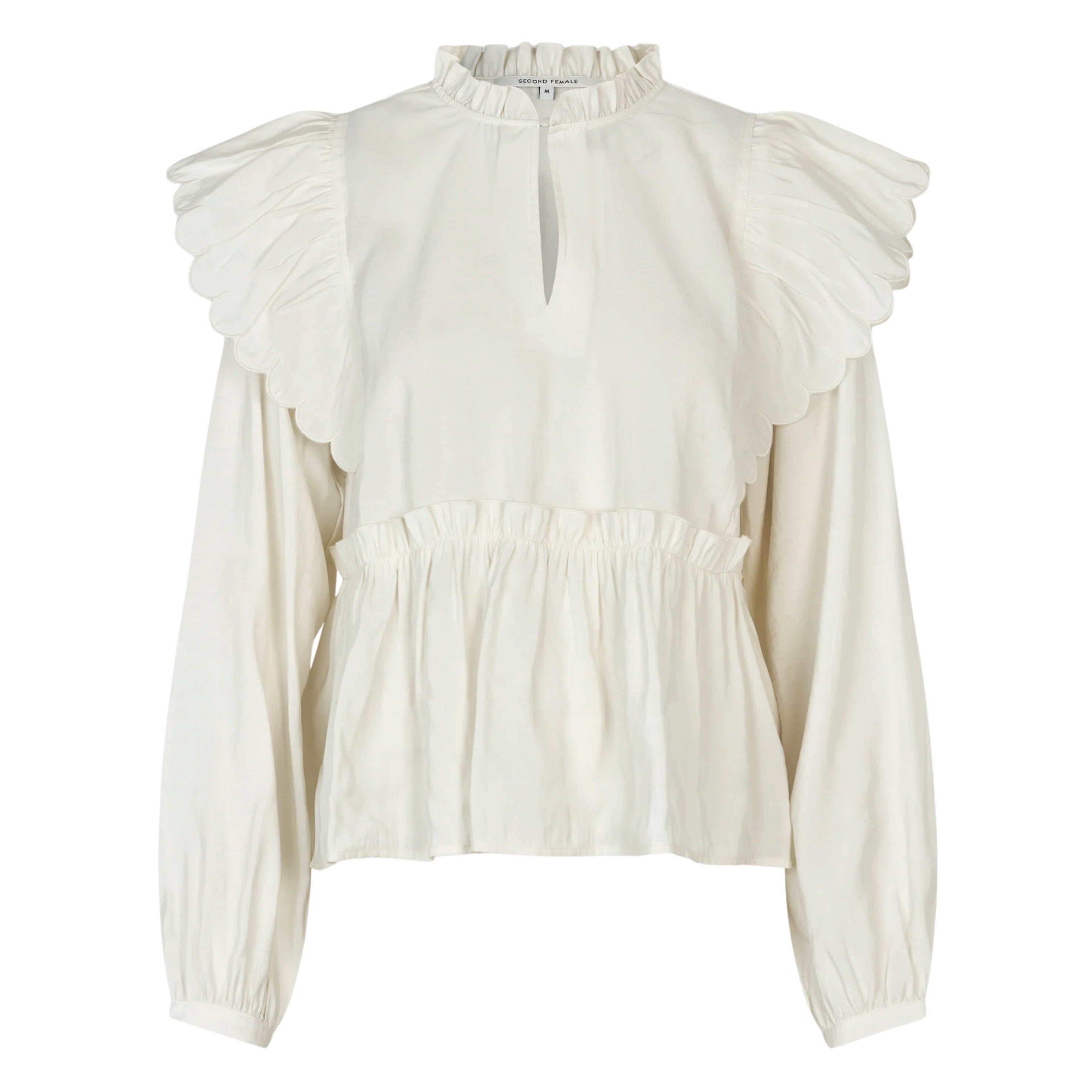 The Second Female Tofu Terra Frill Blouse is made in a soft, drapy modal blend. Featuring a round neck with frill trim and keyhole opening with button fastening. Overlapping frill detail at shoulders and long sleeves with buttoned cuffs. Frilled bottom hem. Relaxed, airy fit.