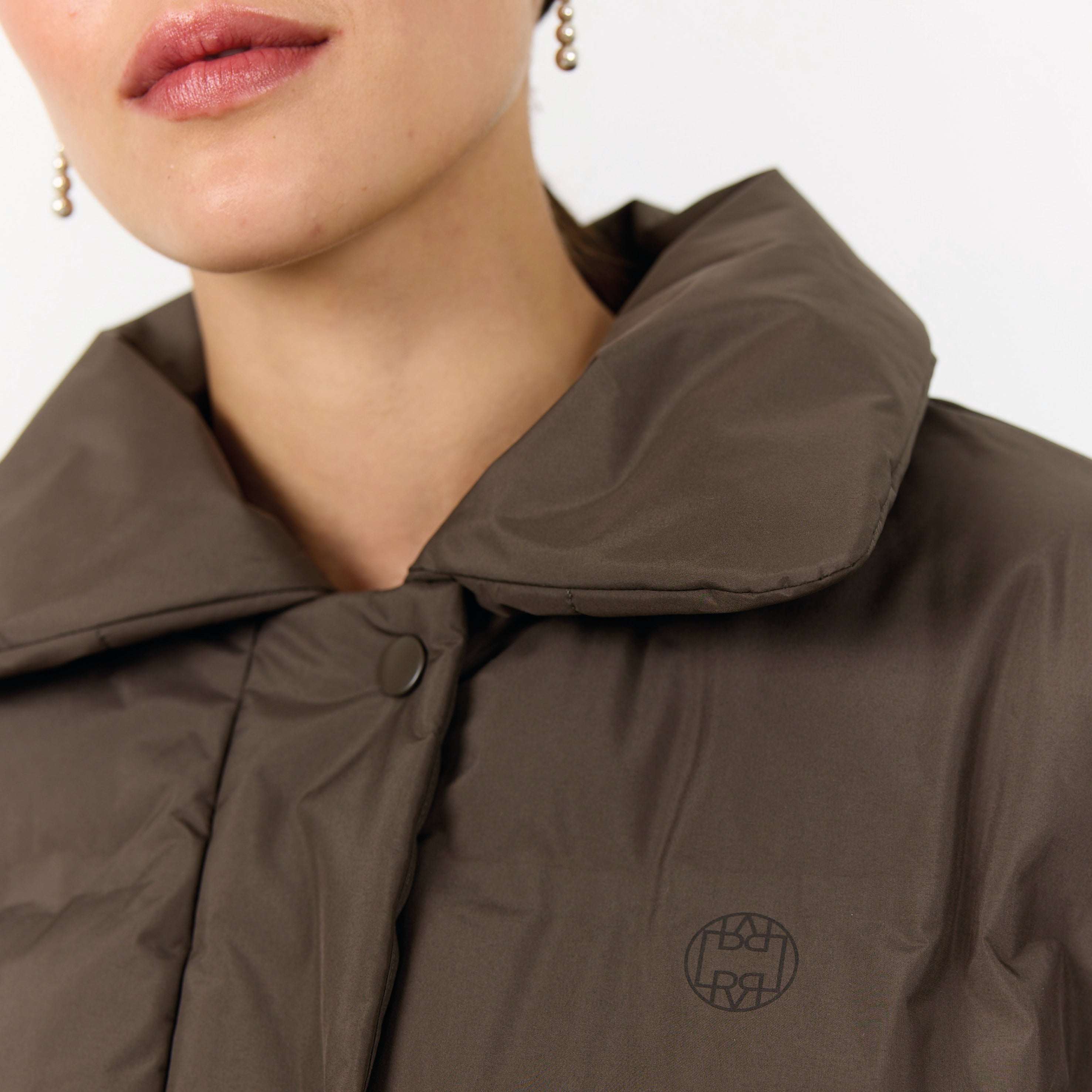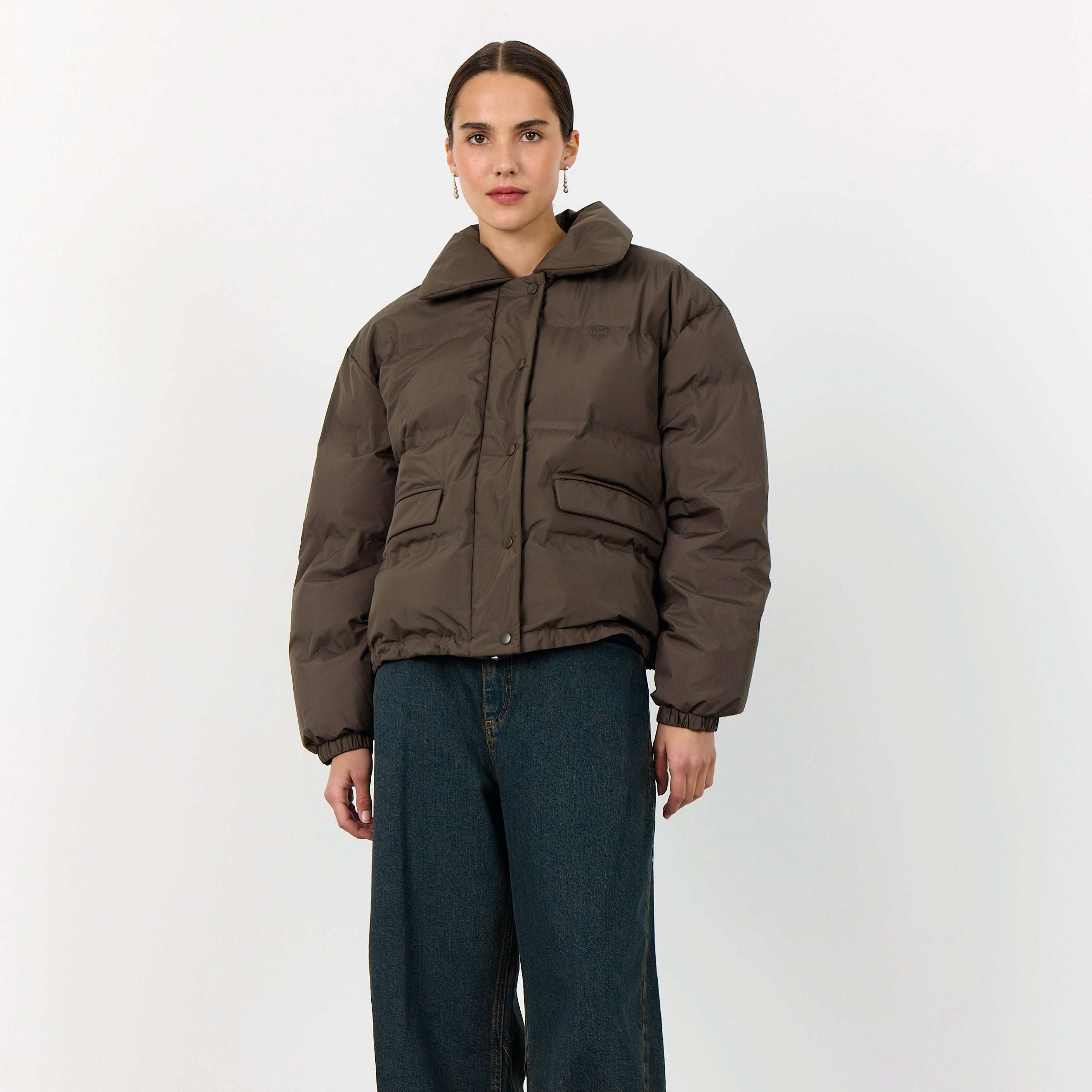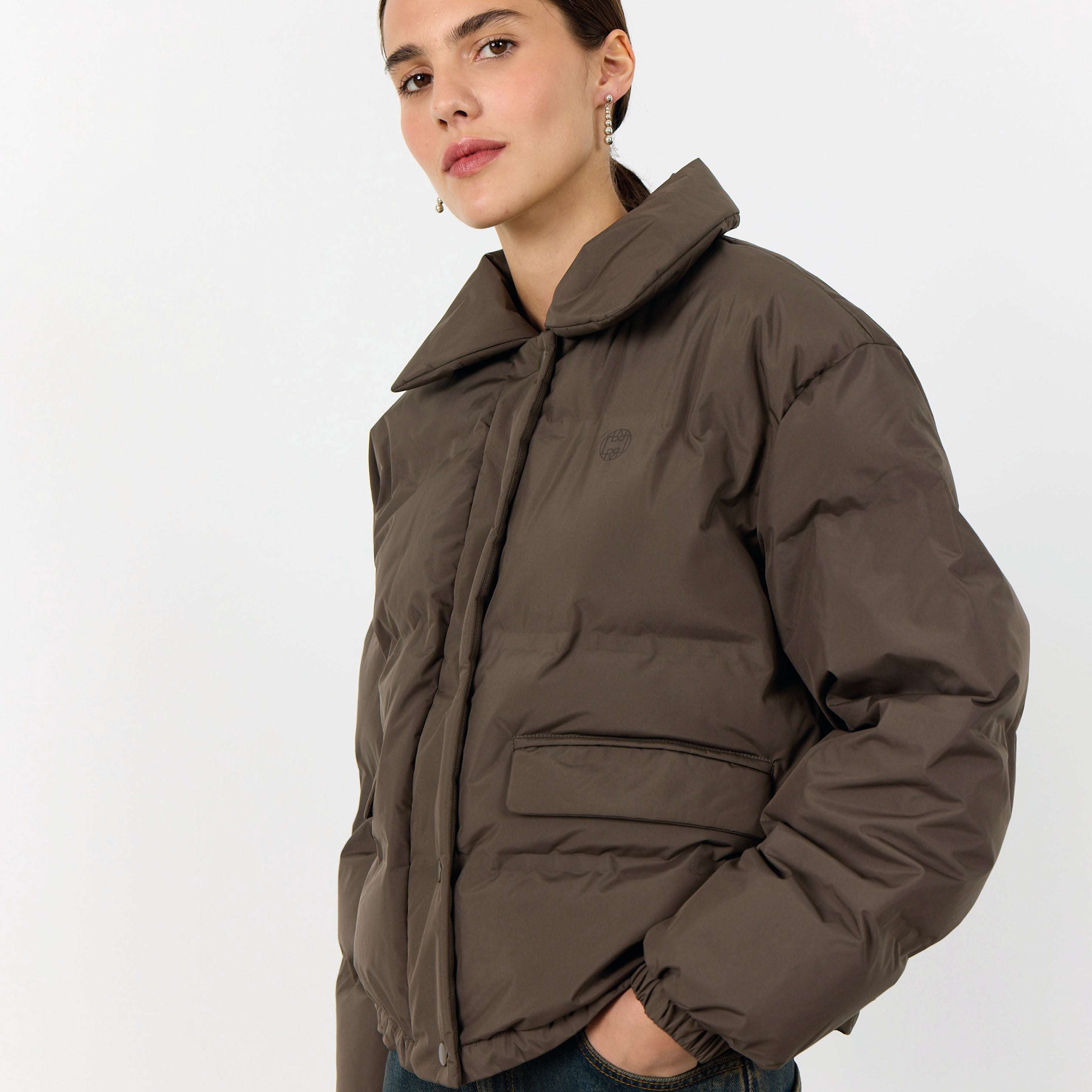 The Leveté Room Coffee Mona Coat features a high, wide collar, front button closure, puffy design with spacious pockets, and adjustable drawstrings at the hem. Pair it with jeans or tailored trousers for a relaxed or refined look.
