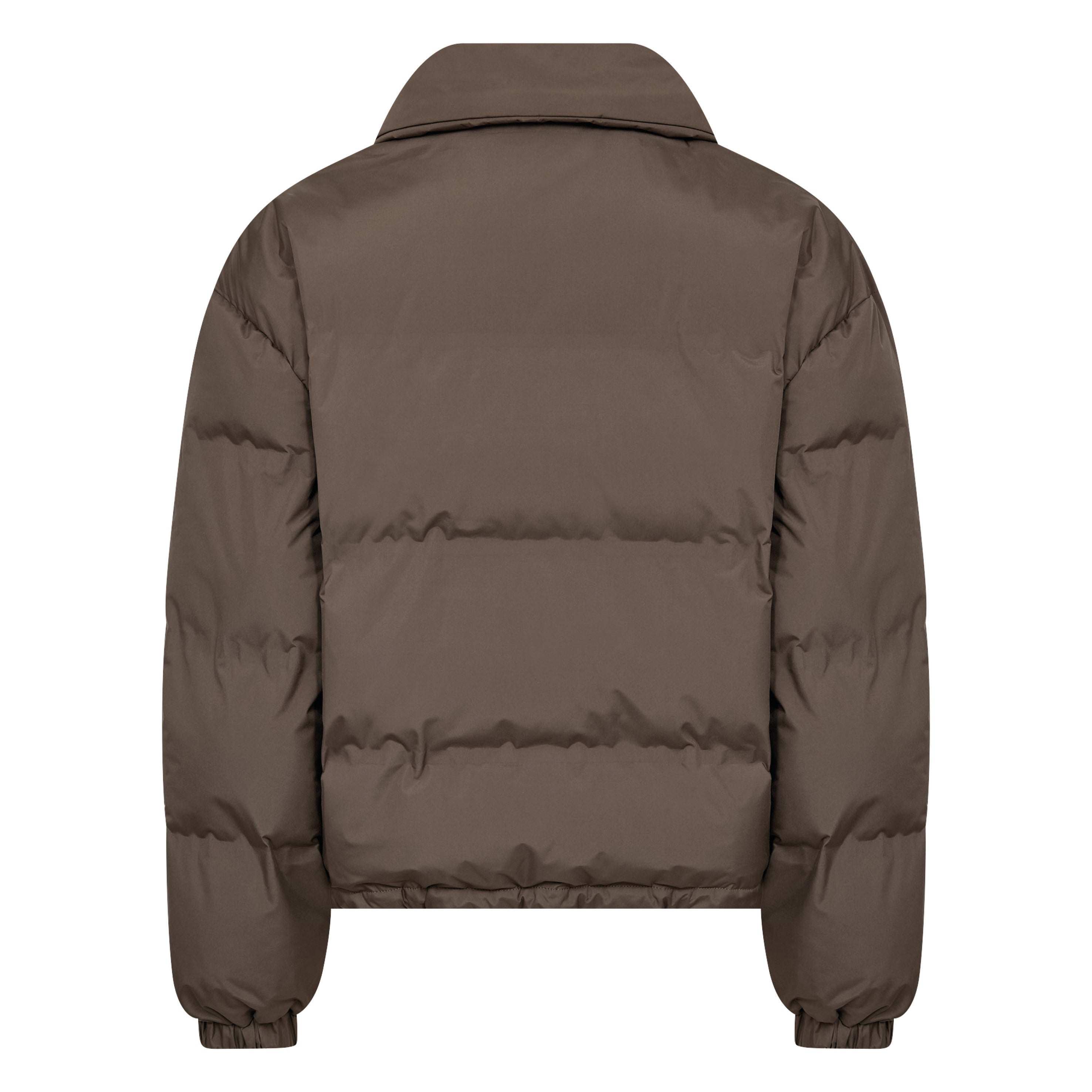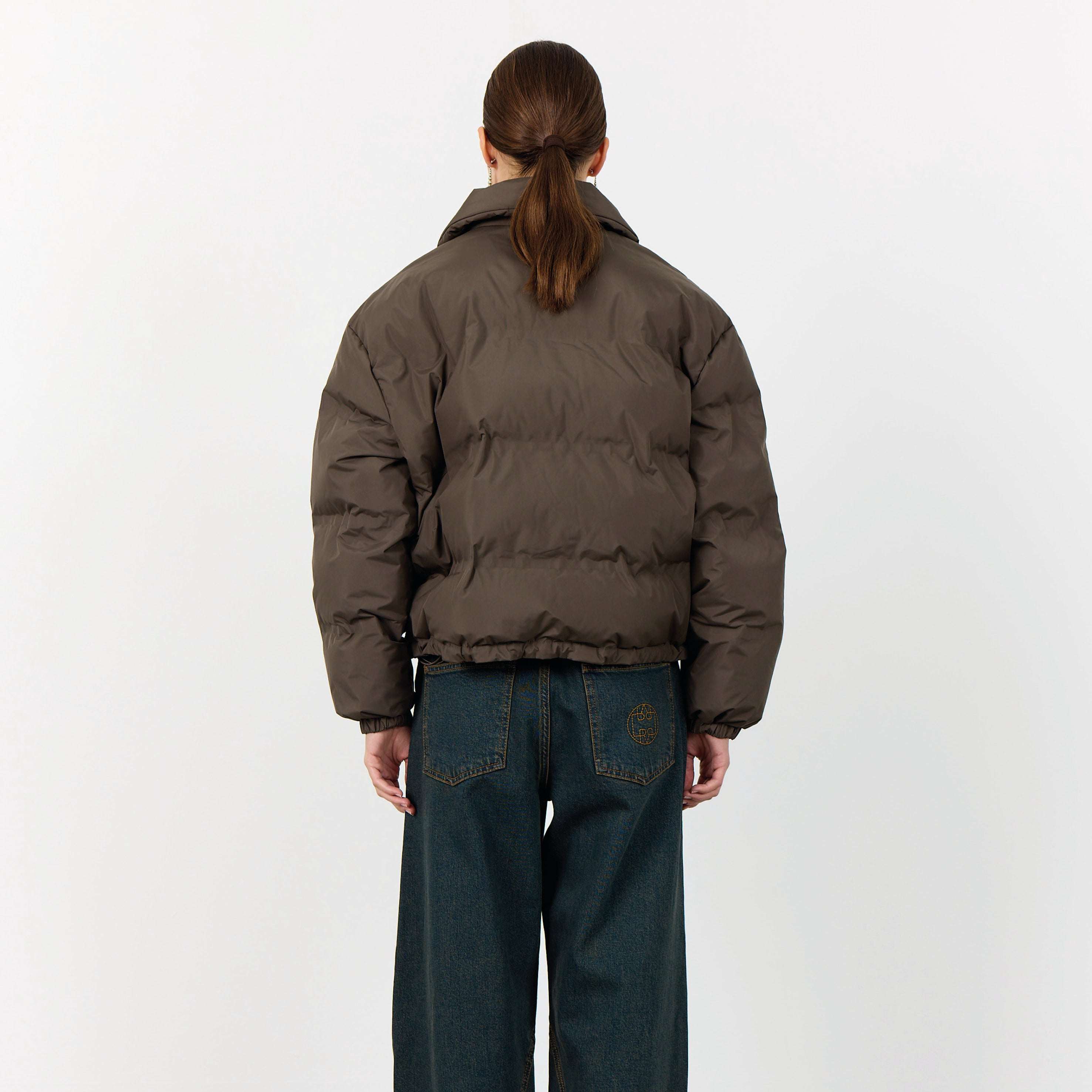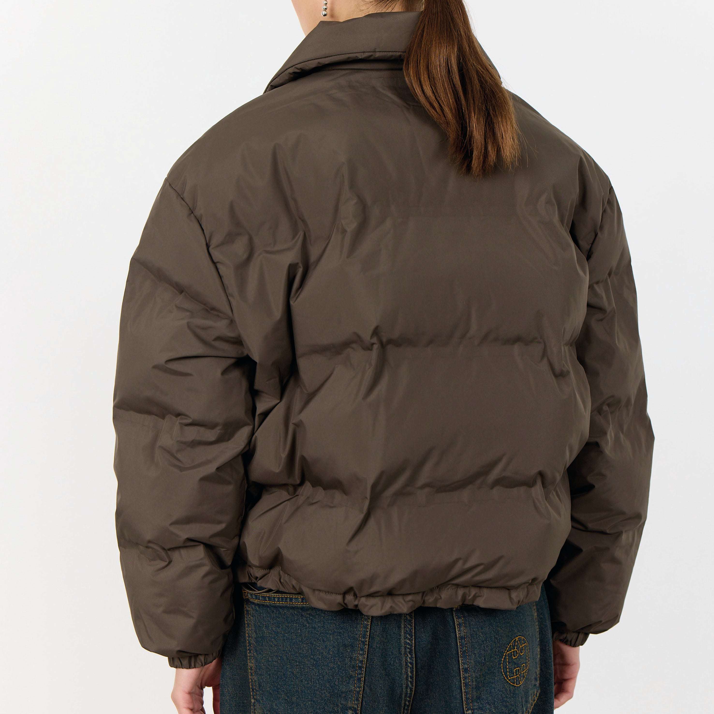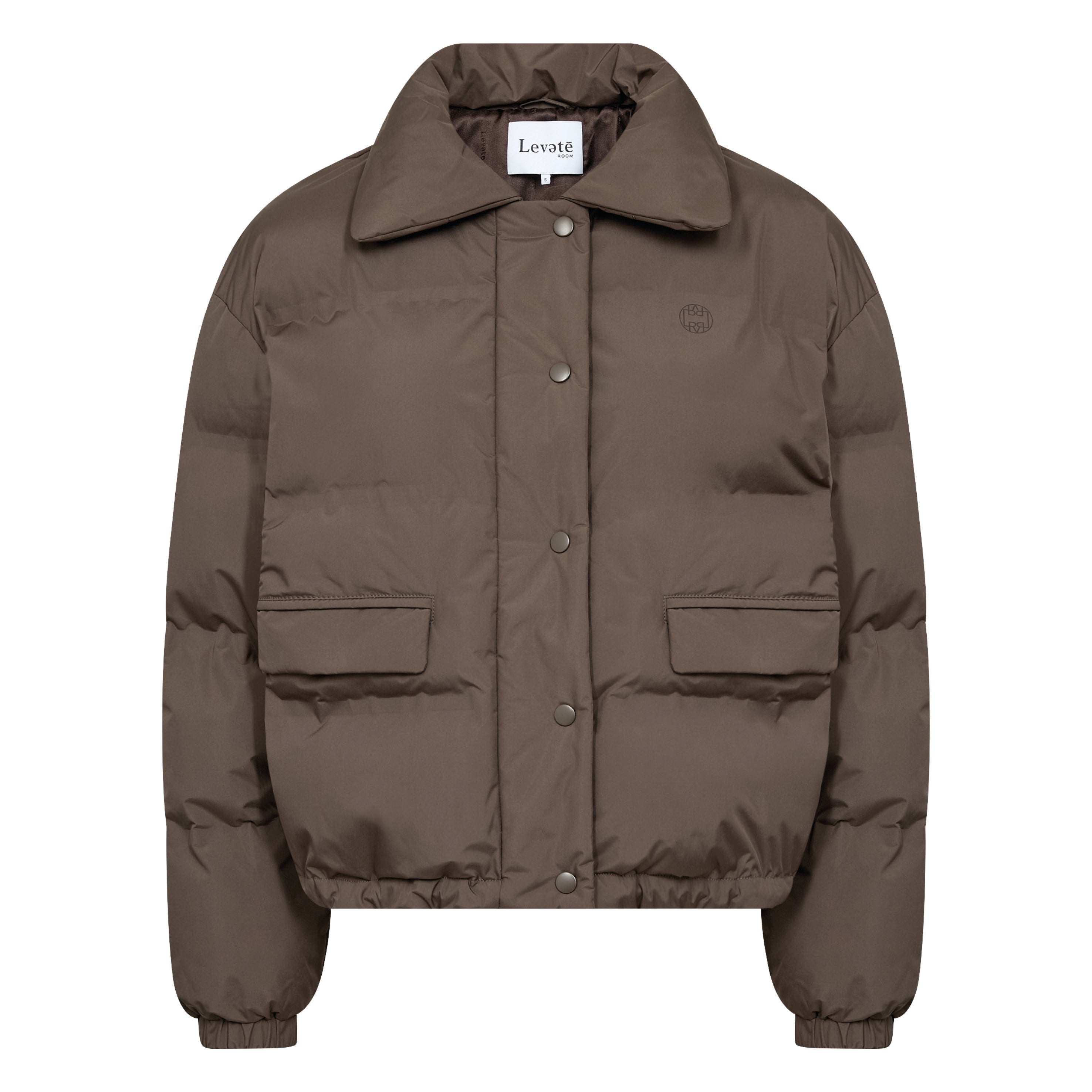 The Leveté Room Coffee Mona Coat features a high, wide collar, front button closure, puffy design with spacious pockets, and adjustable drawstrings at the hem. Pair it with jeans or tailored trousers for a relaxed or refined look.