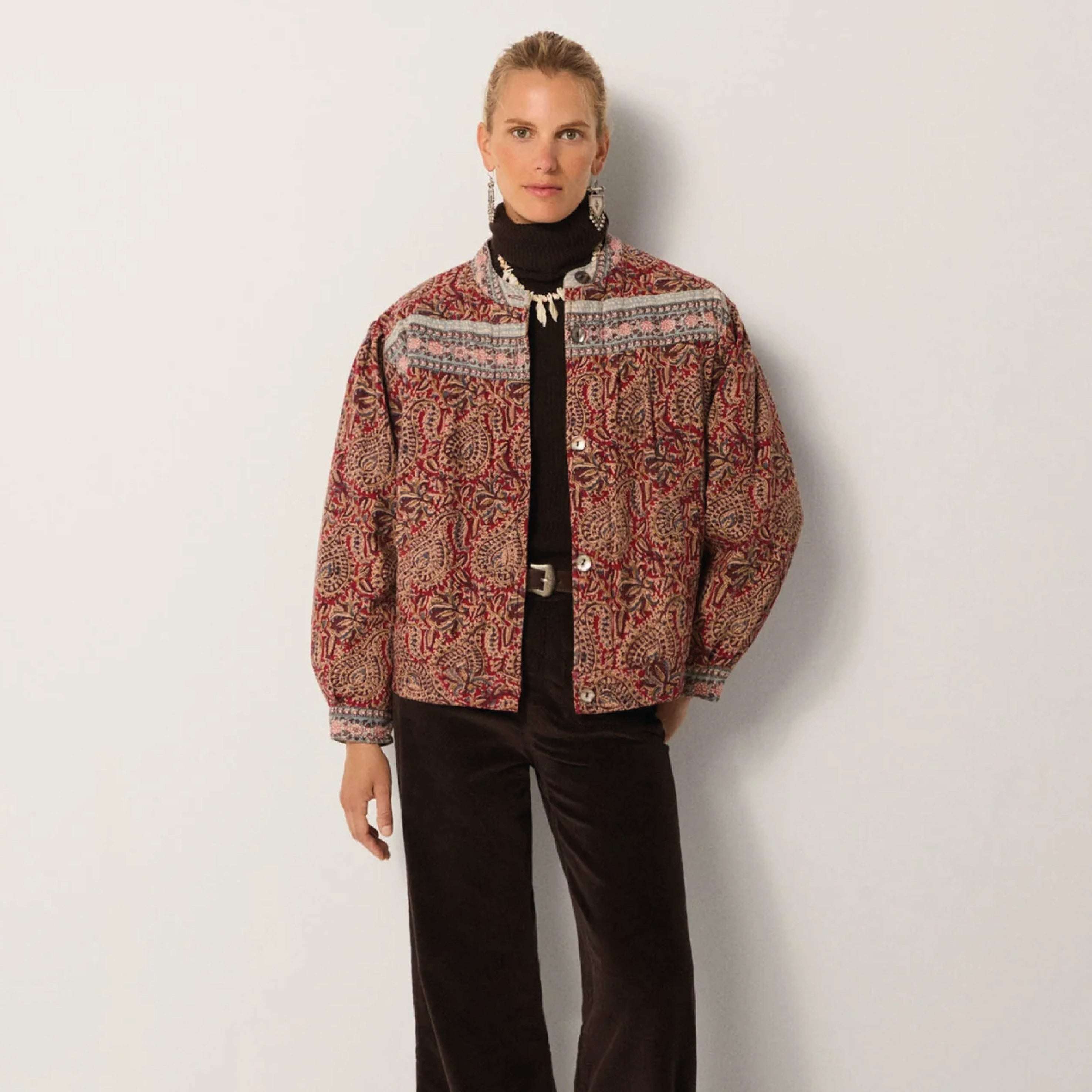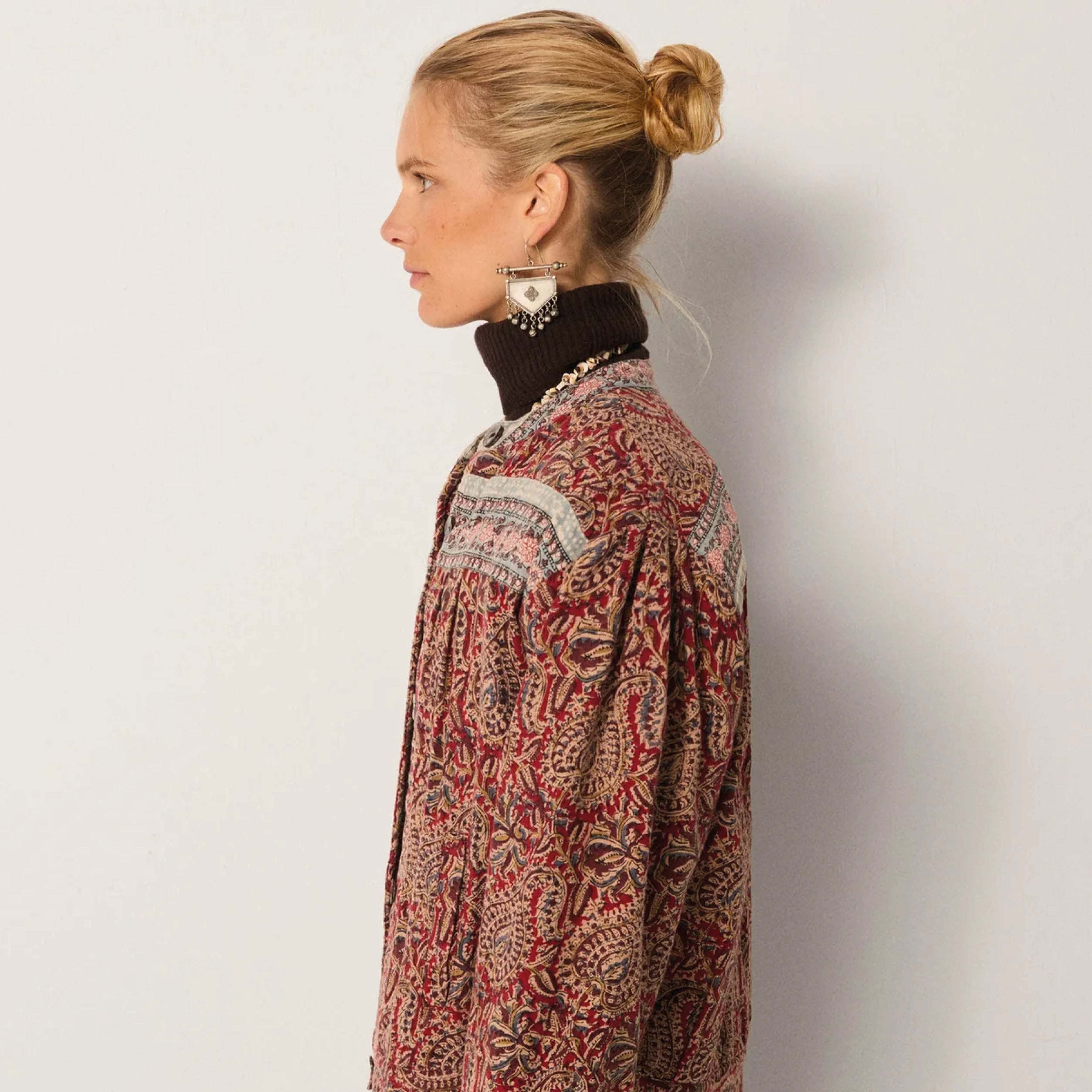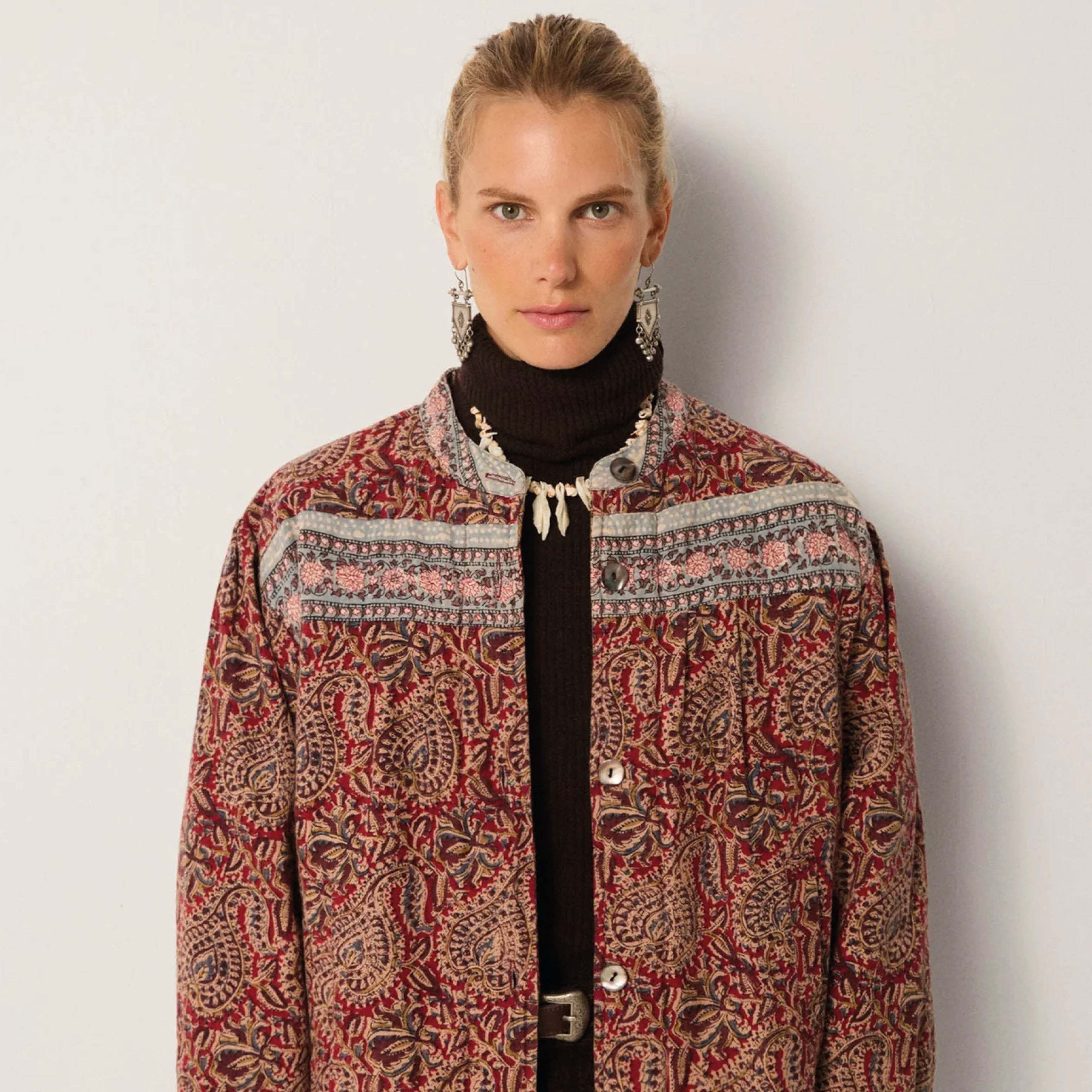 The Maison Hotel Olivia Jacket blends heritage prints with modern wearability. A boxy, button-up jacket cut from jacquard cotton canvas, saturated in deep burgundy, sand and indigo tones. The paisley pattern unfolds like a woven tapestry, intricate yet relaxed in feel. Lightly padded for structure, it balances warmth with ease.
