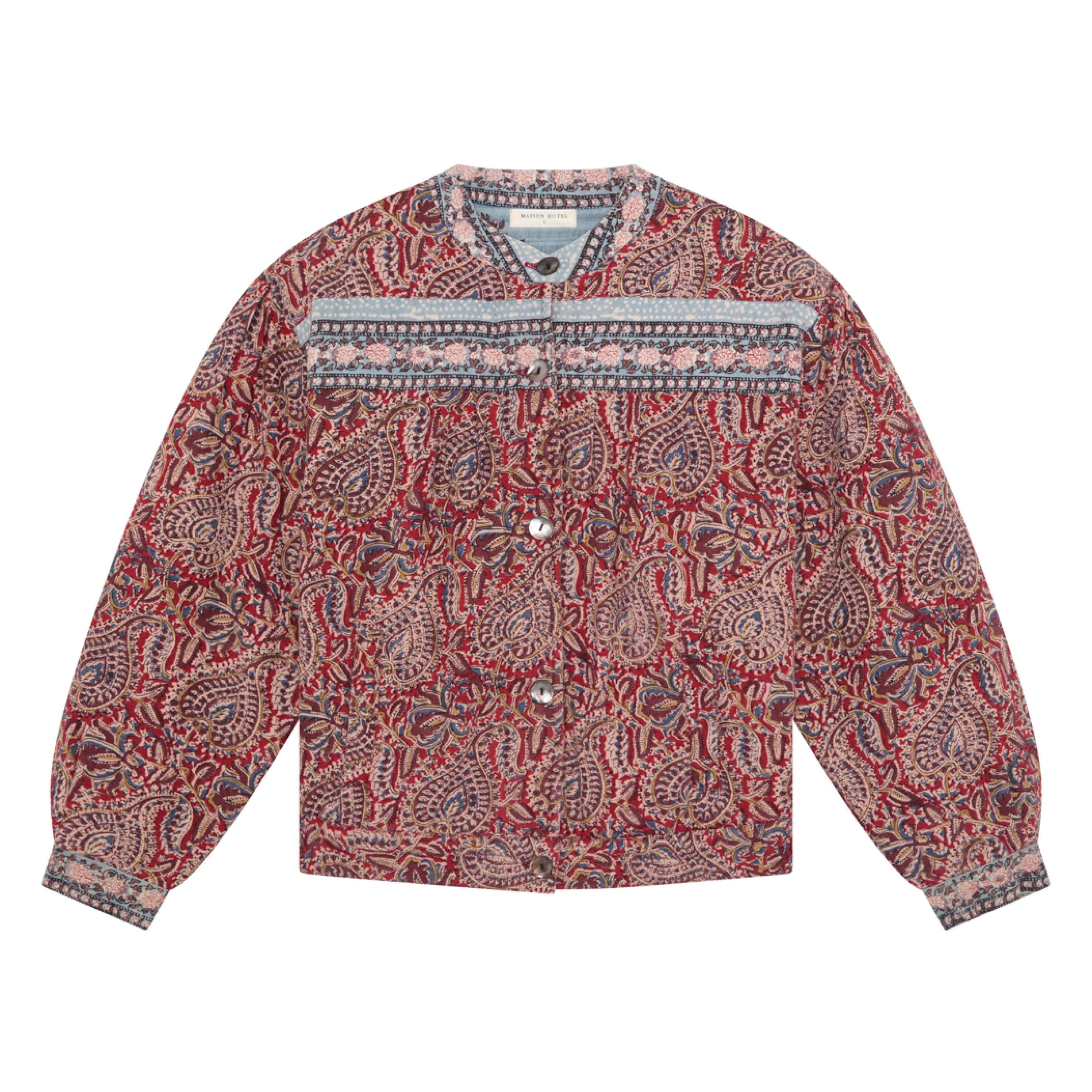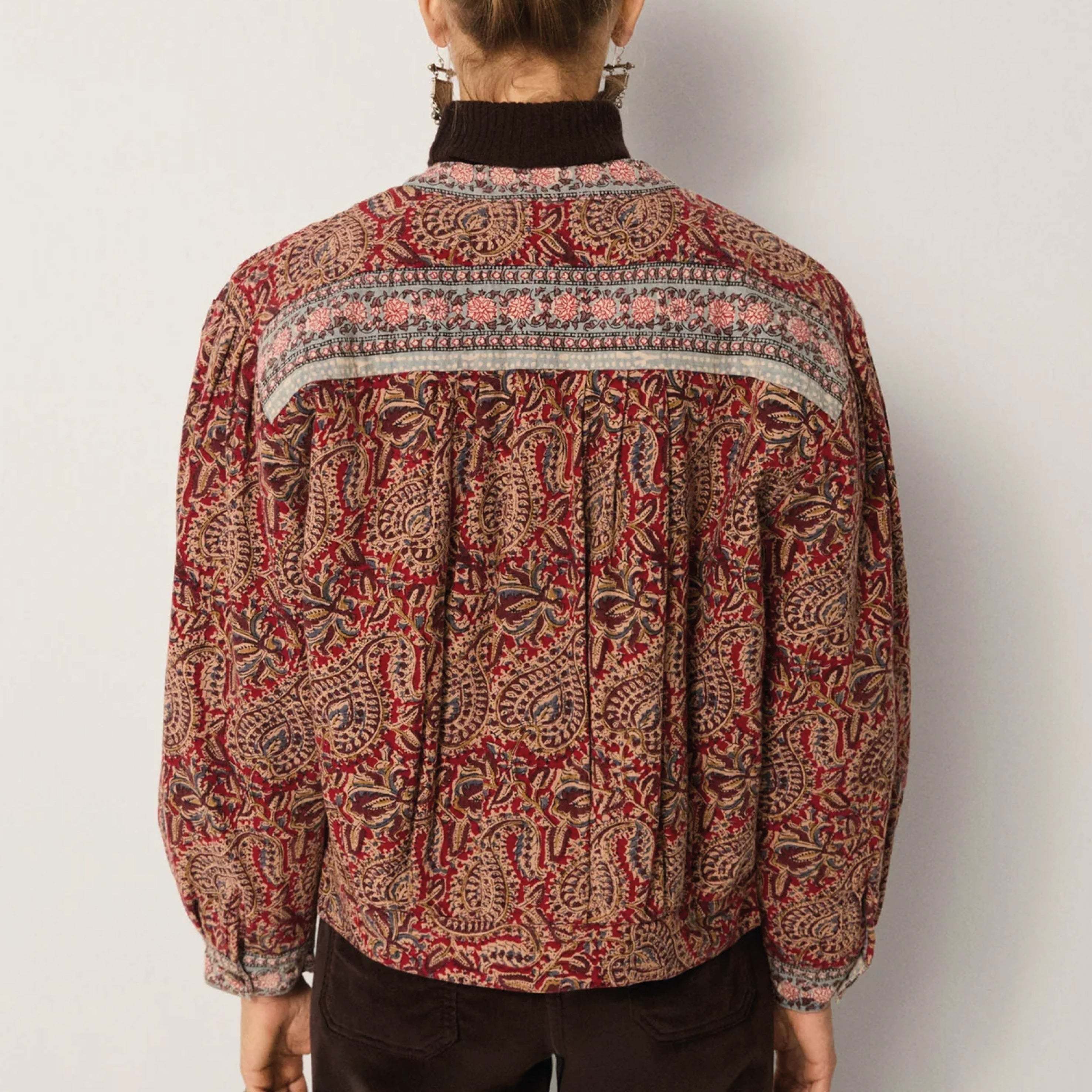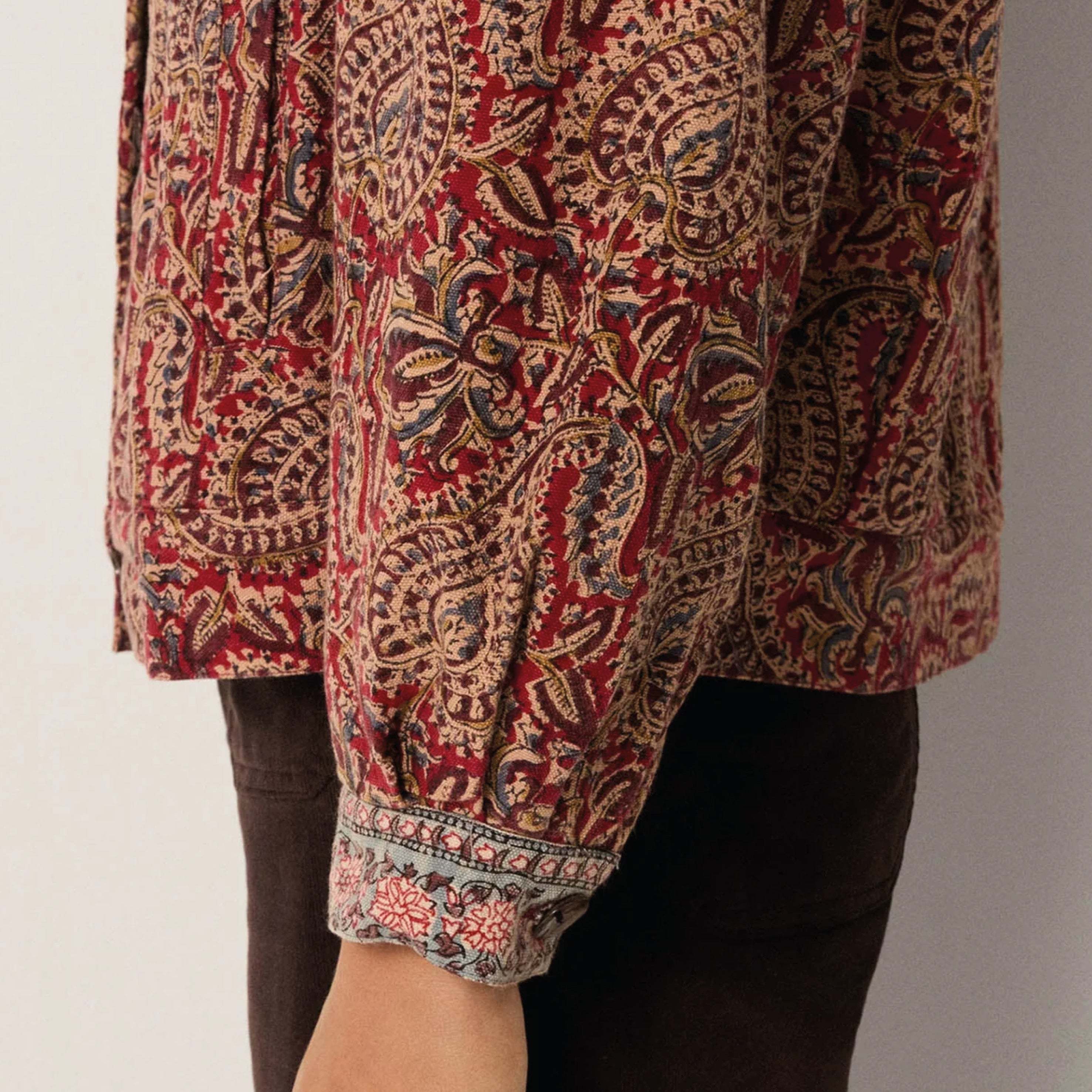 The Maison Hotel Olivia Jacket blends heritage prints with modern wearability. A boxy, button-up jacket cut from jacquard cotton canvas, saturated in deep burgundy, sand and indigo tones. The paisley pattern unfolds like a woven tapestry, intricate yet relaxed in feel. Lightly padded for structure, it balances warmth with ease.