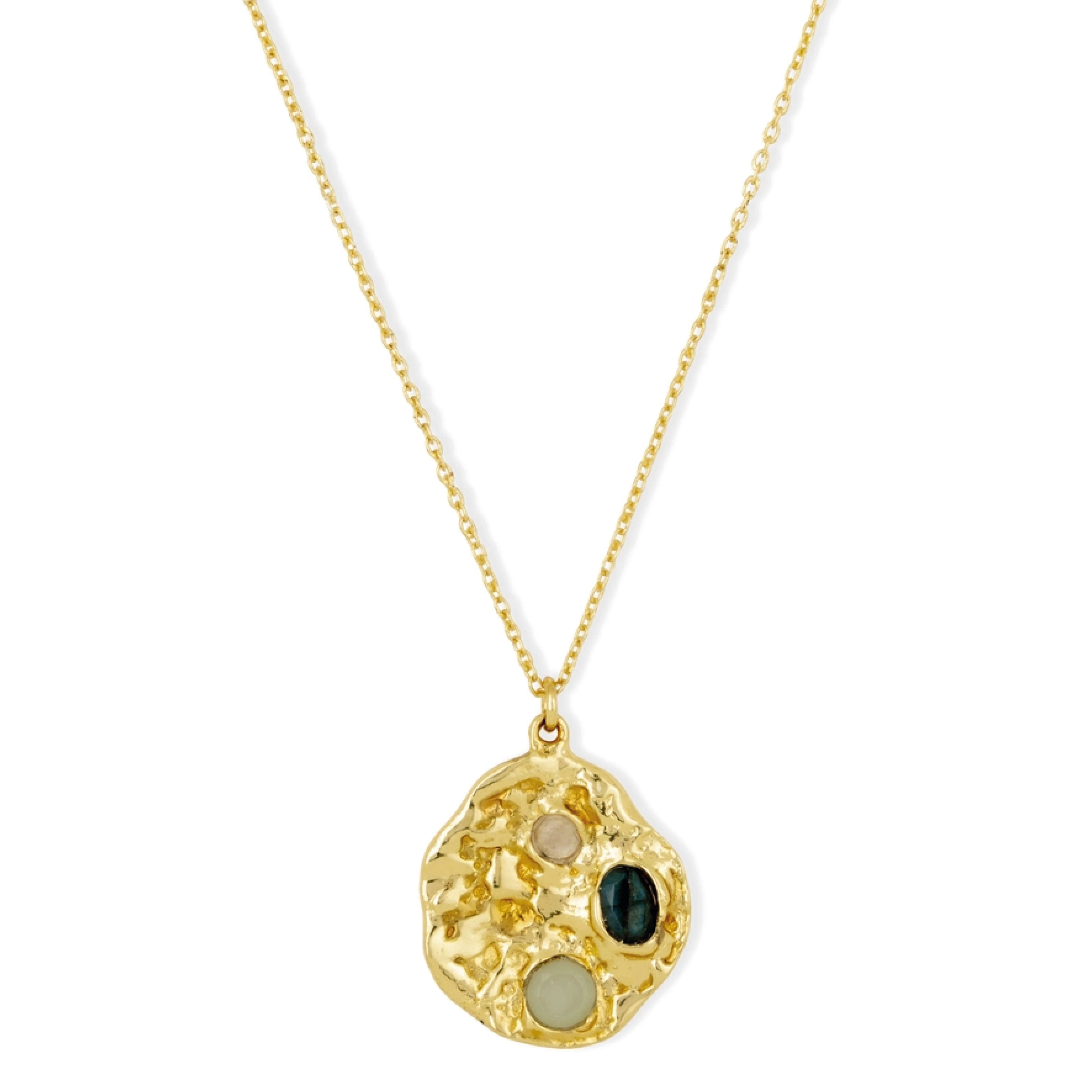 This textured Ashiana London Rhode Gemstone Coin Pendant Necklace features three inset gemstones: aqua chalcedony, rainbow moonstone, and labradorite. It boasts a polished gold finish and hangs from a fine, delicate chain.