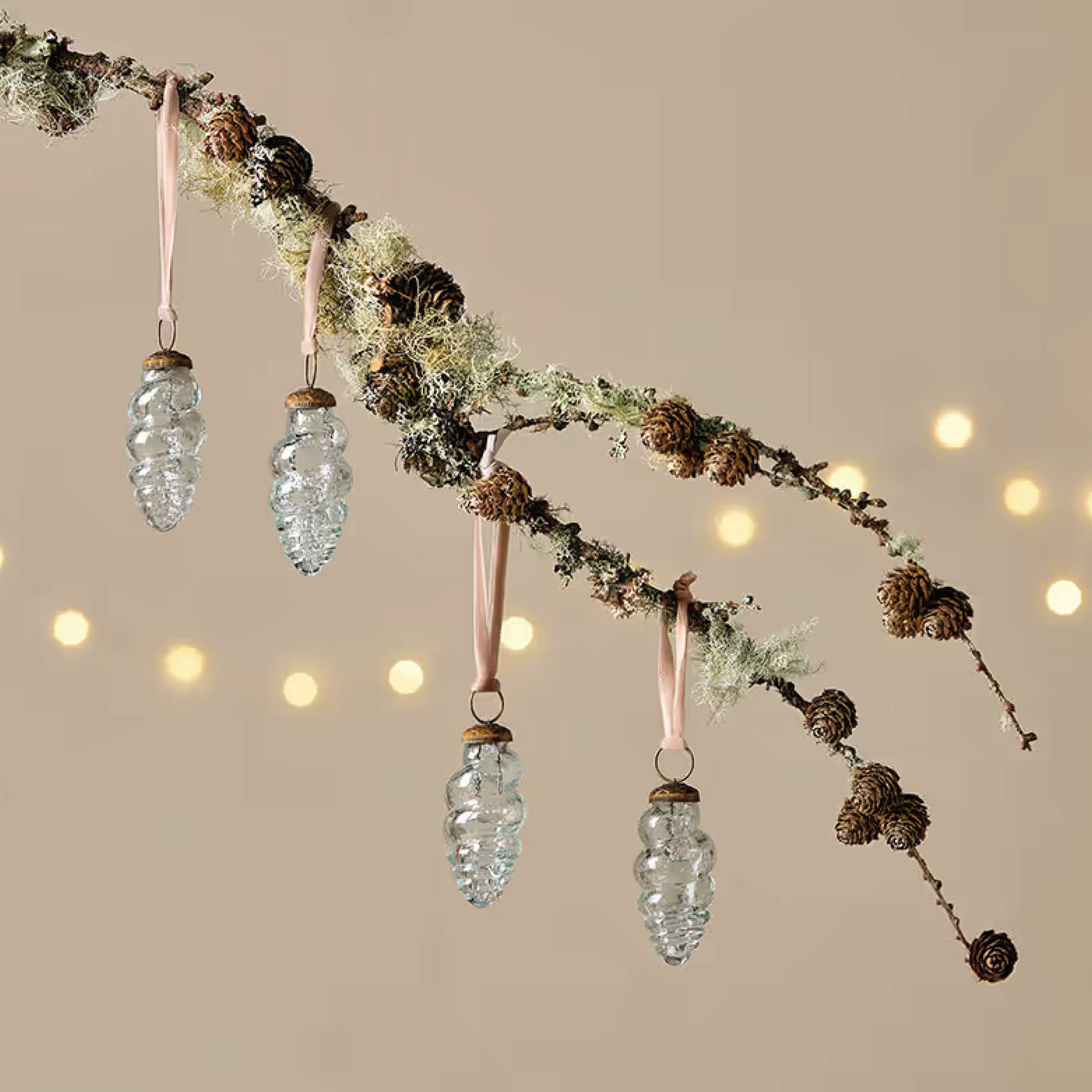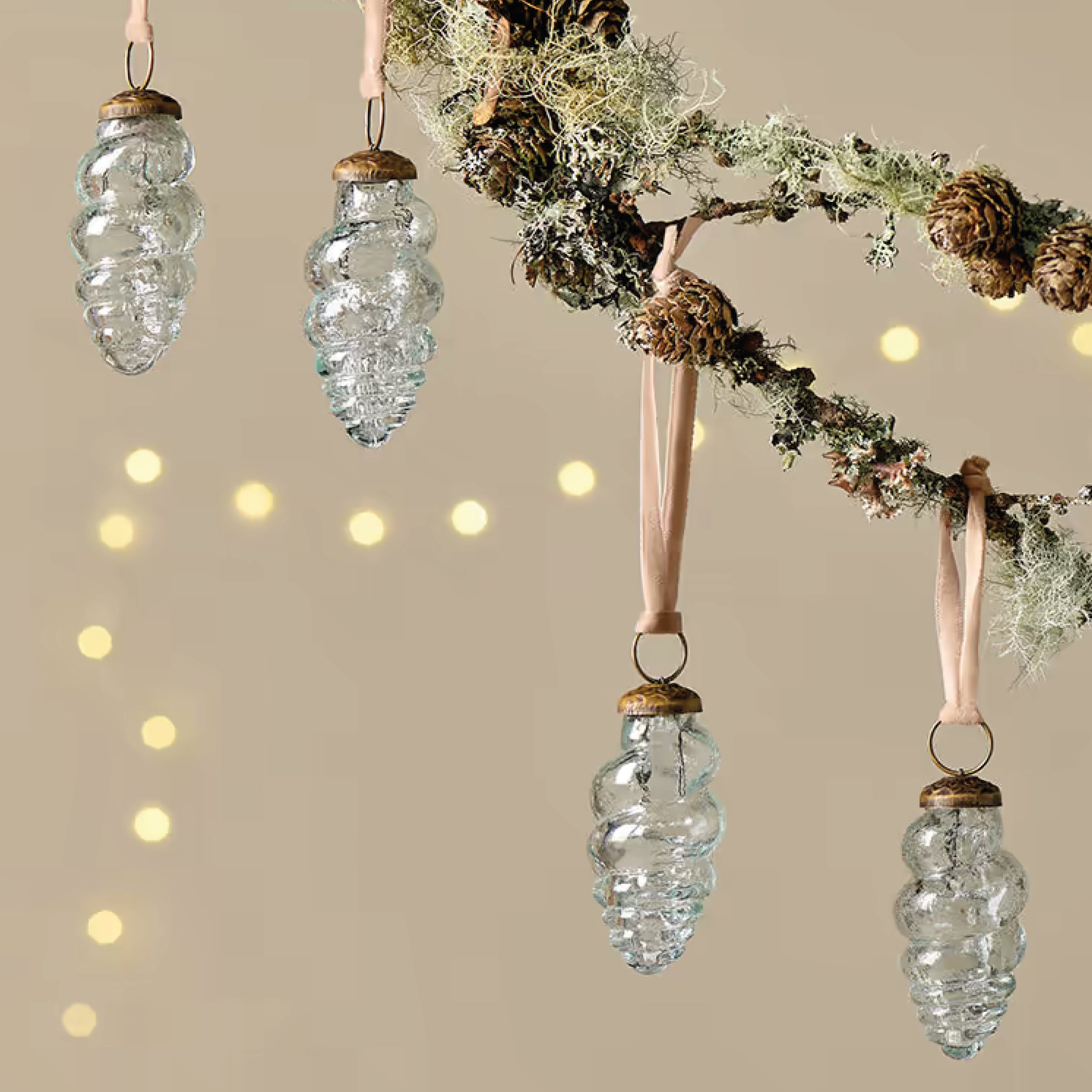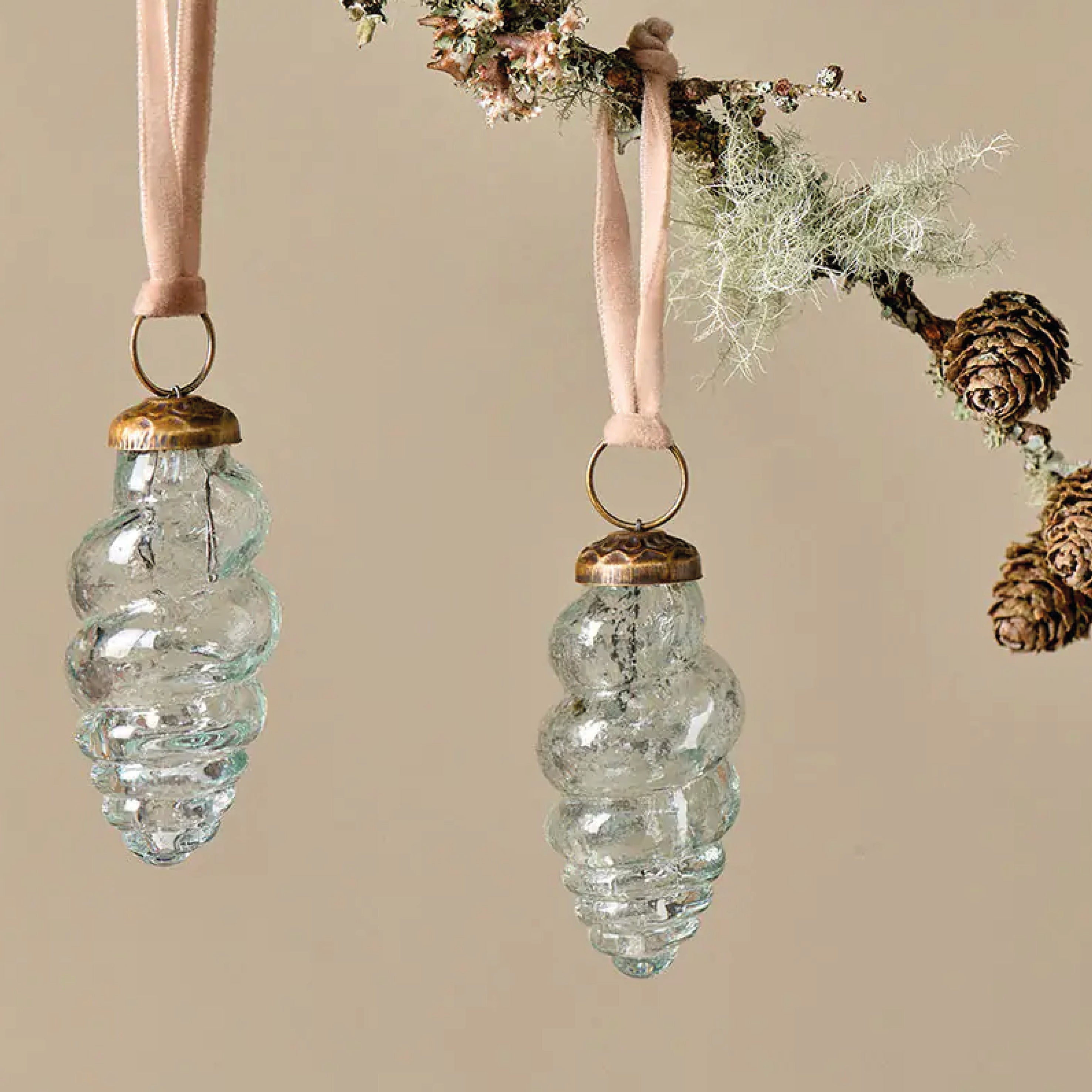 The elegant design used in the Clear Antique Khol Shell Bauble is inspired by coastal treasures and moulded from clear recycled glass with a subtle hint of sparkle. The organic design tapers to a gentle point and creates a striking look when hung from a bare branch or among luxuriant foliage for a sumptuous yet simple look that brings natural charm to any scheme: delightfully striking alongside festive foliage, organic objects and natural materials. Finished with an antique-style clasp and elegant velvet ribbon.