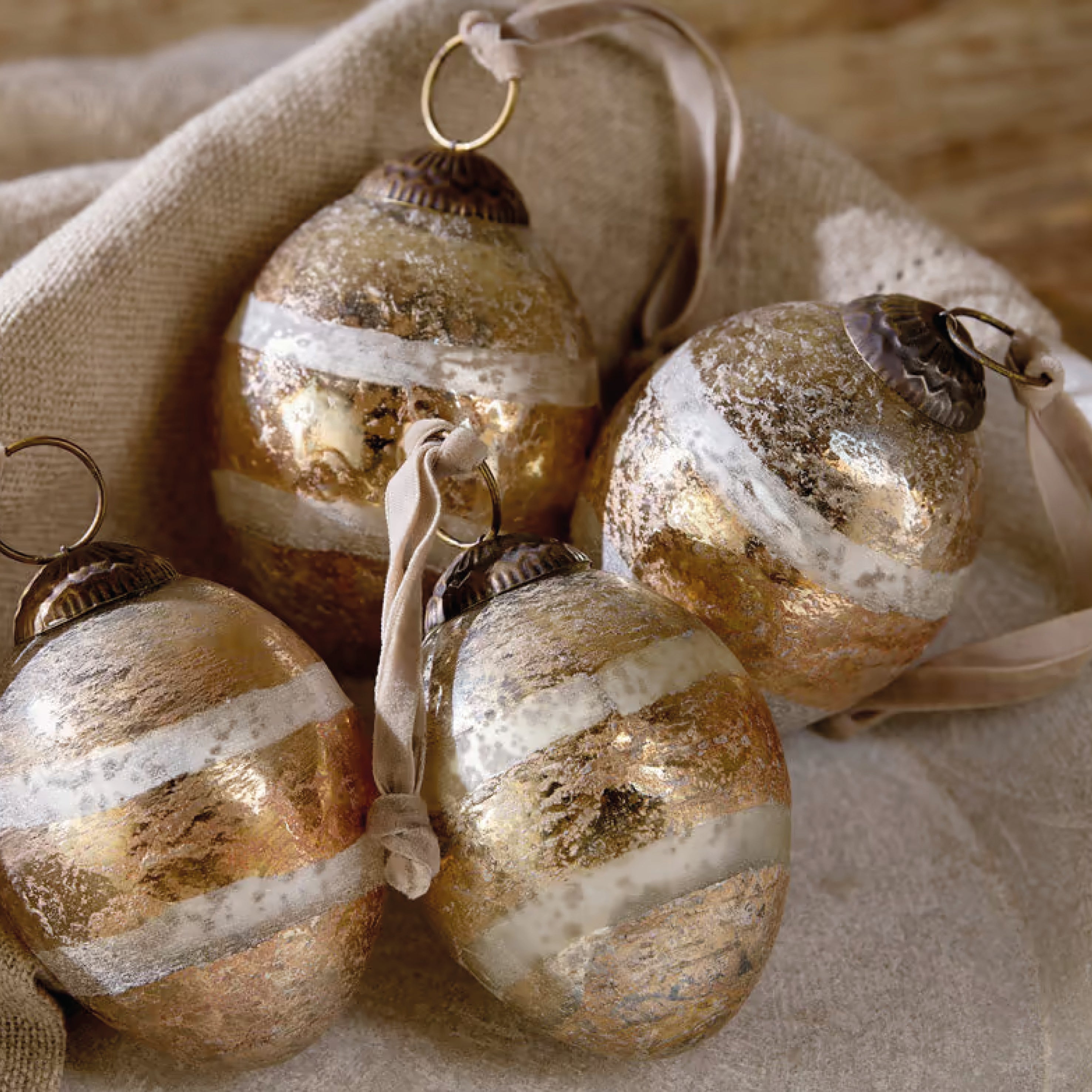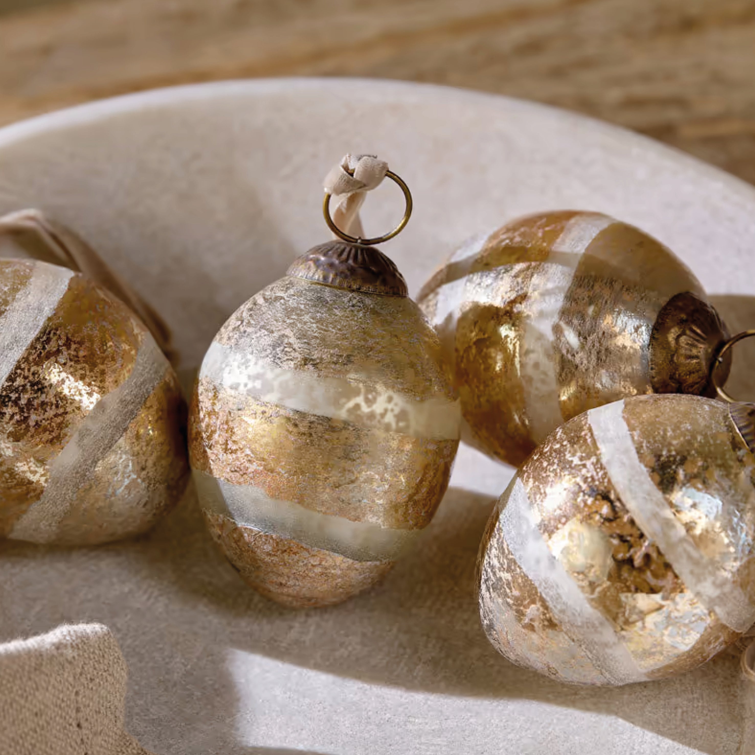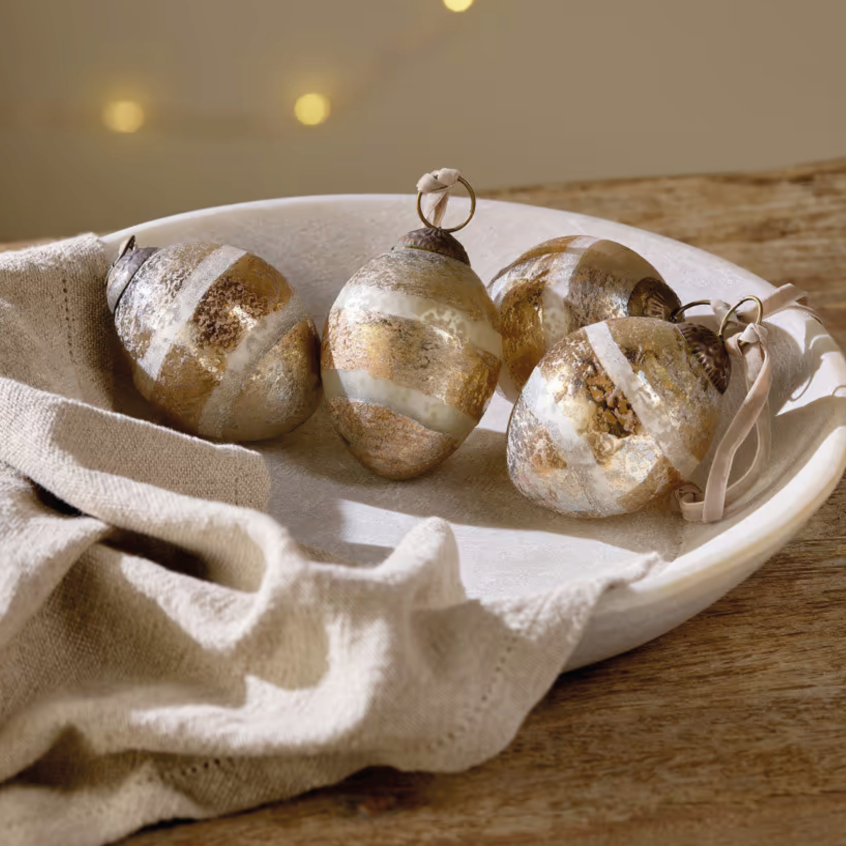 The elegantly shaped Gold Viti Bauble in pared-back tones of antique gold and silver has a wonderfully irregular striped patterning and are a beautiful addition to a naturally festive room decor. Organically shaped, they bring substantial structure to a tree scheme and create a beautiful look as part of a table setting or added to a seasonal garland. The understated antique bronze clasp finishes the sophisticated look.
