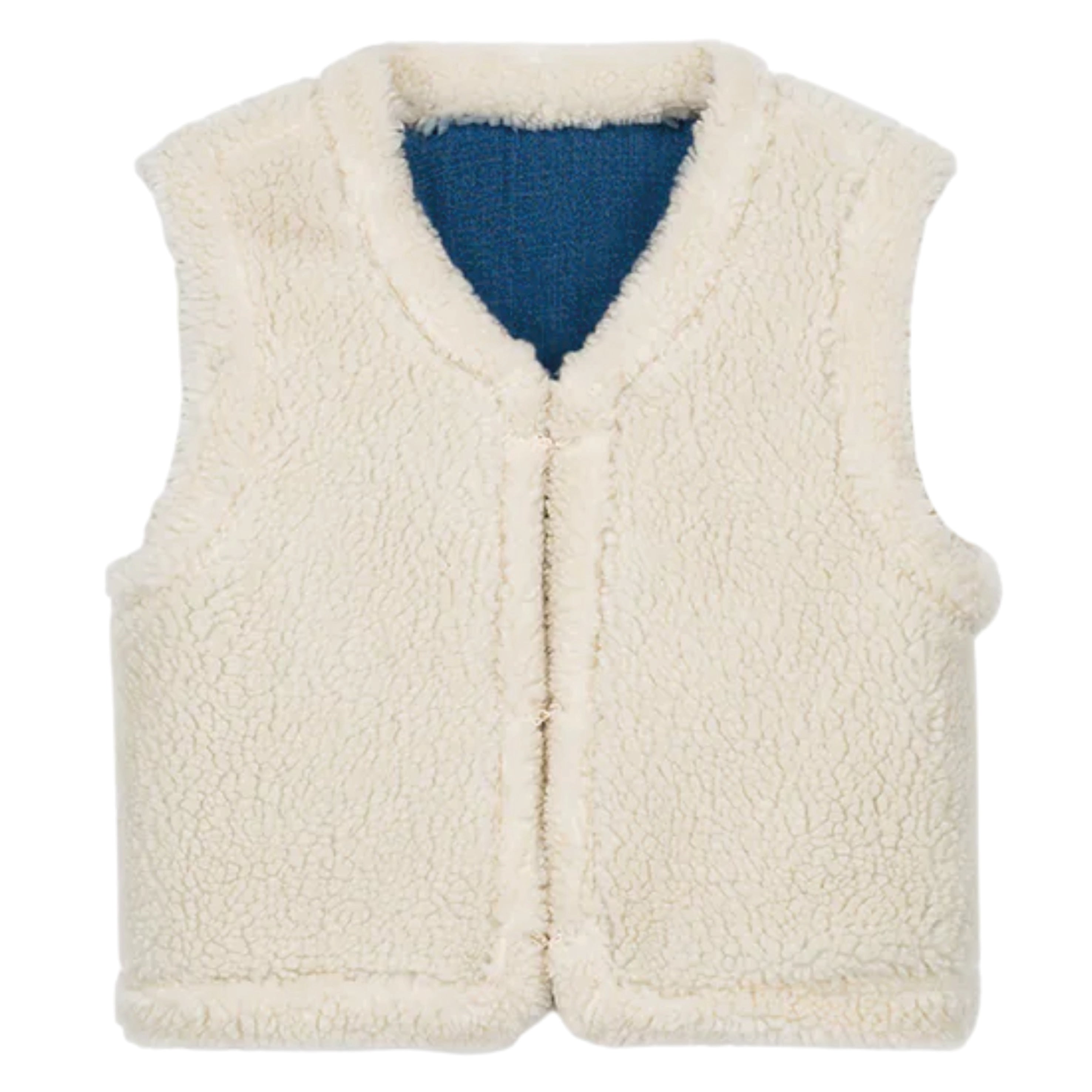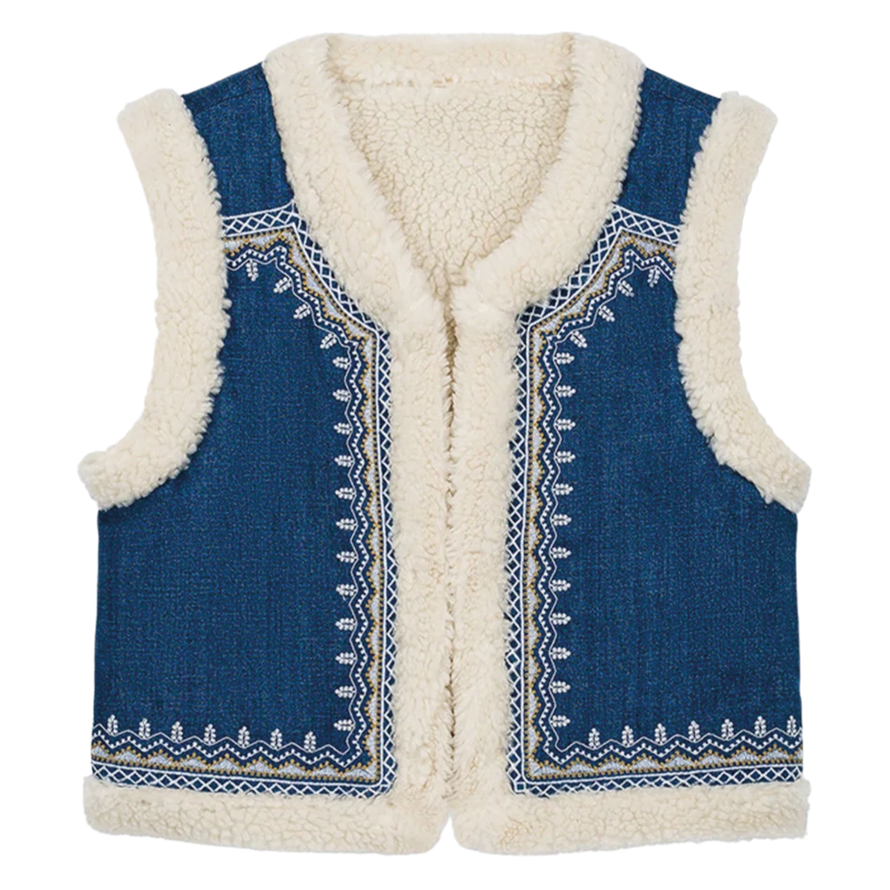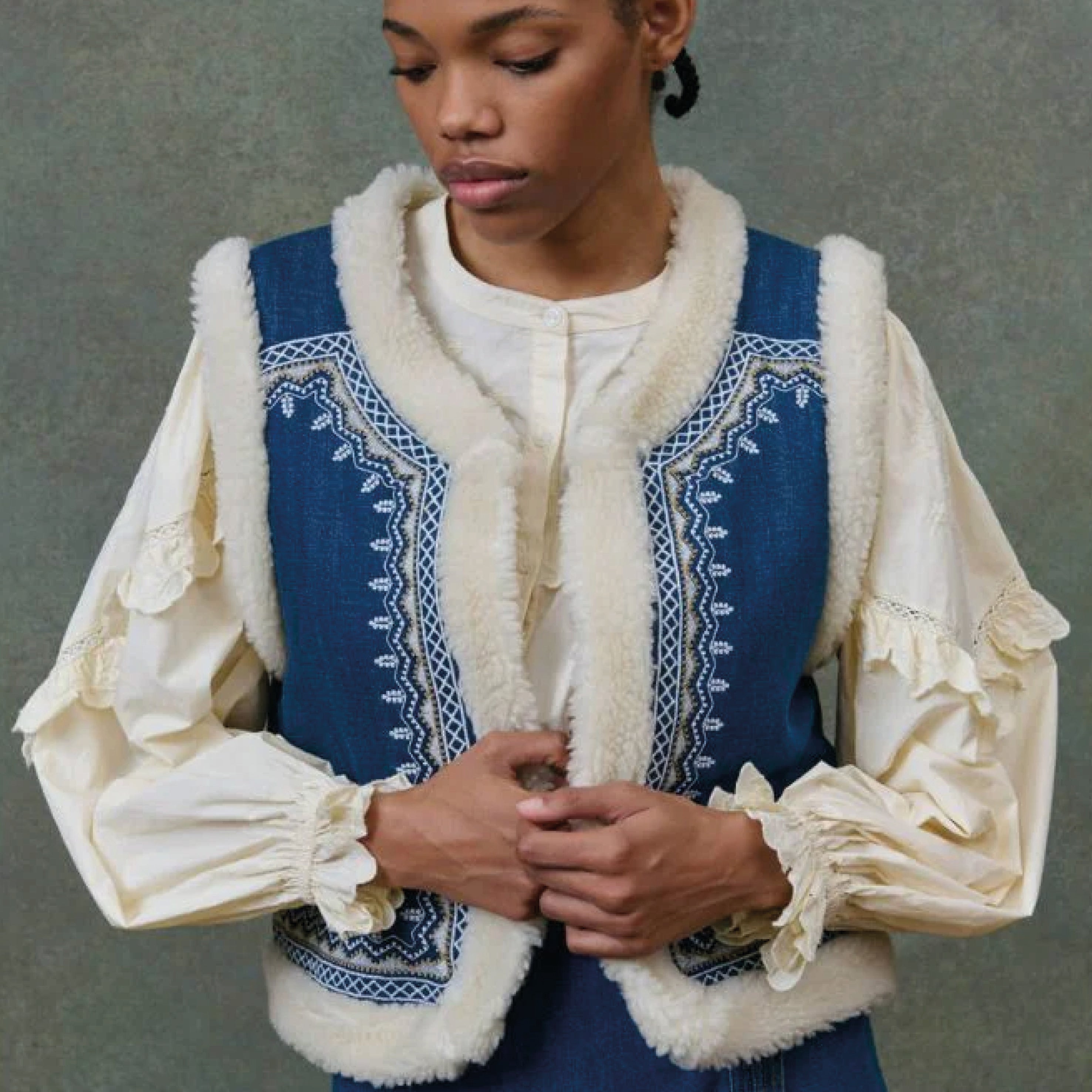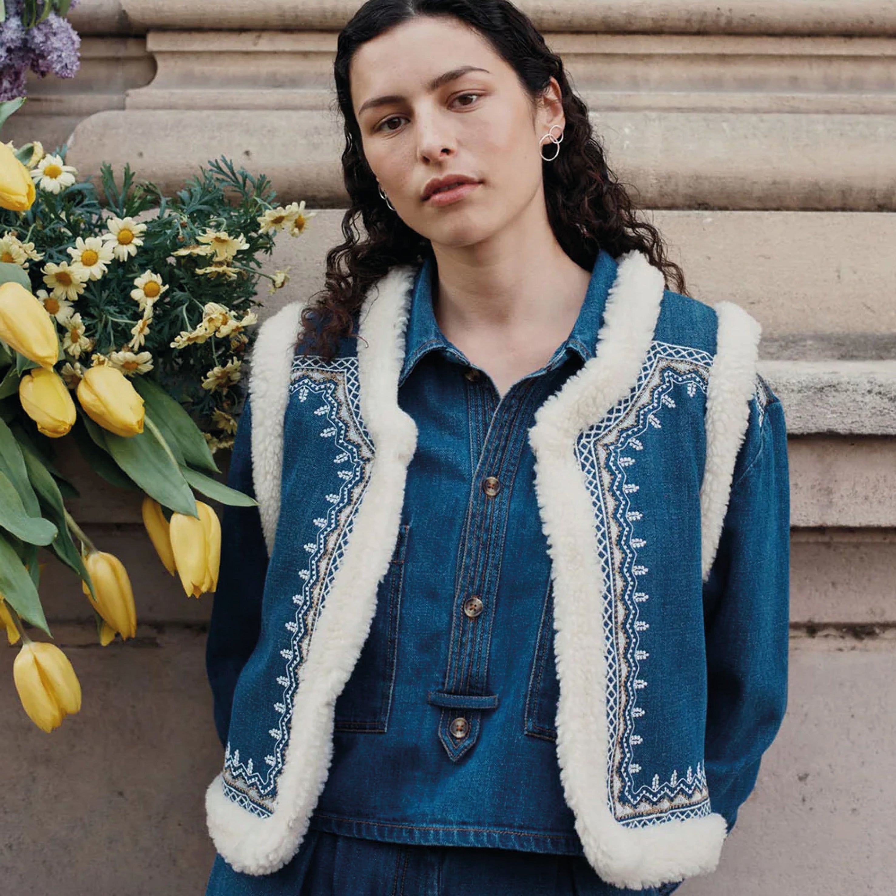 The gorgeous Louise Misha Stone Blue Figara Reversible Vest is the perfect transitional piece to welcome the new season. The reversible vest features a denim blue side and a plain cream sherpa side. We love the contrasting Dori embroideries with lurex details, handcrafted using a pedal-powered embroidery machine.