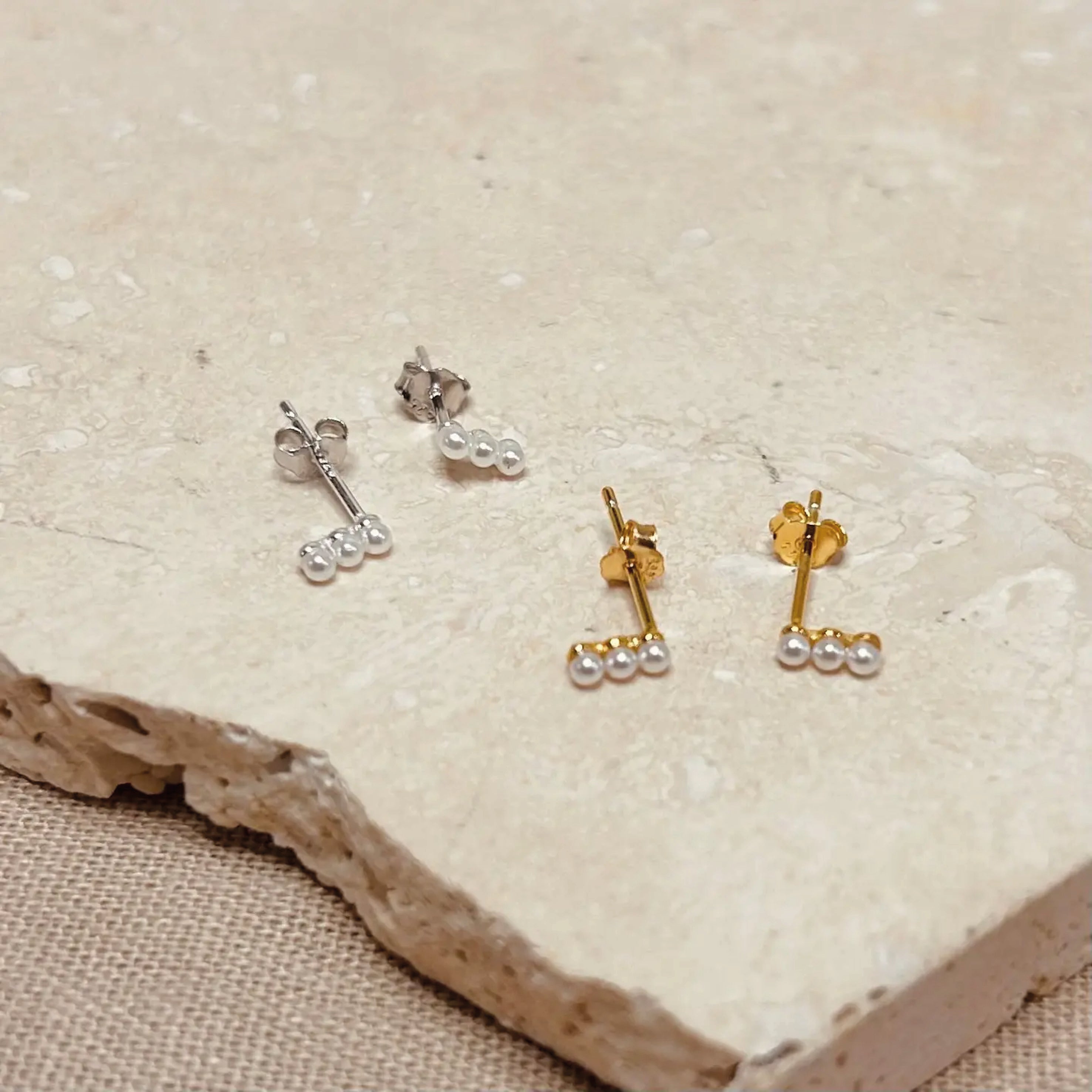 Add a tough of elegance to your ear stack with the Silver Pearl Trio Stud Earrings. This pair of stud earrings can be worn on their own for a minimal look, but work well as everyday studs for second or third lobe piercings