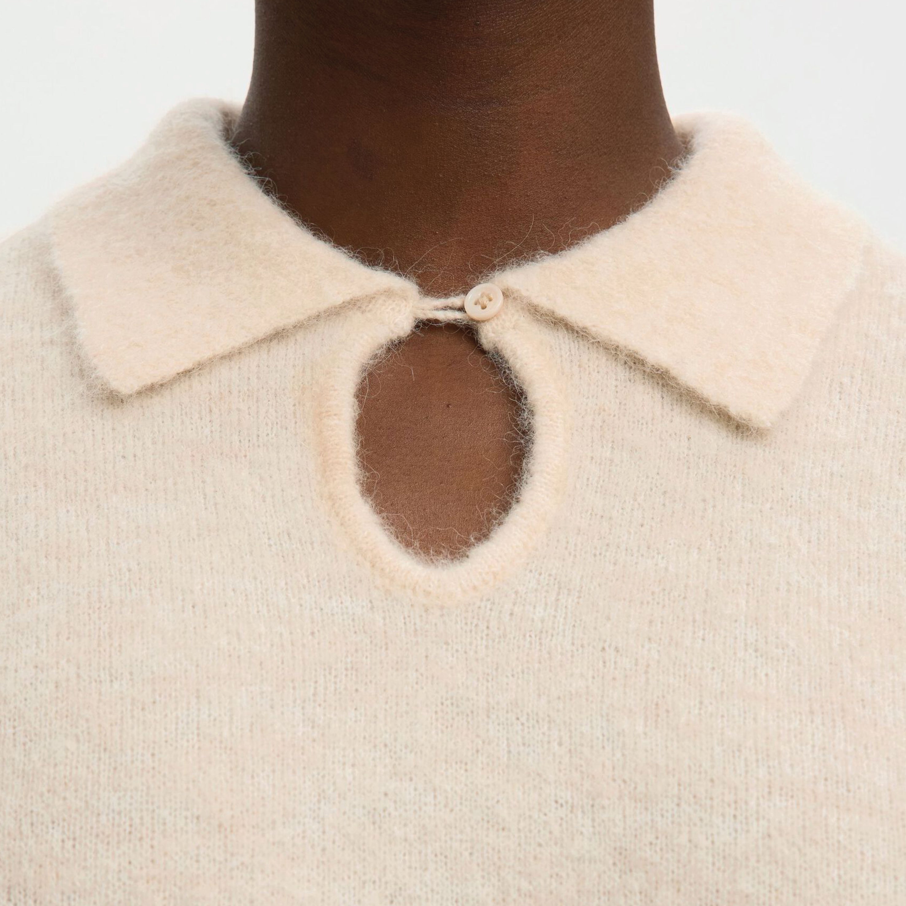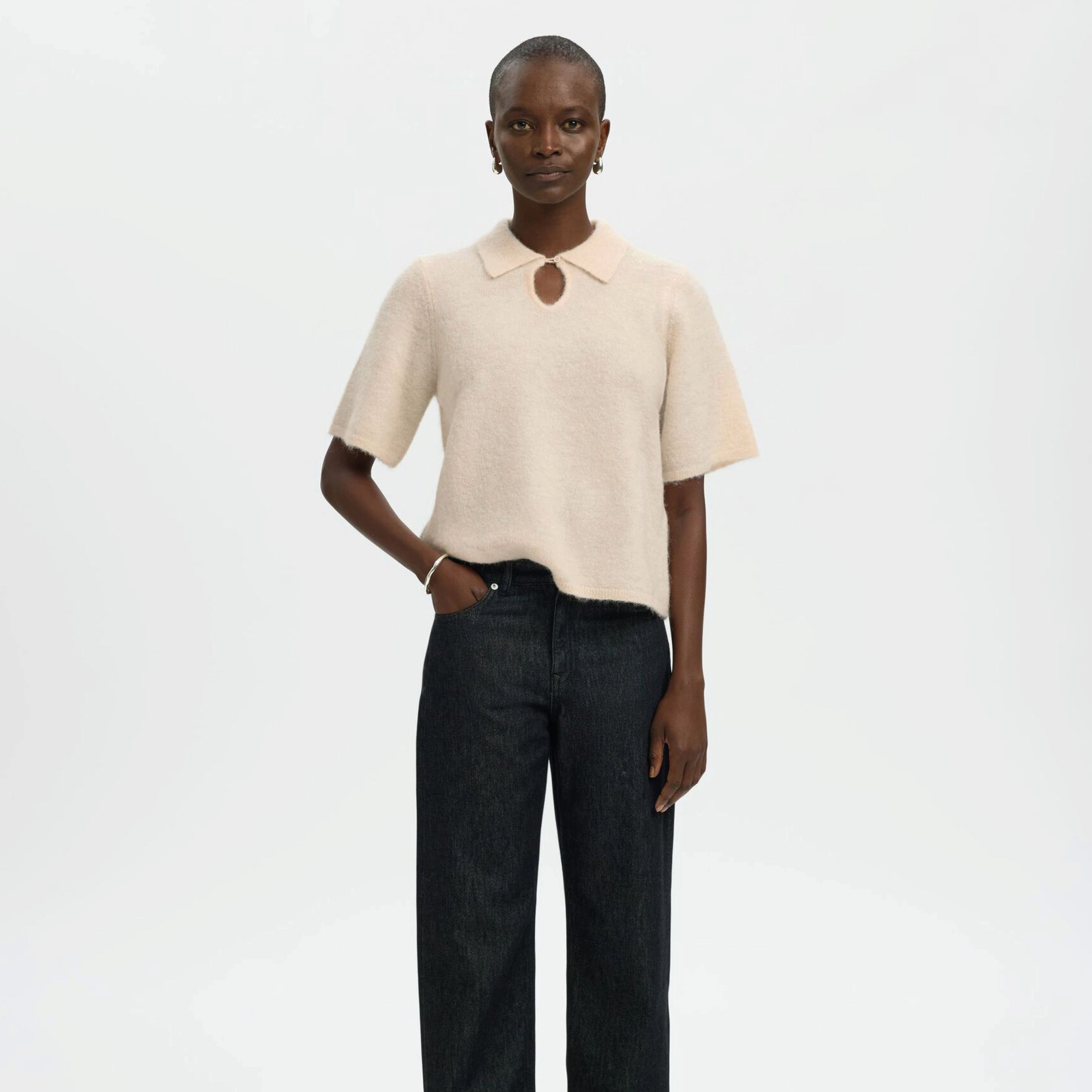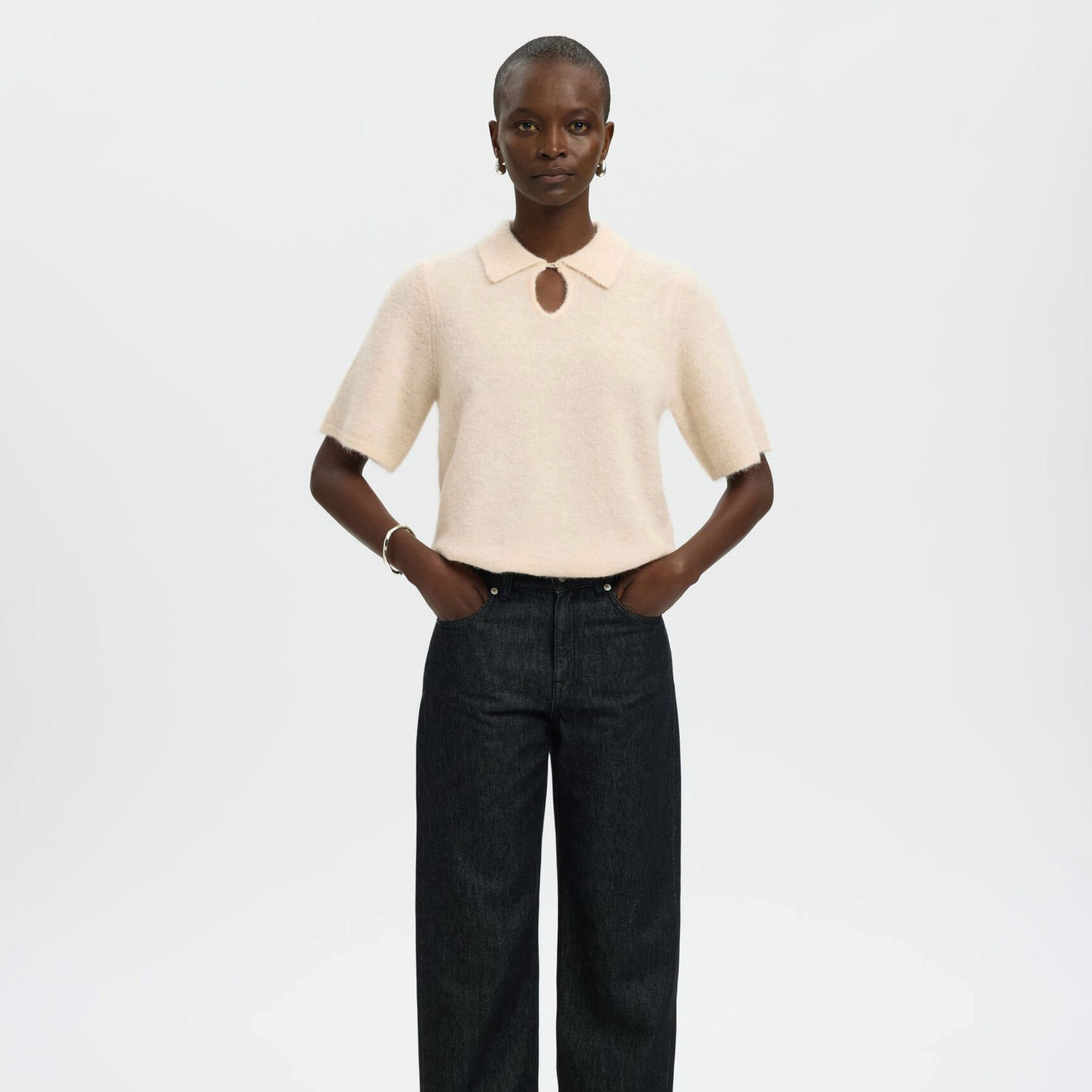 Get inspired by the vintage look of this Selected Femme Sia Ras Birch Short Sleeve Knitted Top. It features a dainty keyhole cut-out detail and can be styled with anything from satin skirts to loose-fit denim.