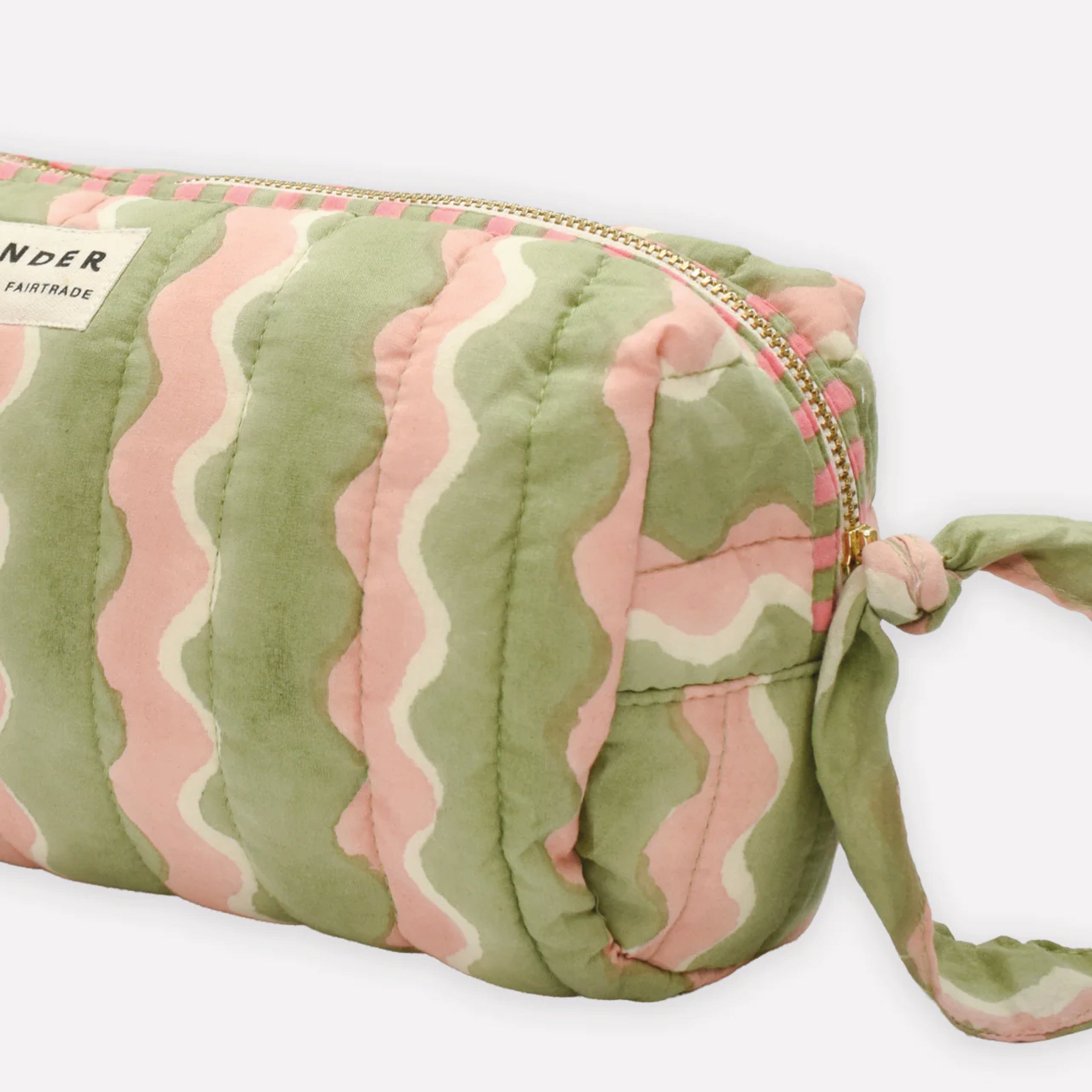 The Quilted Whirly Mint Wash Bag is handmade in Jaipur from soft organic cotton. This wash bag pairs sage green with gentle blush waves for a calm, balanced look. The light quilting gives it a soft yet sturdy feel, making it ideal for everyday use or travel. It fits all your essentials — skincare, toiletries, or makeup — while staying light and easy to pack. Dyed with eco-friendly, AZO-free pigments and crafted with care, it’s a thoughtful piece made to last.