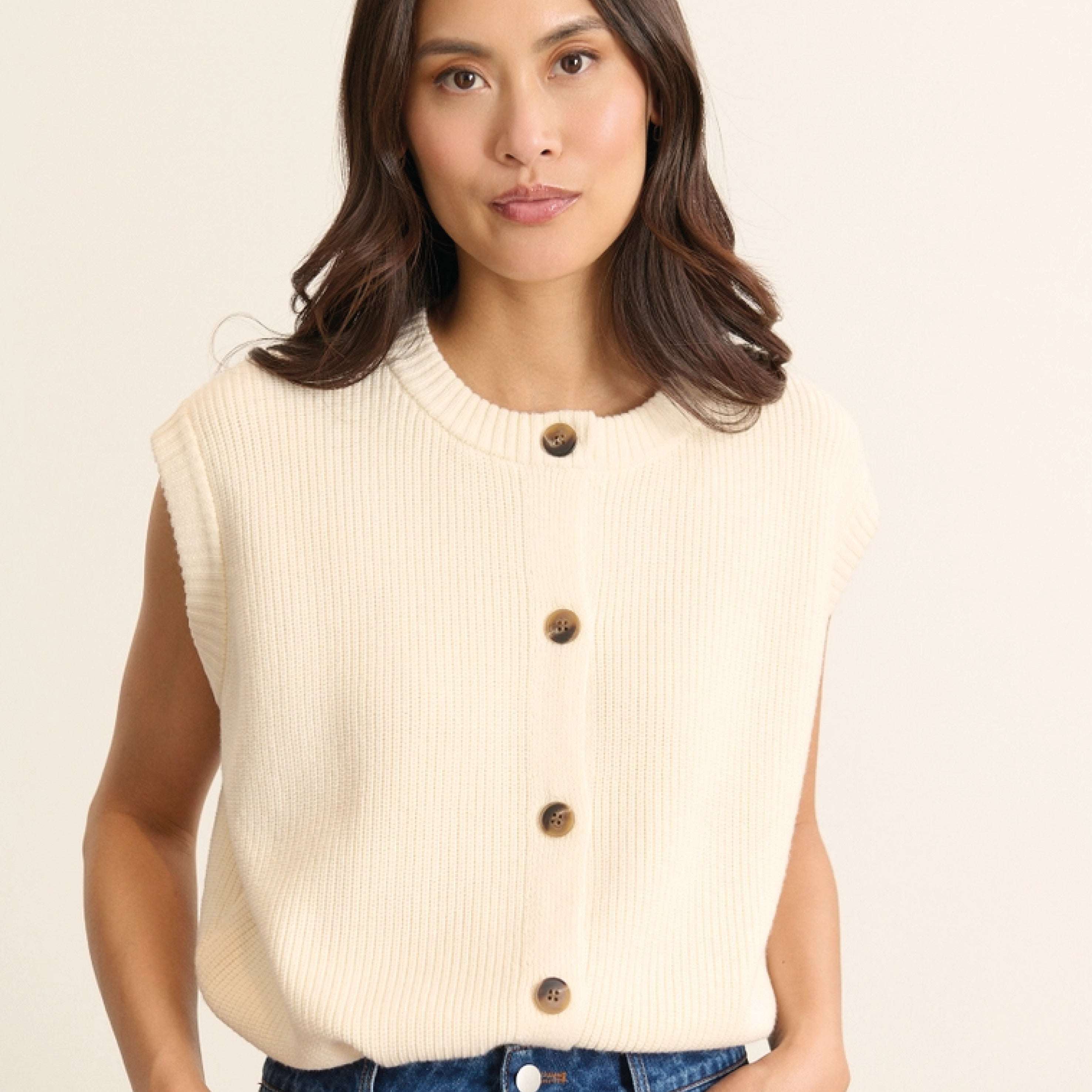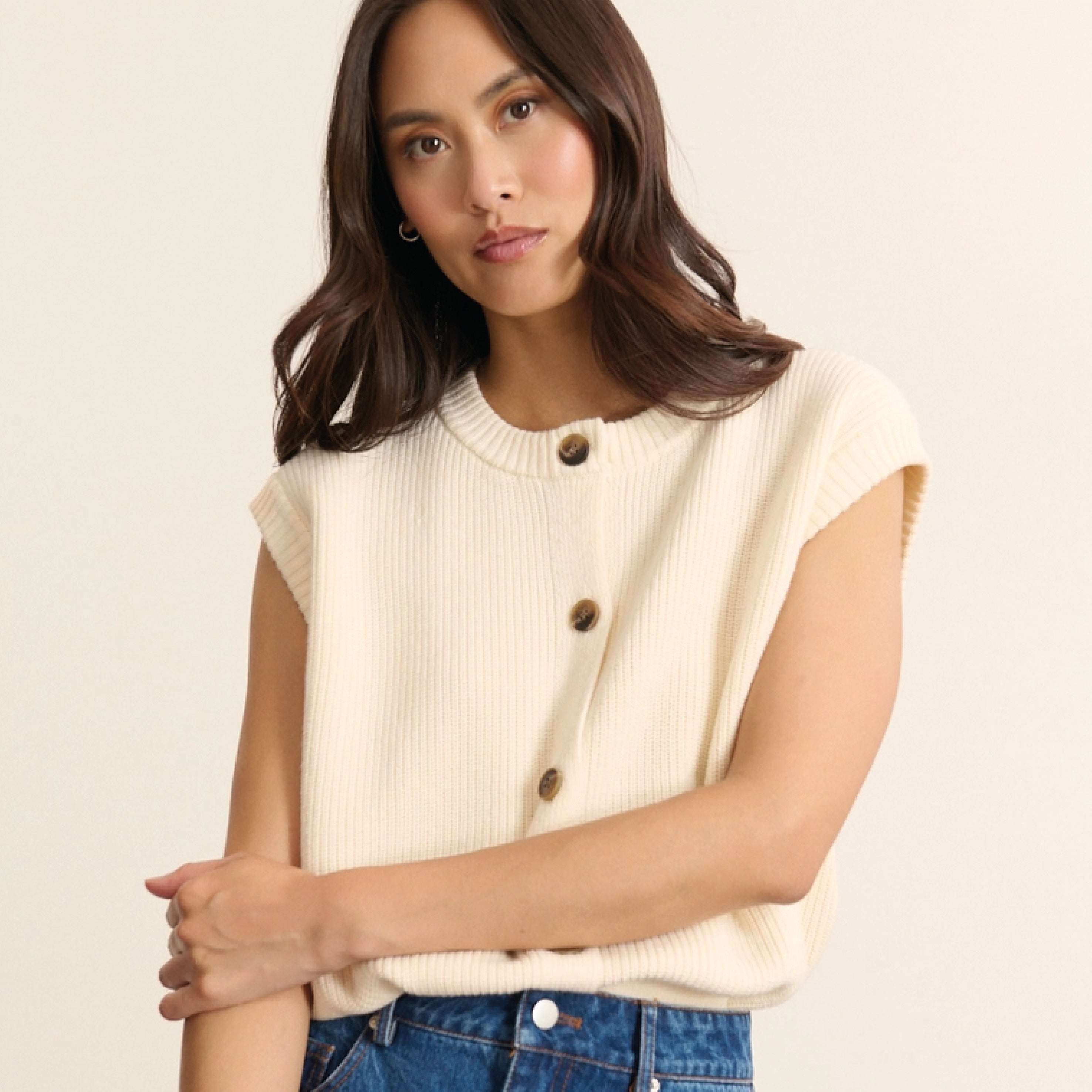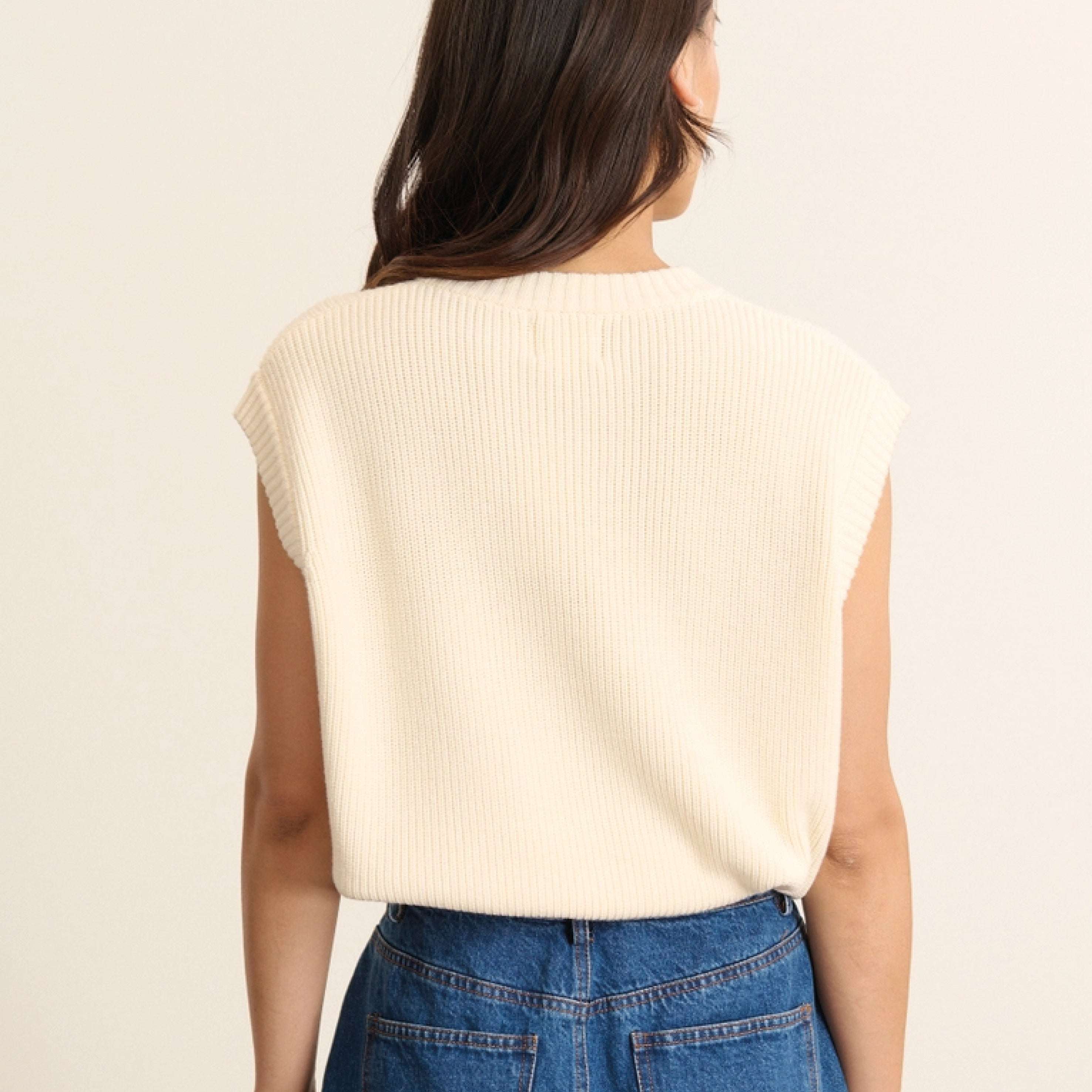 The Garance Paris Ecru Bisou Knit Vest is a sleeveless vest made in a soft and light material. The perfect layering piece or styled on its own for an effortless cosy look.