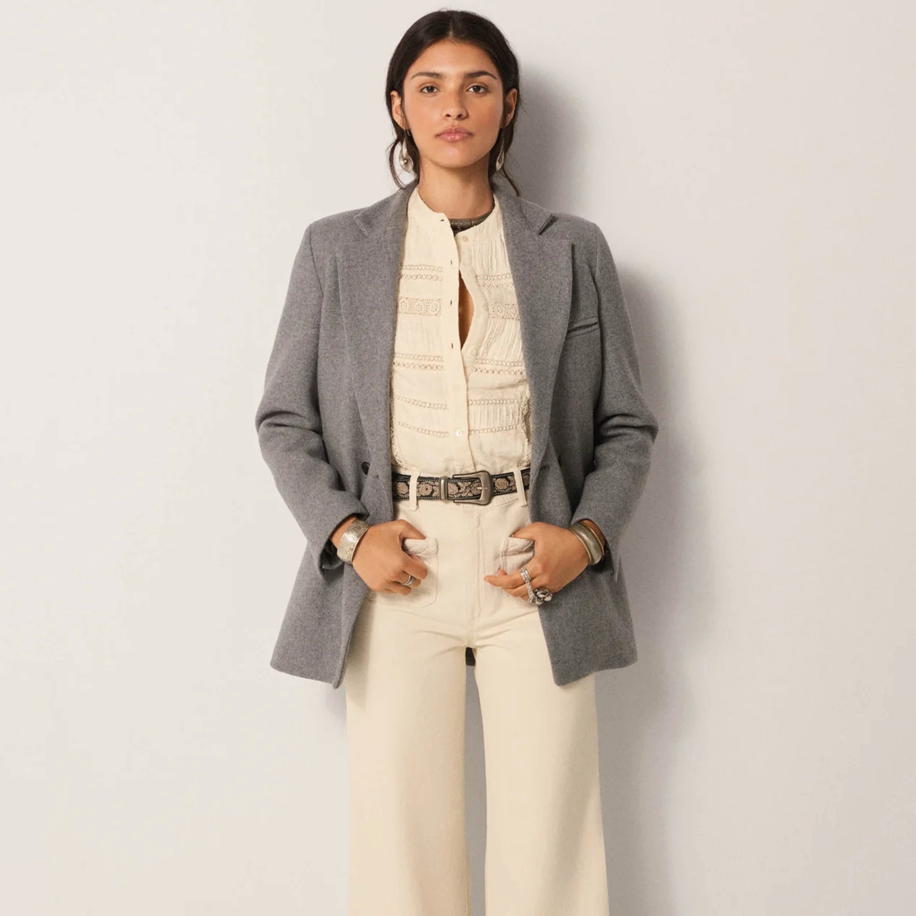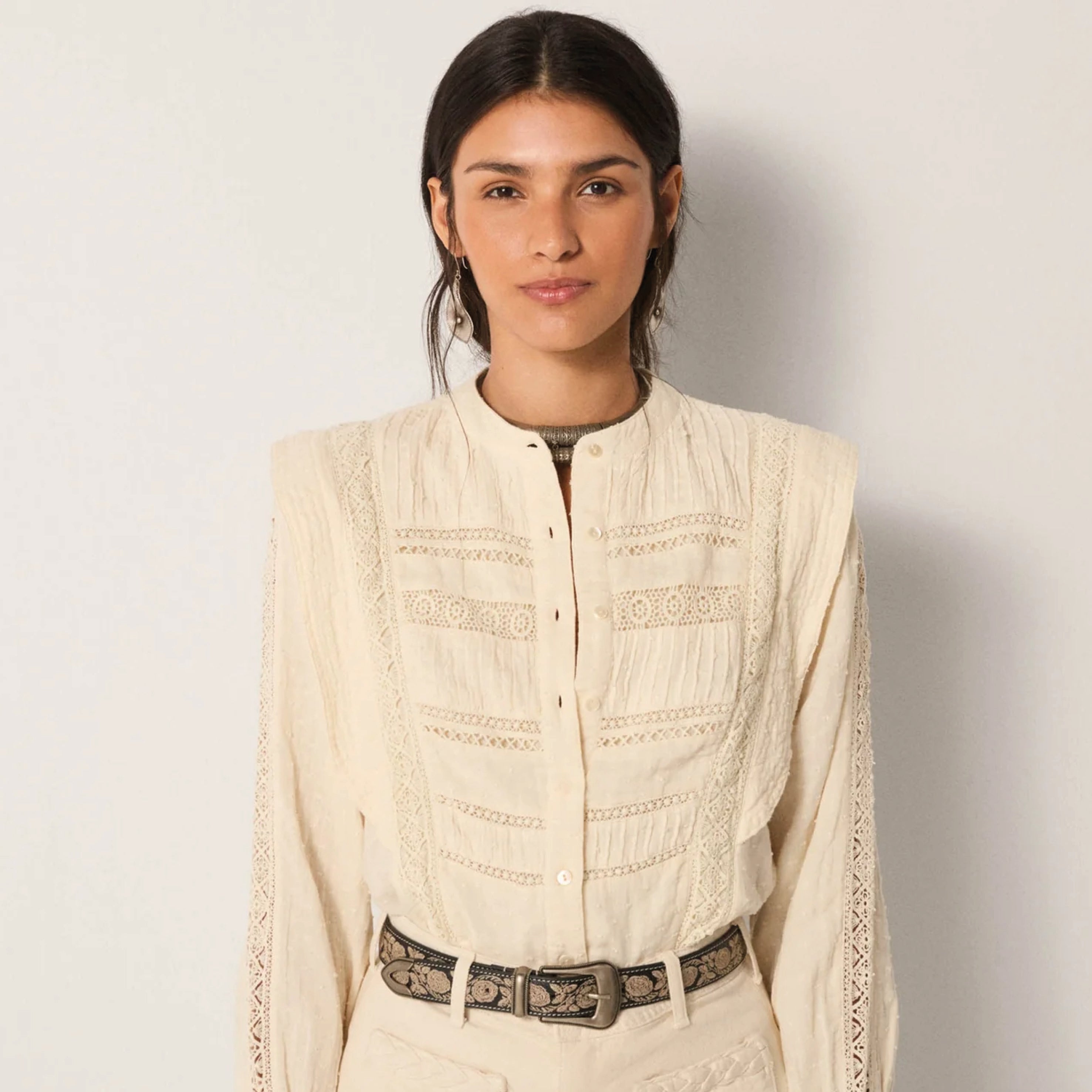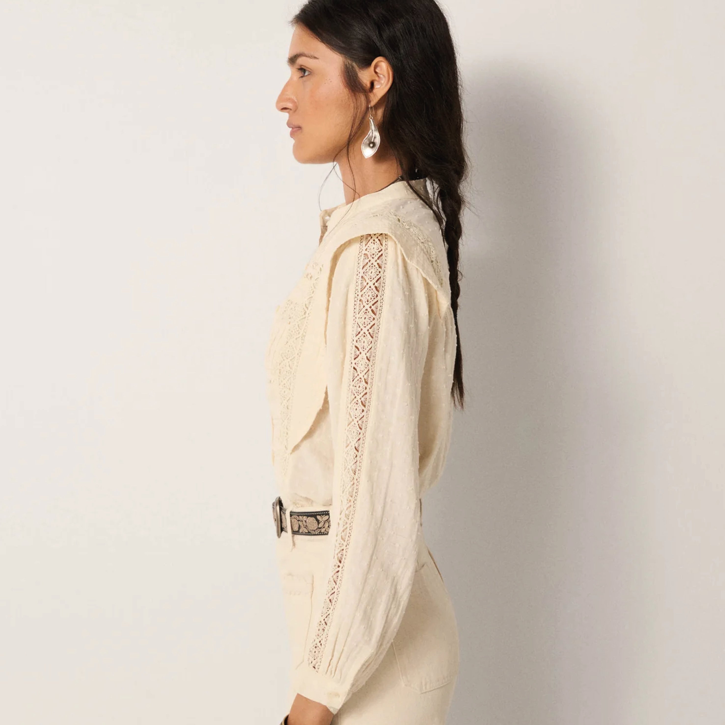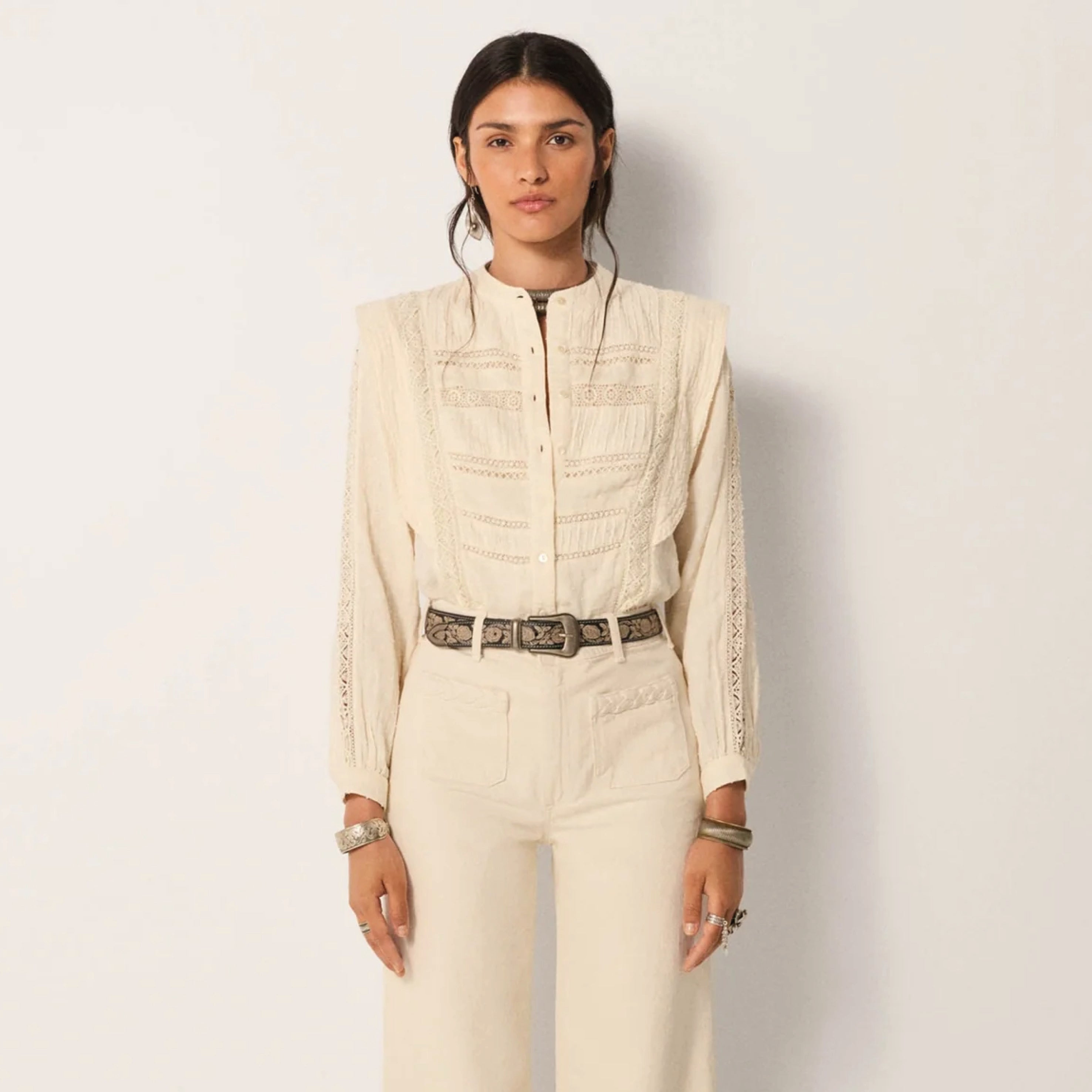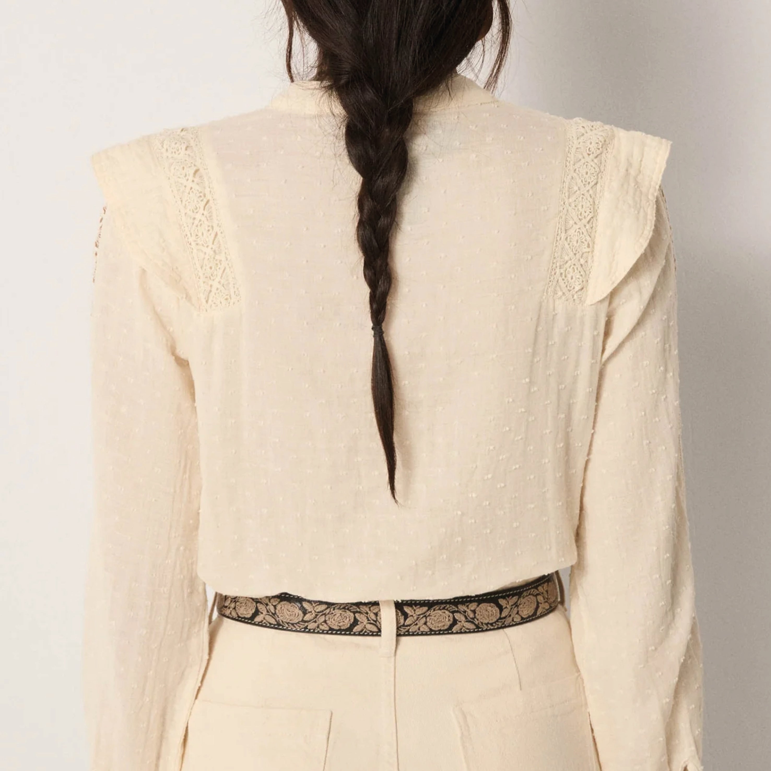 The soft cotton gauze shapes the Maison Hotel Romantic Denim Blanca Blouse, its airy hand balanced by the structure of lace inserts and tonal embroidery. The cut is straight, with a high round neckline and gently gathered shoulders that enhance its delicate strength.