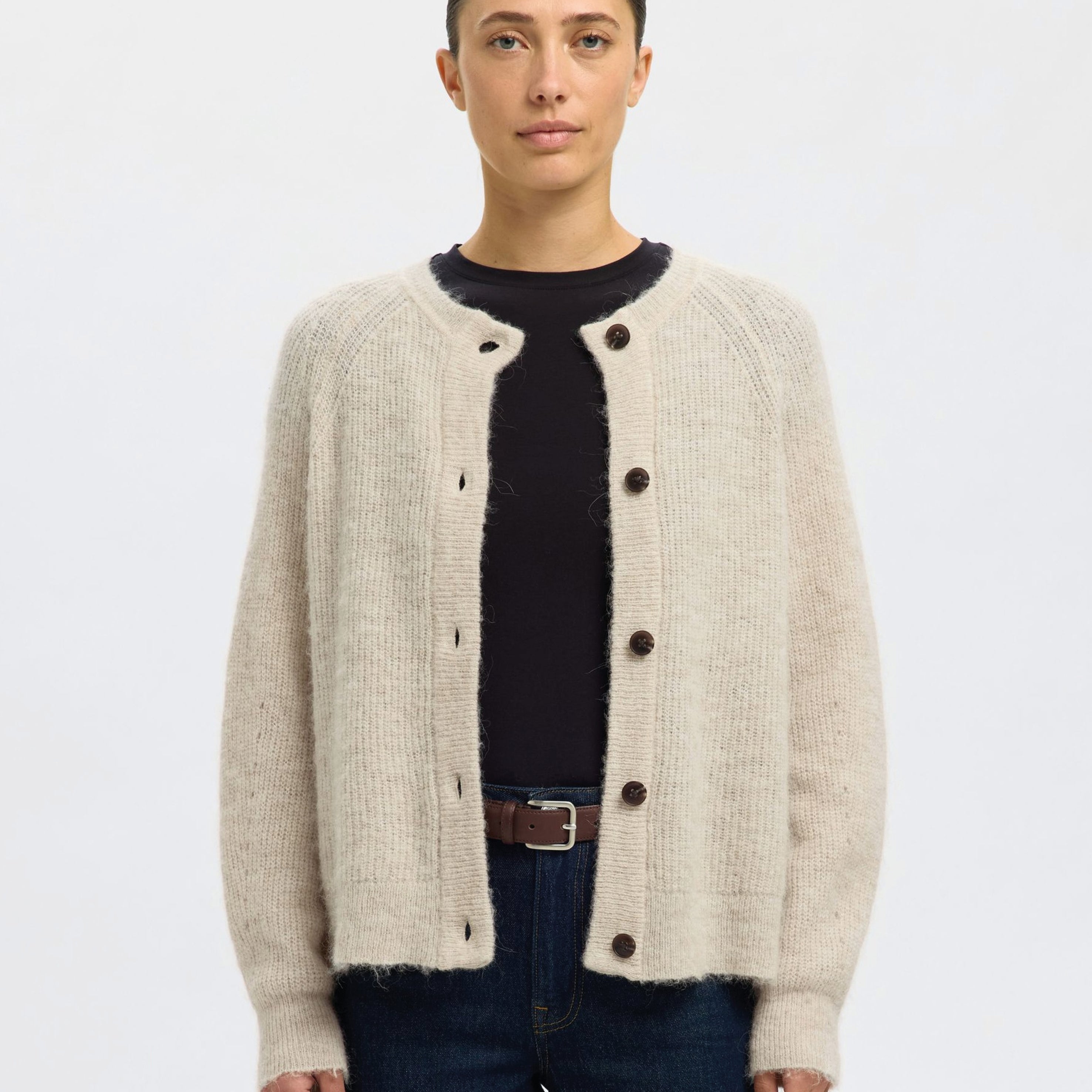 What's better than throwing on a cosy cardigan on a cold day? The Selected Femme Birch Lulu Cardigan is made from a soft alpaca-wool blend with a bit of stretch for extra comfort. The long raglan sleeves have drop-stitch details and end in fitted ribbed cuffs. Style it with light-wash denim or a leather mini skirt.