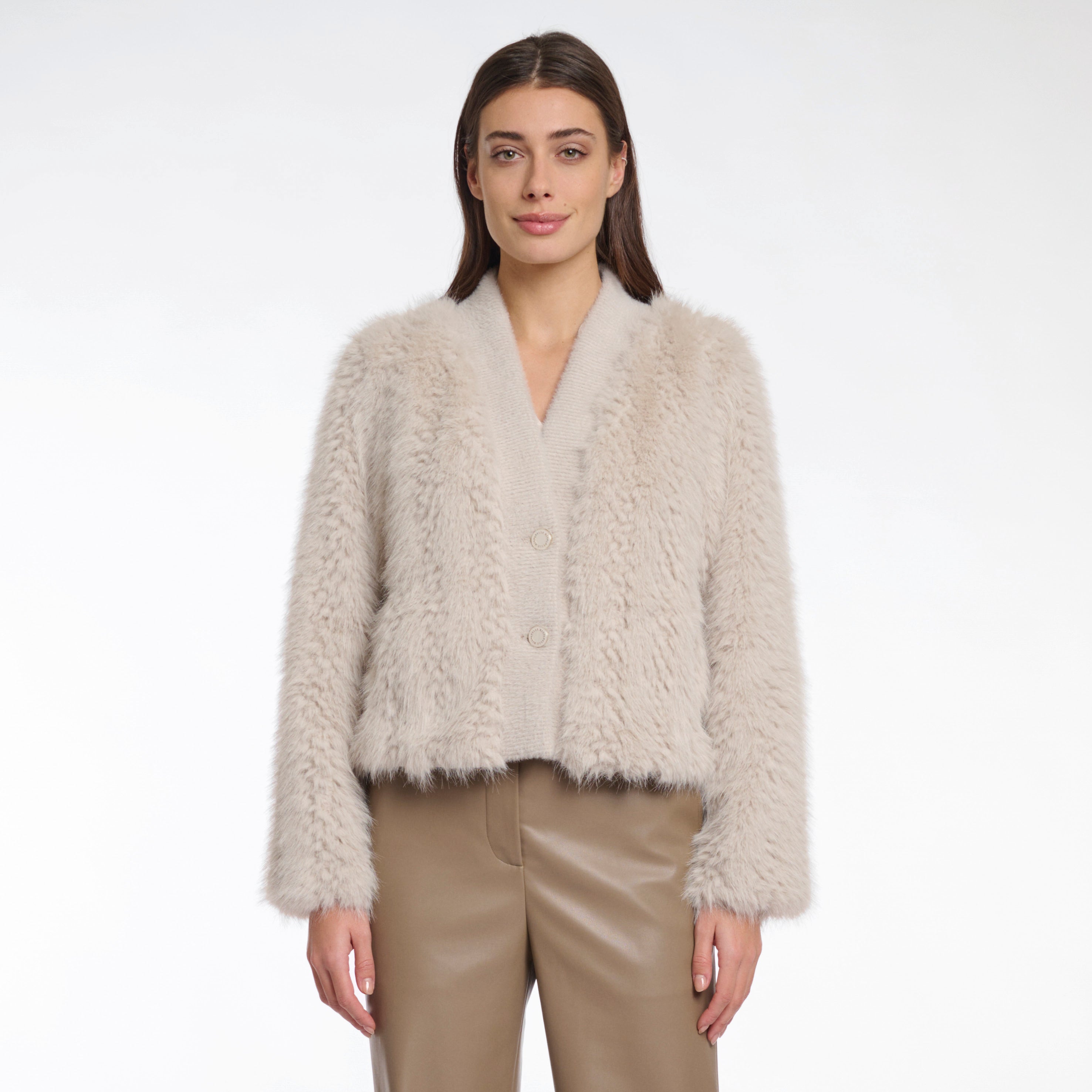 Indulge in ultimate cozy chic with the Rino & Pelle Birch Chaimae Jacket. This stylish cardigan jacket features a luxuriously fluffy, faux-fur body paired with a contrasting knitted middle front. Complete with side slit pockets for practicality and a classic button closure. Stay warm and on-trend all season long.