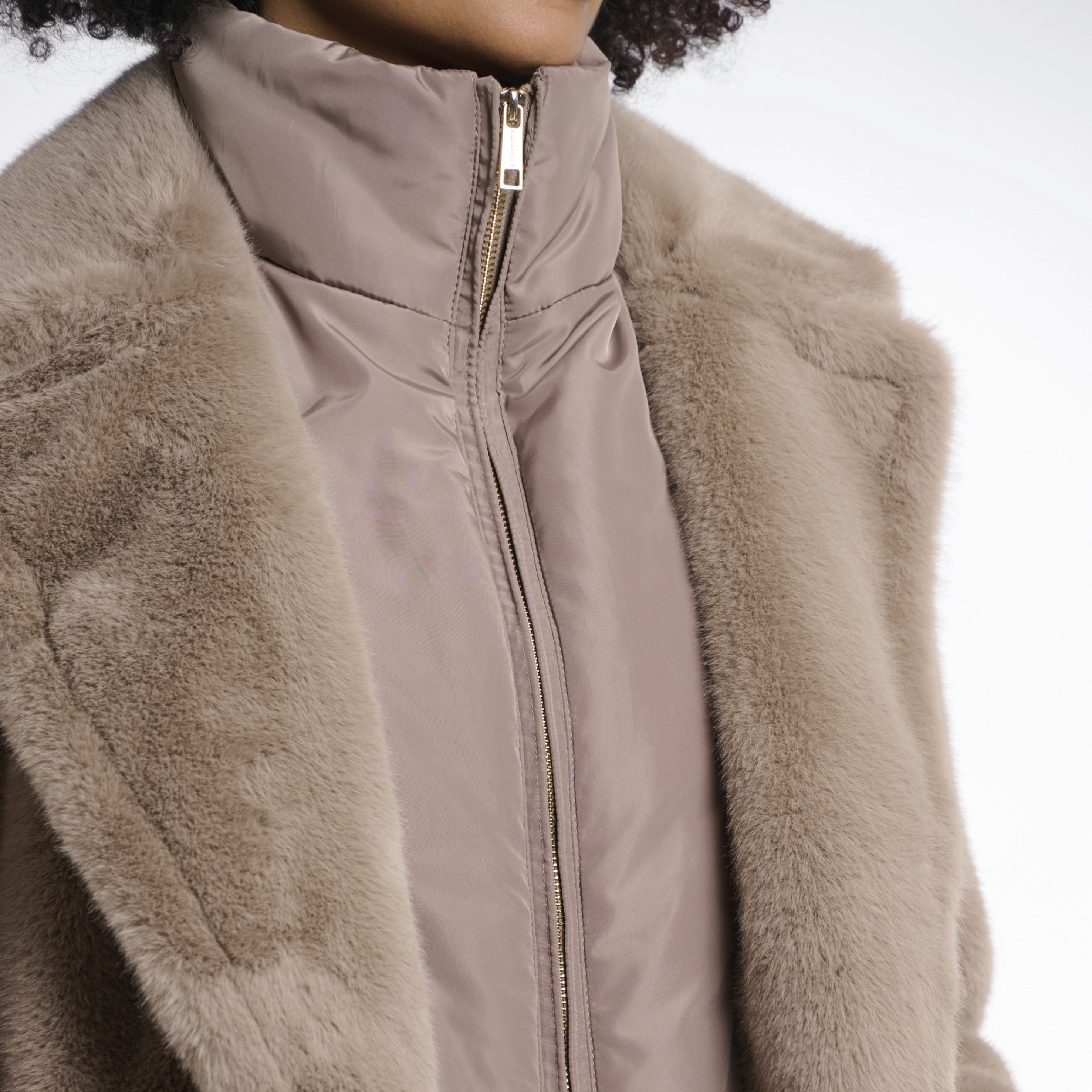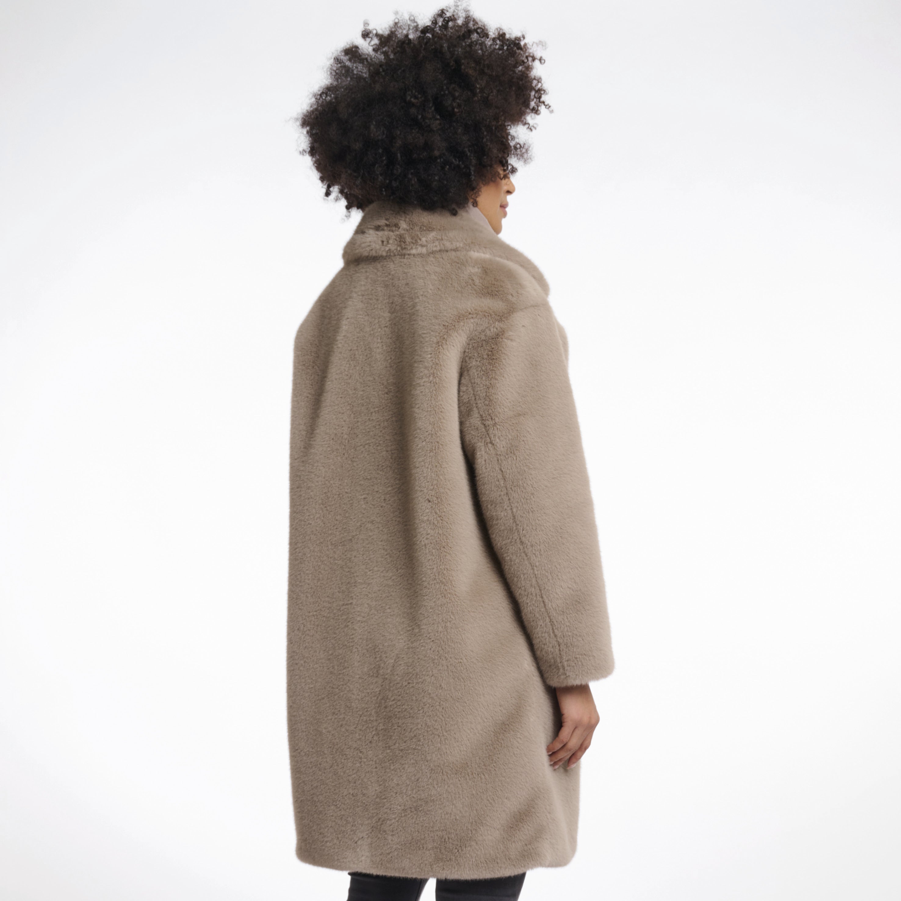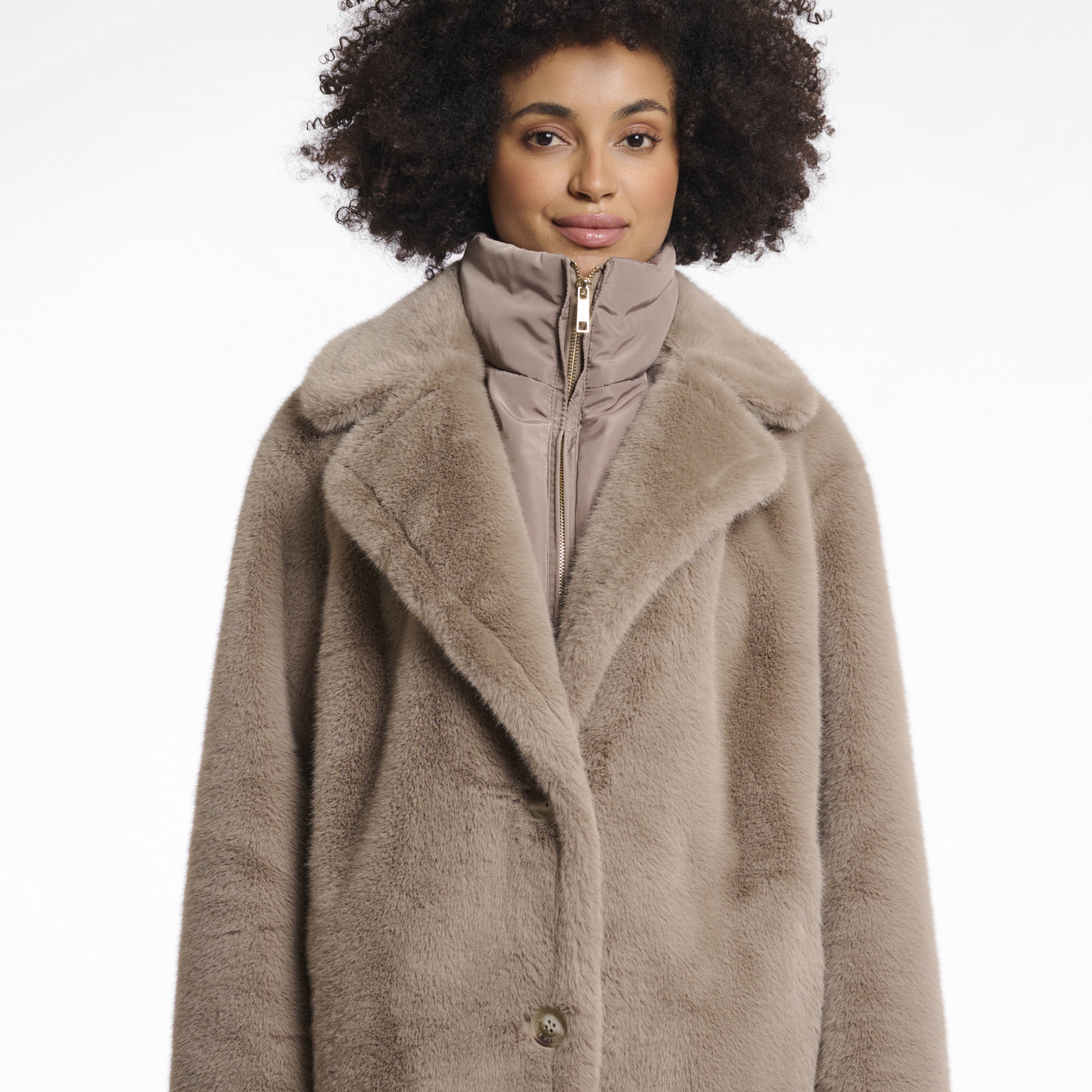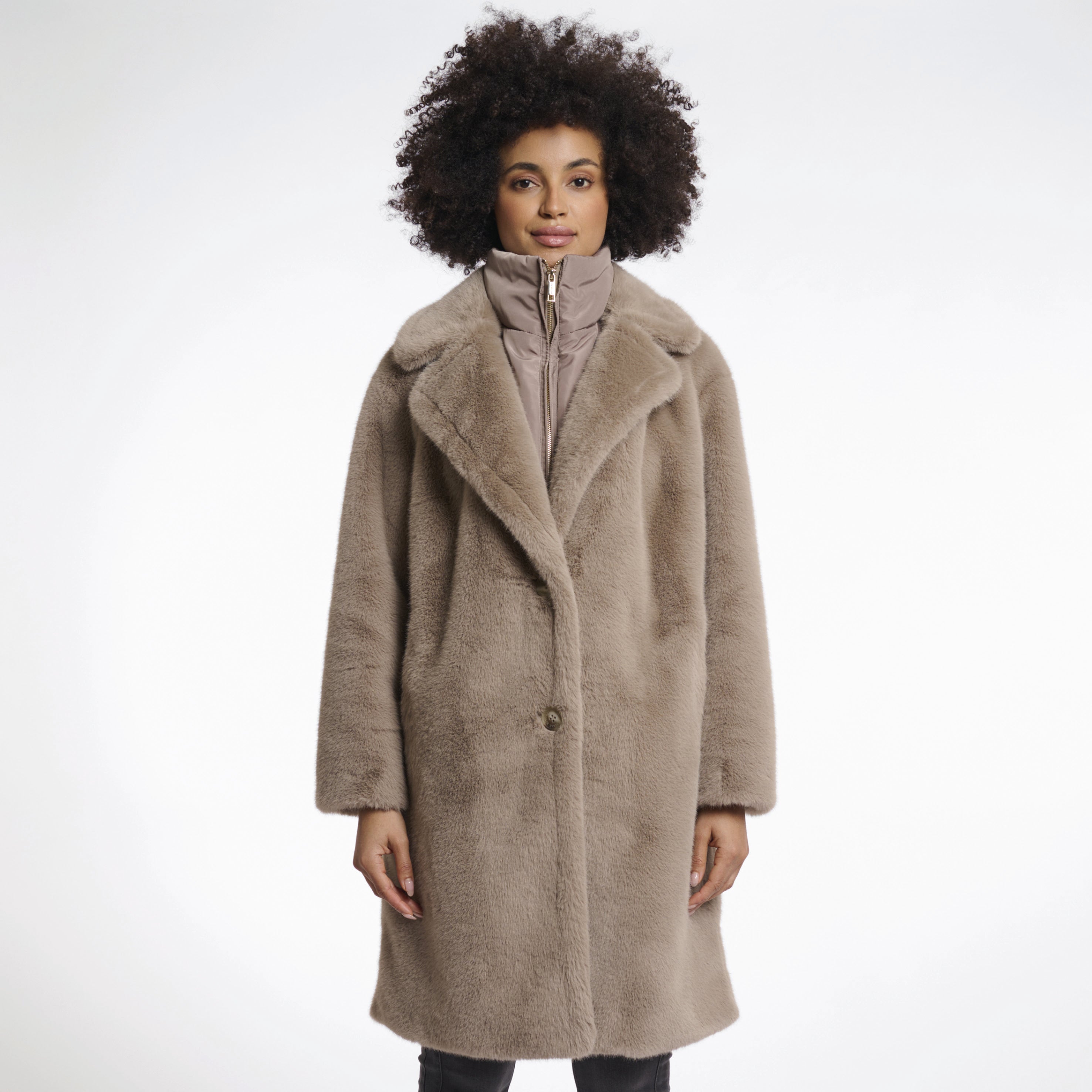 - Faux fur single breasted coat with detachable hood