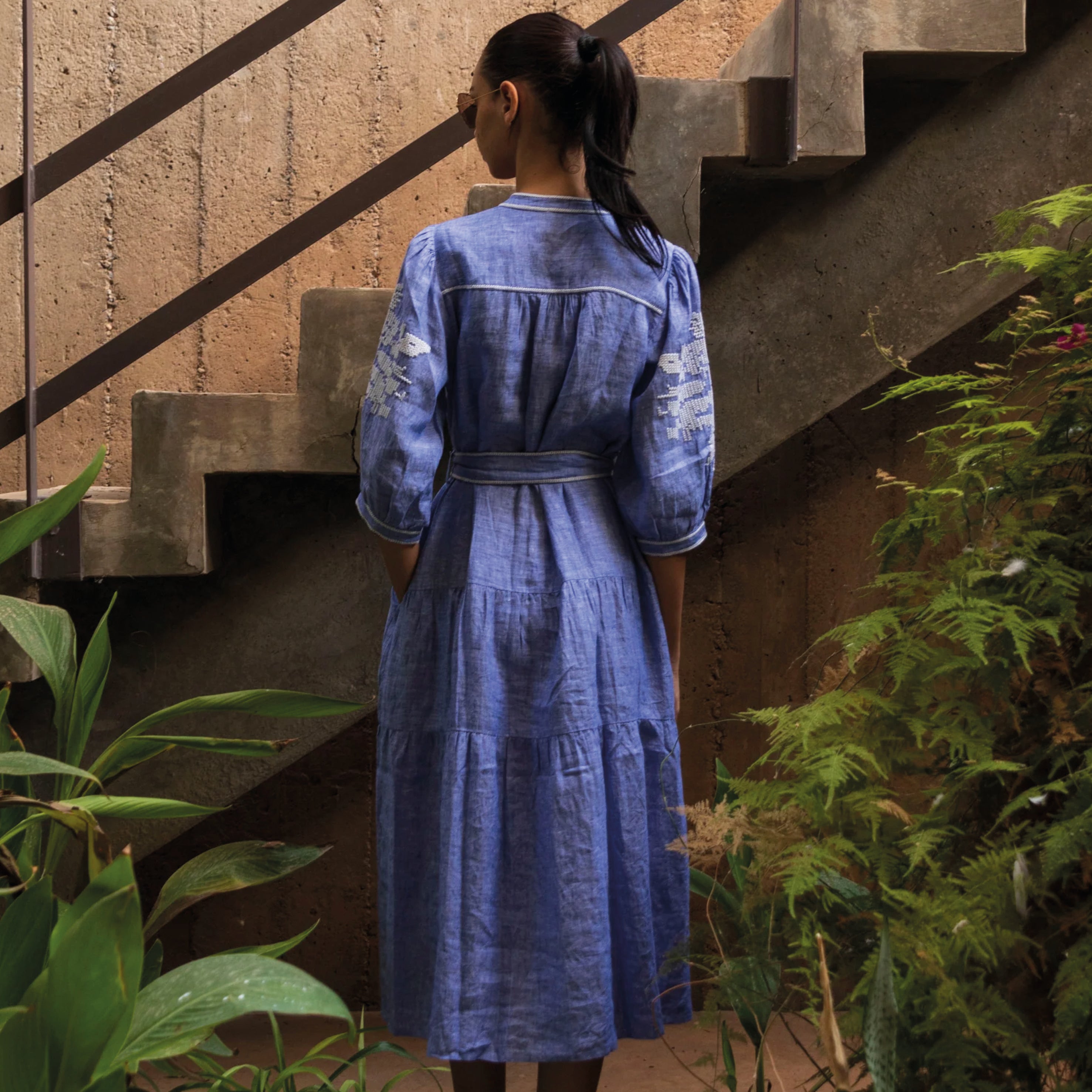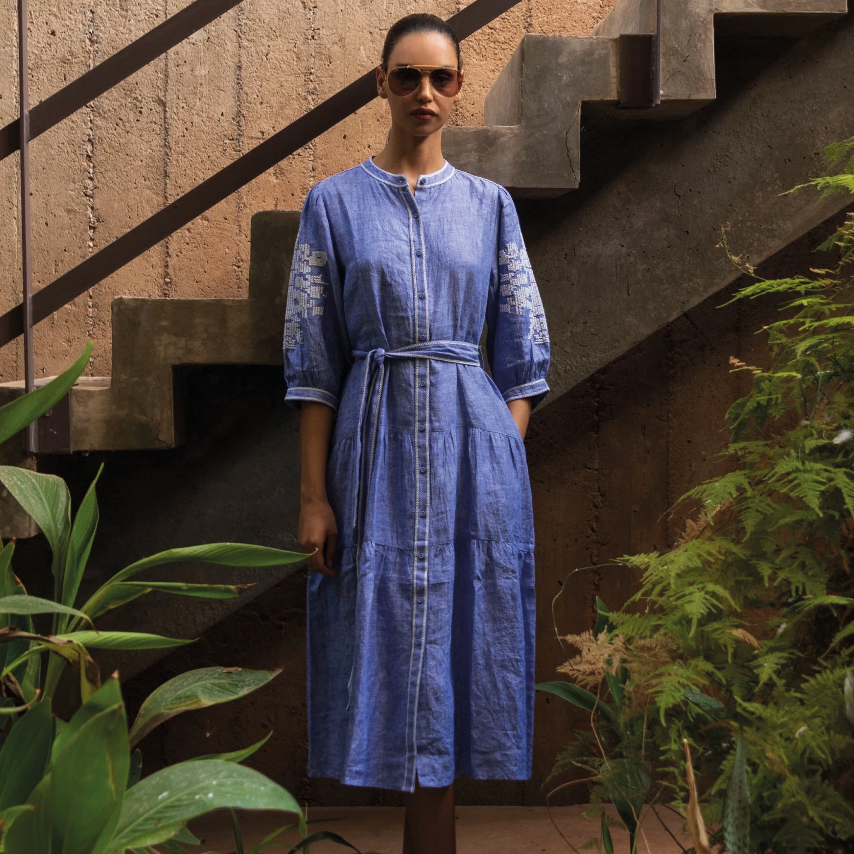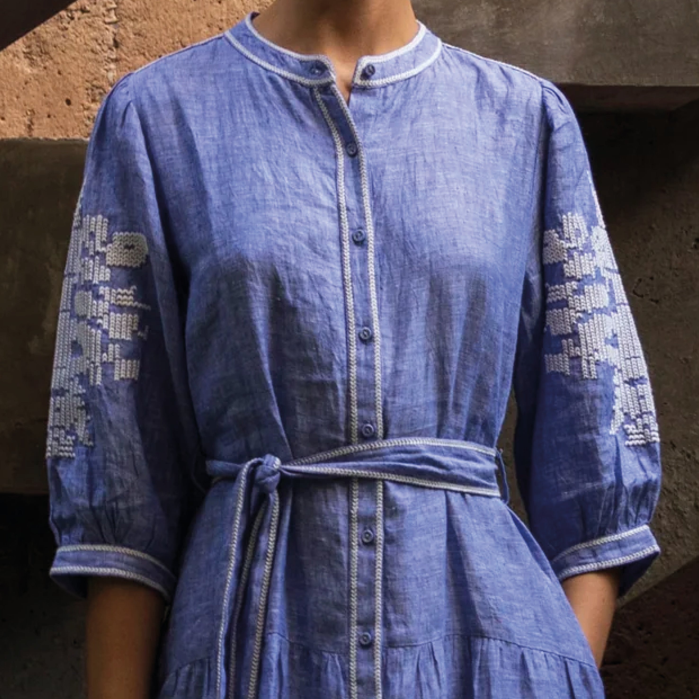 This Rose and Rose Blue Chambray Pine Dress is a wardrobe staple, taking you from day to evening with ease. Made from beautiful French Blue linen chambray, the styling seams are punctuated with herringbone embroidery, and the sleeves feature embroidered flower motifs, handy pockets are concealed within the side seams. Wear with some buttons undone to reveal a little décolletage and show some leg.