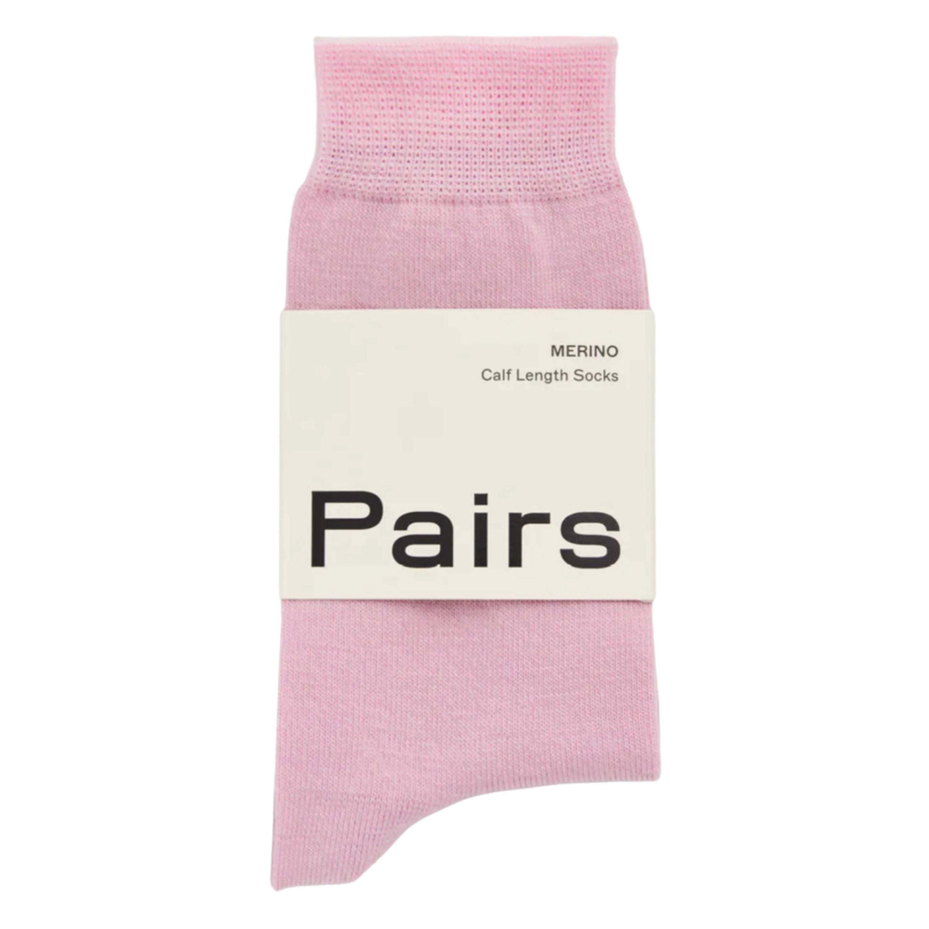 The Pairs Sugar Pink Calf Length Merino Socks are smooth and silky on the skin, odour-resistant and temperature-regulating. These merino calf-length socks are an everyday staple in a soft, barely there pink.