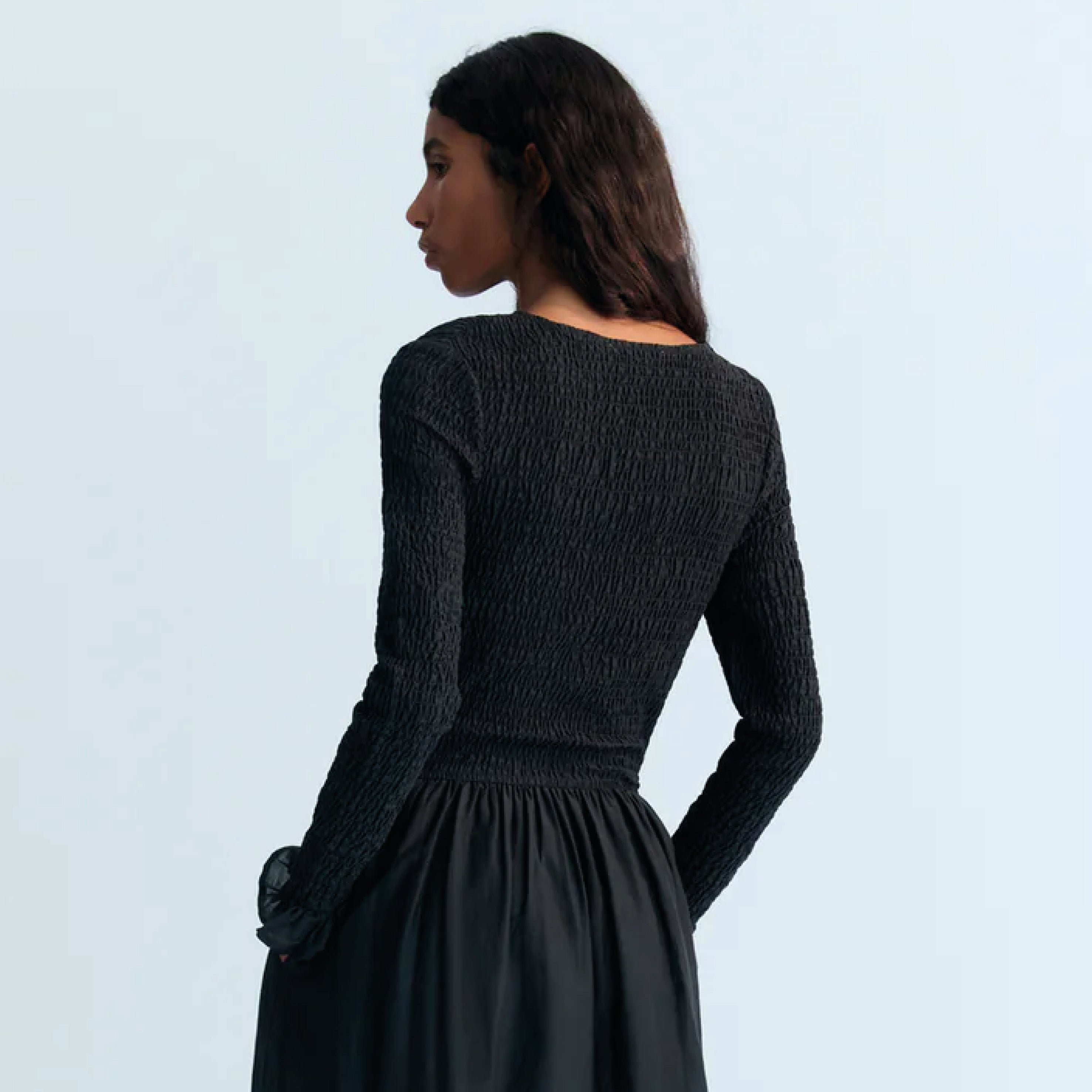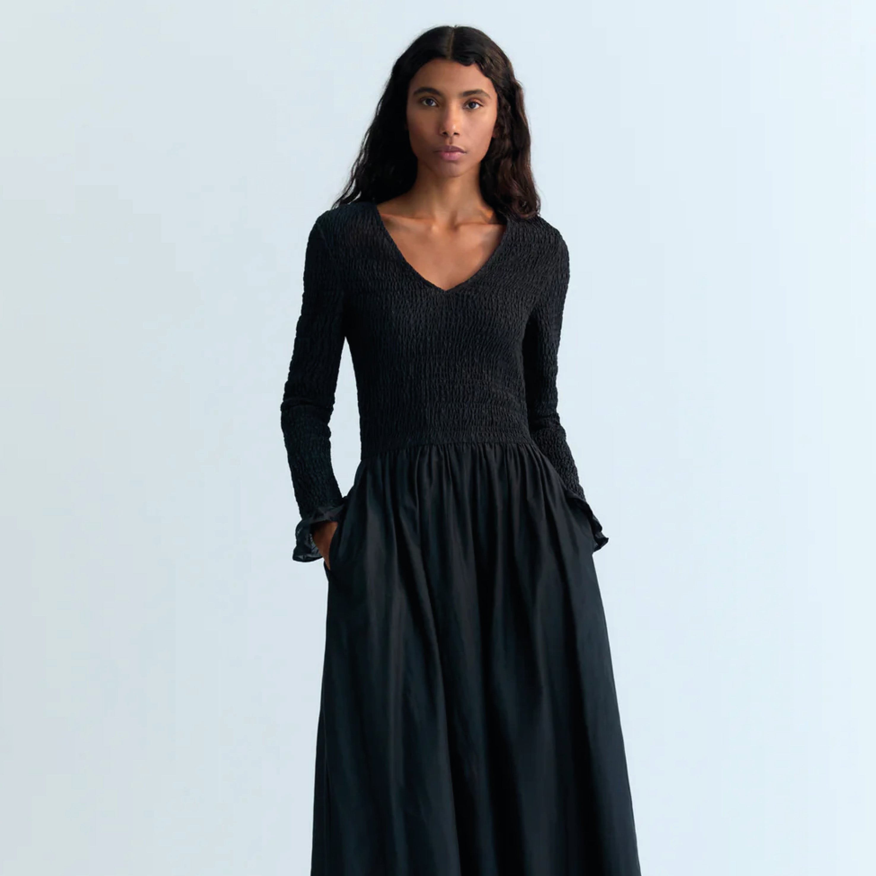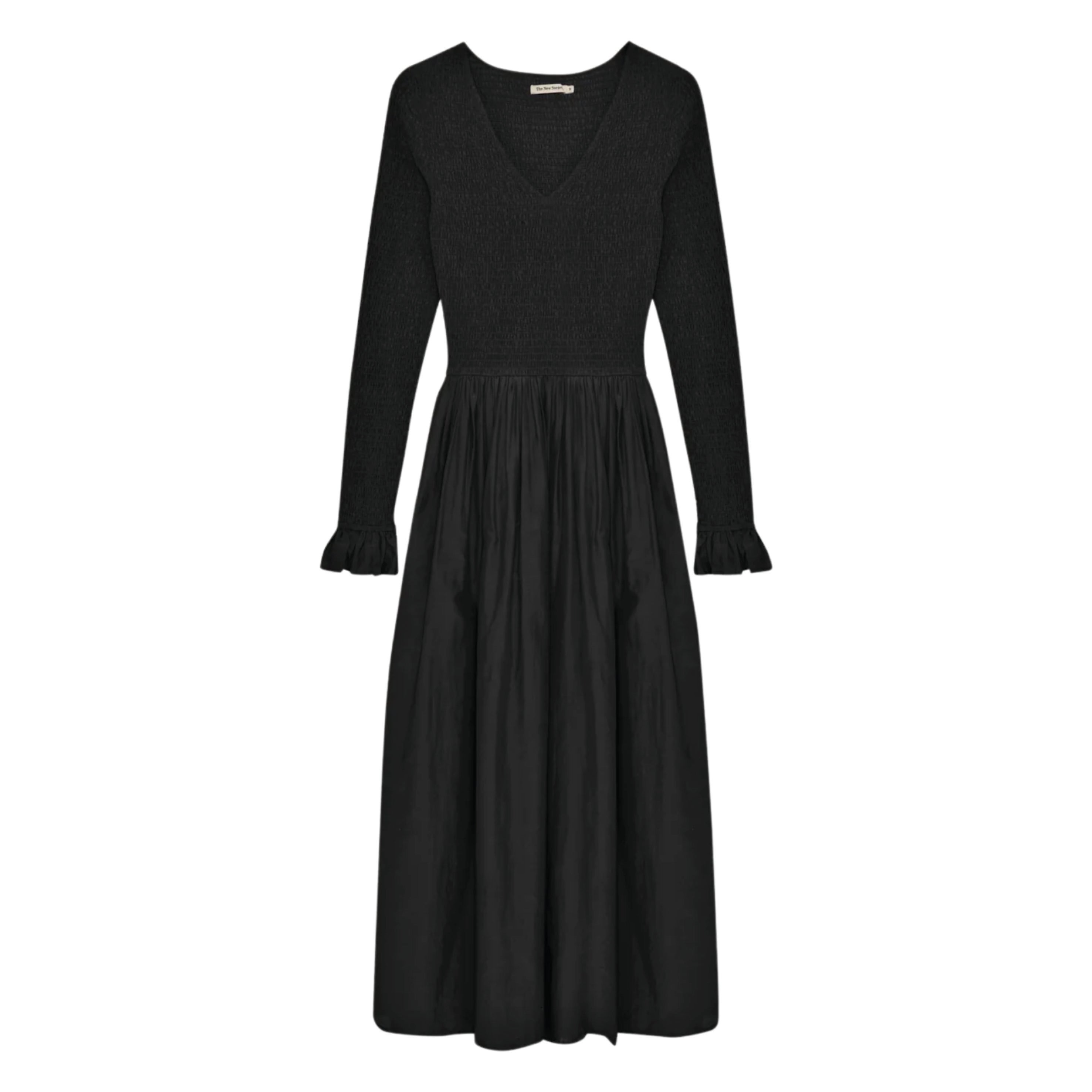 The Eclipse Noir Luly Dress is crafted from high-quality cambric fabric. Designed with a flattering smocked bodice and a graceful V-neckline, this versatile style offers both comfort and elegance.