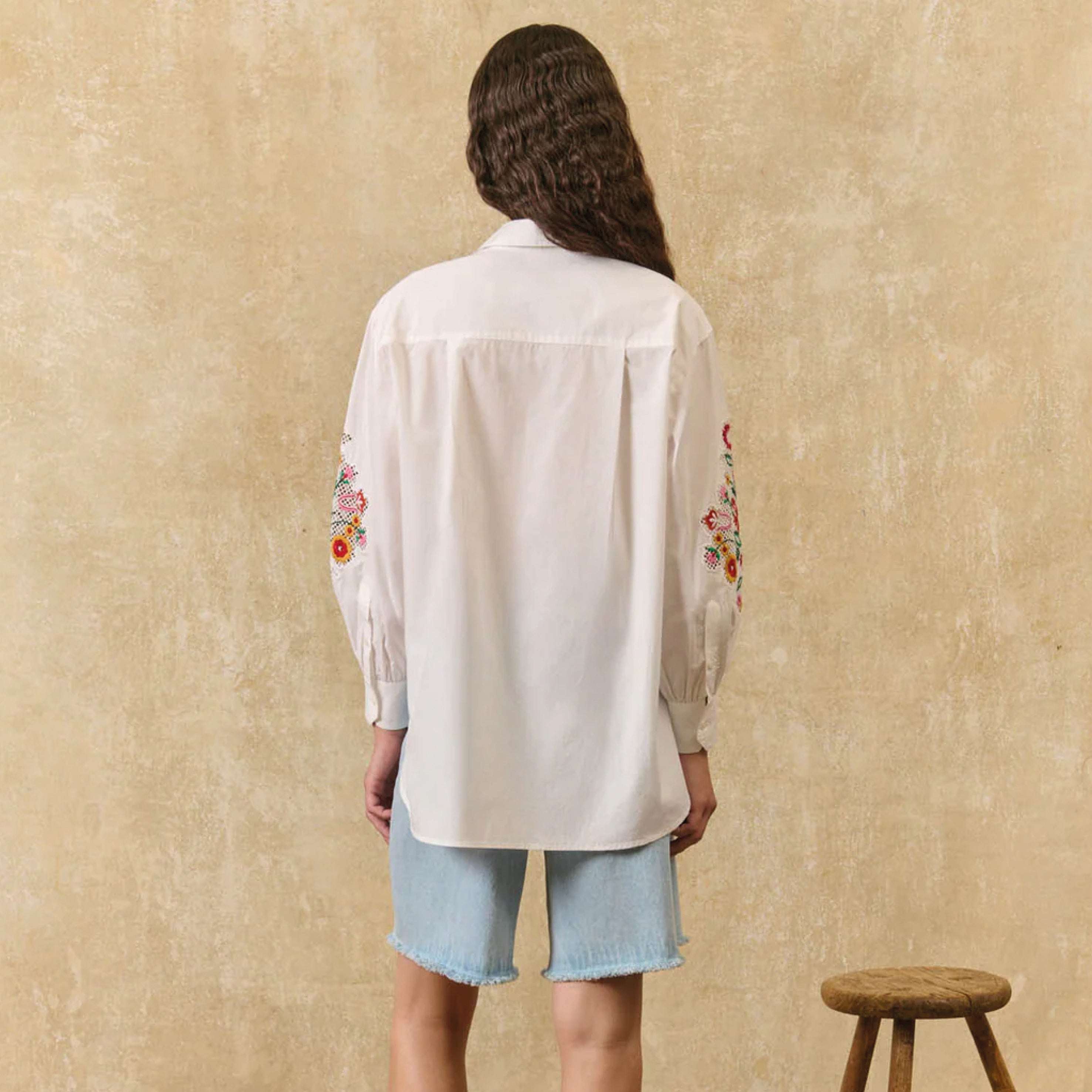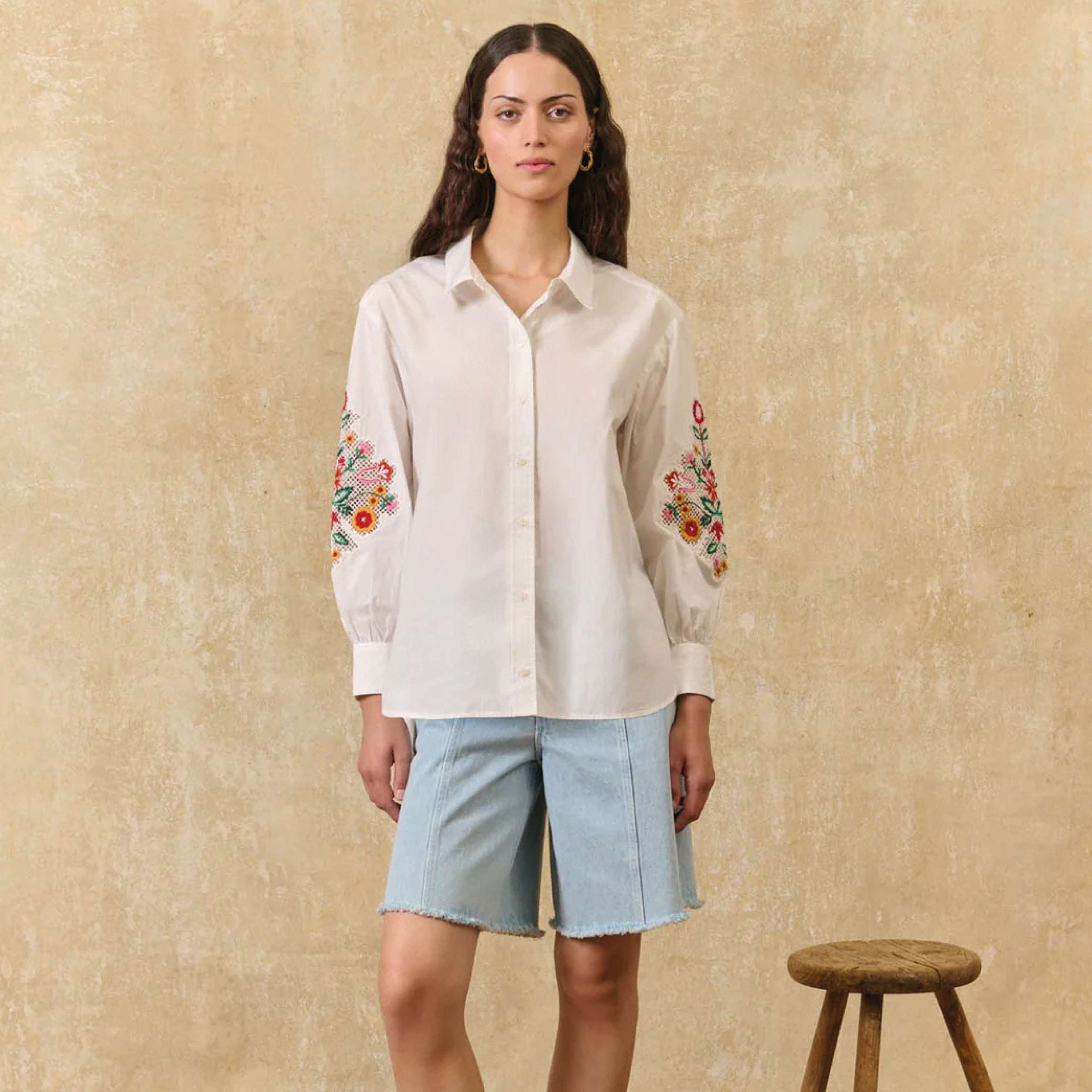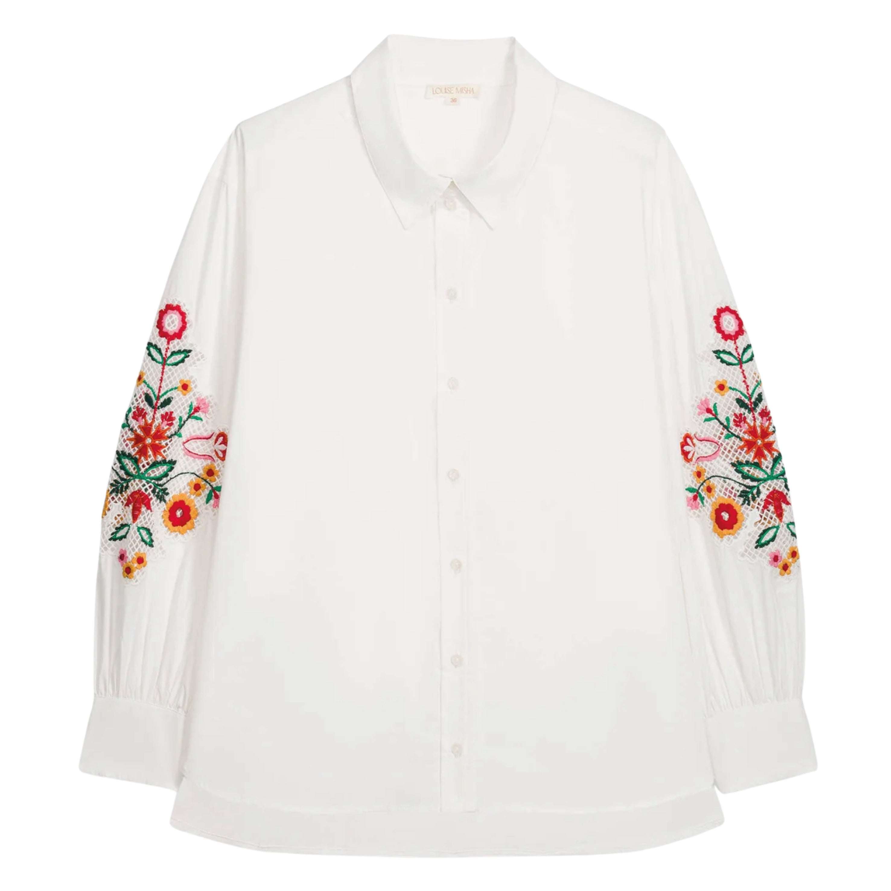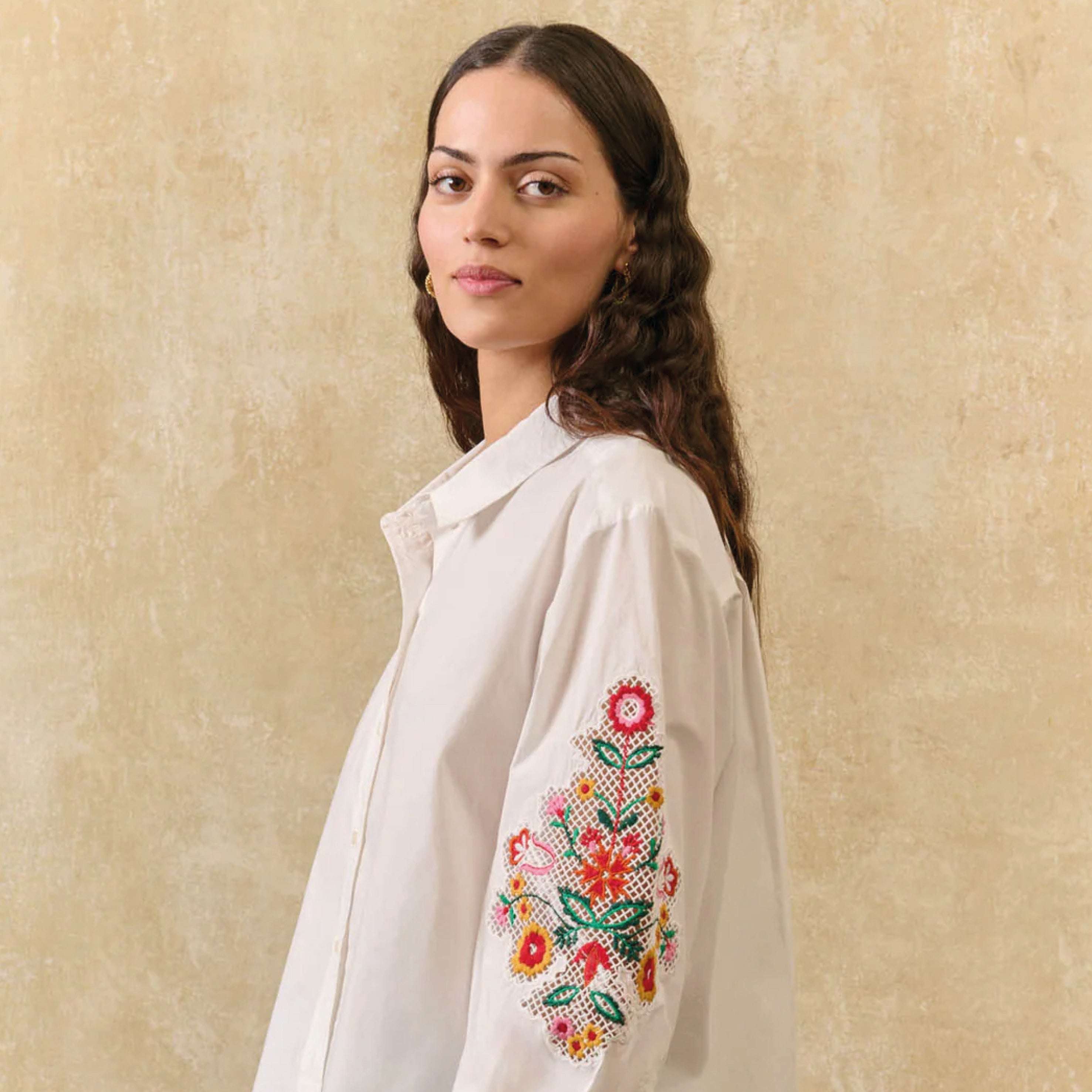 The Louise Misha Off White Reynald Shirt is crafted from 100% organic cotton and features puff sleeves with openwork embroidery in a gorgeous crisscross pattern.