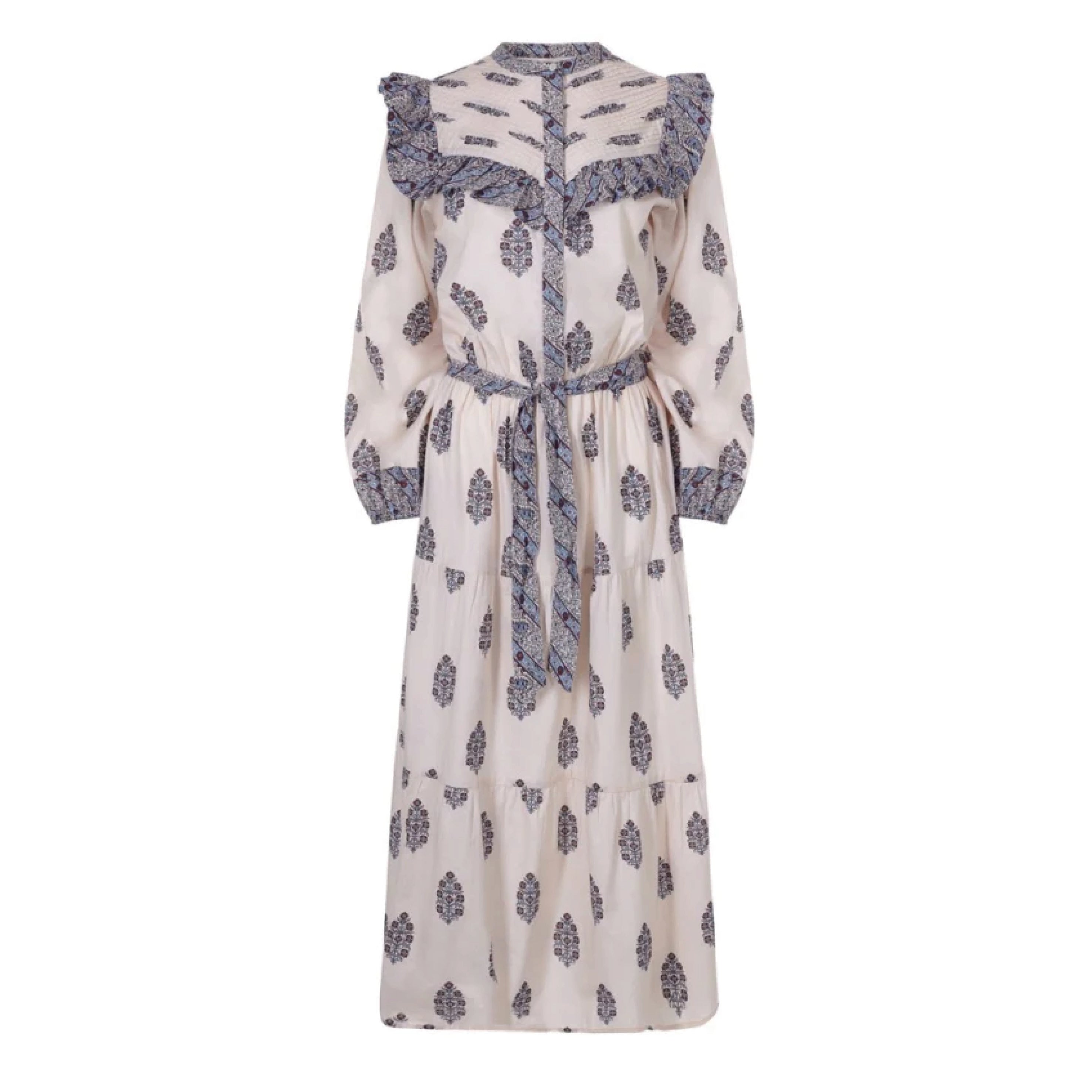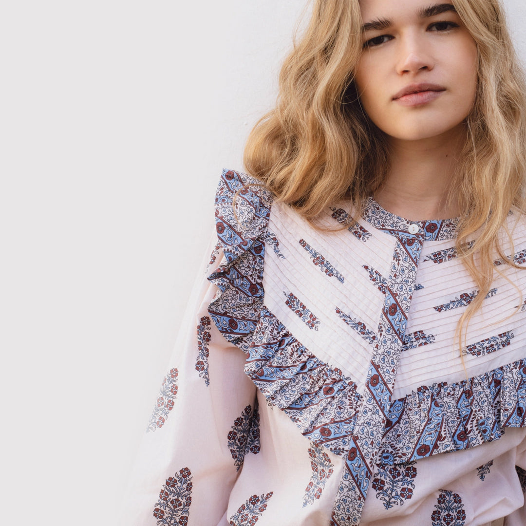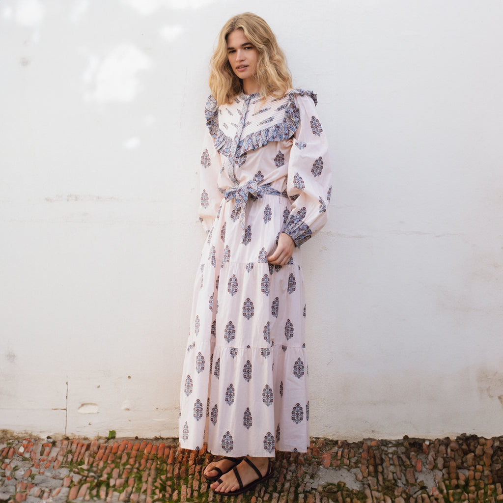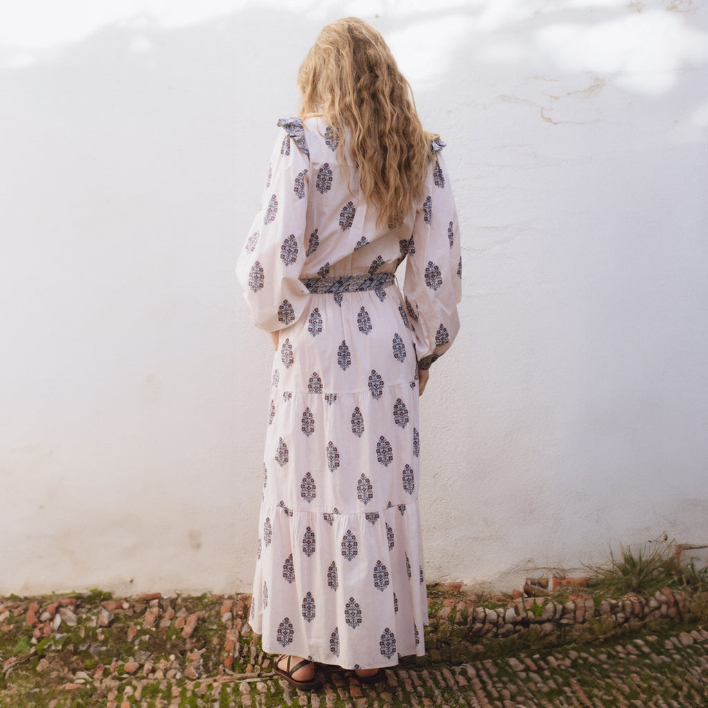 Made from midweight organic cotton poplin, our new Jane dress exudes a delicate blend of romance and vintage charm, evoking traditional Indian dress styles. Boasting a breezy silhouette with full length sleeves and a maxi length skirt. The wide sleeves are elegantly cinched with a cuff, while the front is adorned with ruffles and pleats. Gathering at the shoulders and cuffs adds subtle texture, and the elastic waistband is enhanced by a self-tie detail. Crafted from 100% BCI cotton poplin and made in India.