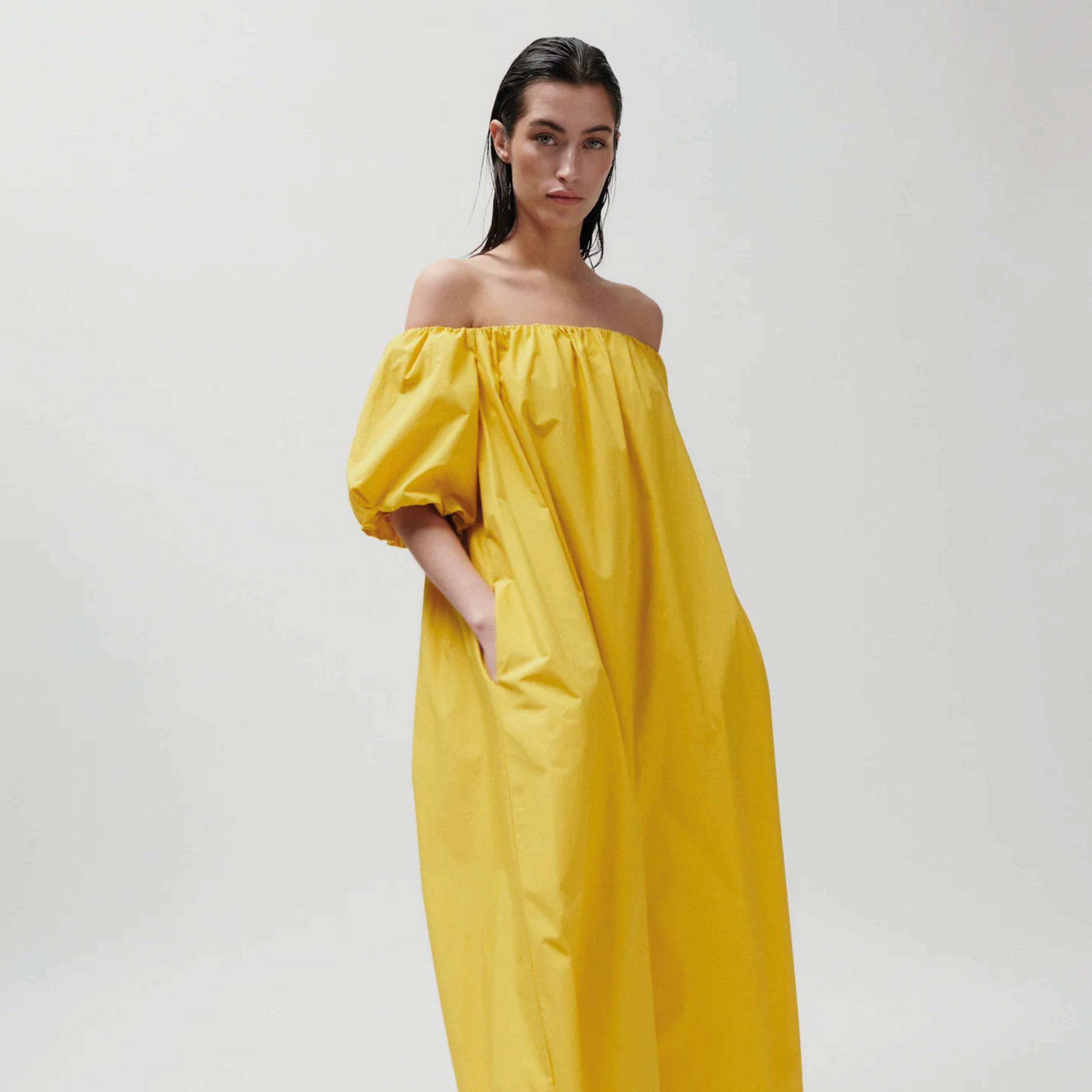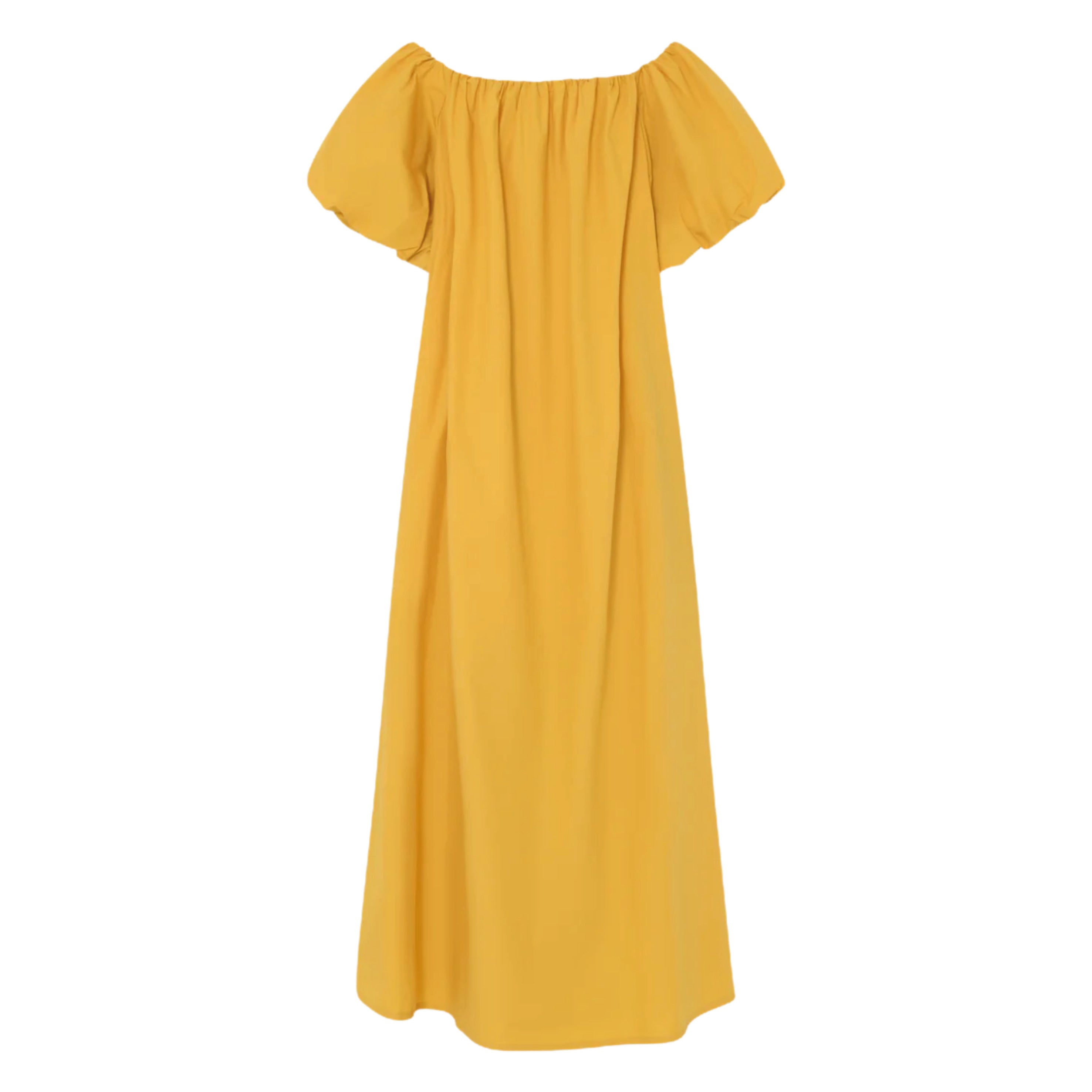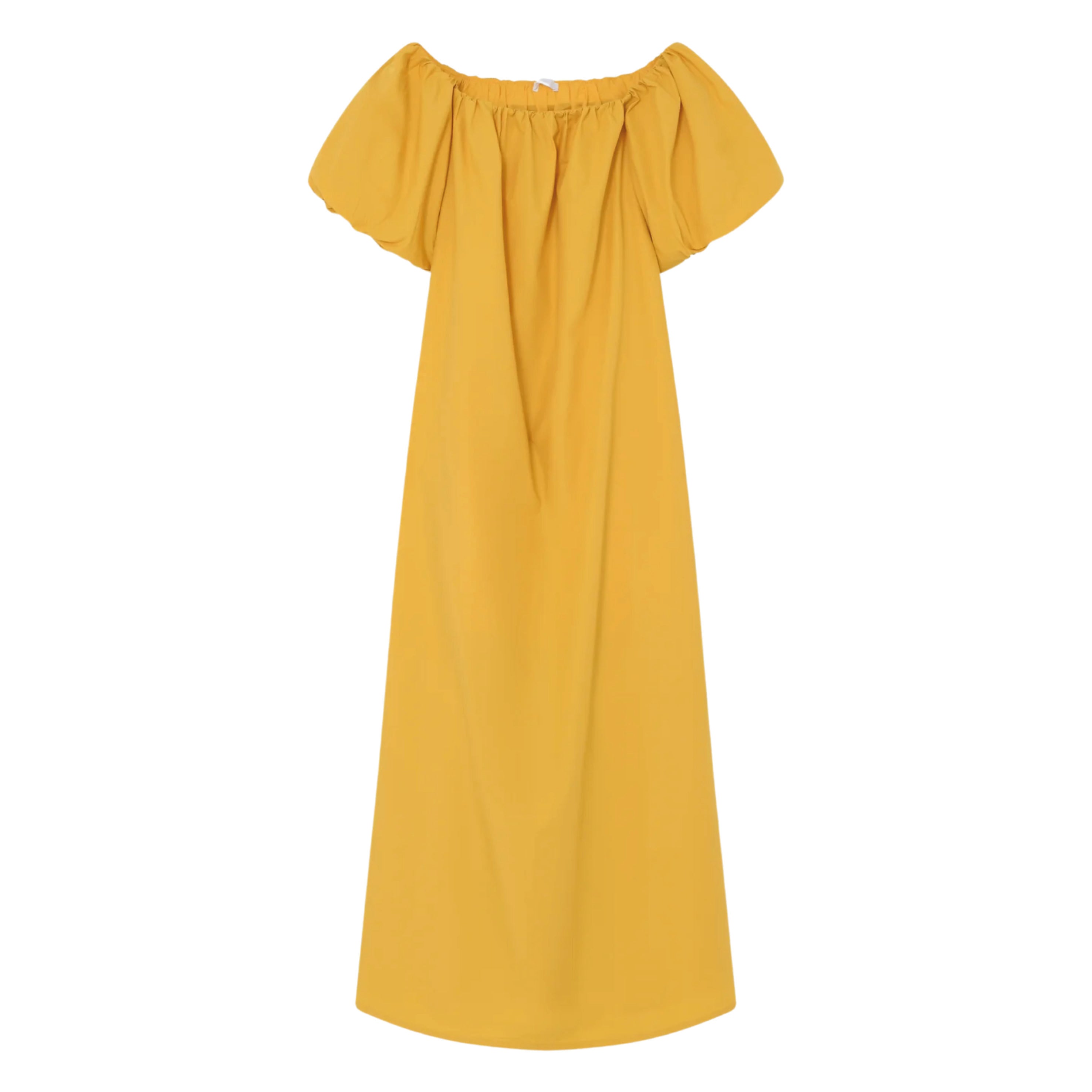 This ankle-length, crisp off-the-shoulder 2NDDAY Fine Crispy Poplin Spicy Mustard 2ND Gia Dress features elasticated bubble sleeves and side pockets. Wear this loose silhouette with flip flops and minimal jewellery for a unique, elegant look.
