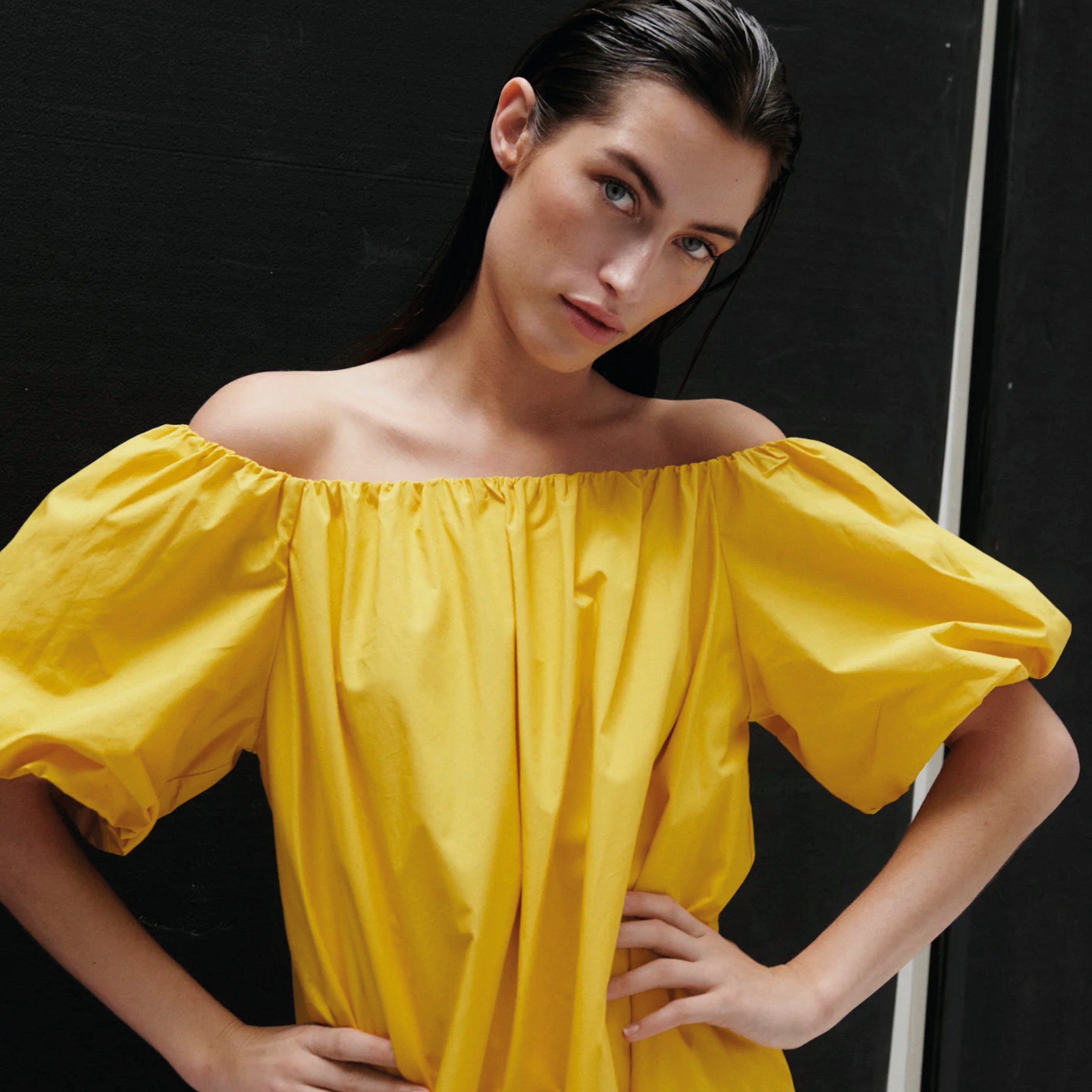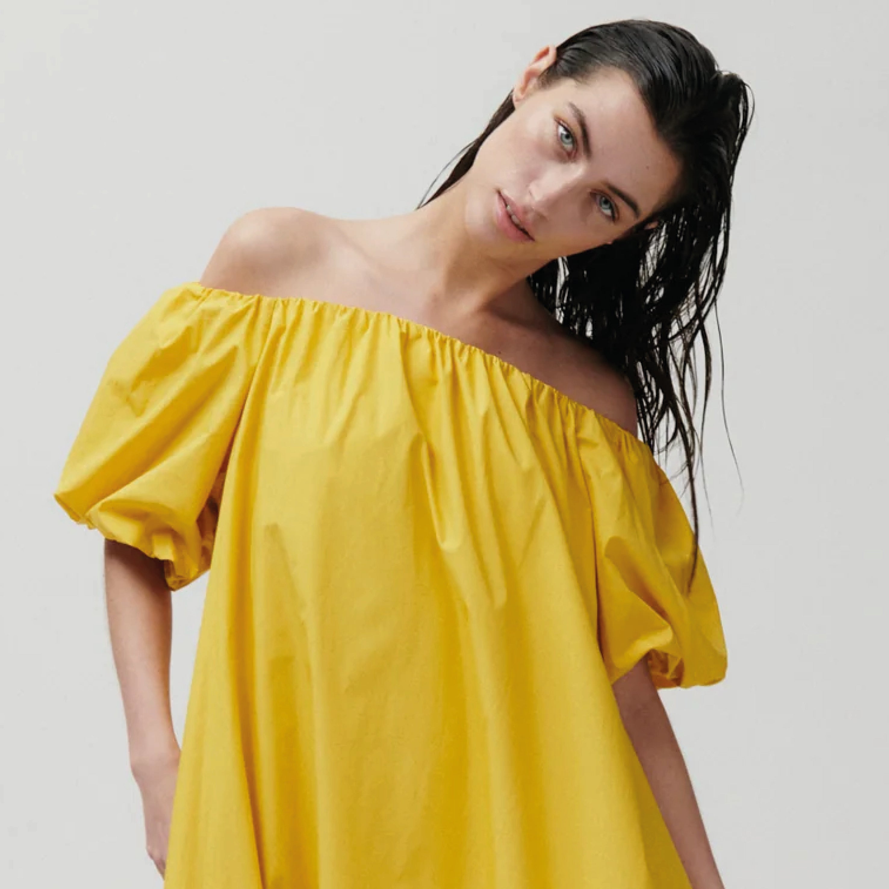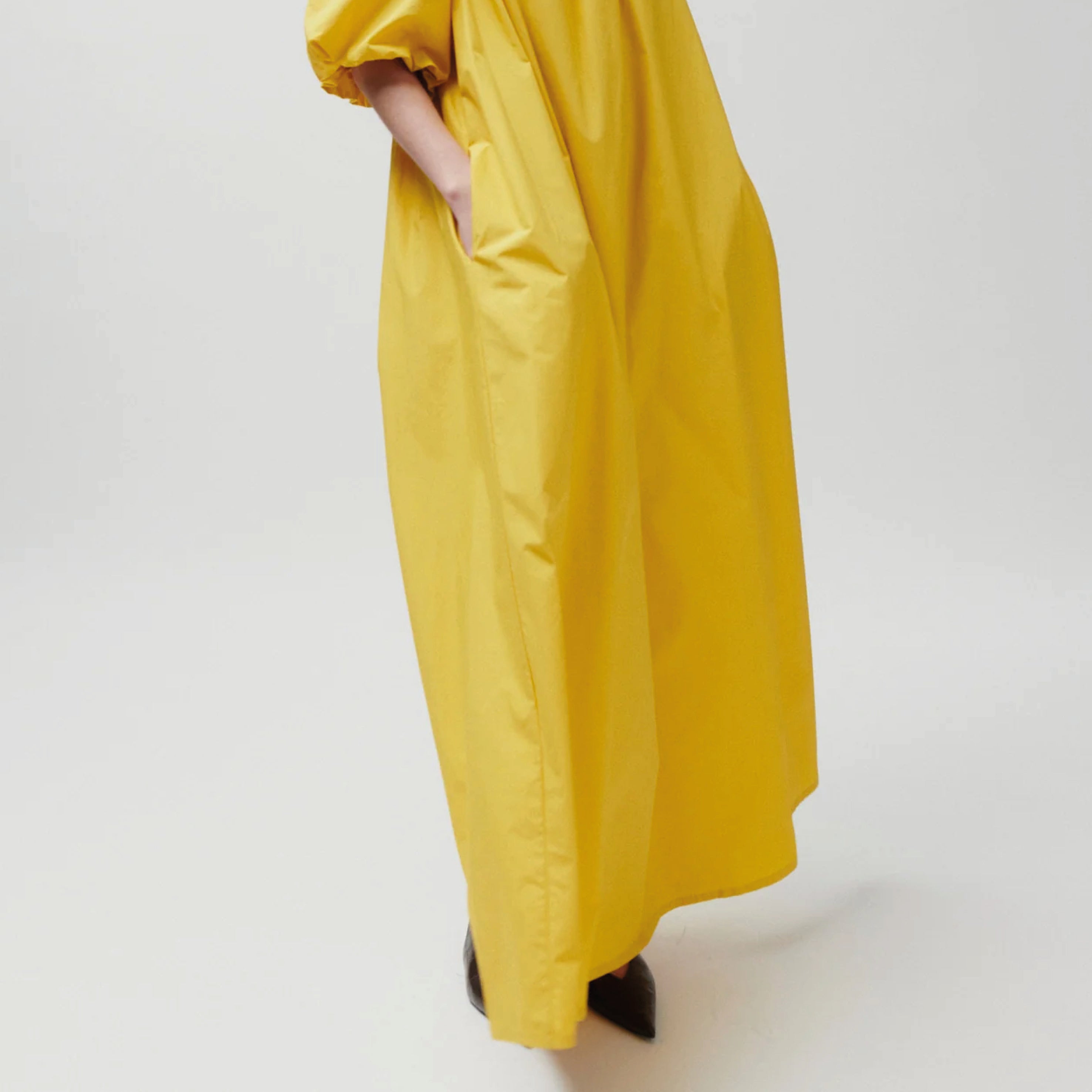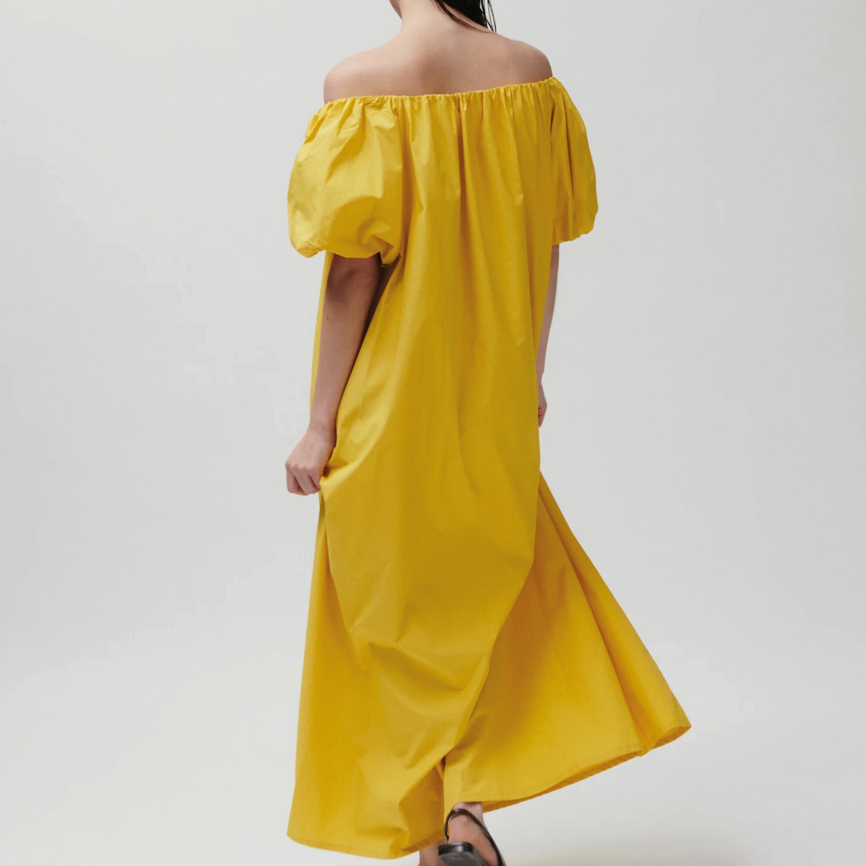 This ankle-length, crisp off-the-shoulder 2NDDAY Fine Crispy Poplin Spicy Mustard 2ND Gia Dress features elasticated bubble sleeves and side pockets. Wear this loose silhouette with flip flops and minimal jewellery for a unique, elegant look.