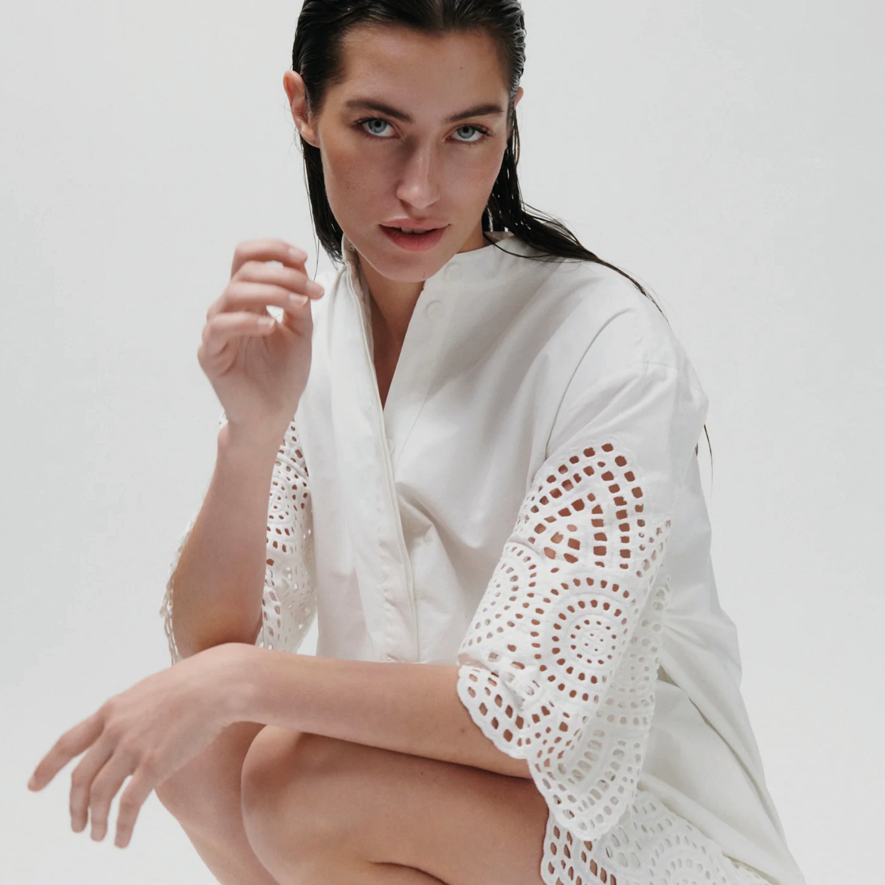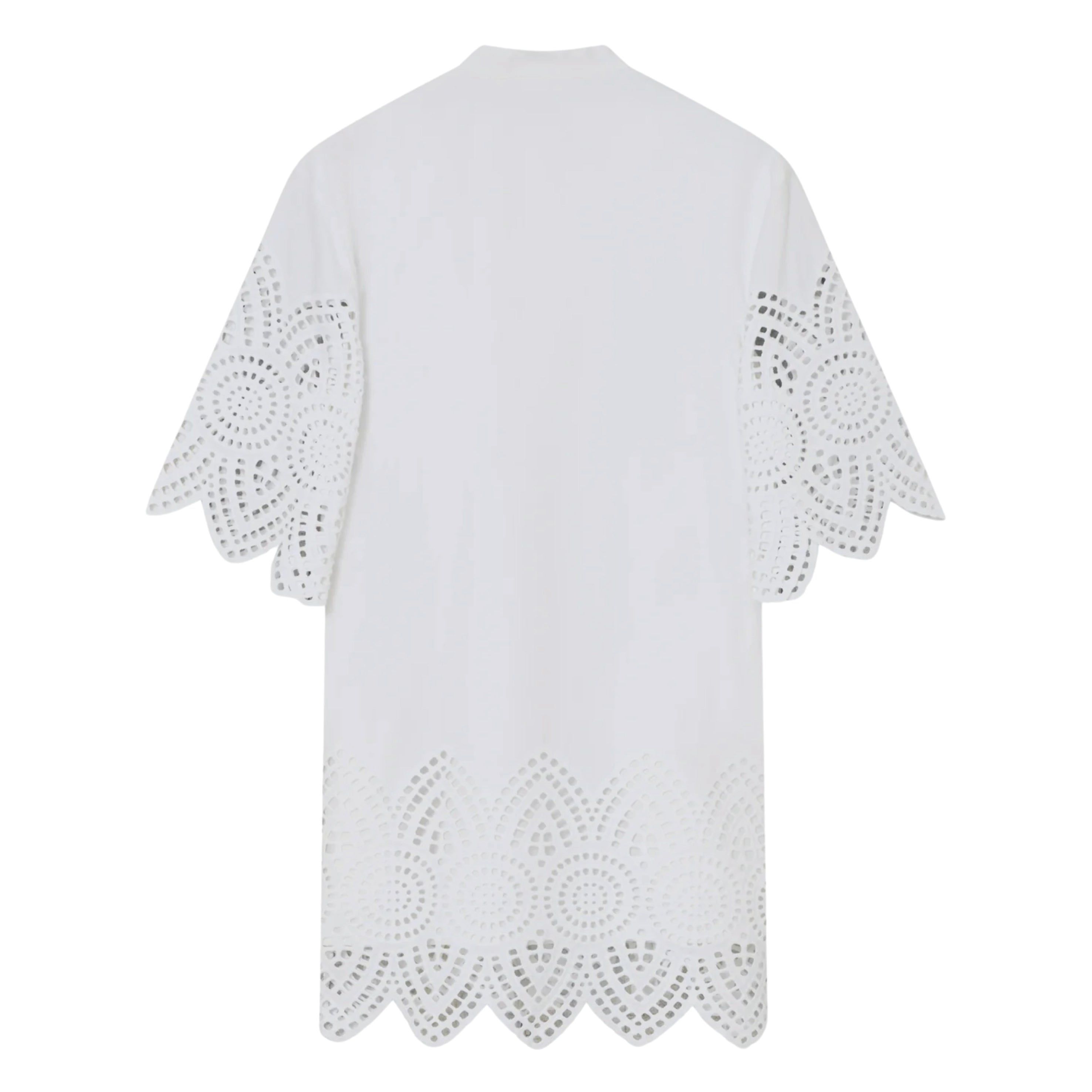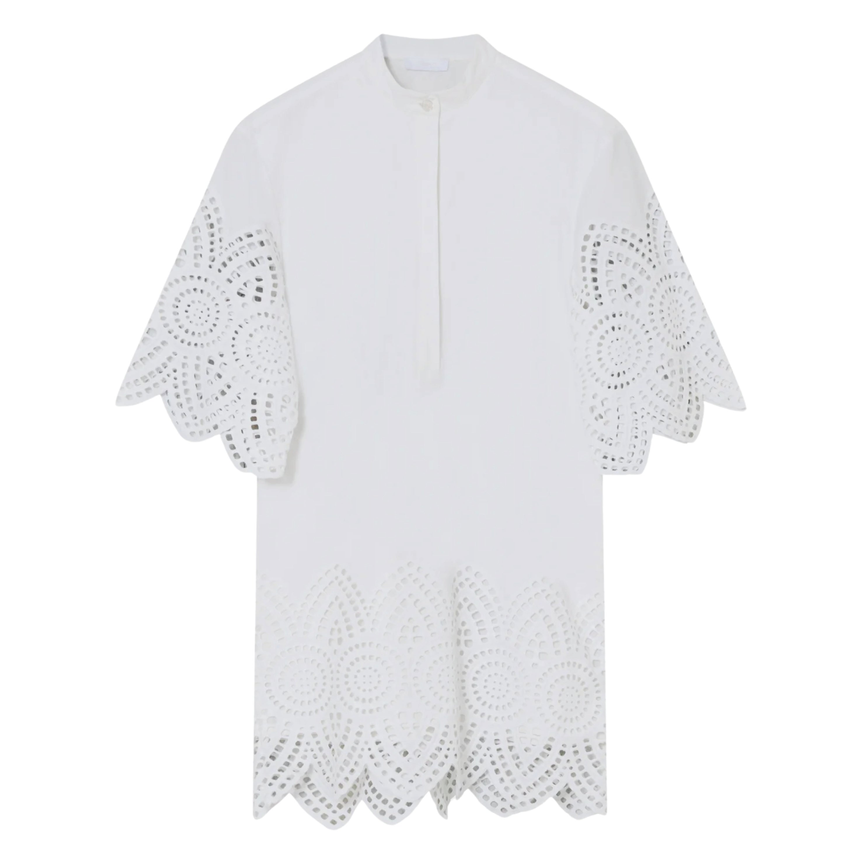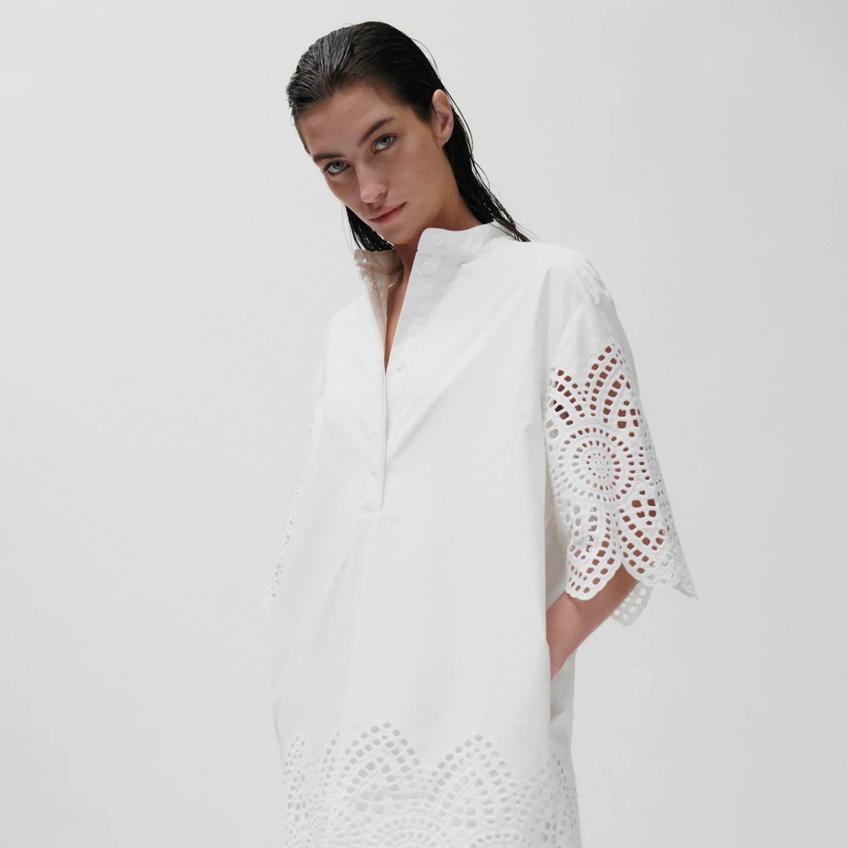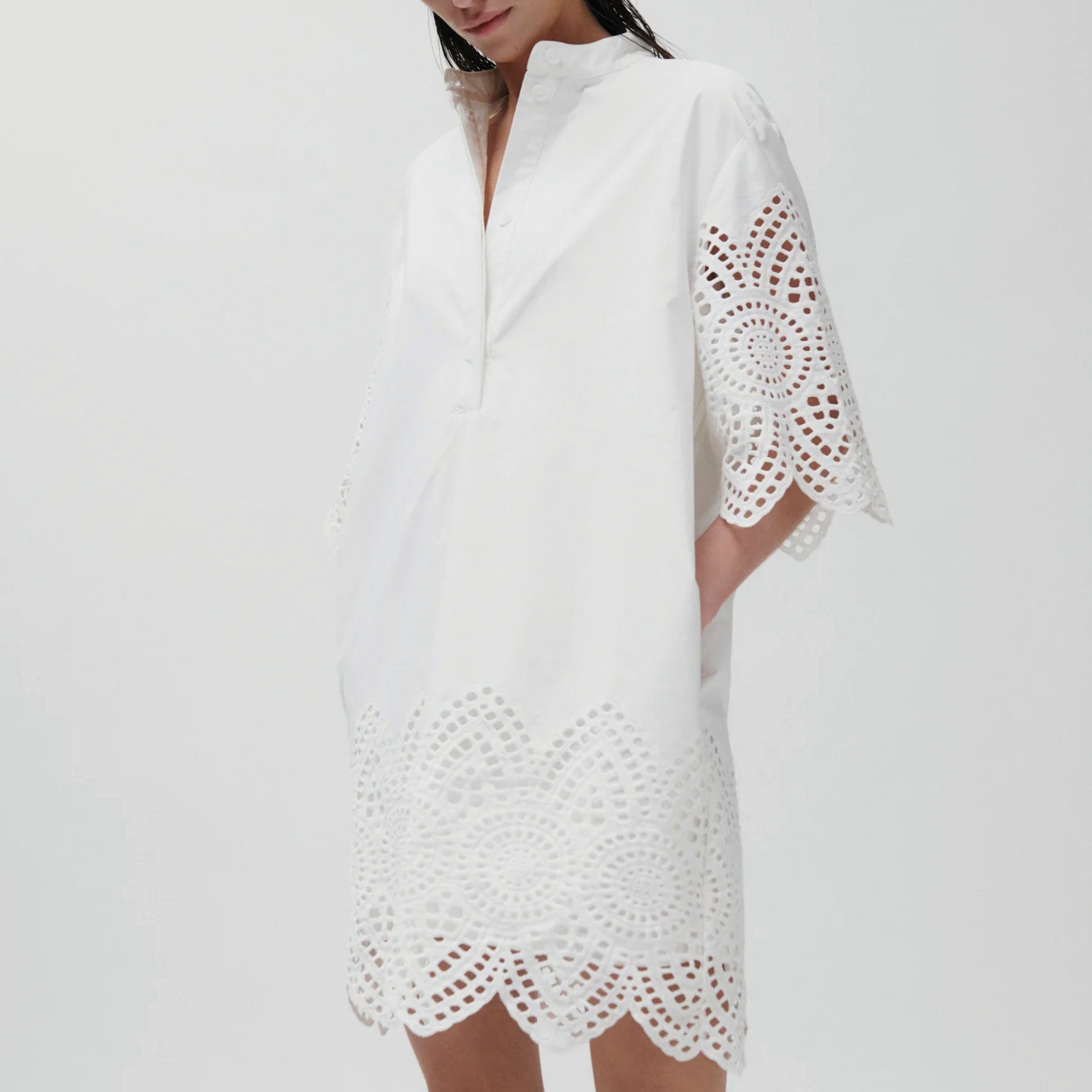 The 2NDDAY Poplin Charm Brilliant White 2ND Kiwa Dress features a buttoned placket at the neck, side pockets, and crochet detailing at the hem and sleeves. Wear as a tunic over wide-leg denim for a balanced, effortless outfit.