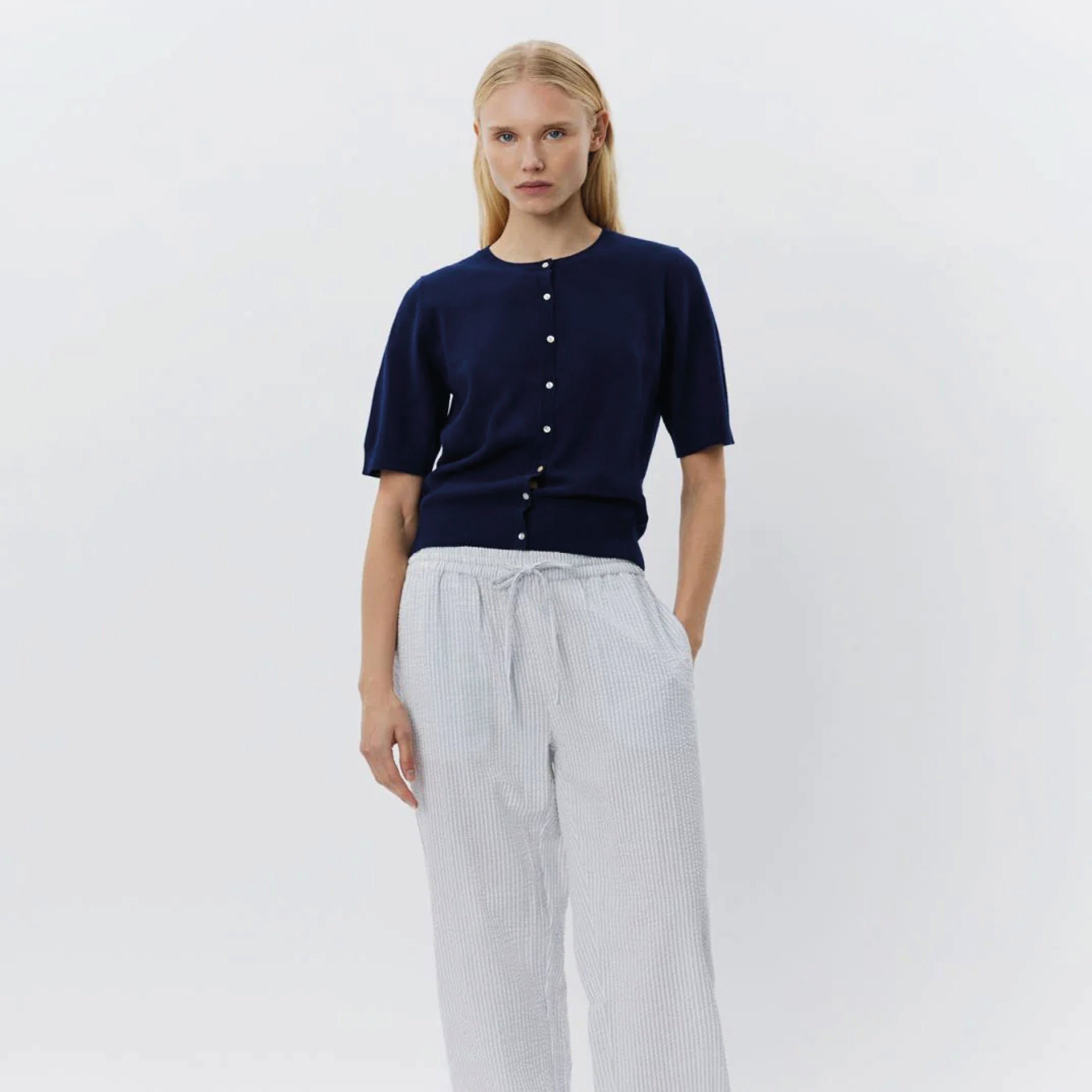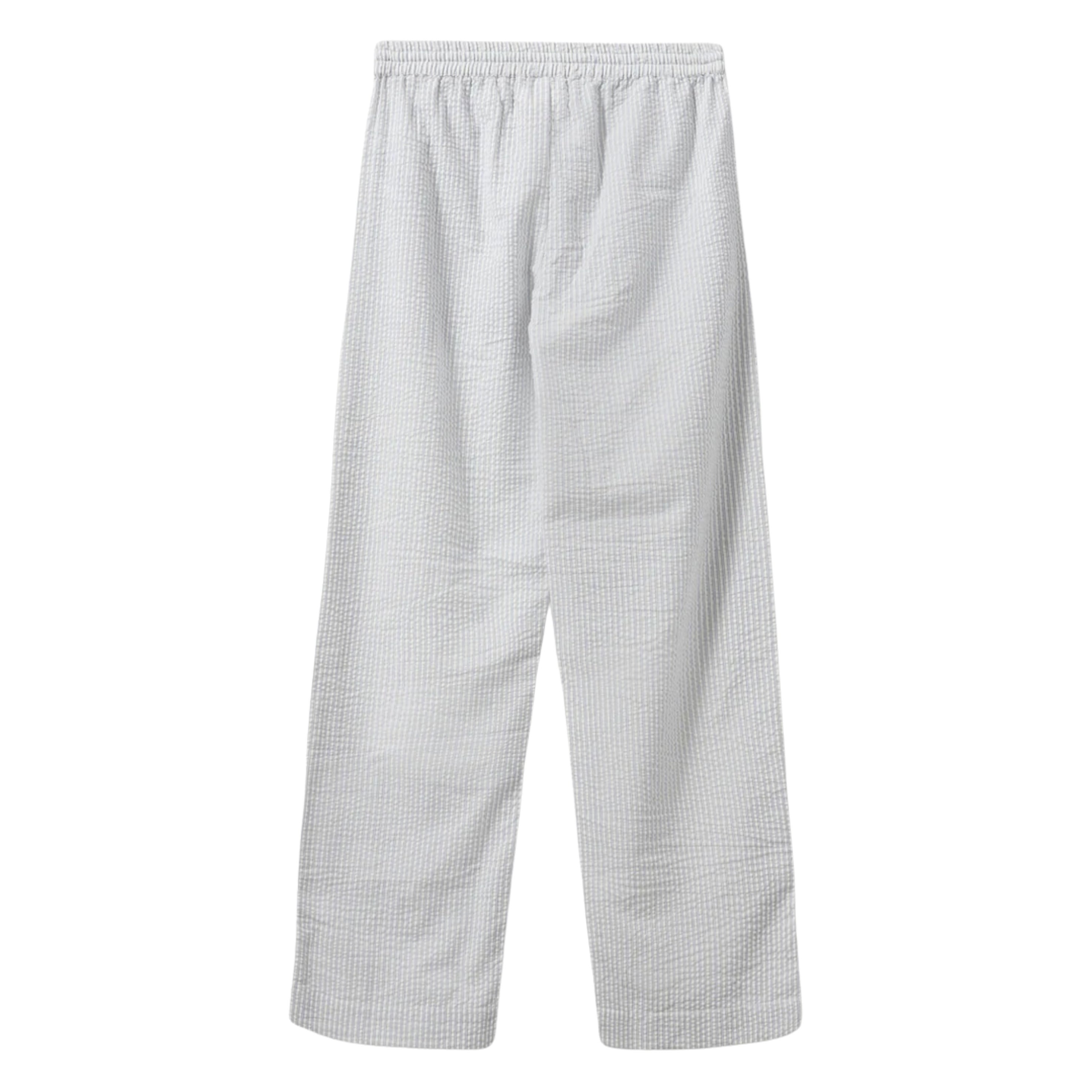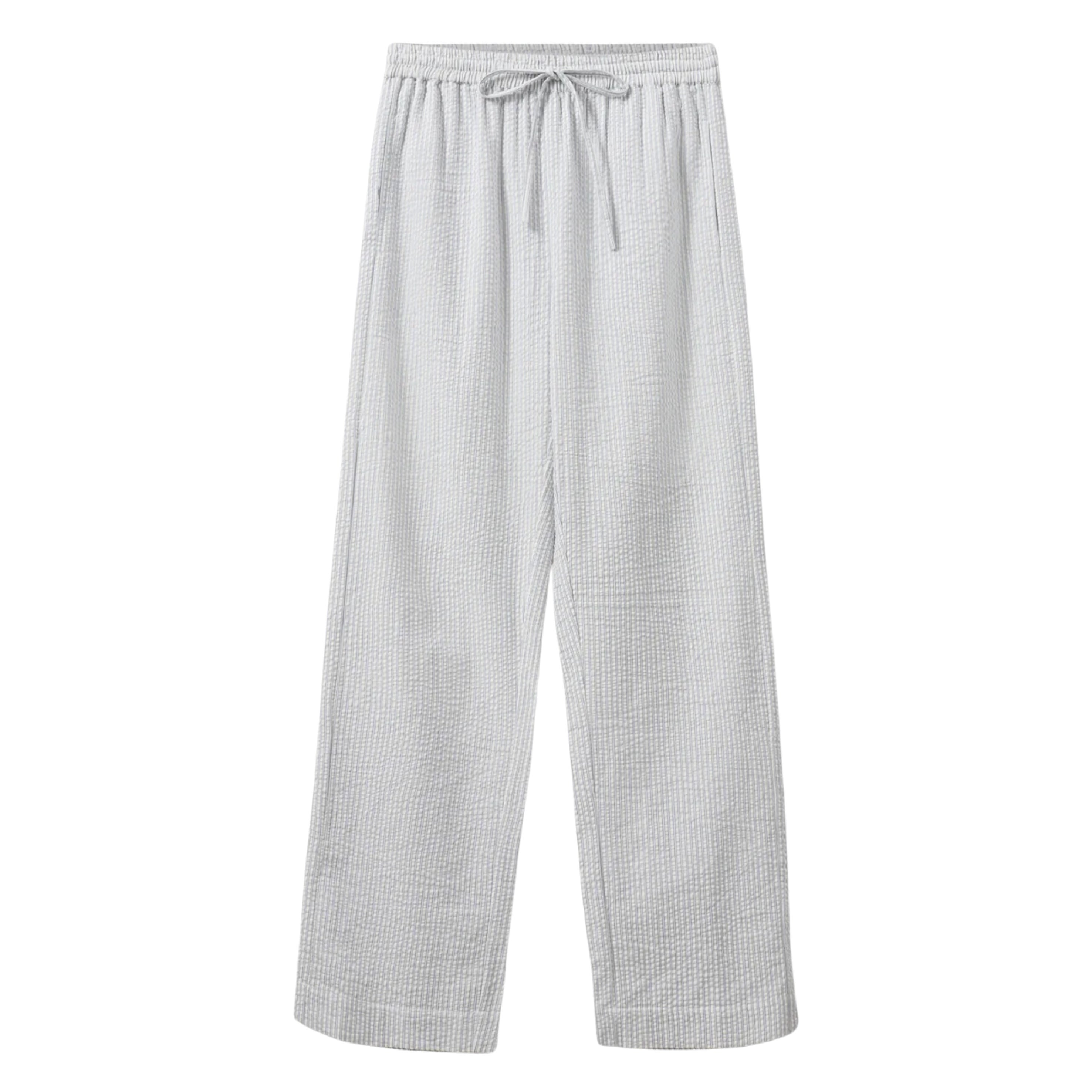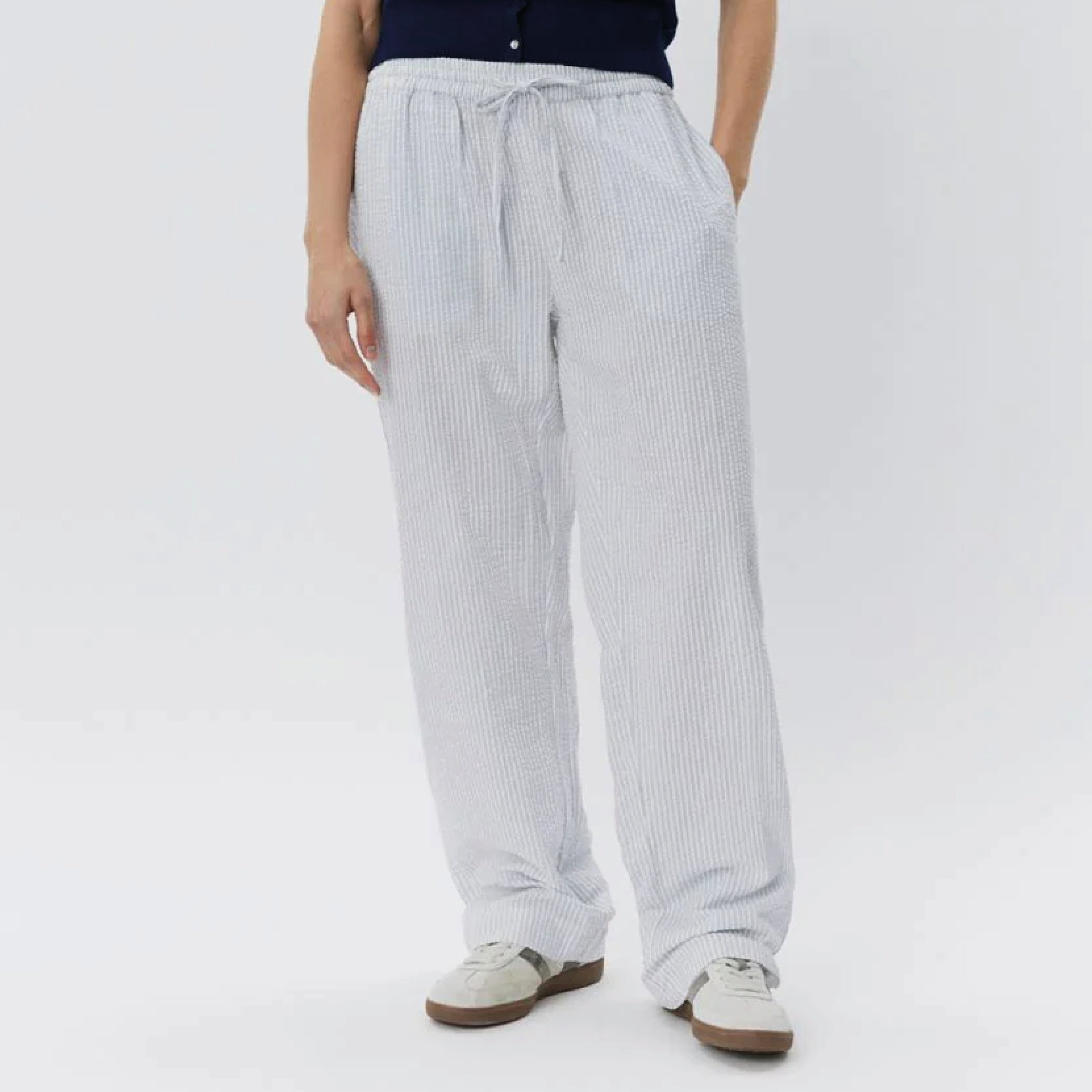 The Sofie Schnoor Blue Stripe Antique White Abigail Trousers are crafted from a wavy fabric in antique white with thin blue stripes, designed with pockets on each side and a waist tie for a comfortable fit.