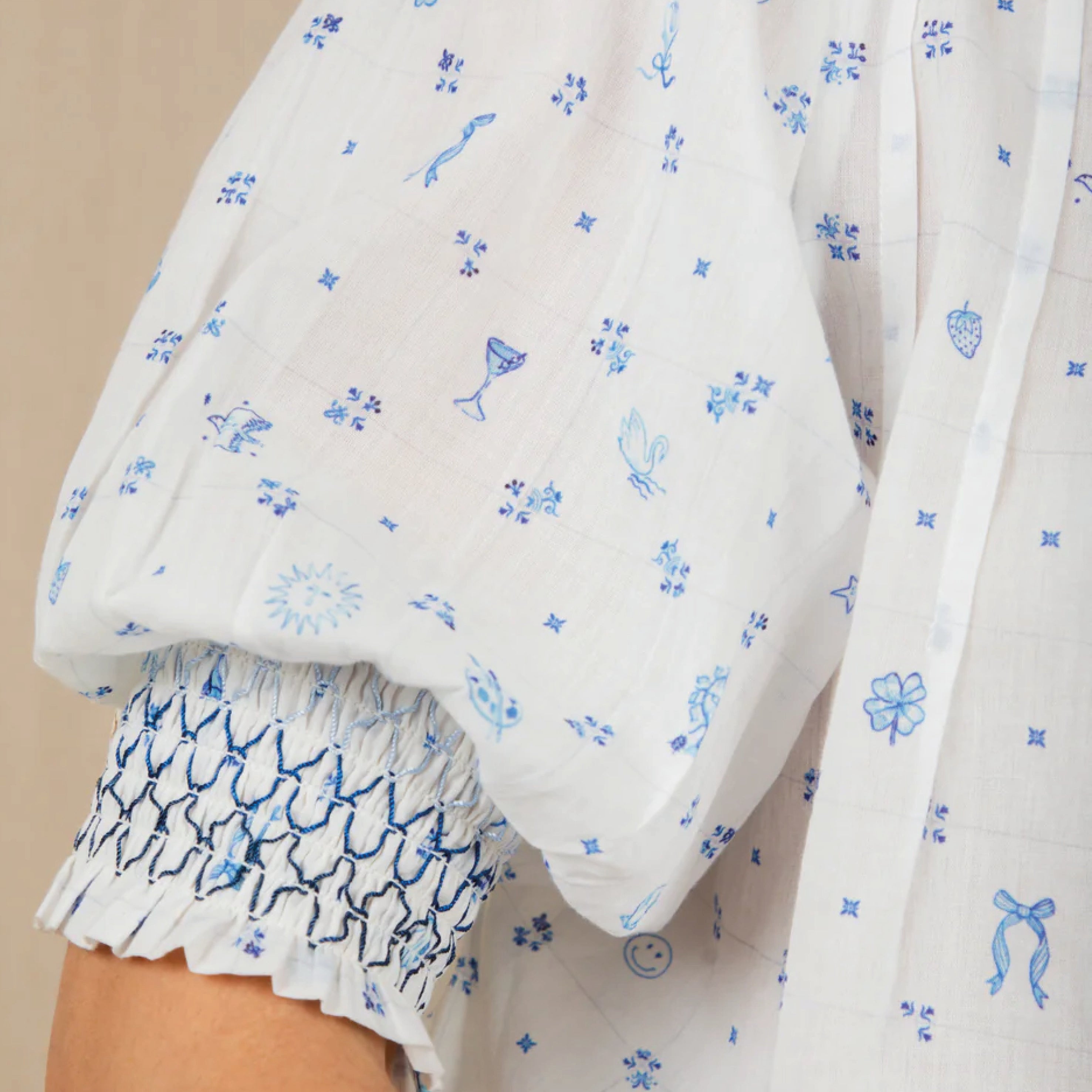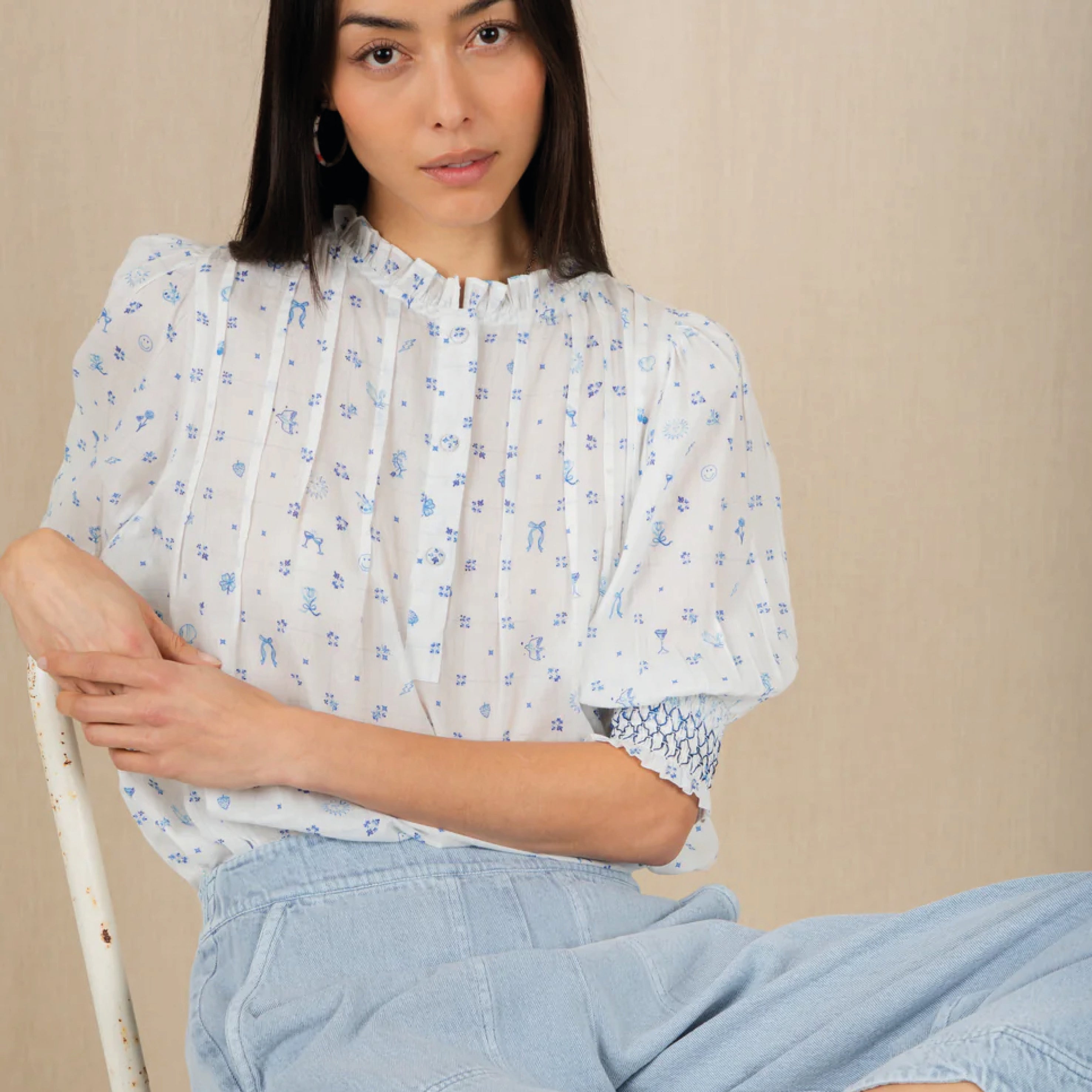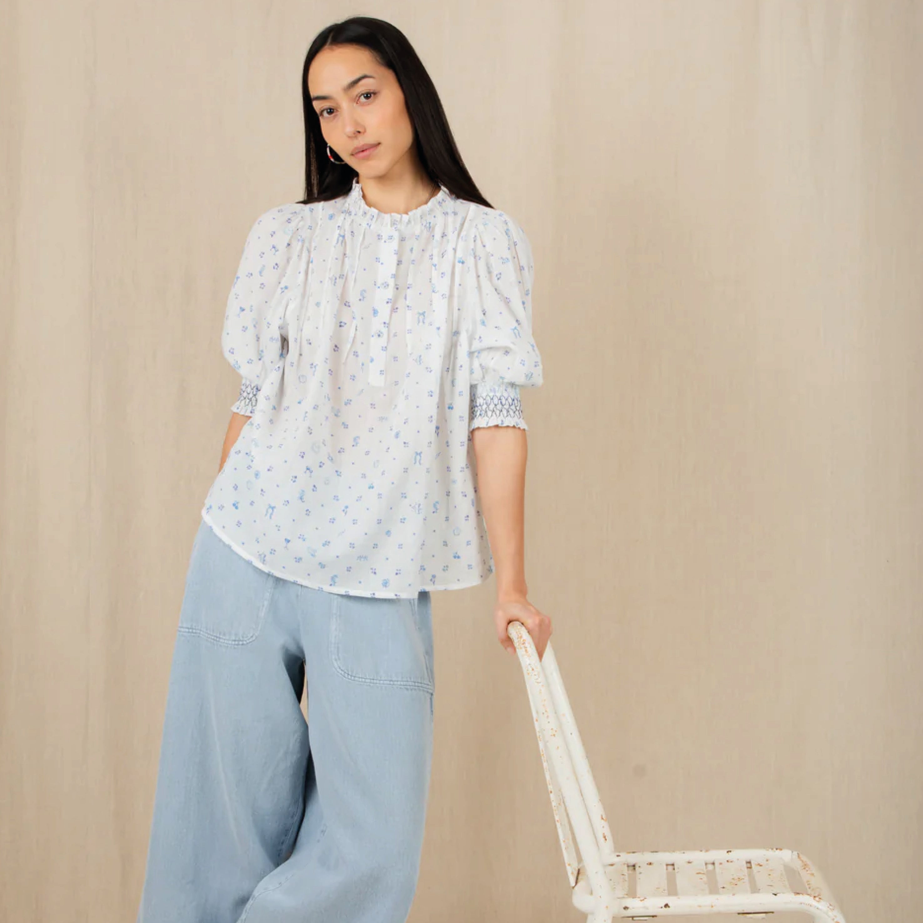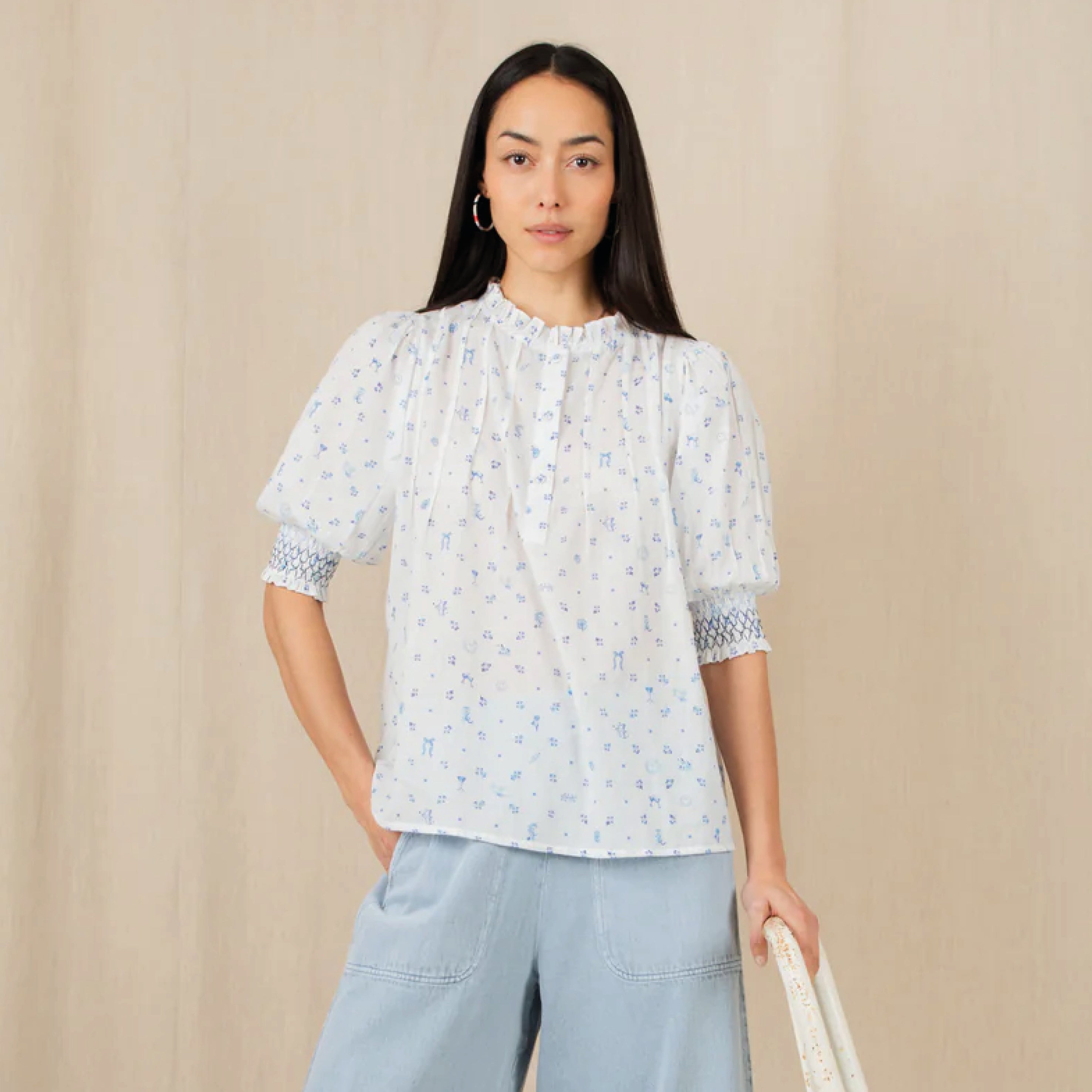 The feminine, cotton Bonté Delft Loane Shirt features a detailed hand-painted print, with a frill collar and tucks around the neck and a half placket opening with covered buttons. The short sleeve is designed to be worn just above the elbow with a contrast smocking detail. Loose fitting, great tucked in or worn out.